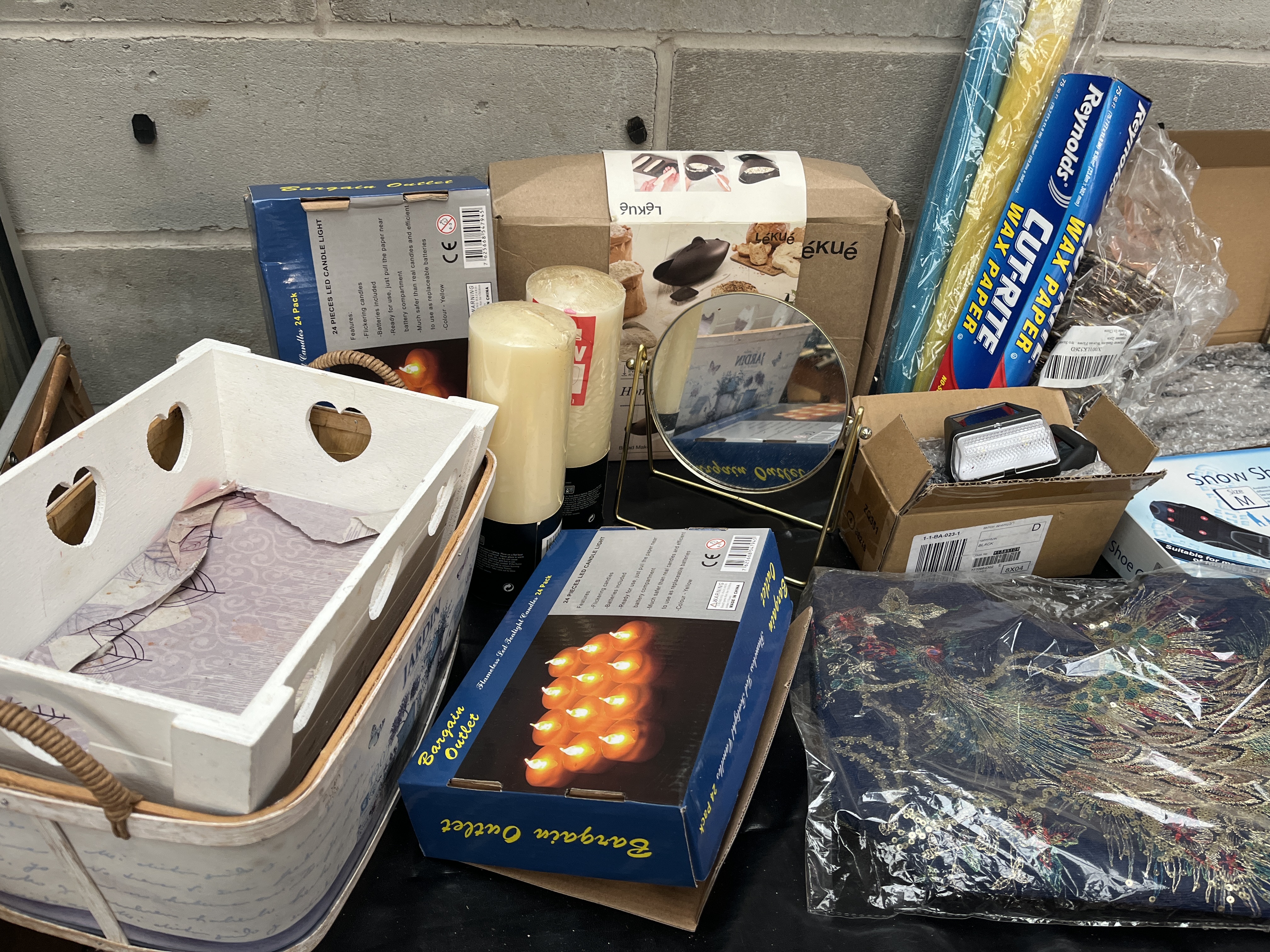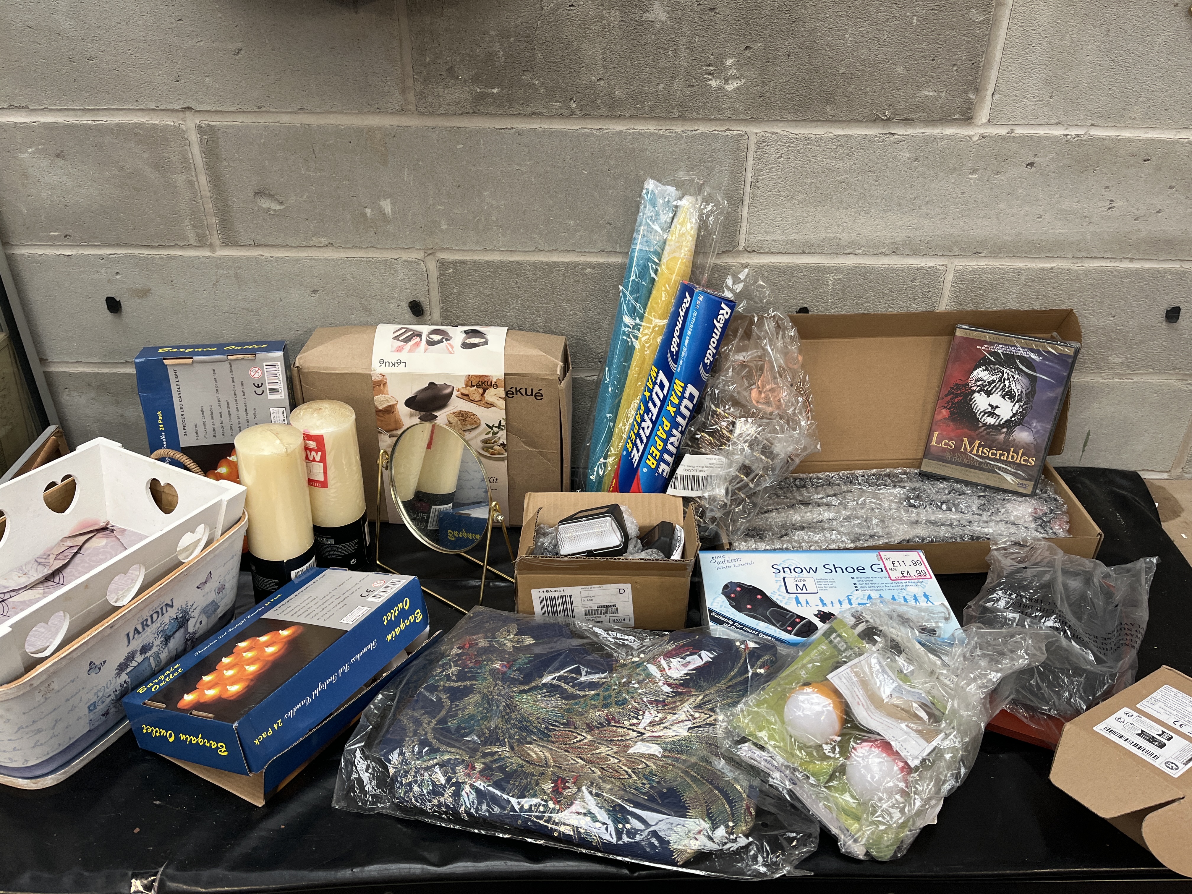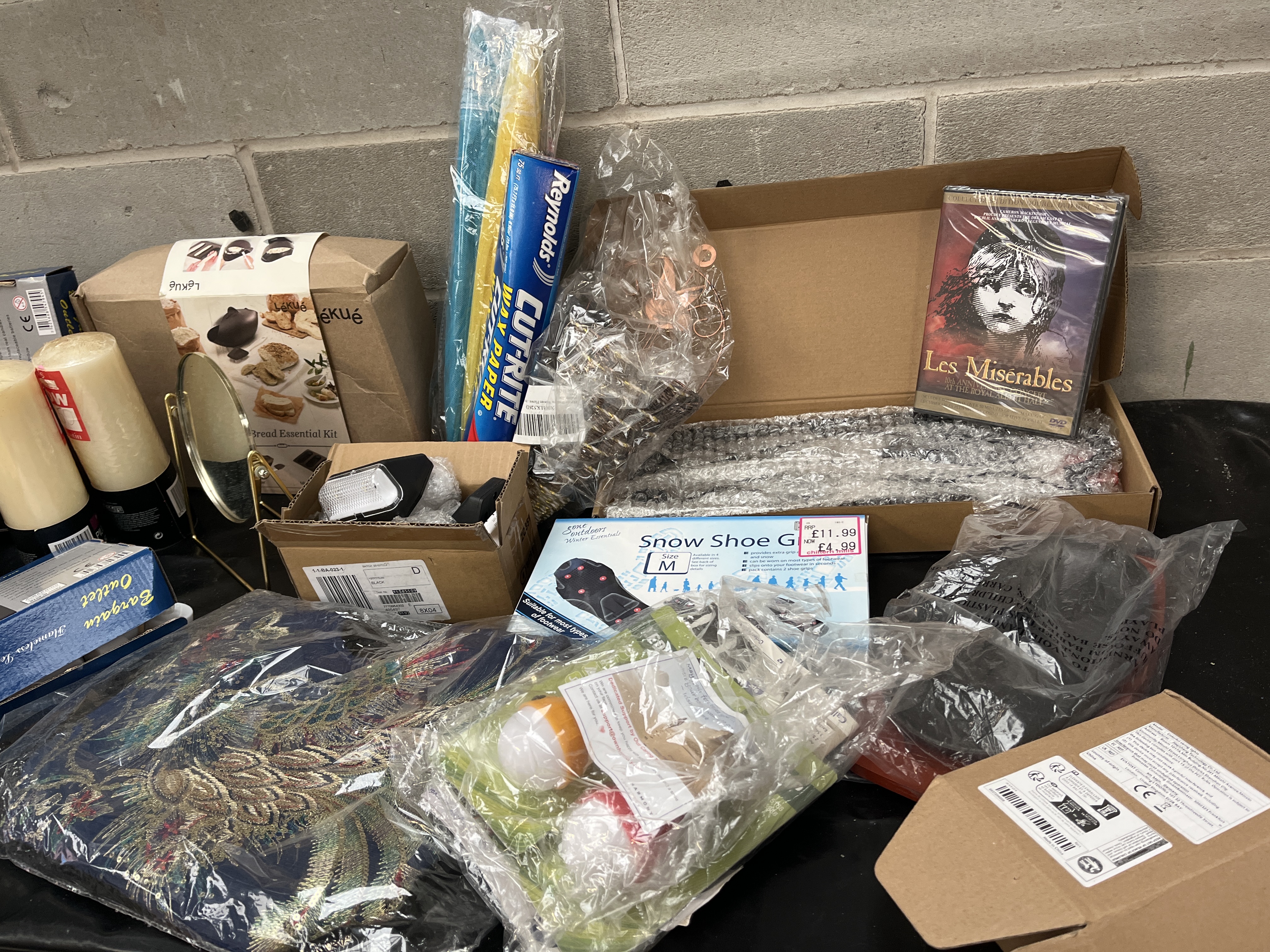 This lot comprises a collection of contemporary retail and household goods, primarily consisting of new old stock and packaged merchandise. The most distinctive item is a dark textile item sealed in plastic, identified by web consensus as a Vintage Sequins Peacock Handbag, featuring ethnic embroidery, sequins, and a blue and green peacock motif. Other items in the collection include two boxed Bargain Outlet LED candle light packs, two loose cream pillar candles, and a small gold-tone vanity mirror. Packaged consumables include three cylindrical rolls of wrapping or paper products, one marked Reynolds Cut-Rite Wax Paper. Boxed goods include a Baku Bread Essential Kit, a Snow Shoe Grip M/L kit, and a boxed copy of Les Miserables (The Wretched Ones). The collection also features a white woven basket labeled Jardin, and several sealed bags containing miscellaneous small gear and spherical decorations.