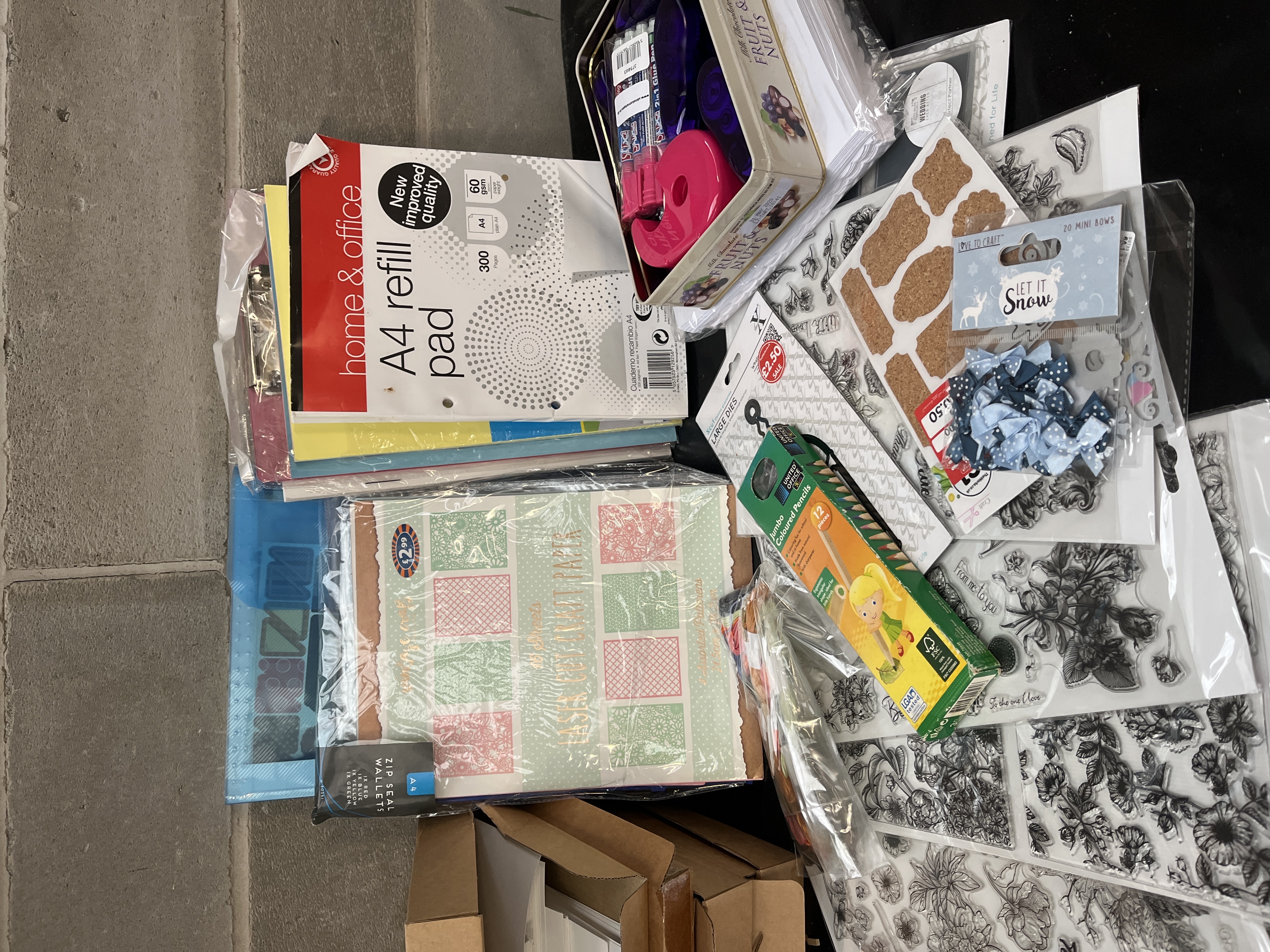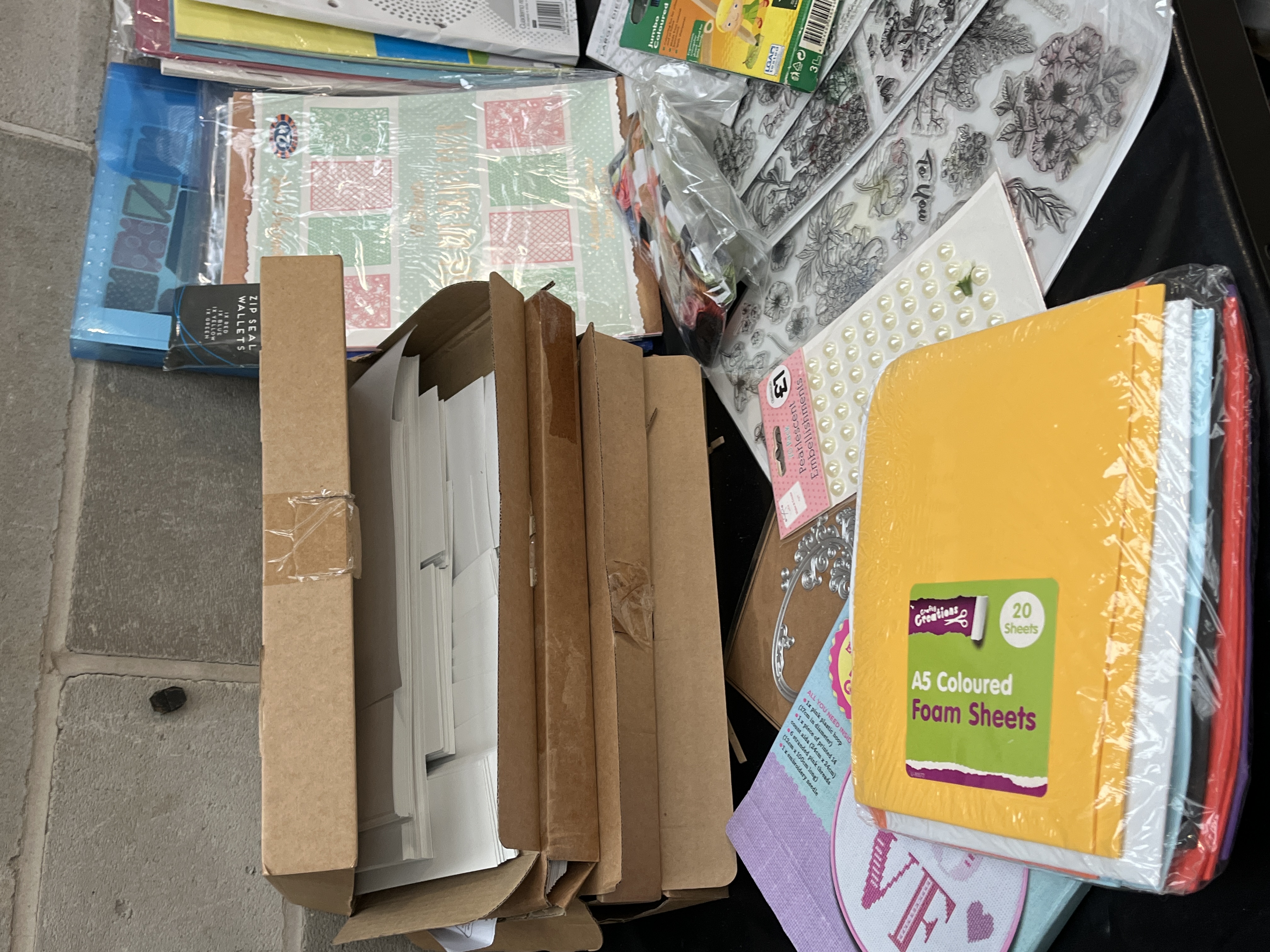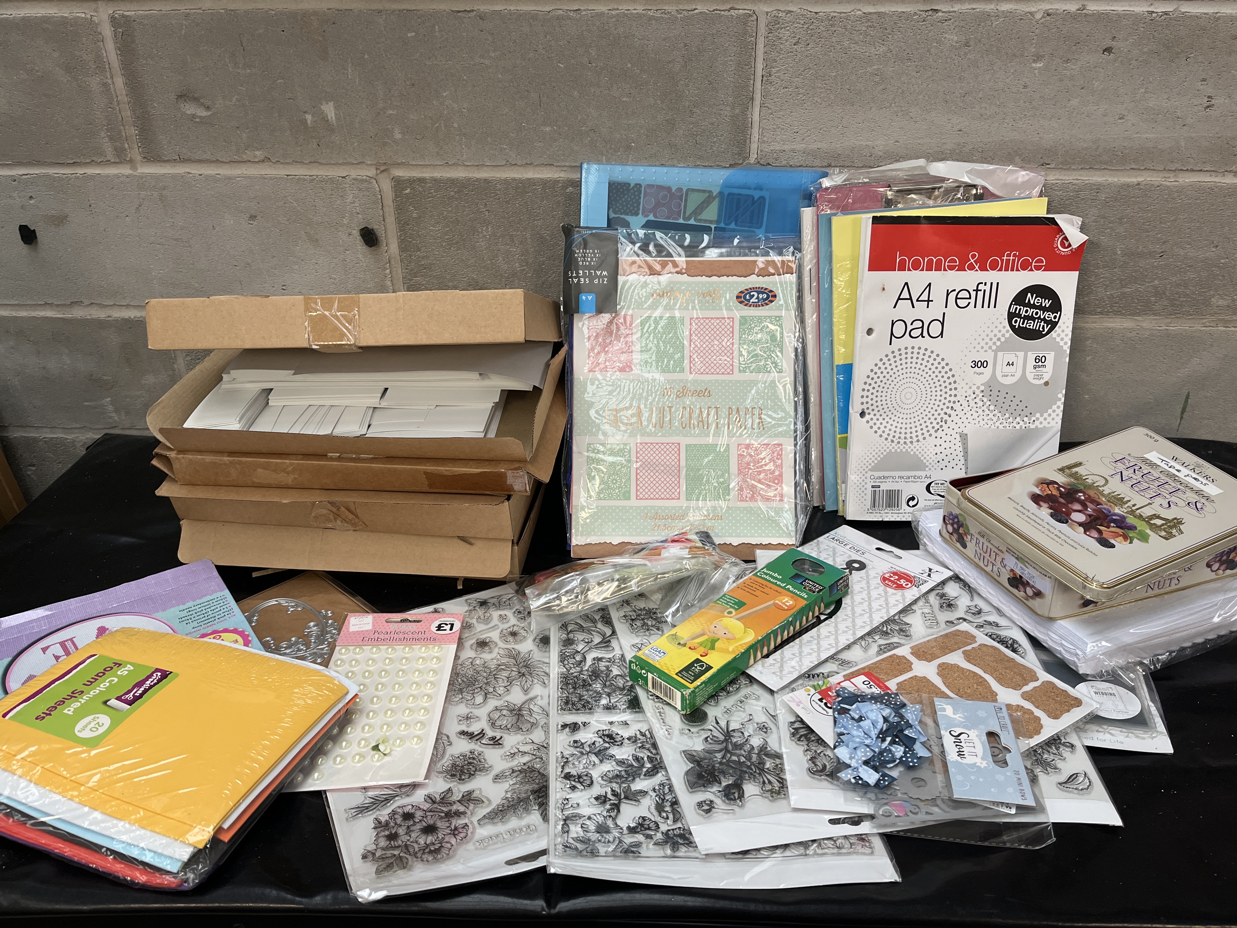 A collection of modern craft and stationery items, primarily focused on papercraft, card making, and scrapbooking. The lot includes four stacked corrugated cardboard boxes containing loose white card or envelopes. Paper and card stock supplies include an A5 bundle of coloured foam sheets (20 sheets), several commercially packaged patterned basic paper pads, and a ‘Home & Office A4 Refill Pad’ confirmed by web intelligence to contain 300 straight ruled pages. Accessories, largely sealed in original packaging, comprise approximately ten sets of clear polymer stamps featuring various floral and botanical designs, a box of colouring pencils, several packages of self-adhesive embellishments (including pearl and cork motifs), small ribbons, and metal die-cut shapes. The collection also features a rectangular metal tin decorated with ‘Selected Fruits & Nuts’ branding, which contains additional supplies.
