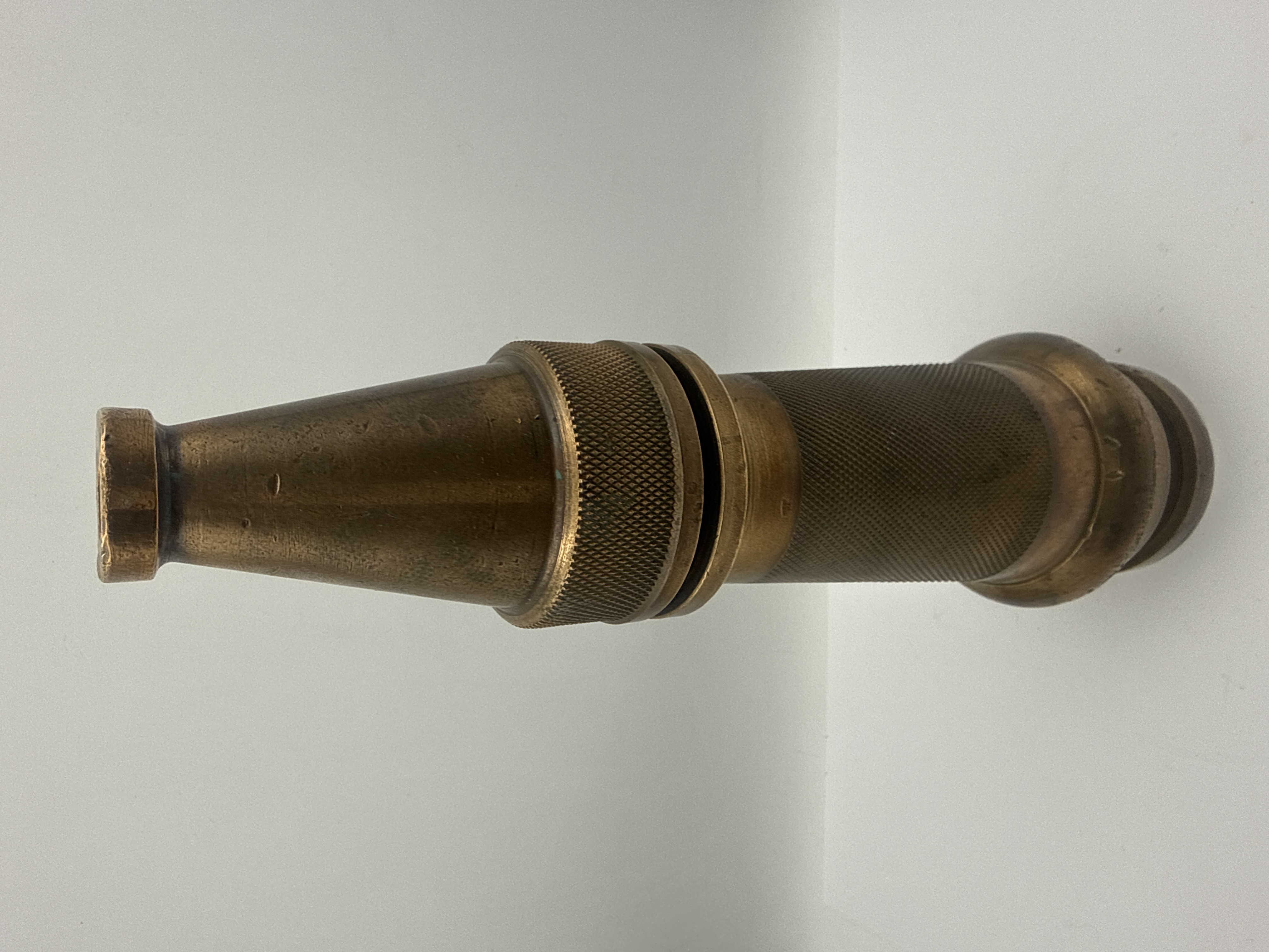 A vintage industrial fire hose nozzle attributed to the Elkhart Brass Manufacturing Co. The object is constructed entirely of heavy patinated brass or bronze, featuring a segmented, utilitarian design. The body is cylindrical, transitioning to a tapering conical spout. The design incorporates two distinct sections of deep cross-hatched knurling (diamond pattern), providing grip and facilitating adjustment. The material displays a dark, oxidized patina consistent with age and industrial use. Small, indistinct manufacturer stamps or numbers are visible on the lower and mid-sections of the brass body, though they are currently illegible due to heavy tarnish.