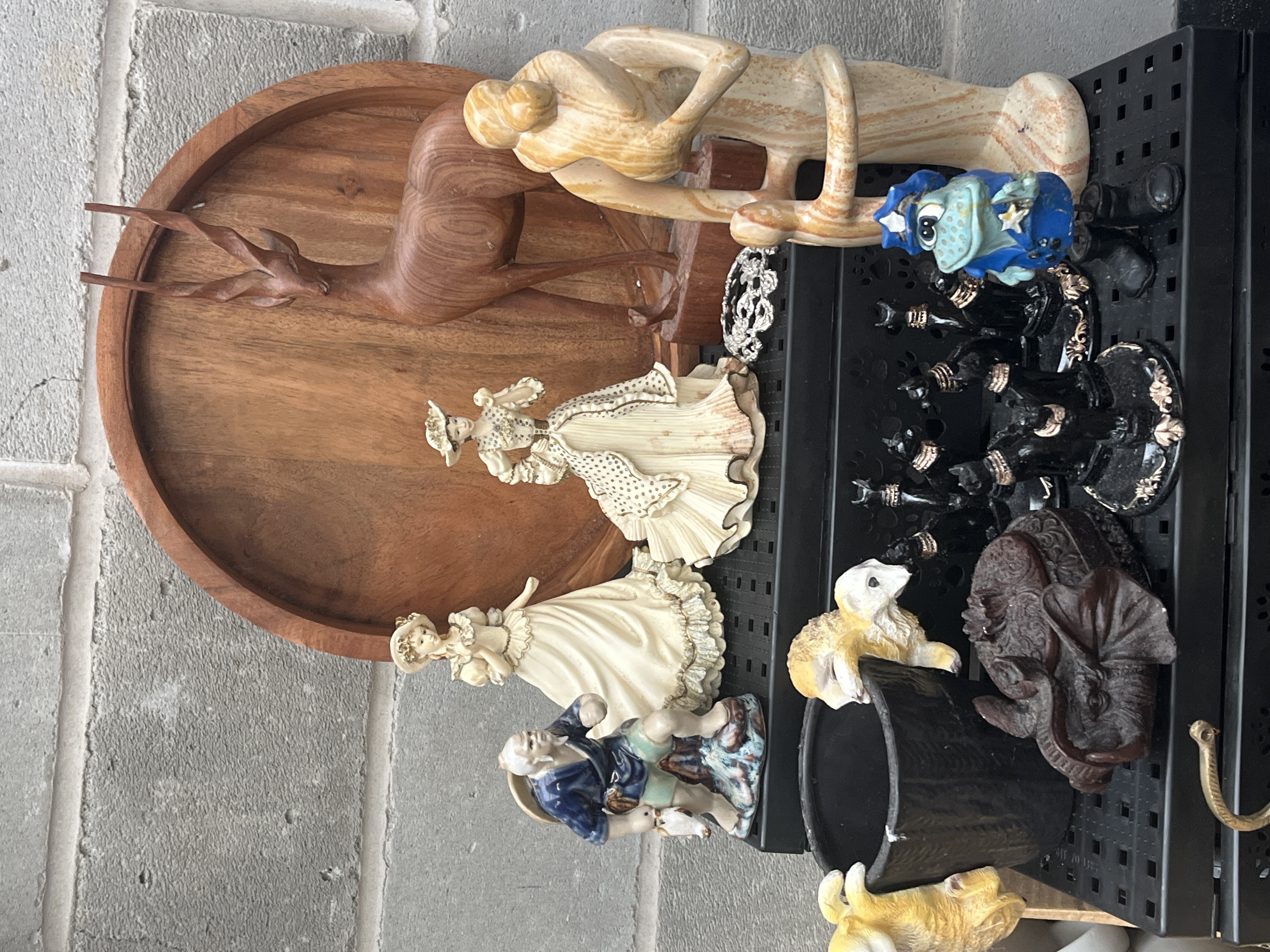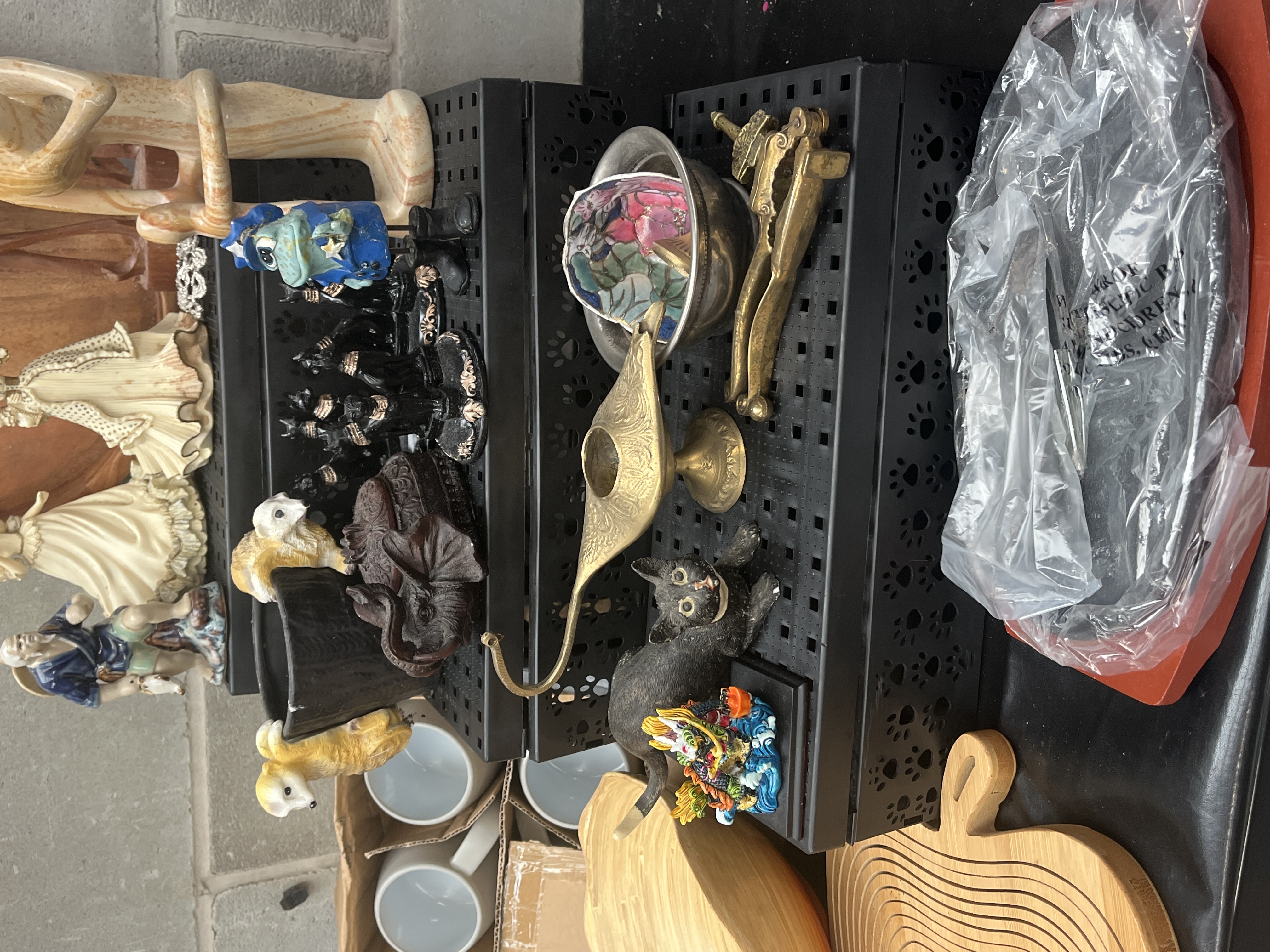 This lot comprises a collection of miscellaneous household and decorative items. The assortment includes several ceramic and stone figurines, such as two period-dressed female figures, a carved stone figure, and a group of small black cat figurines. Kitchenware items include a large bamboo bowl, a segmented wooden cutting board, and four grey ceramic mugs presented new in their original cardboard packaging. Decorative metal items include a brass Aladdin-style oil lamp and a brass nutcracker. A wooden deer carving mounted on a circular plaque is also present. The items are displayed on black tiered plastic shelving units.