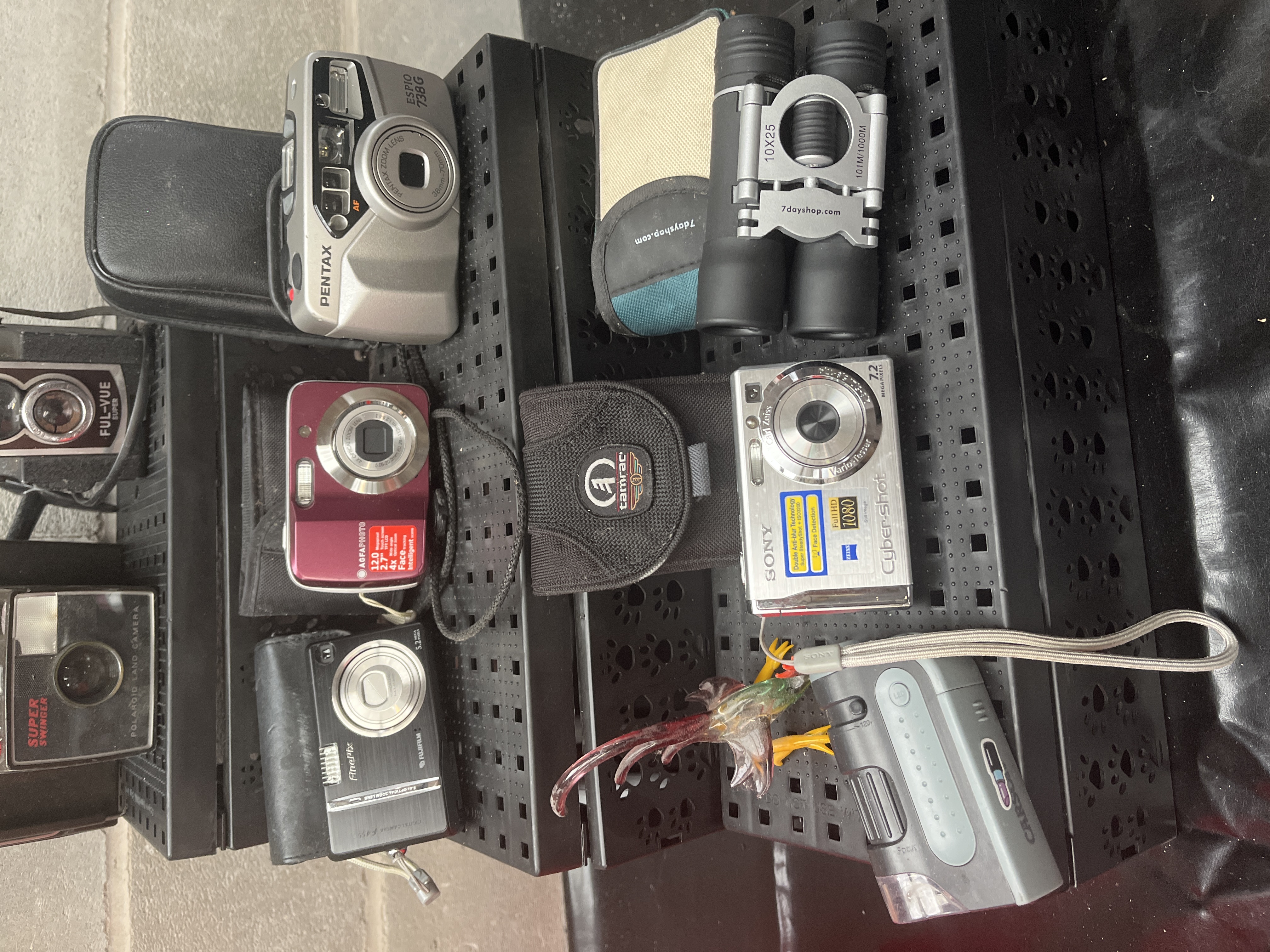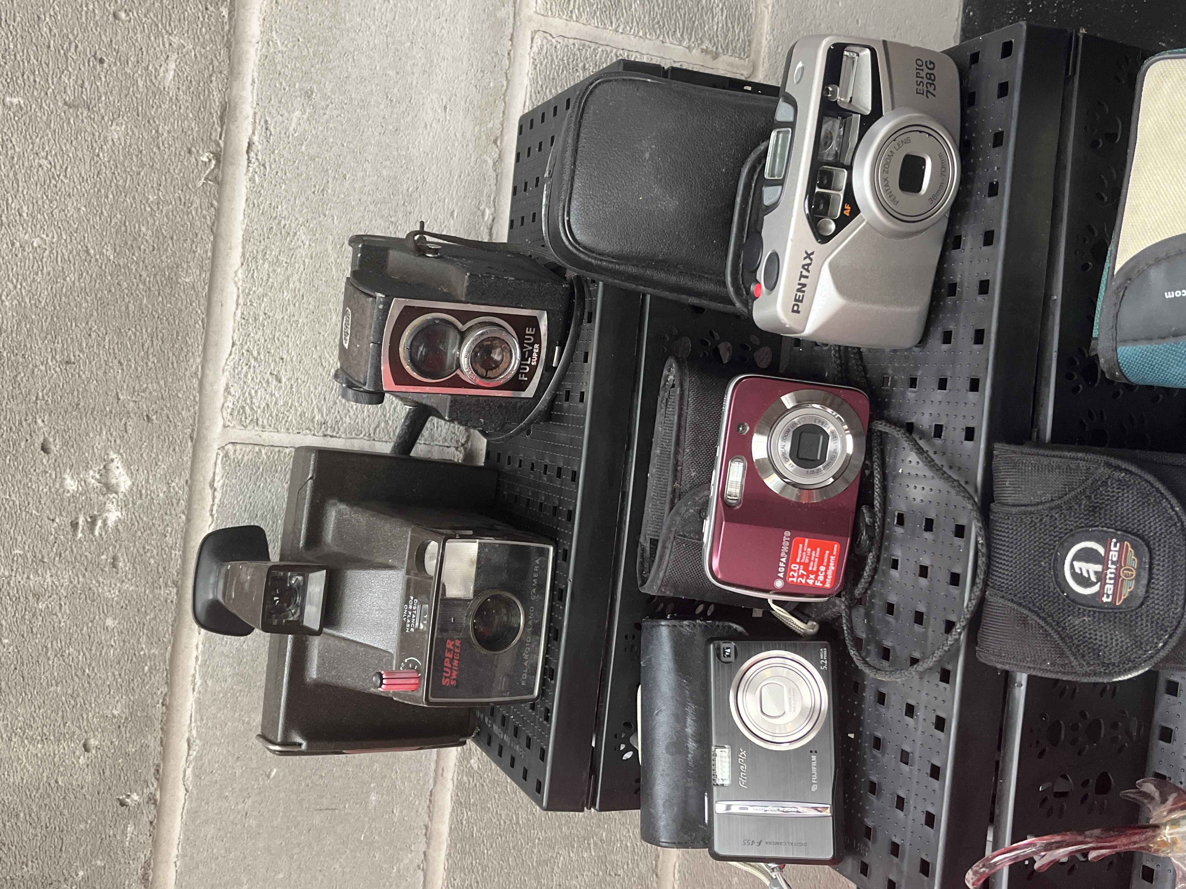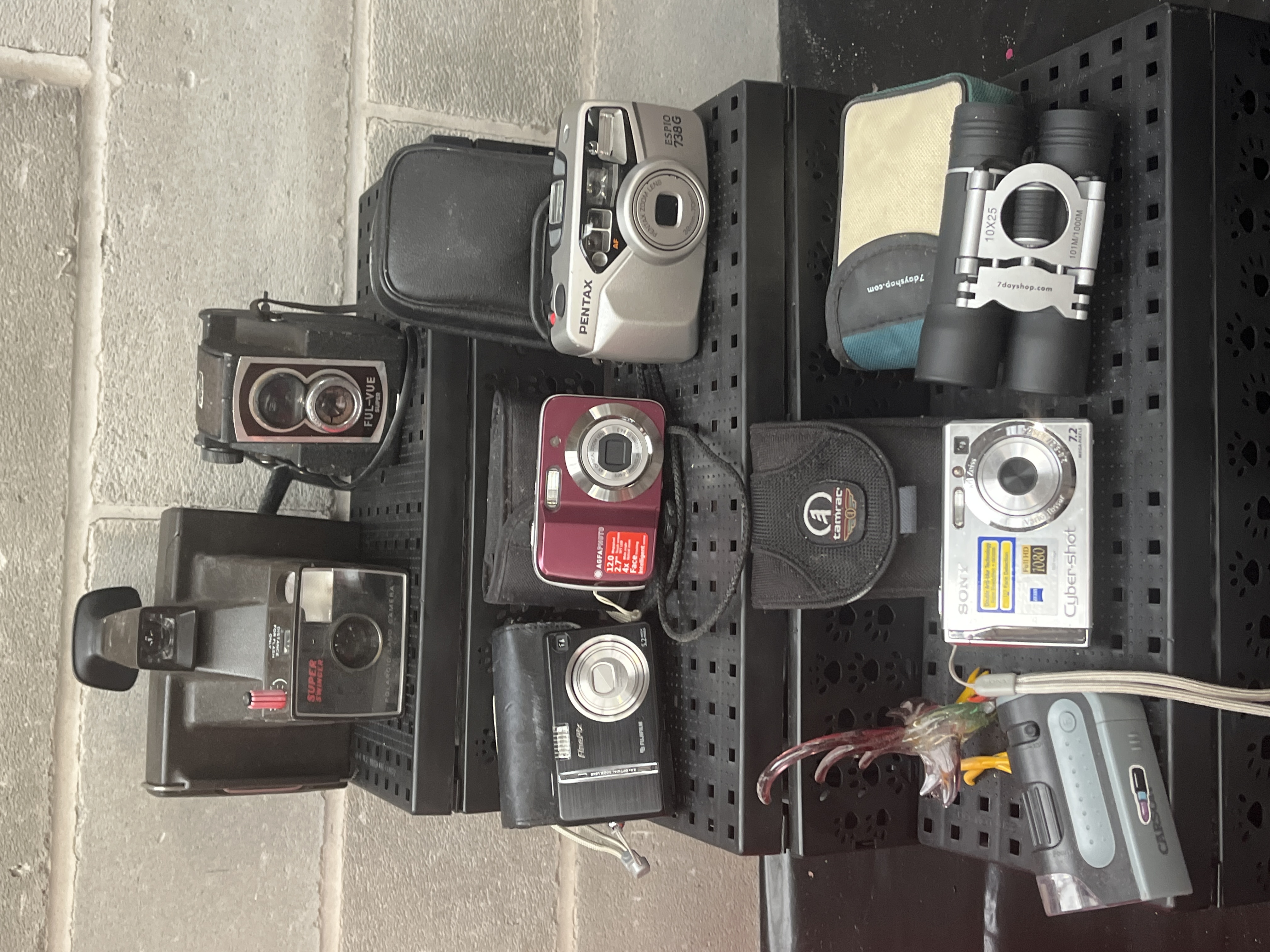 This lot comprises a mixed collection of photographic, video, and optical equipment spanning several decades. The collection includes vintage film cameras such as the Polaroid Land Camera Super Swinger and a Ful-Vue box camera, alongside more modern digital equipment like the Sony Cyber-shot and Agfaphoto compact cameras. Several items are presented with original or associated carrying cases or pouches, including a Pentax Espio 738G and a Fujifilm FinePix.