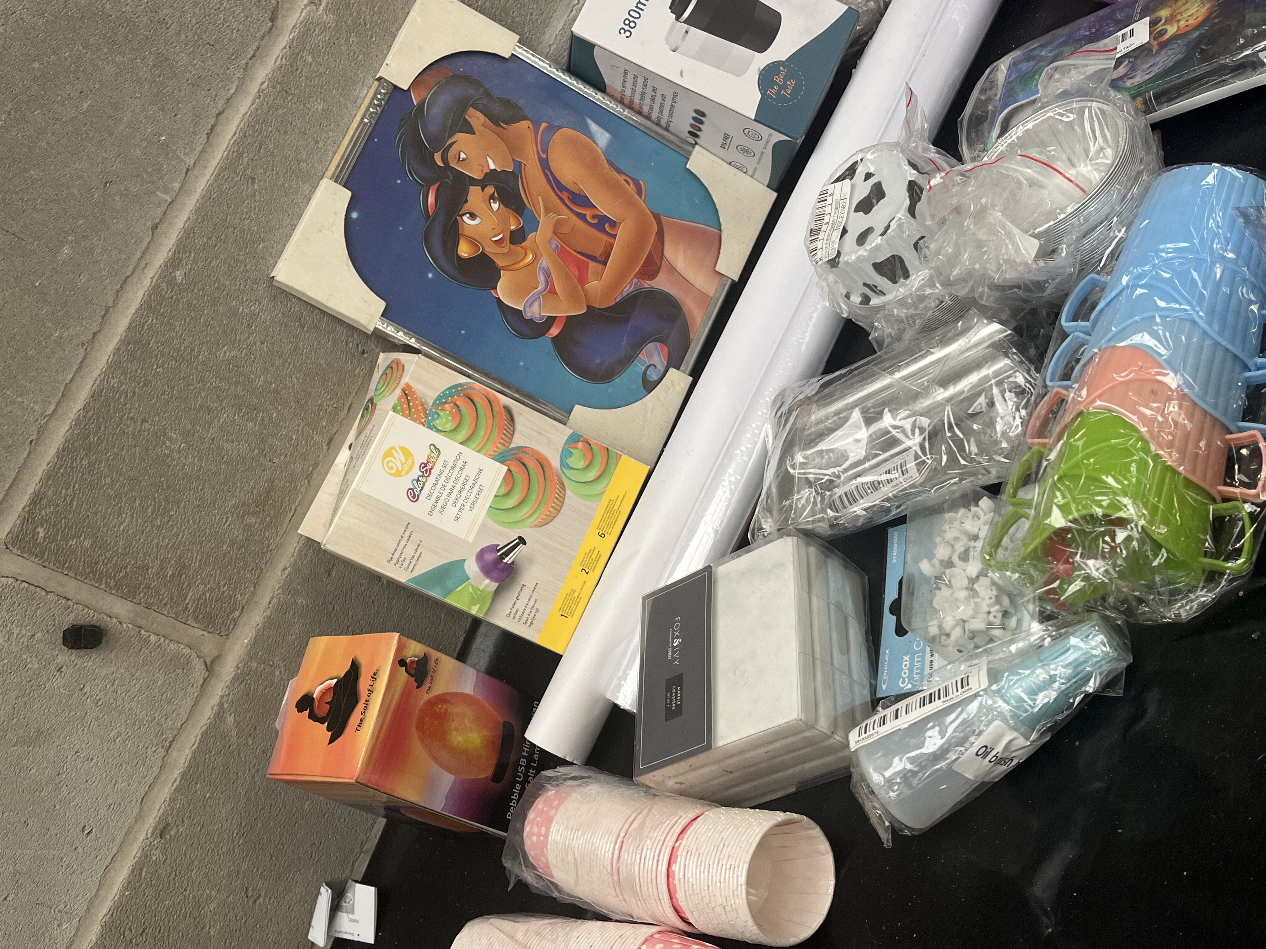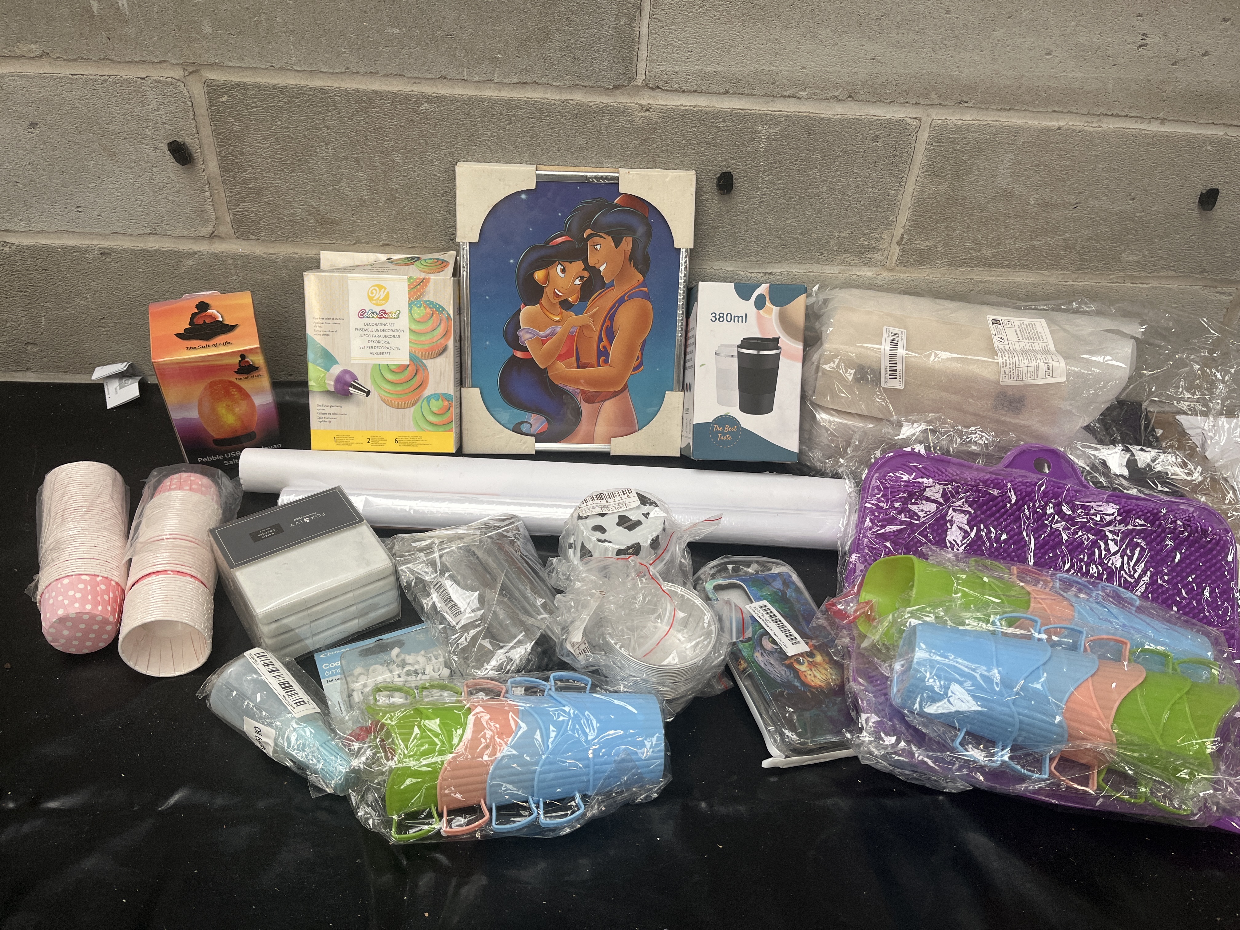 This lot comprises a collection of assorted consumer merchandise, predominantly new and in original packaging. The centerpiece is a 1993 Disney Store Exclusive Commemorative Lithograph featuring Aladdin and Jasmine, identified via packaging and web intelligence. The lot also includes various plastic and paper drinkware items, a boxed 380ml travel mug, baking and craft supplies including a Wilton Color Swirl kit and a silicone mat, a boxed Pebble USB Lamp, and packaged raw materials or fillers. The items are presented as a single inventory lot.