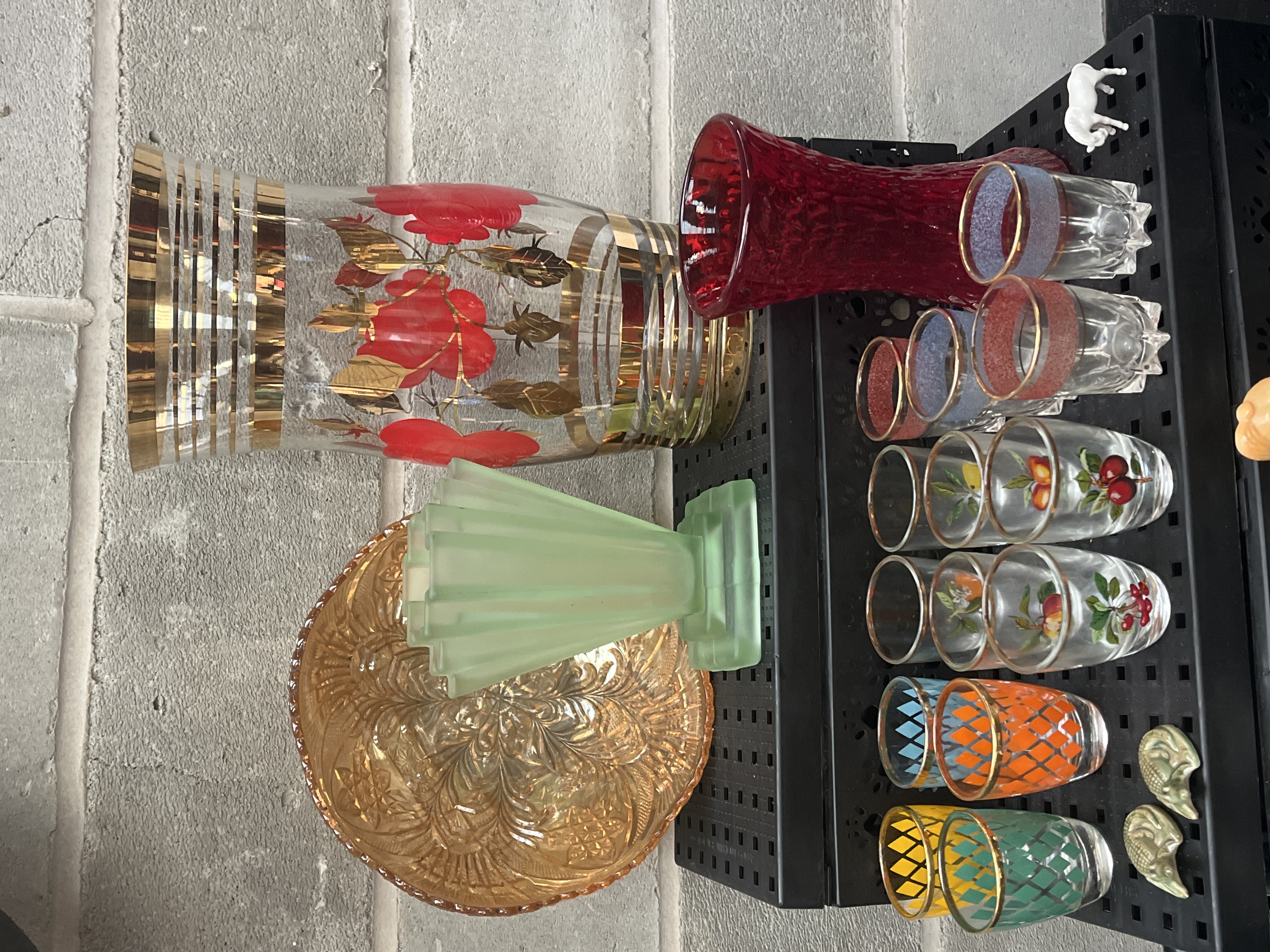 The lot consists of a mixed collection of vintage decorative items displayed on black shelving units. The glassware component includes a large clear glass vase decorated with etched gold bands and red floral applications, a round textured amber/gold glass plate, a ribbed matte light green Art Deco style vase, and a ribbed dark red glass vase. Also present is an assortment of approximately ten small cordial or shot glasses, some featuring painted fruit motifs (cherries, berries) and others decorated with geometric colored patterns. The collection also features several small ceramic and porcelain figurines, including two white teddy bears with blue bow ties, a reclining white figure, an angel figure in a yellow dress, and various small animal figures.