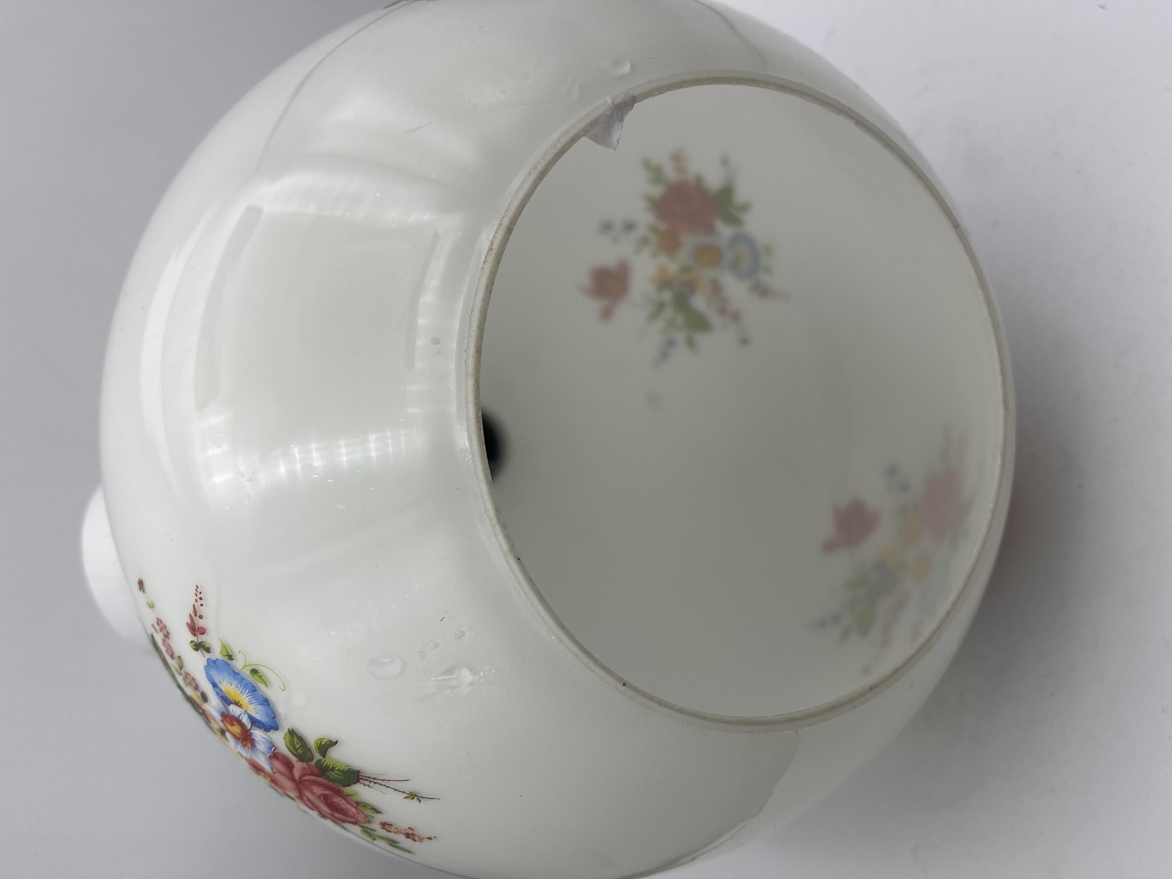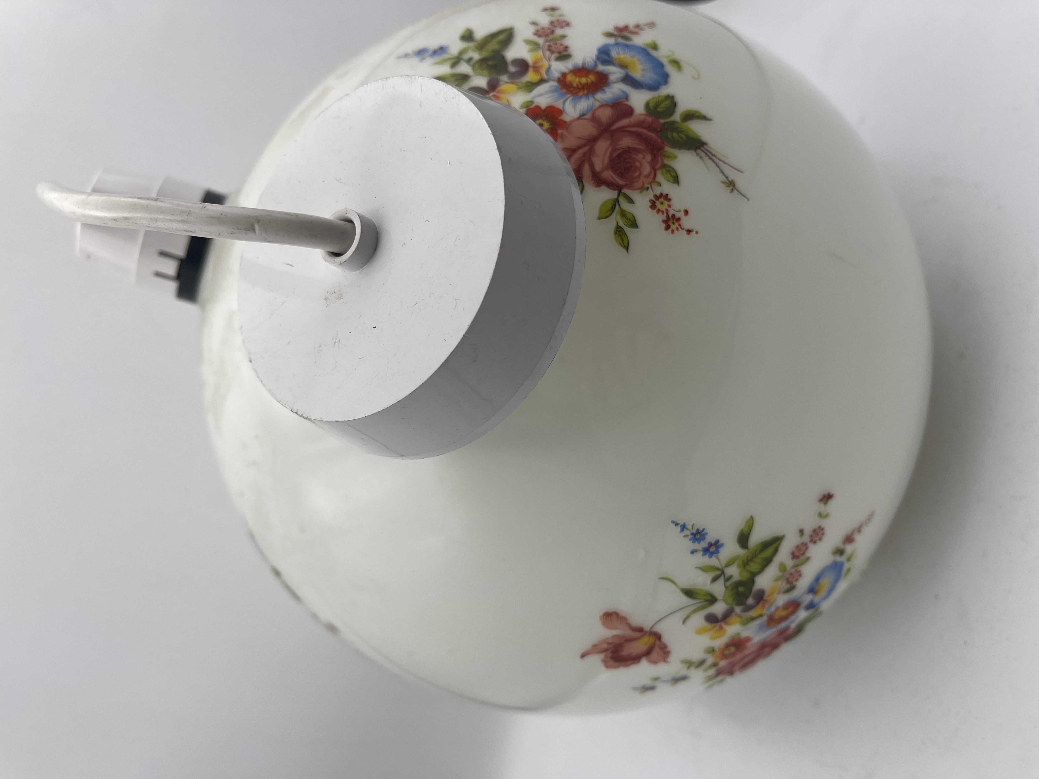 A single spherical pendant light fixture featuring an opaque white (opal) glass globe shade. The exterior surface is decorated with scattered clusters of polychrome floral transfer prints, primarily depicting roses and smaller filler flowers, consistent with a Victorian Revival or cottage style. The shade is fitted with white plastic electrical components, including a terminal housing, an attached fabric-wrapped electric cord, and a separate ceiling rose/cap. No manufacturer markings or inscriptions are visible.