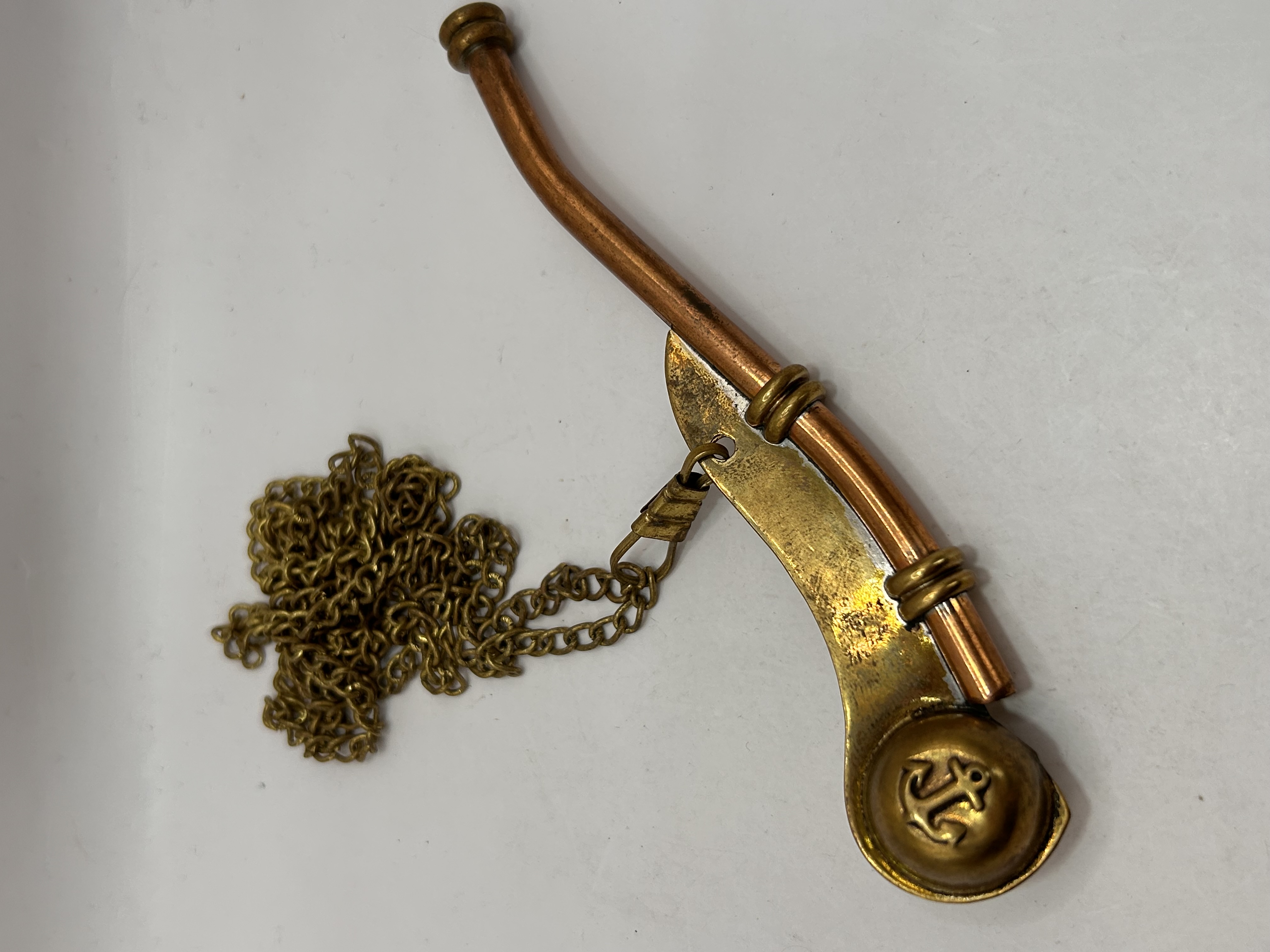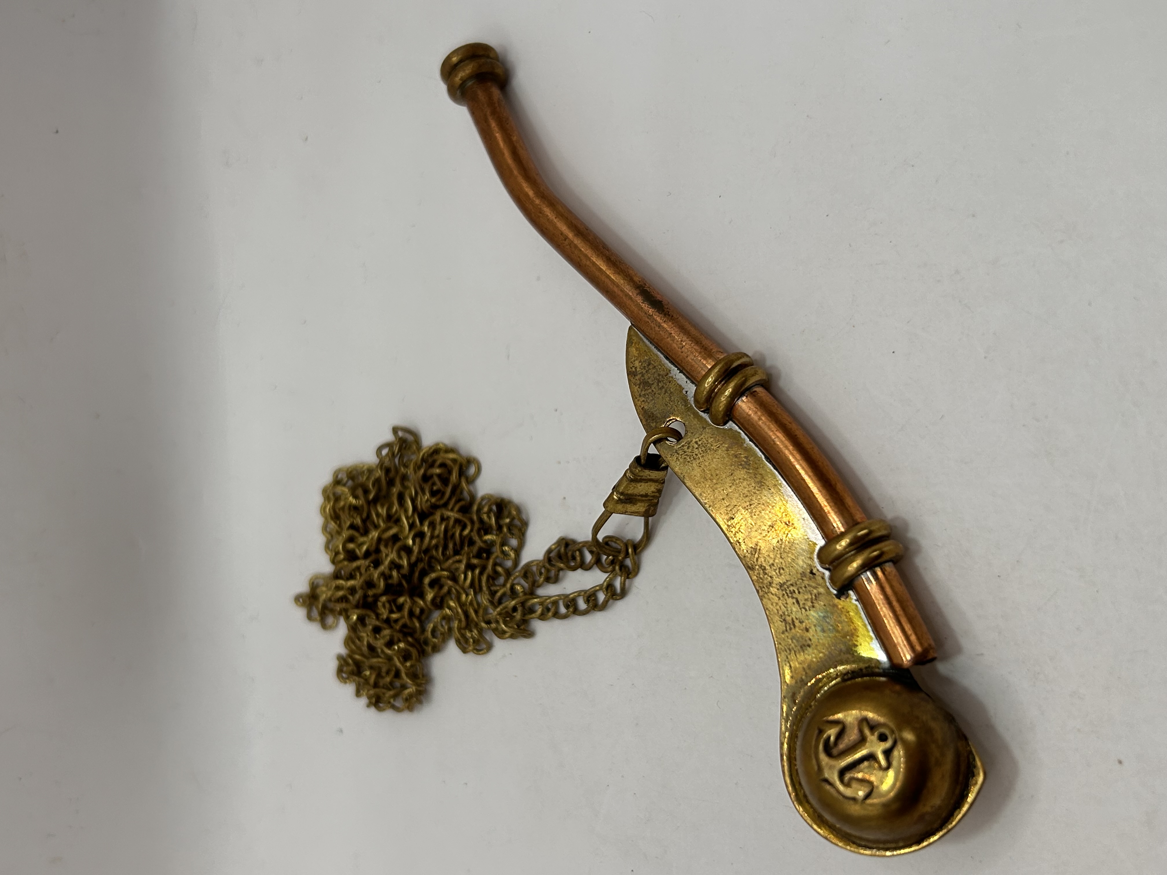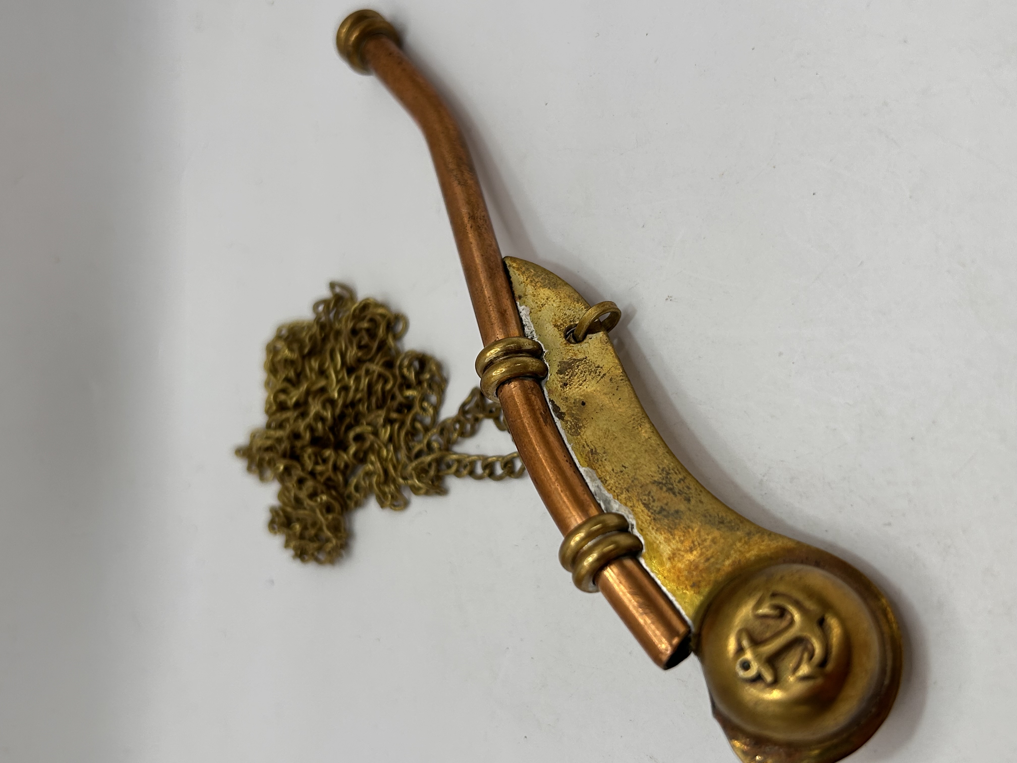 A nautical boatswain’s pipe, or bosun’s call, constructed of mixed metals. The central tube is copper, while the flat keel and the rounded buoy head are brass or bronze. The buoy head features a clearly embossed stylized anchor motif, a classic nautical marking. The whistle is attached to a length of brass link chain. This type of whistle is historically used for issuing commands aboard naval vessels.