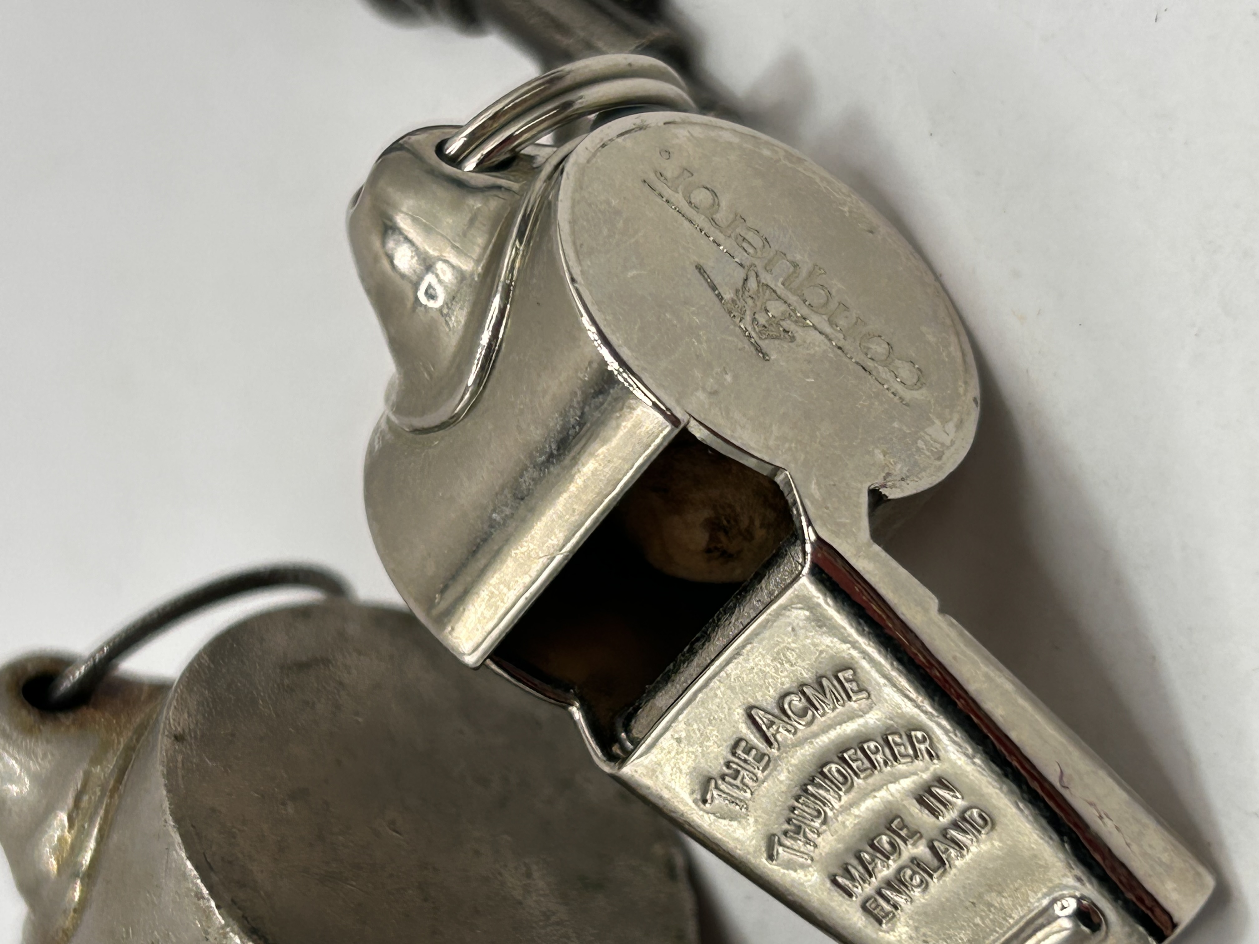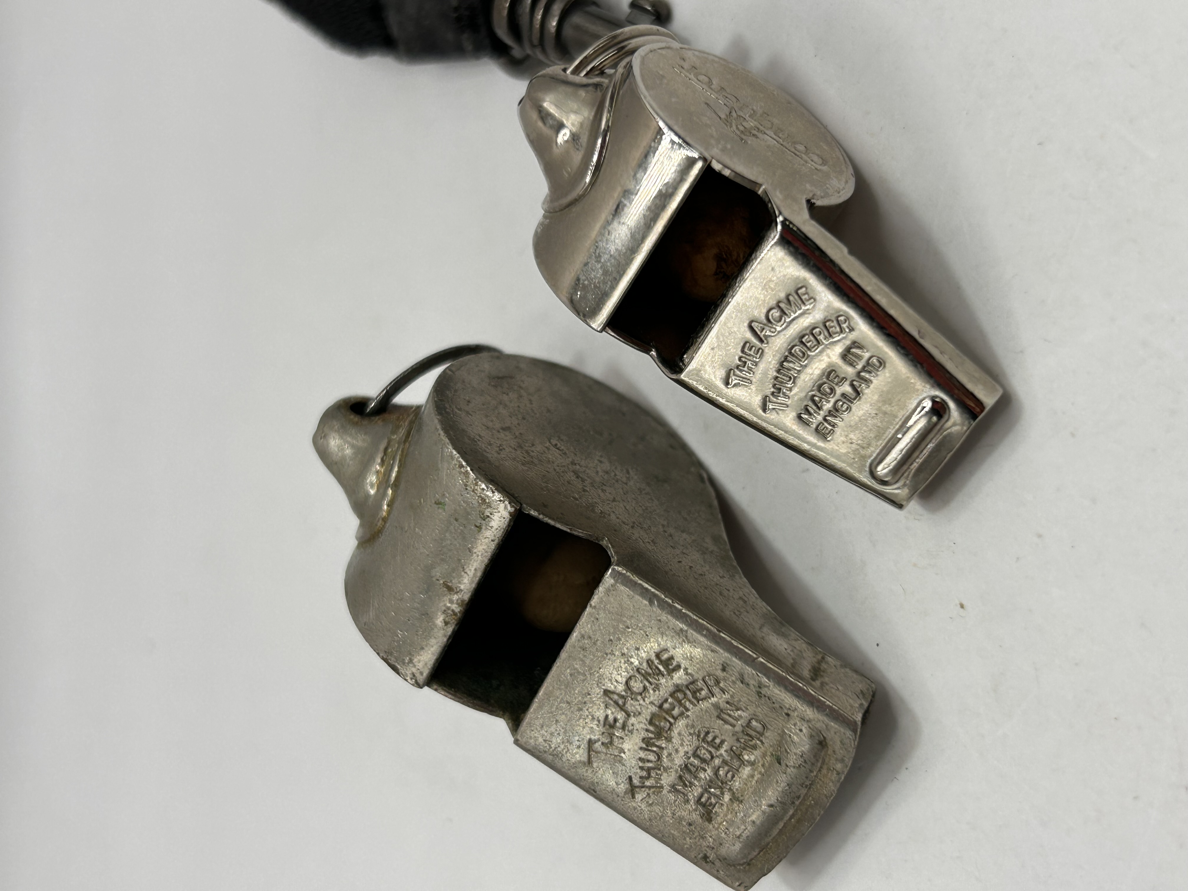 A pair of vintage utility whistles identified as “The Acme Thunderer,” constructed from silver-toned metal, likely nickel-plated brass. Both examples feature the standard pea (rattler) mechanism and are impressed with the text “THE ACME THUNDERER / MADE IN ENGLAND.” One whistle is additionally marked “CONQUEROR” on its body. Both retain metal split rings, and one is attached to a partial black lanyard.