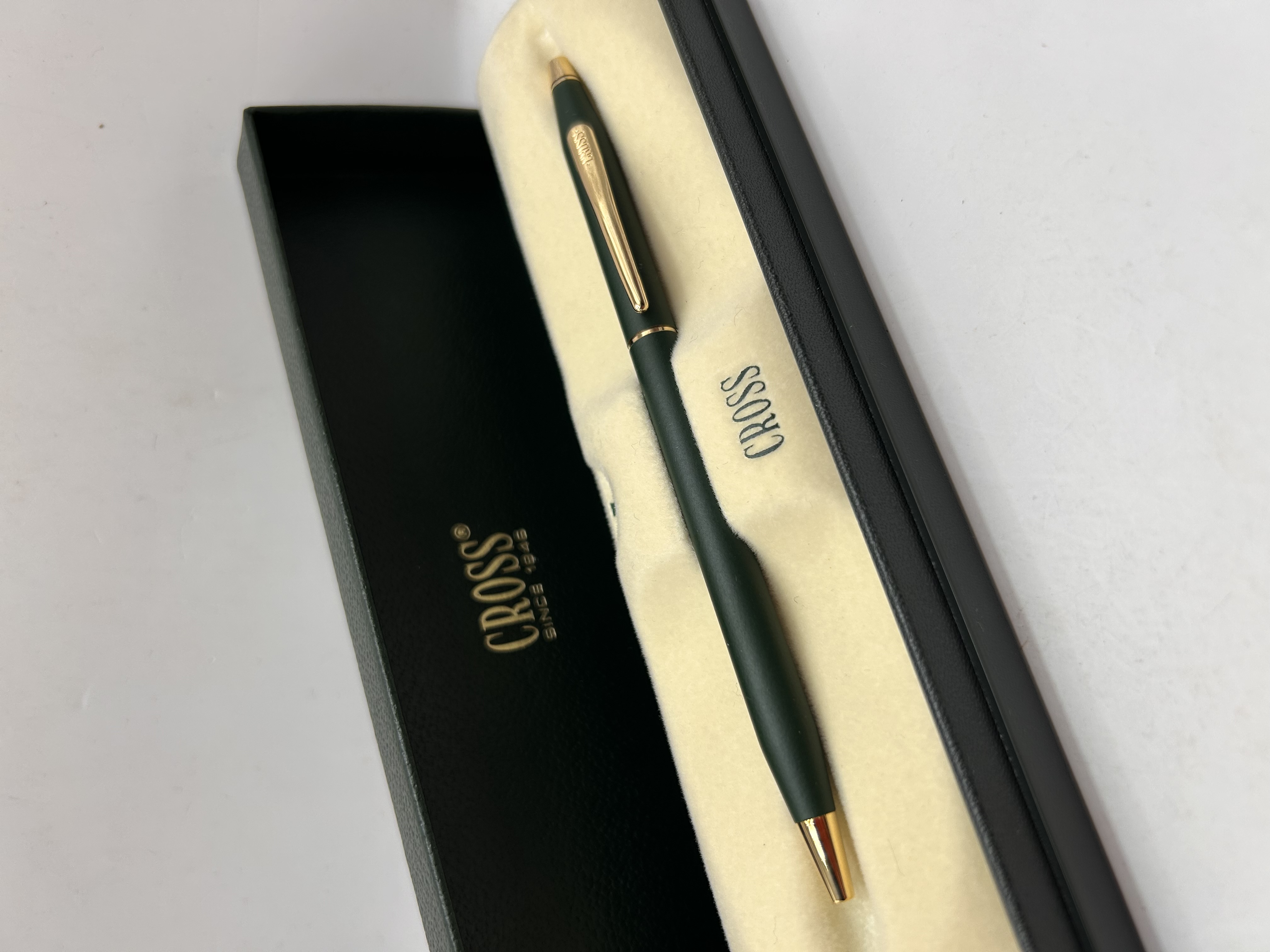 A Cross Classic Century ballpoint pen presented in its original packaging. The pen features a slender, cylindrical body finished in a matte dark green lacquer. The writing instrument is accented with gold-toned trim, visible on the cone tip, the central band, and the signature clip. The clip is marked with the “CROSS” brand name. The pen is housed in a dark presentation box with a cream-colored velvet interior. The interior lid is inscribed “CROSS ® SINCE 1846.” The box lining also features the “CROSS” branding.