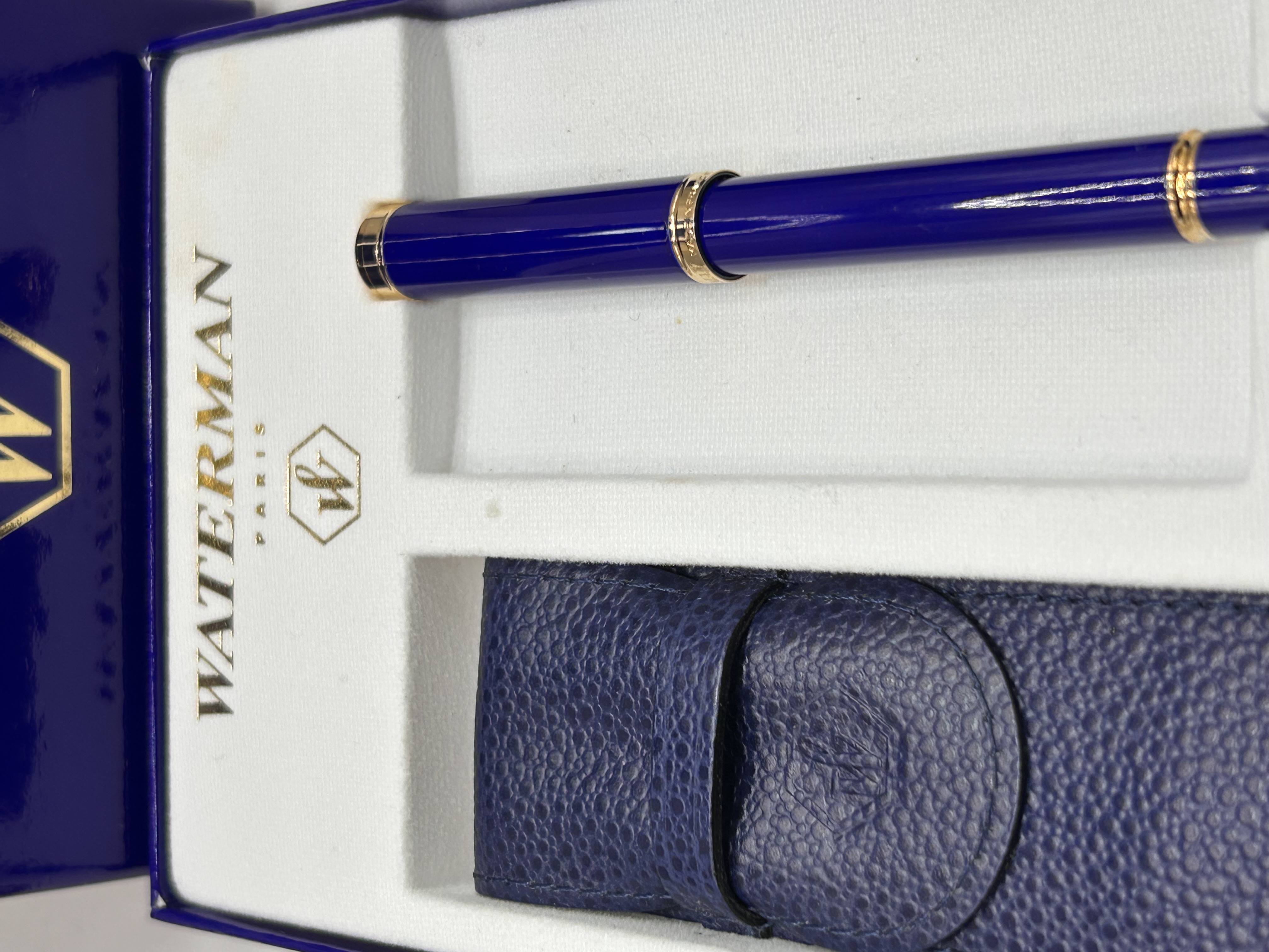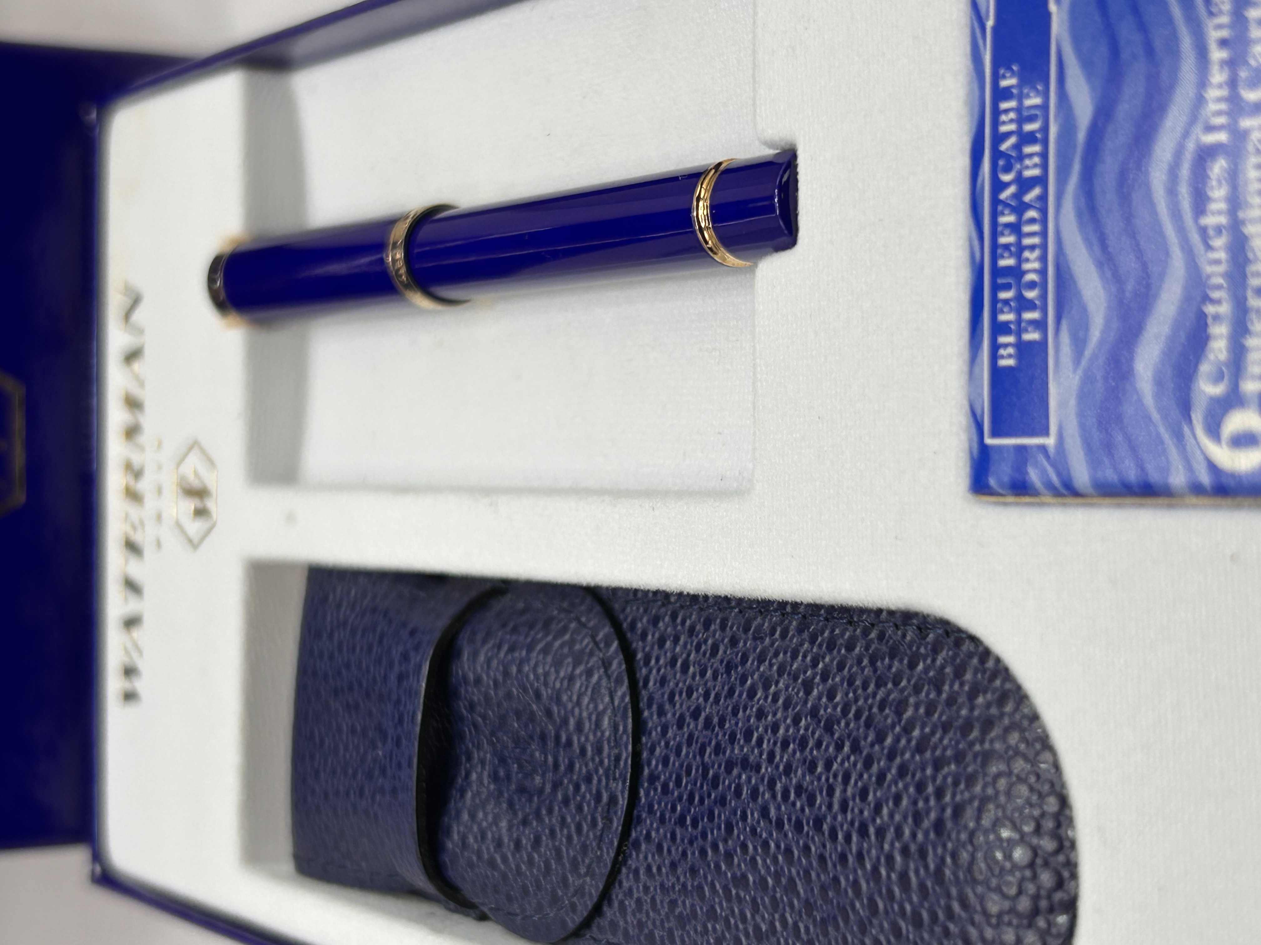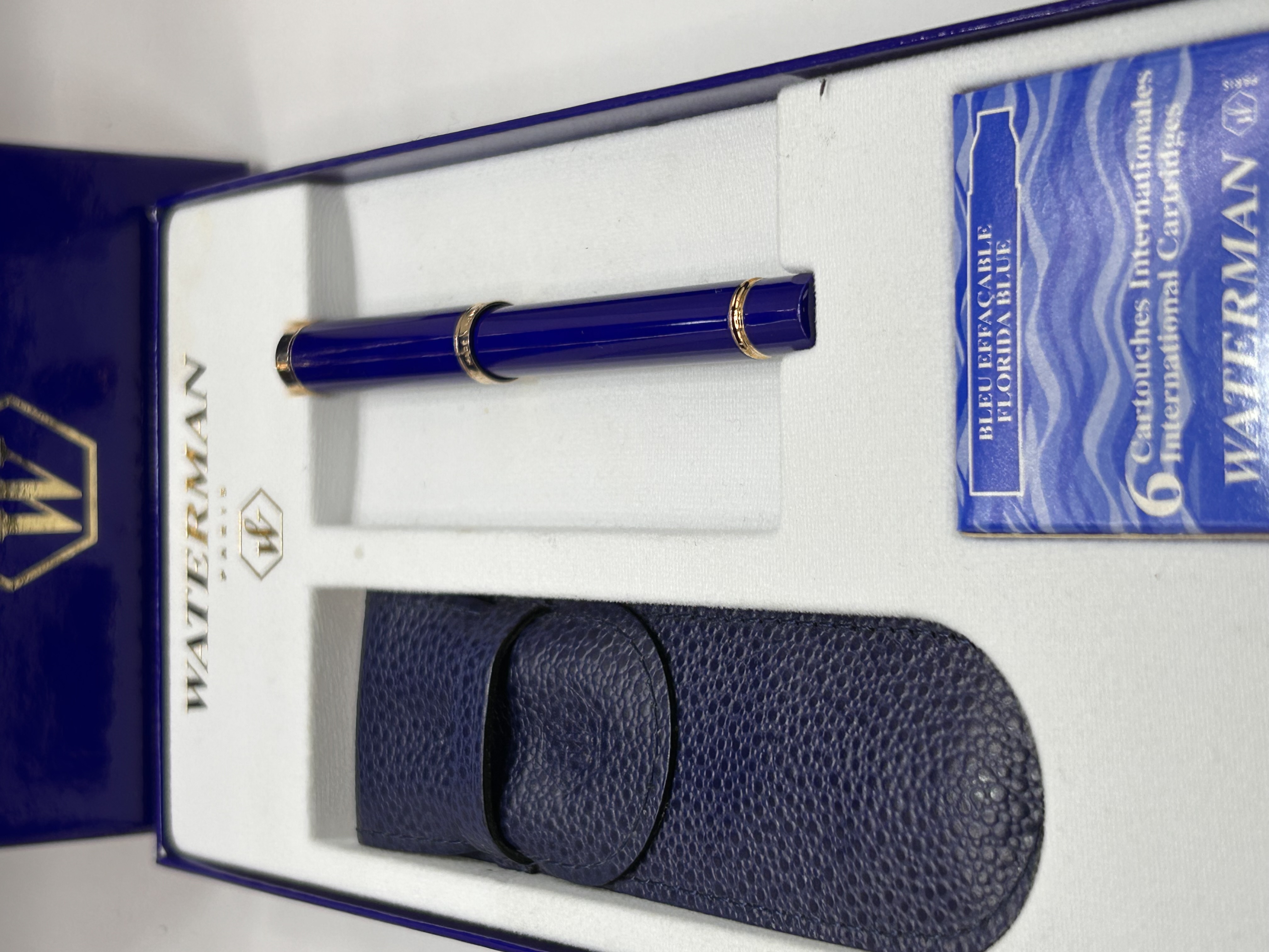 A complete contemporary Waterman writing instrument set housed in its original royal blue hinged cardboard presentation box. The box features the gold “WATERMAN PARIS” text and logo. The set contains a total of five major components: the presentation box, the internal fitted tray, a single sleek capped pen, a protective pouch, and a package of ink cartridges. The pen features a deep royal blue lacquer body accented by gold-toned trim details on the cap and barrel. The accompanying protective pouch is made of matching blue pebbled leather or leatherette with a flap closure. The included small package of six ink cartridges is marked “BLEU EFFACABLE,” “FLORIDA BLUE,” and “6 Cartouches Internationales / International Cartridges.”