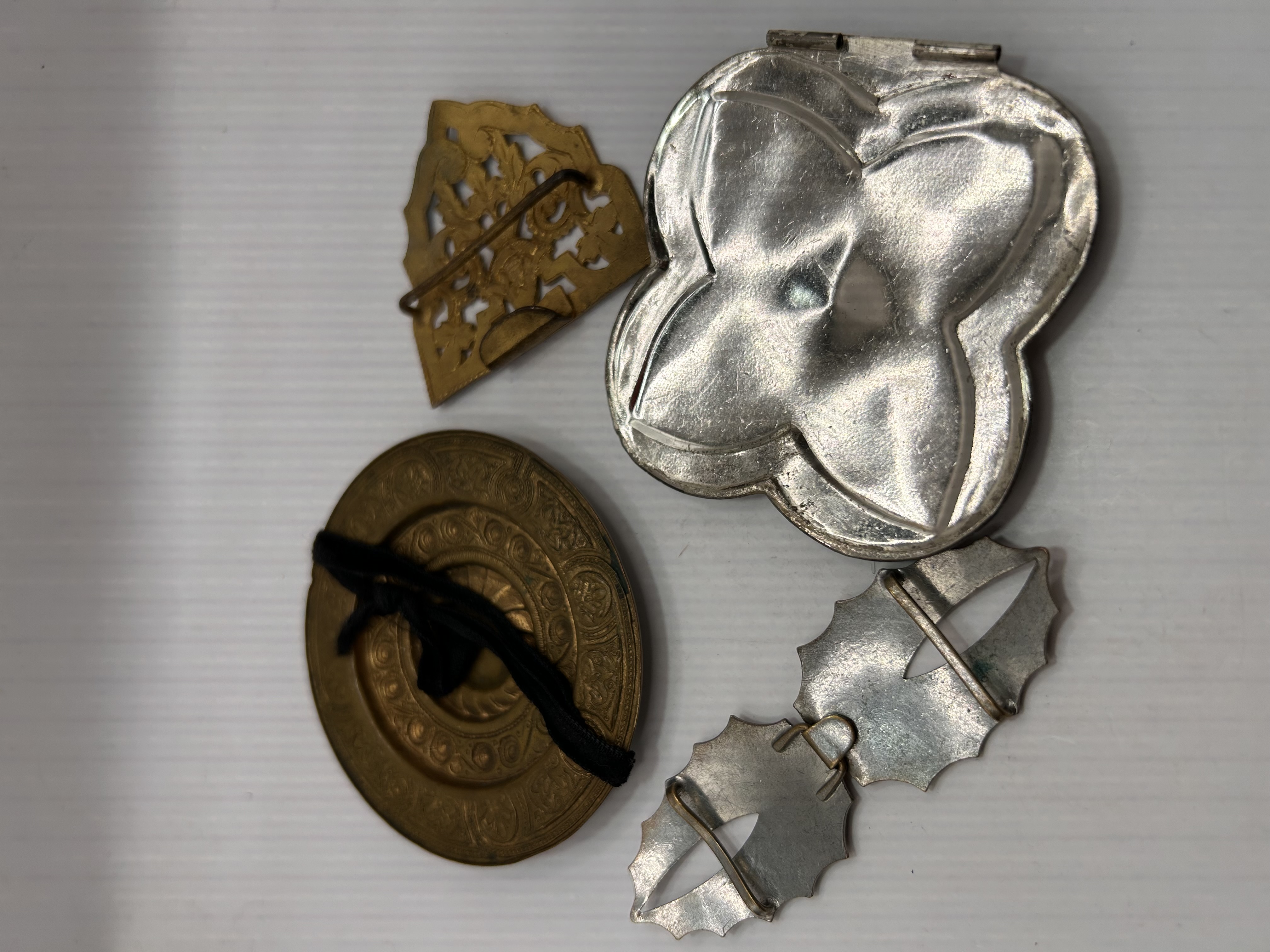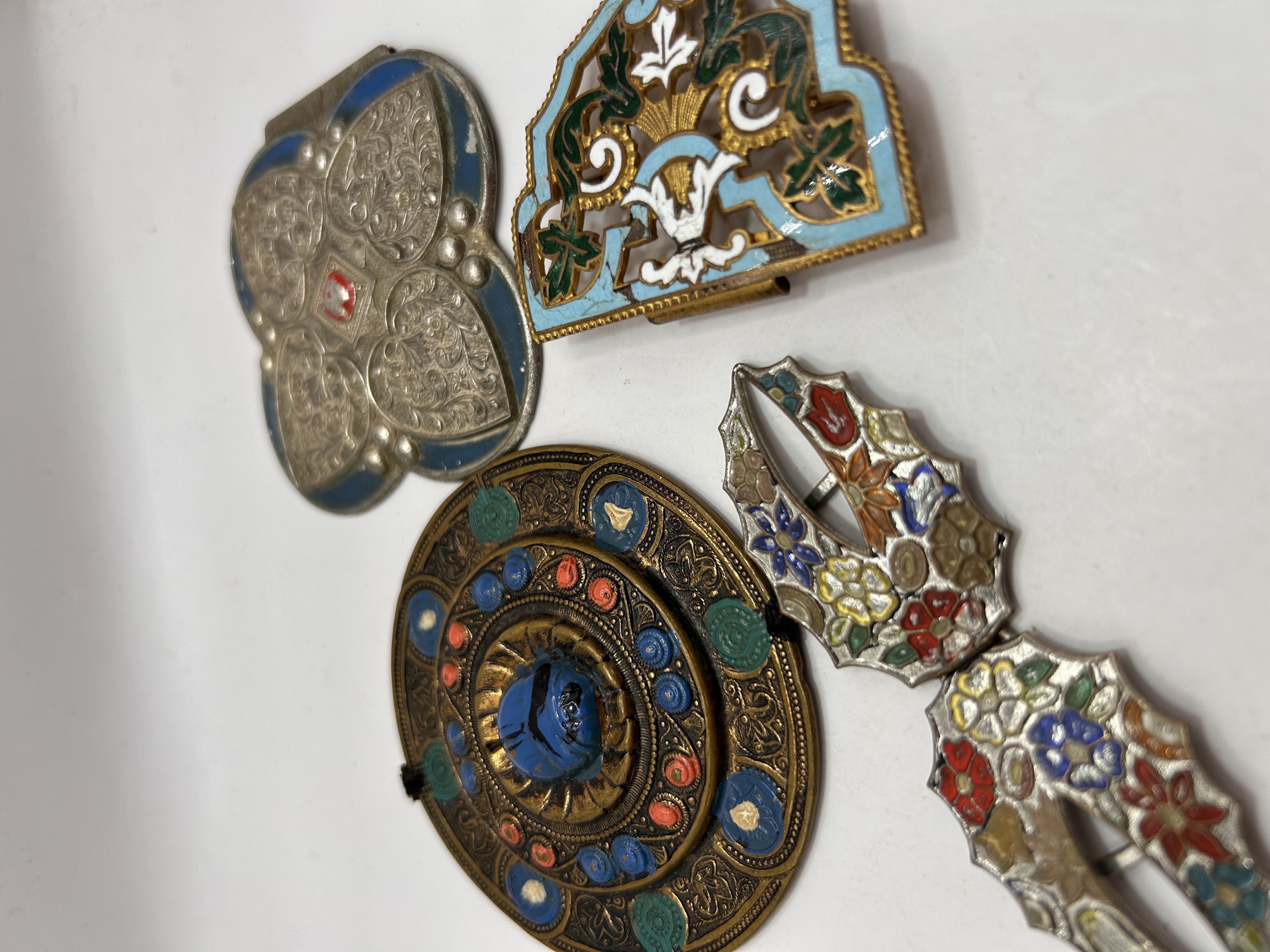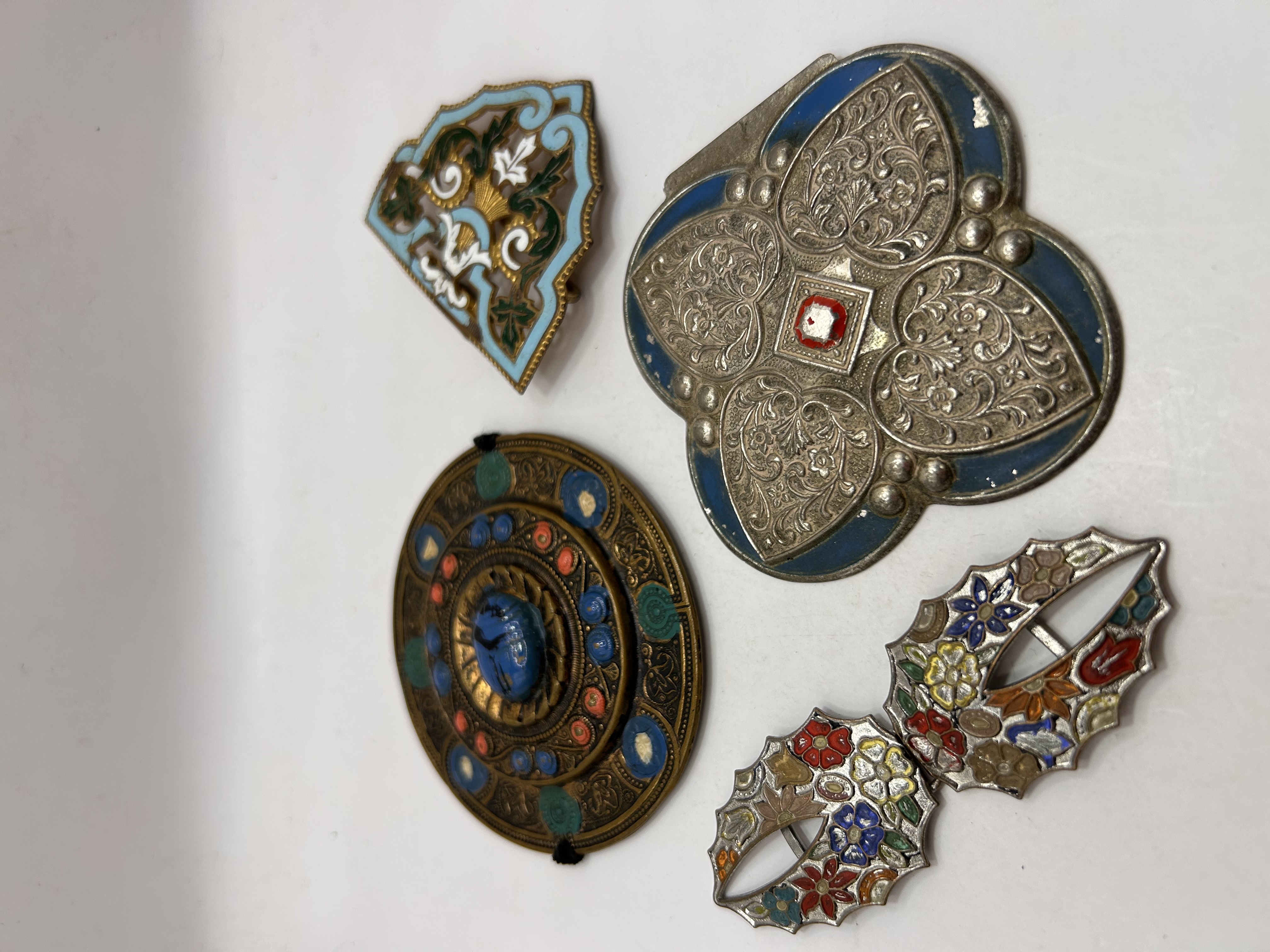 A collection of four vintage decorative metal accessories, consistent in style and technique with late 19th or early 20th Century Russian enameled silver belt fittings. The grouping includes assorted belt buckles and large clasps, utilizing various metals and extensive enameling techniques, including champlevé, cloisonné, and repoussé. The first piece is a large circular brass or bronze-tone buckle adorned with a central blue carved cabochon, possibly glass or stone, surrounded by concentric rings of blue, red, and green enamel or glass inlays. The second item is a silver-tone, two-part linked buckle featuring a polychrome floral design executed in champlevé or enamel fill. The third item is a large quatrefoil-shaped silver-tone buckle decorated with extensive repoussé foliate patterns, blue enamel borders, and a central red and white crest insignia. The final piece is a smaller, fan-shaped gold-tone clasp finished with detailed cloisonné enamel in light blue, white, and brown. No legible maker’s marks or textual identifiers are visible on any of the pieces.
