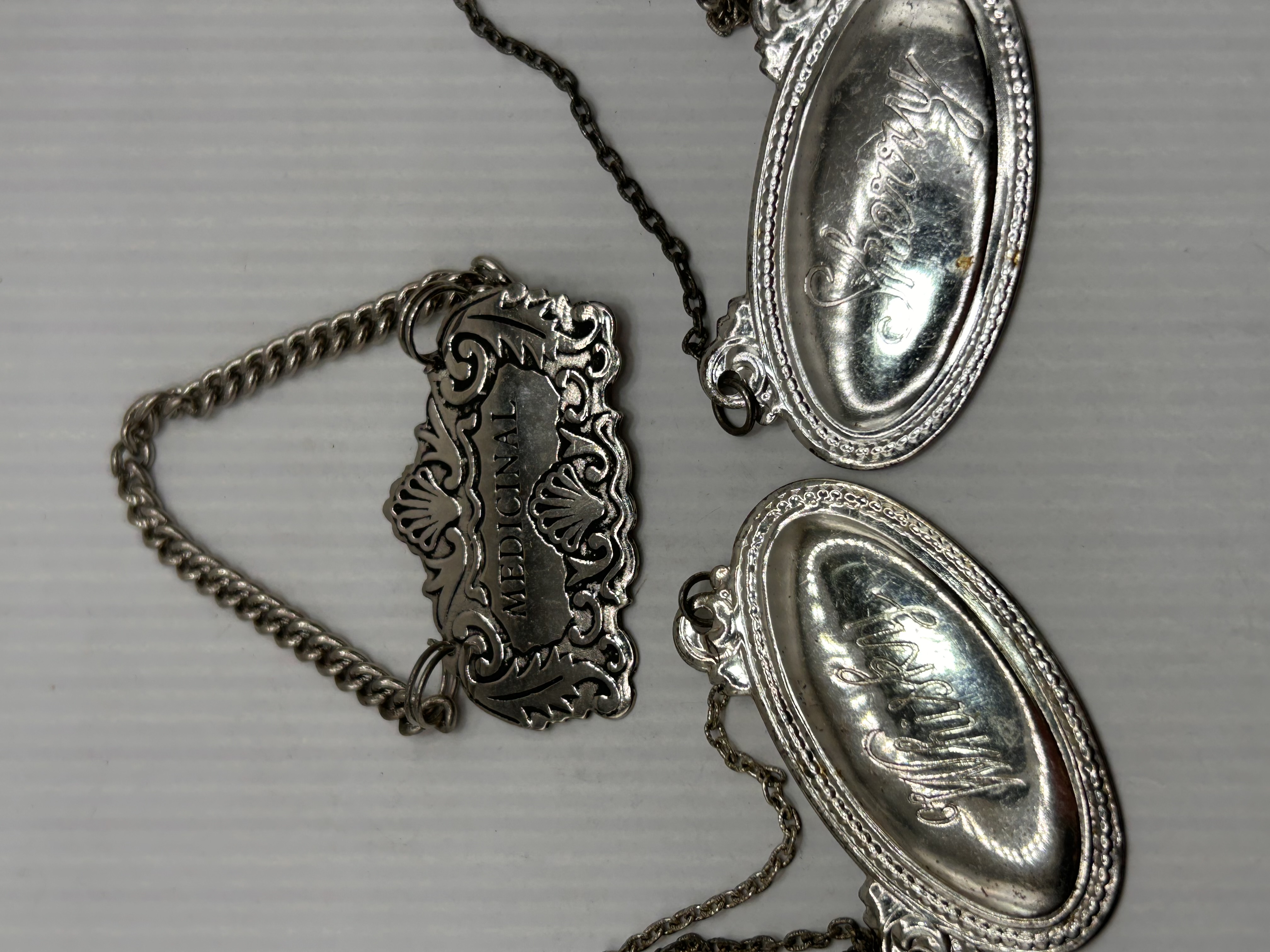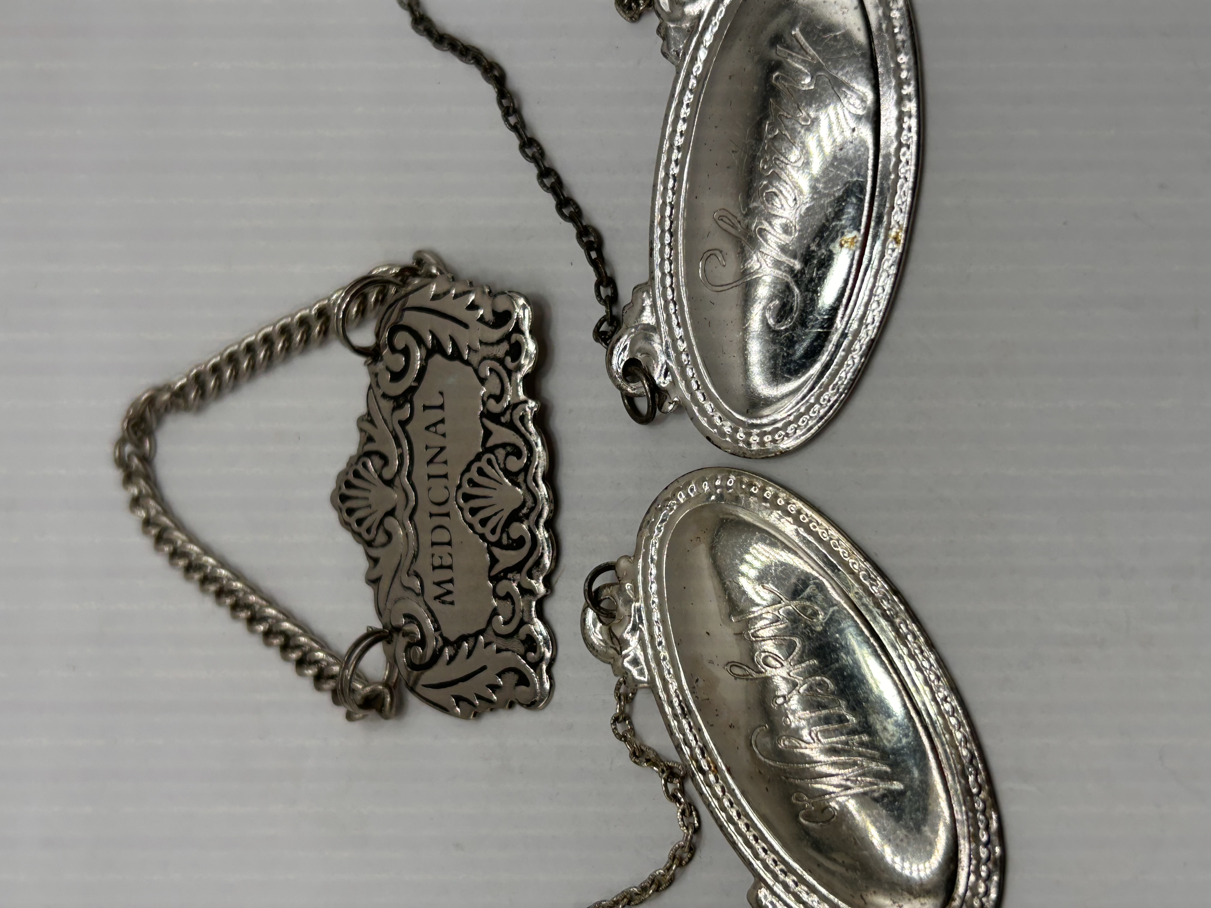 A trio of silver-toned decanter labels or bottle tickets, attributed to S. Kirk & Son based on market comparables for similar sterling silver liquor tags. The set includes three labels, each fitted with an attached curb chain for hanging. The labels are inscribed for “MEDICINAL,” “Whiskey,” and “Sherry.” The “MEDICINAL” label is rectangular, featuring extensive scrollwork and shell motifs. The “Whiskey” and “Sherry” labels are oval, featuring rope or beaded .