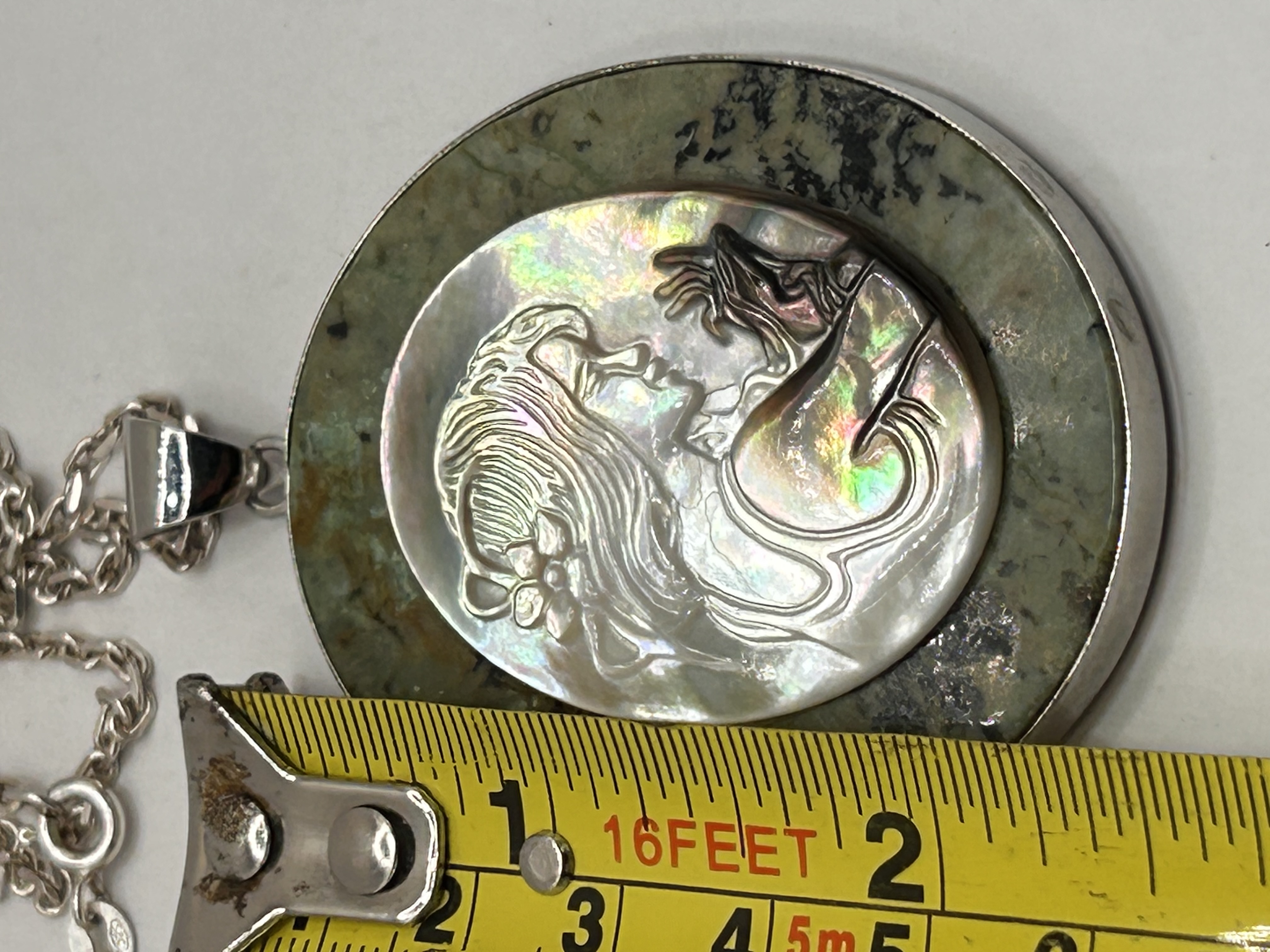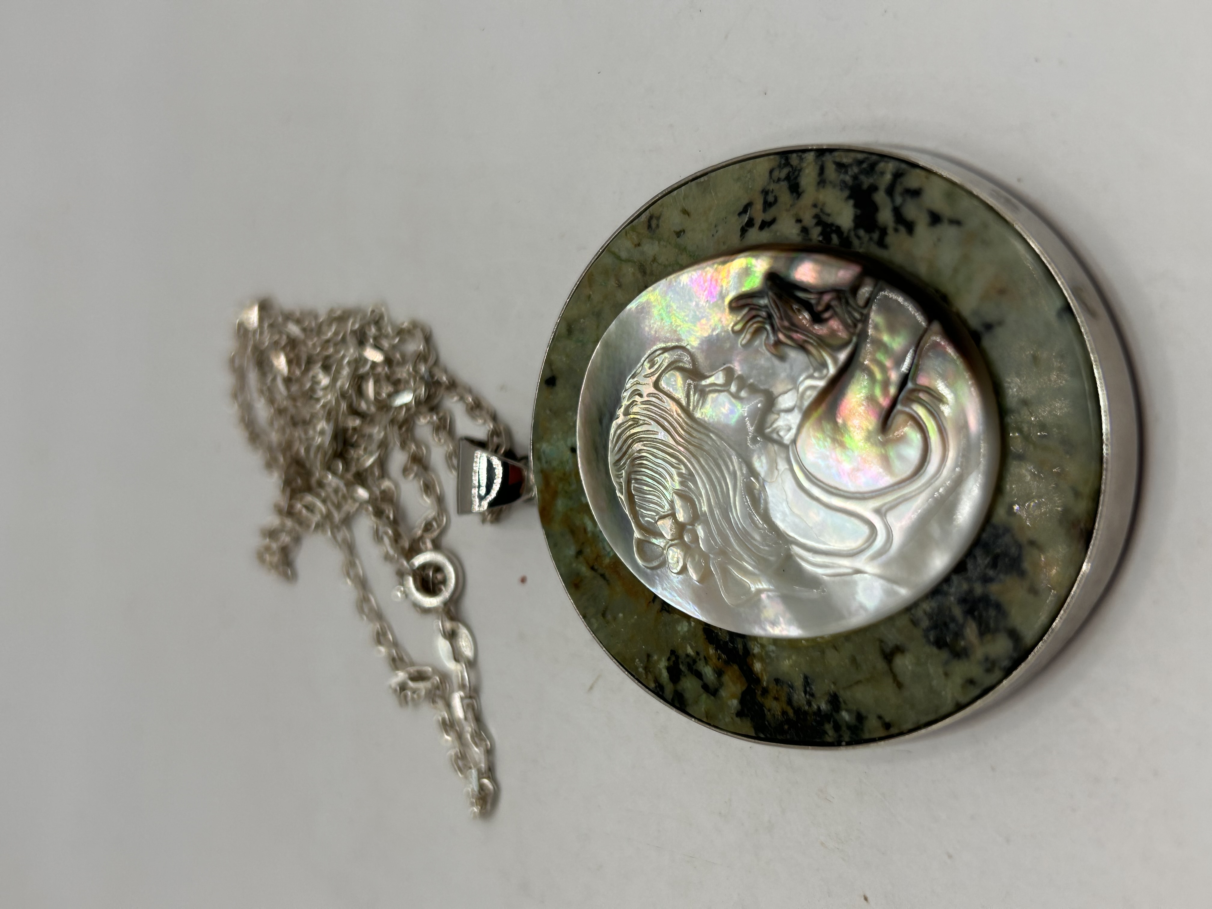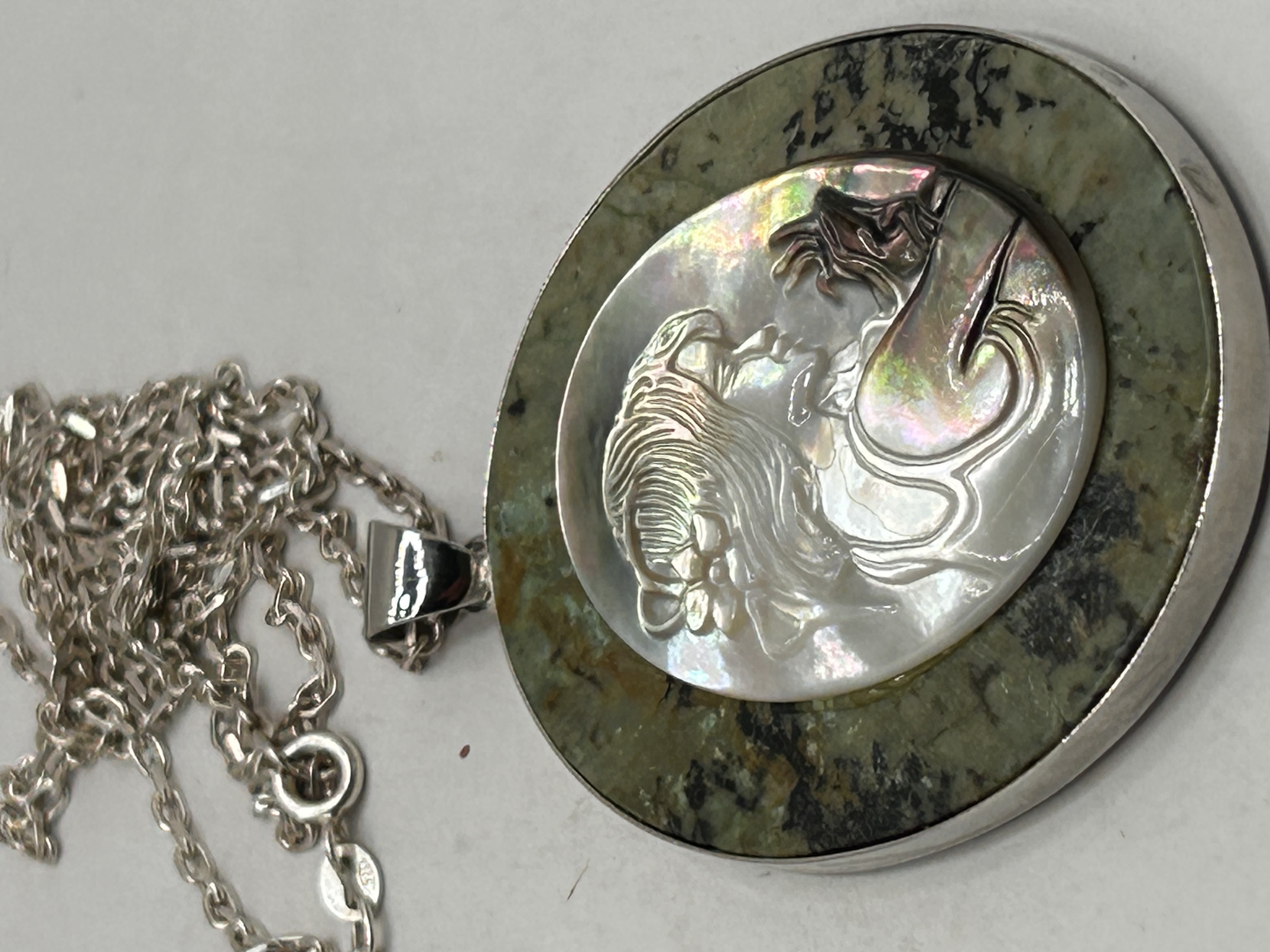 A single Art Nouveau style pendant necklace. The large, circular pendant features a bezel-set base stone, likely serpentine or jasper, exhibiting mottled green and black coloration. Centrally mounted on the base is an oval cabochon carved in bas-relief from iridescent mother-of-pearl or abalone shell, depicting the profile of a woman with flowing hair and stylized robes, characteristic of the Art Nouveau period. The pendant is suspended from a trace link chain fitted with a spring-ring clasp. The chain tab is marked 925, indicating Sterling Silver composition.