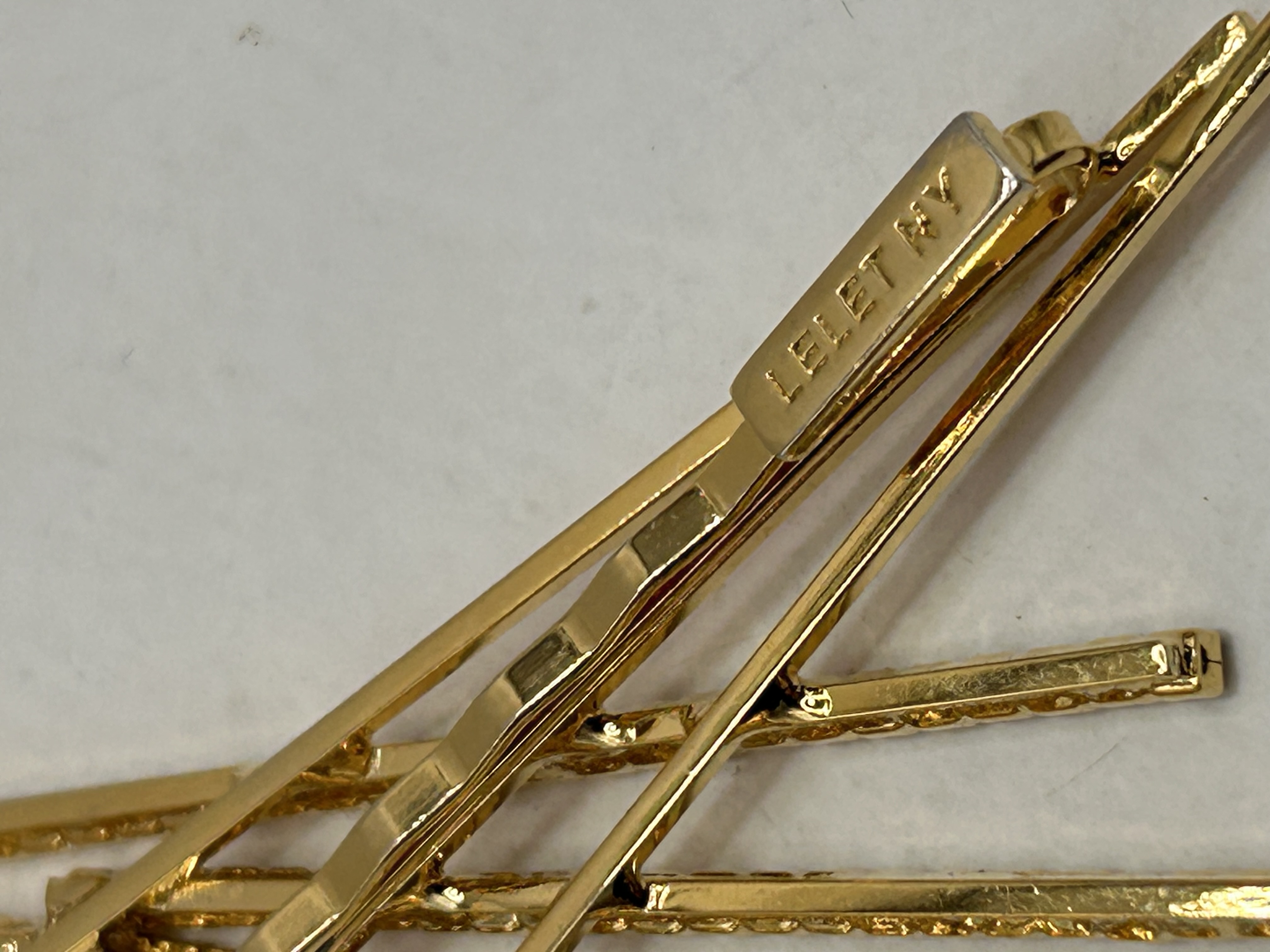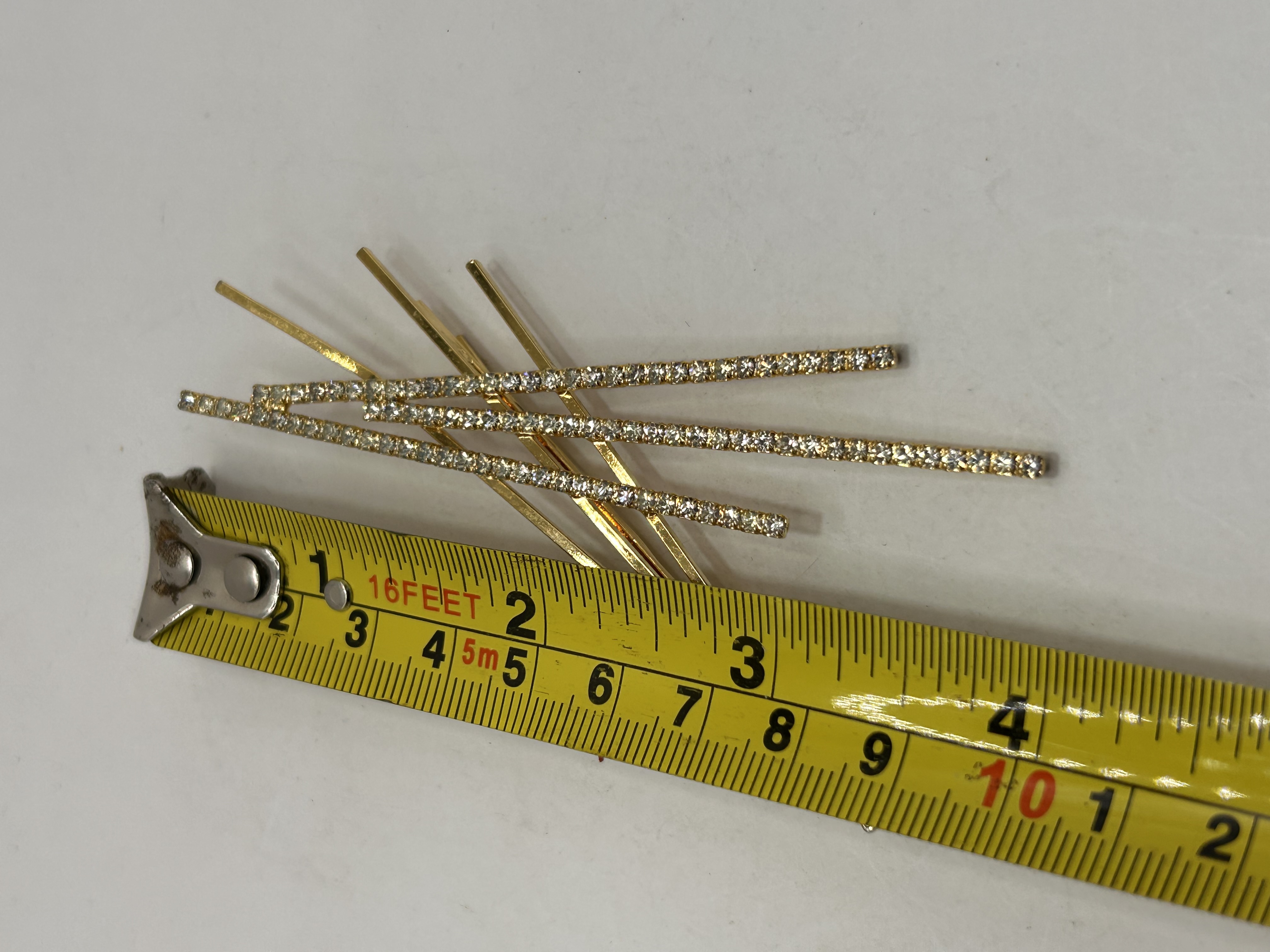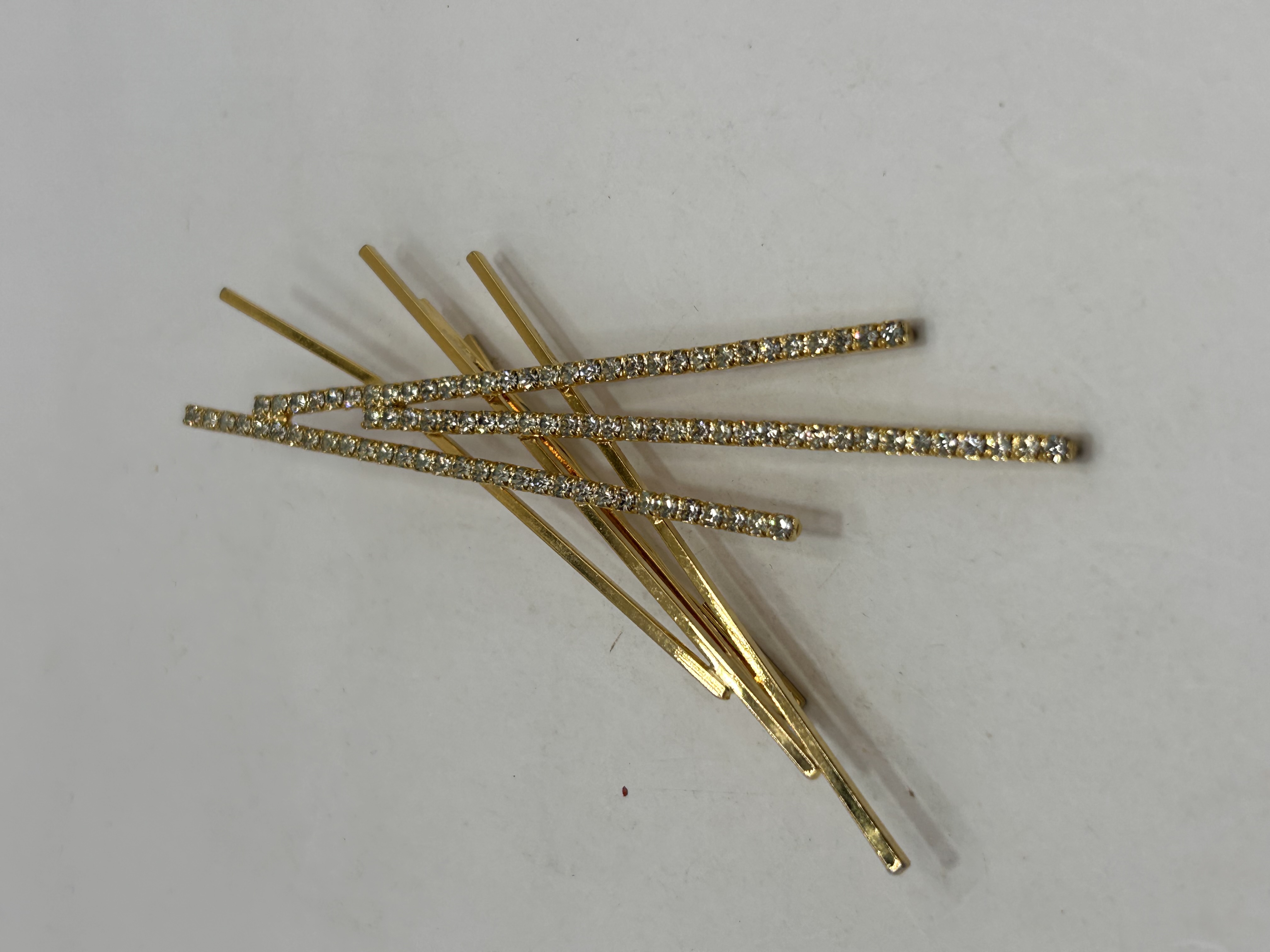 A hair accessories attributed to LELET NY. The clip constructed from a bright gold-toned base metal. The ornamental clips feature a long, narrow bar fully embellished with continuous rows of clear, colorless rhinestones set in a pavé style. The reverse of at least one of the plain clips is marked with the embossed text “LELET NY.”