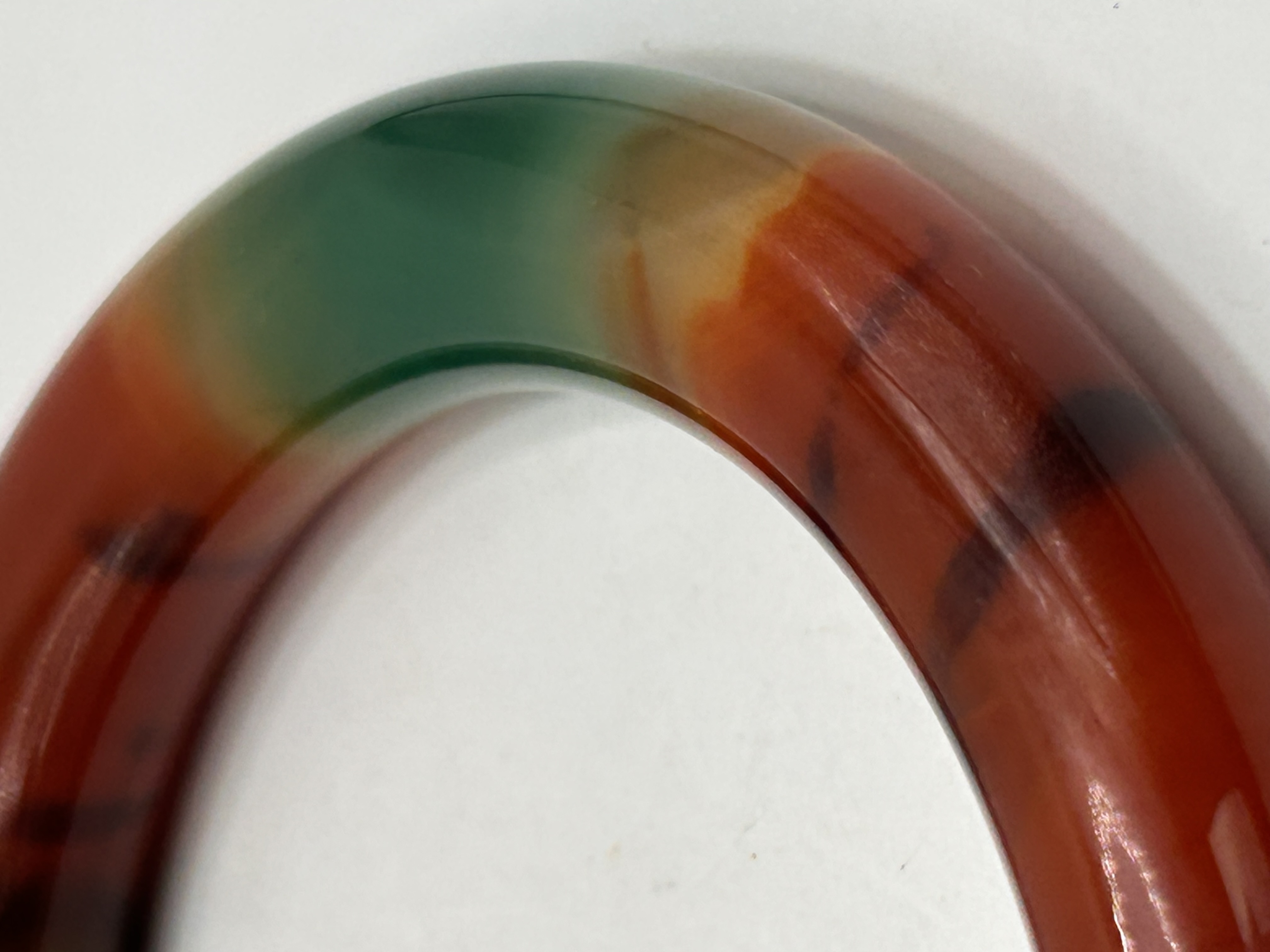 A single stone bangle bracelet featuring a classic closed-loop form and a rounded cross-section. The material is variegated stone, consistent with agate or chalcedony, frequently marketed in the trade as multi-colored jade. The stone exhibits striking, banded coloration blending deep reddish-brown, vibrant emerald green, yellowish-orange, and milky white/gray zones around the circumference. The piece is highly polished. There are no visible manufacturer markings or inscriptions.