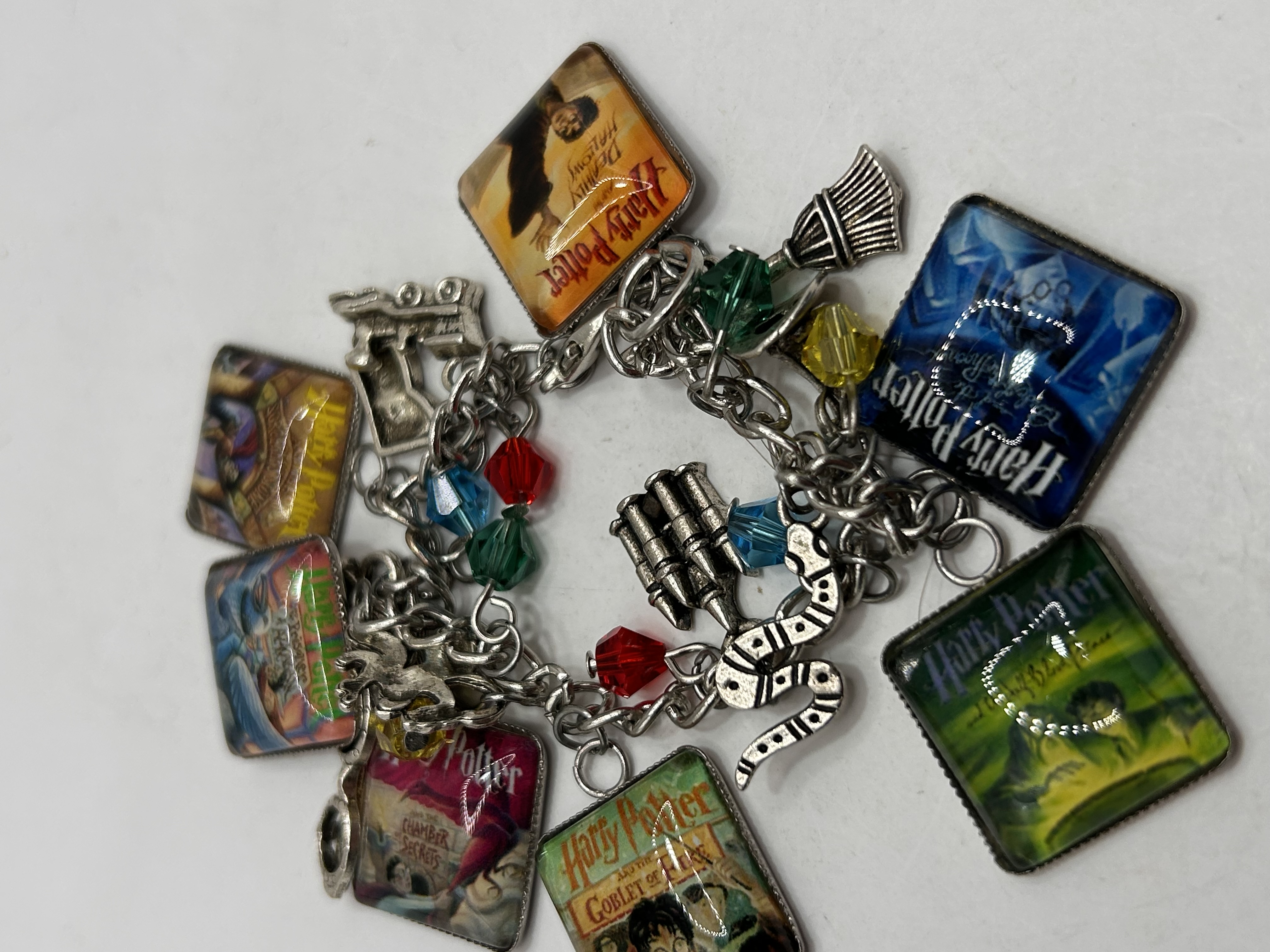 A novelty fashion charm bracelet based on the Harry Potter series. The bracelet features a silver-toned base metal chain adorned with a total of seventeen distinct charms and pendants. These include seven square pendants depicting printed covers or themed artwork from the Harry Potter novels, sealed under a domed epoxy or resin finish. Visible titles include “Harry Potter and the Goblet of Fire” and “Harry Potter and the Order of the Phoenix.” The remaining decorative elements consist of four themed base metal charms, including a Quidditch broomstick, a serpentine figure, and a bundle of three rods, along with six faceted glass or acrylic bead charms in red, green, blue, and yellow hues. The construction is consistent with modern costume jewelry.