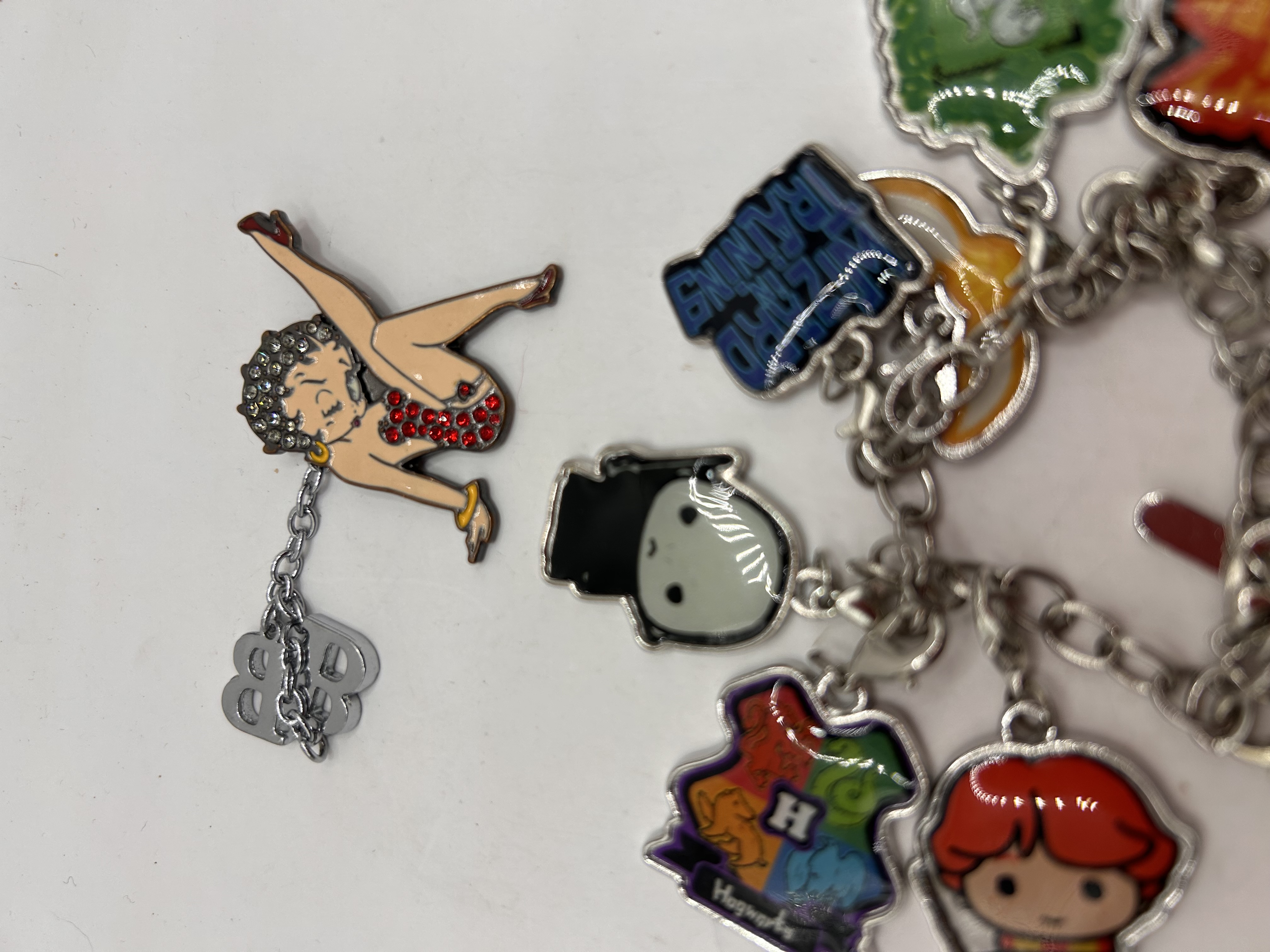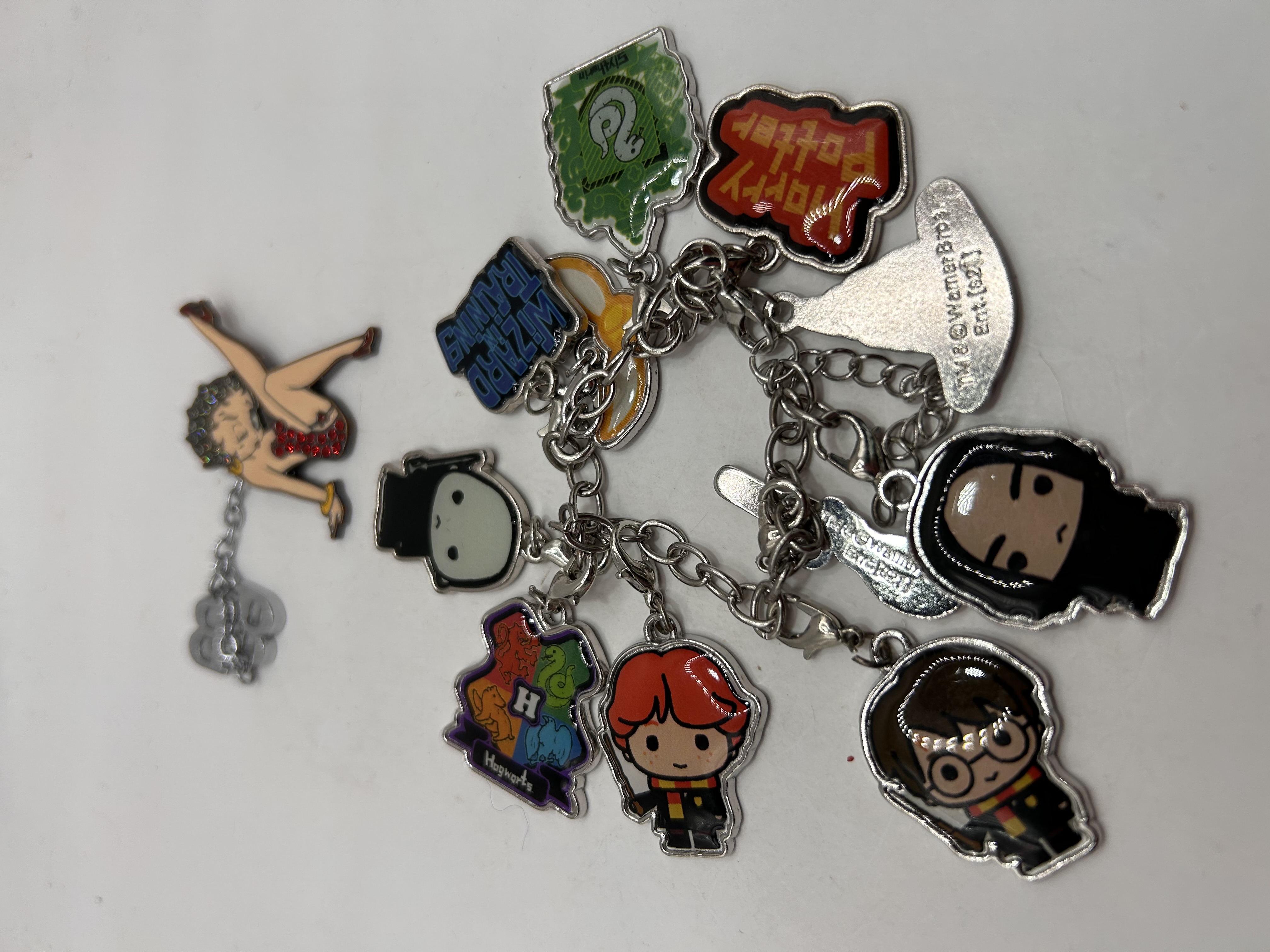 The collection consists of eleven items of contemporary novelty costume jewelry. The primary component is a silver-tone linked chain bracelet adorned with ten attached enameled metal charms related to the Warner Bros. Harry Potter franchise. The charms feature brightly colored enamel fill depicting stylized characters, house logos, and key symbols from the series. A visible marking on the witch hat charm confirms the official provenance: TM & © Warner Bros. Ent. [s02]. The charms are constructed of silver-tone base metal with glossy enamel or epoxy fill. The collection also includes one unattached pendant or pin depicting a reclining Betty Boop figure, detailed with red paste rhinestones and attached to a short length of chain.