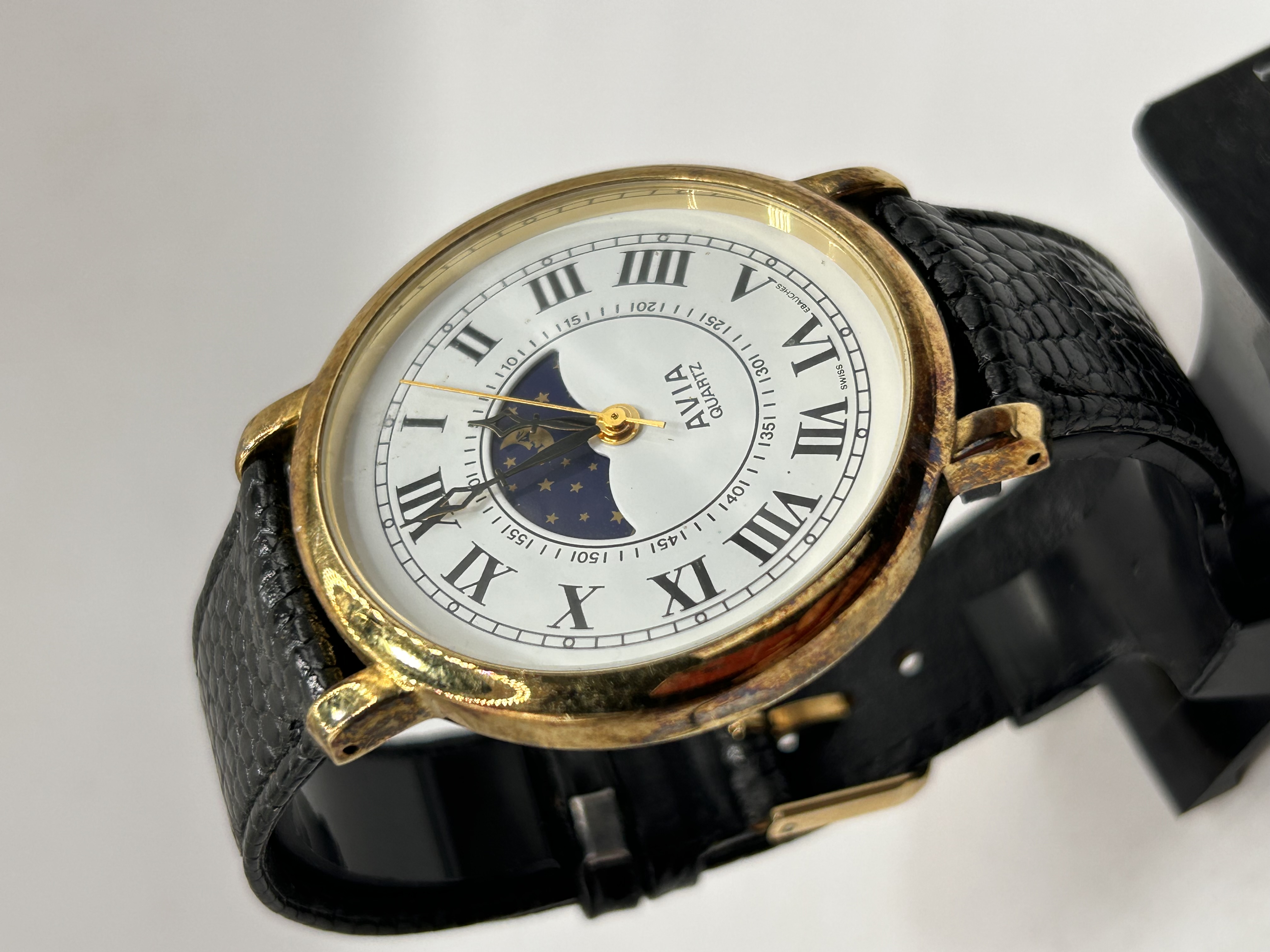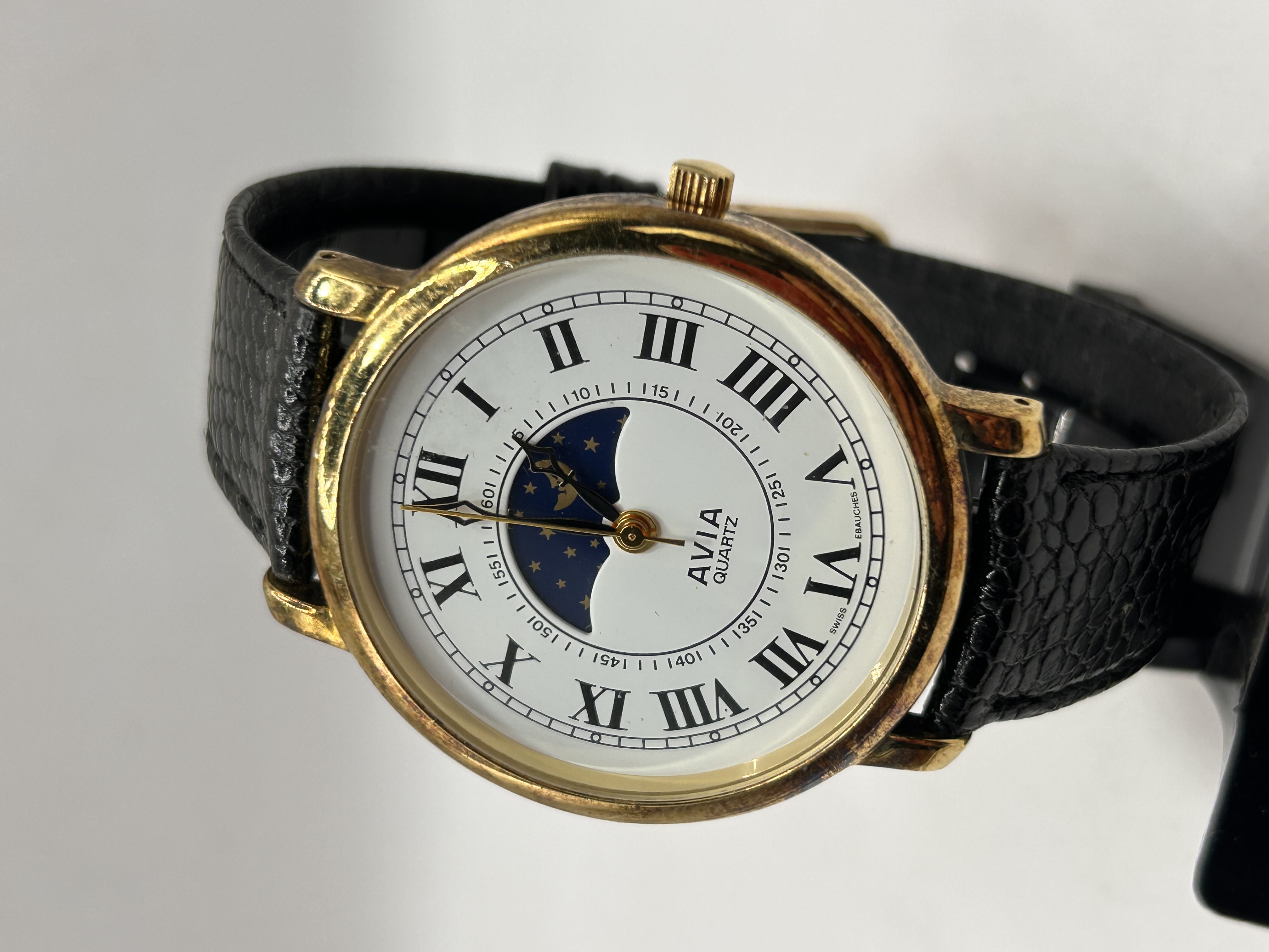 A single vintage Avia quartz wristwatch featuring a classic dress style. The watch has a circular gold-toned metal case and is fitted with a black textured leather strap exhibiting a reptile-skin pattern. The white dial displays black Roman numeral hour markers. A crescent-shaped complication, likely a day/night or moon phase indicator, is located centrally beneath the twelve position, featuring a dark blue field with stars and a sun/moon motif. Visible markings on the dial include “AVIA QUARTZ” centered below the complication, and “SWISS EBAUCHES” in small print near the six position. The movement is quartz.