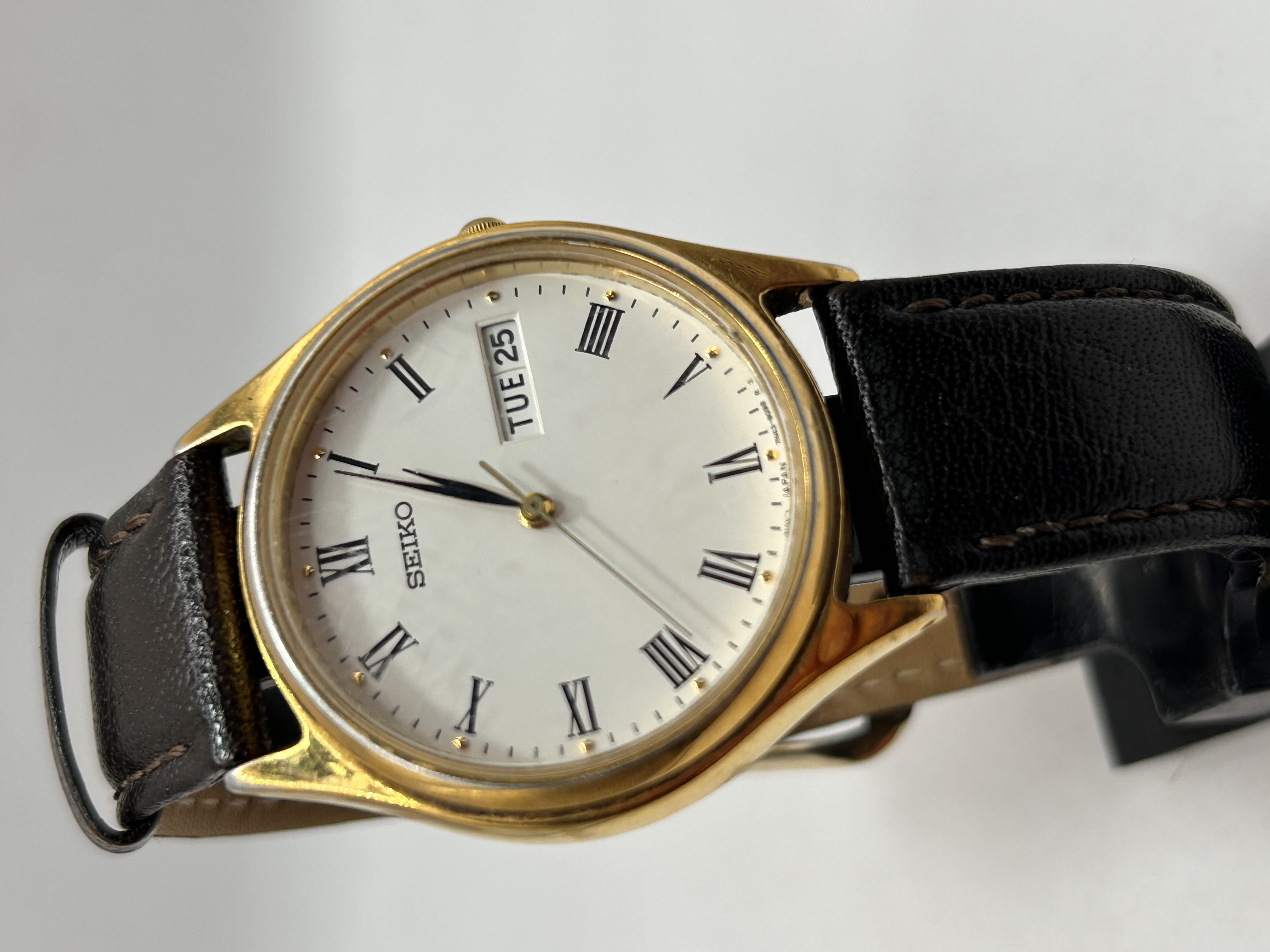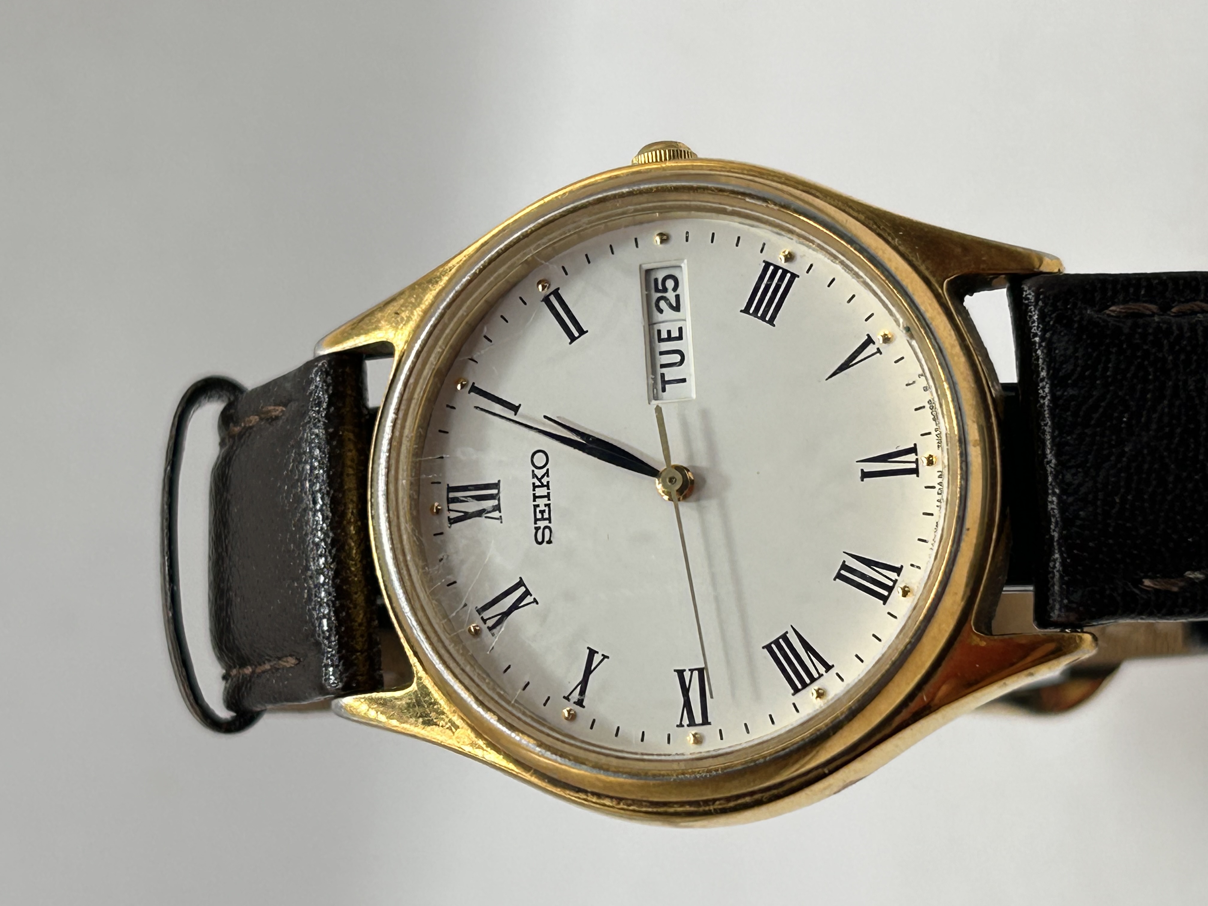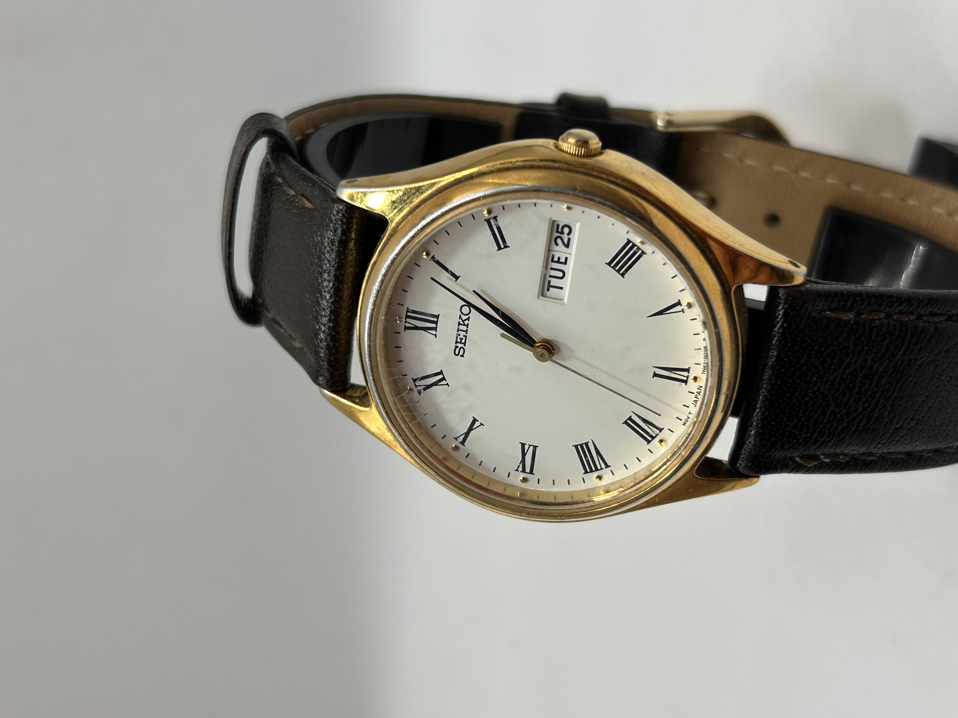 A Seiko quartz wristwatch, identified by the consistent market consensus as a Roman Day-Date dress model, typically associated with the late 1990s or early 2000s. The watch features a gold-toned round case and a white dial marked by black Roman numeral hour markers and baton hands. The quartz movement is consistent with the 7N43 designation. The dial includes a day/date complication window located at the 3 o’clock position, currently displaying “TUE 25.” Inscriptions visible on the dial include “SEIKO” below the 12 position and the movement code “JAPAN 7N43-8020 R” near the 6 position. The watch is secured by a dark leather strap with visible stitching.