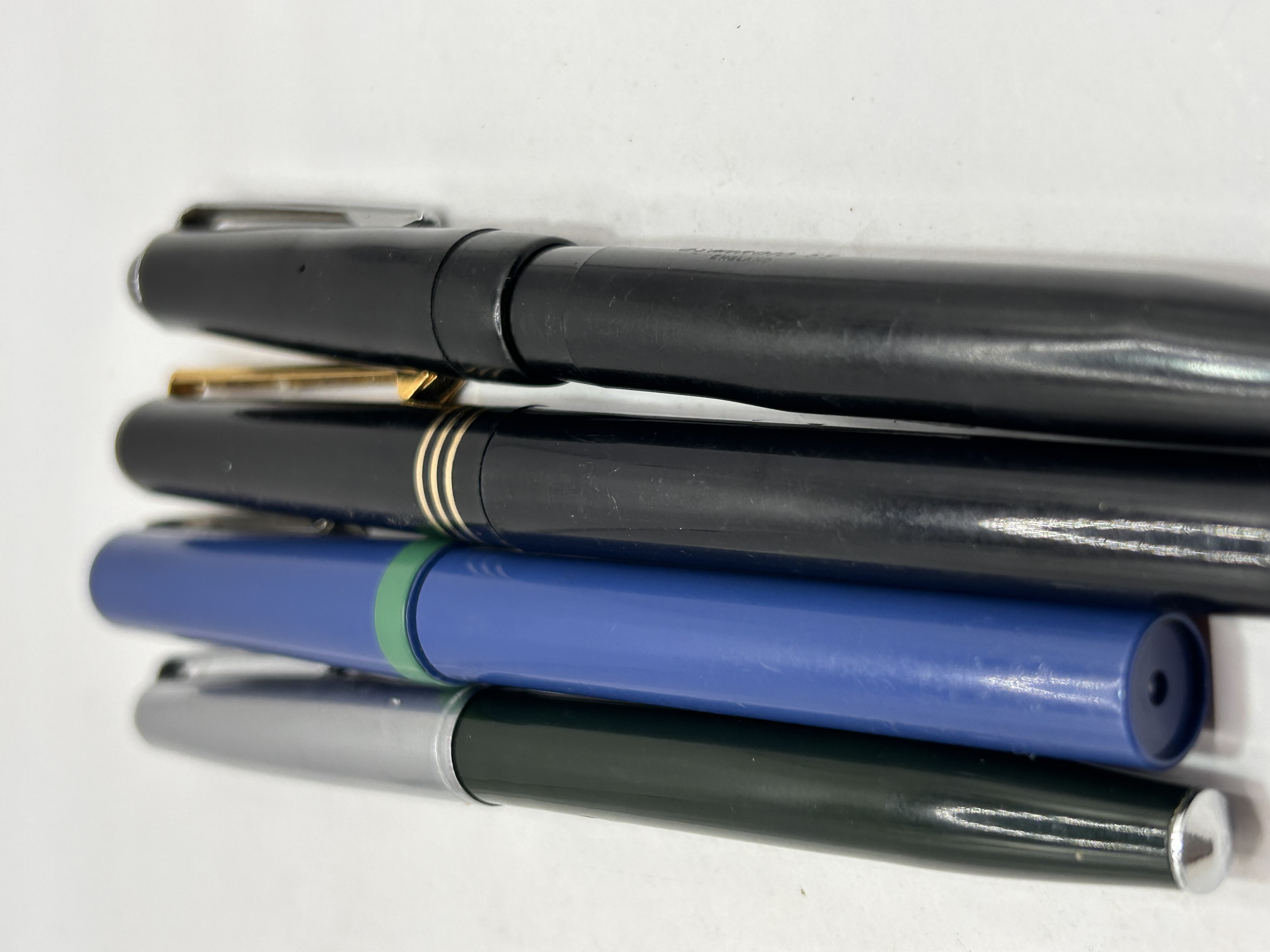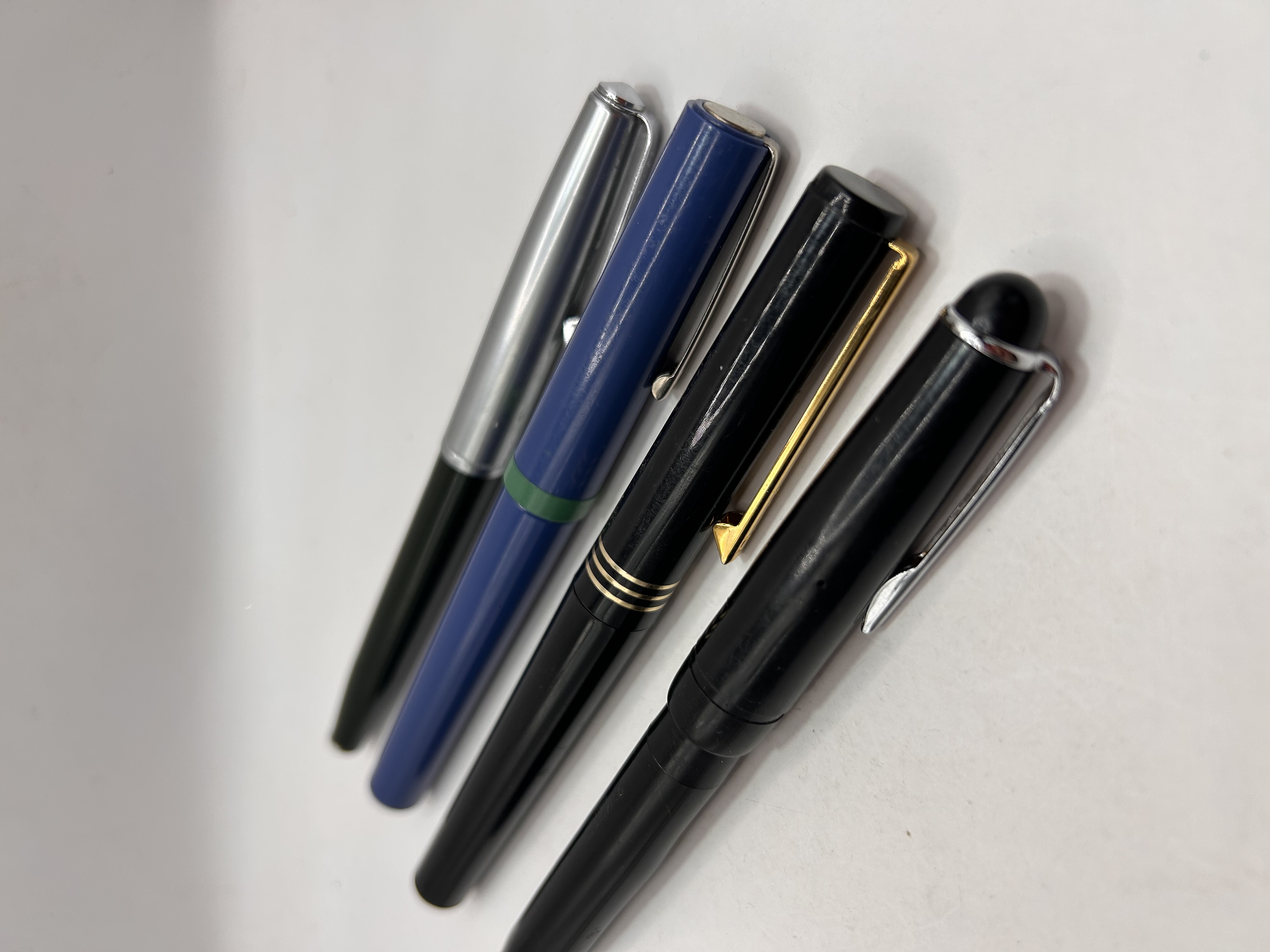 A collection of four compact fountain pens, consistent in style with the Sport series, and potentially including vintage models such as Osmiroid. The collection features various material and color combinations. One pen is constructed of black resin with a silver-tone clip. A second black pen features three narrow gold-tone trim bands near the cap base and a gold-tone clip. The third pen has a smooth blue plastic cap and body with a narrow green plastic accent ring near the cap base. The fourth item consists of a dark green lower section paired with a contrasting silver-tone metal cap and silver-tone clip. All pens are capped writing instruments. No manufacturer markings are visible on the exterior surfaces.