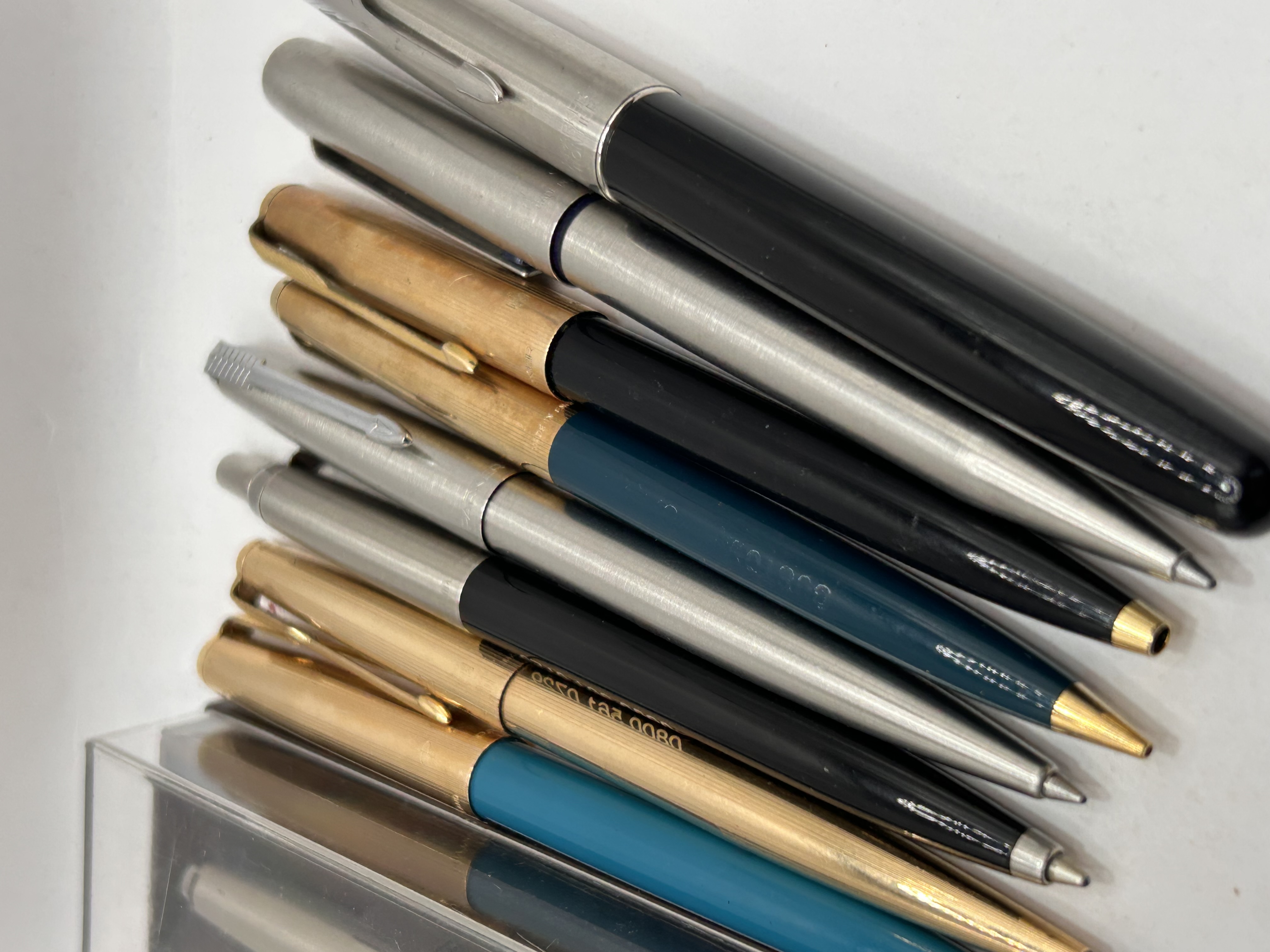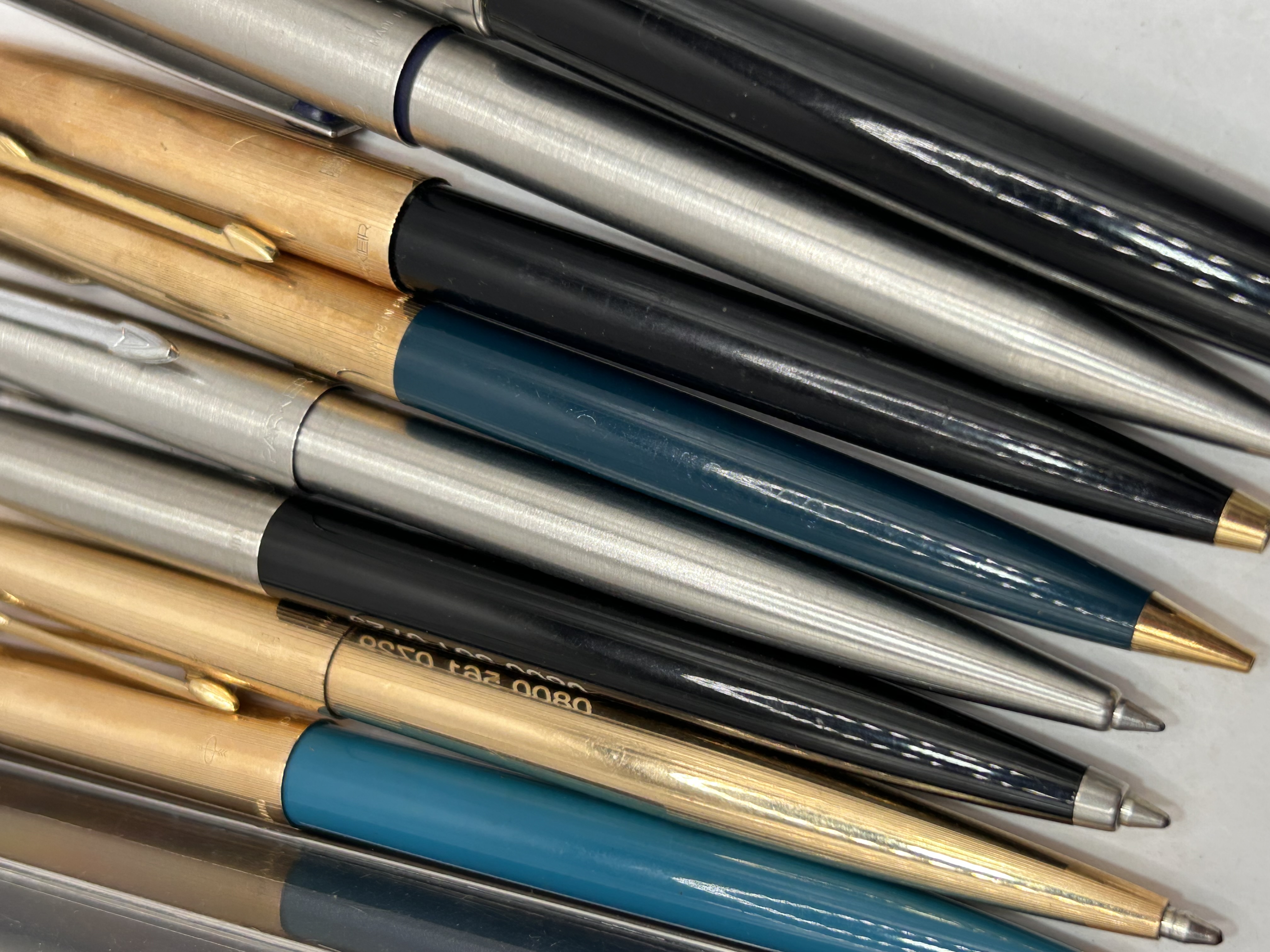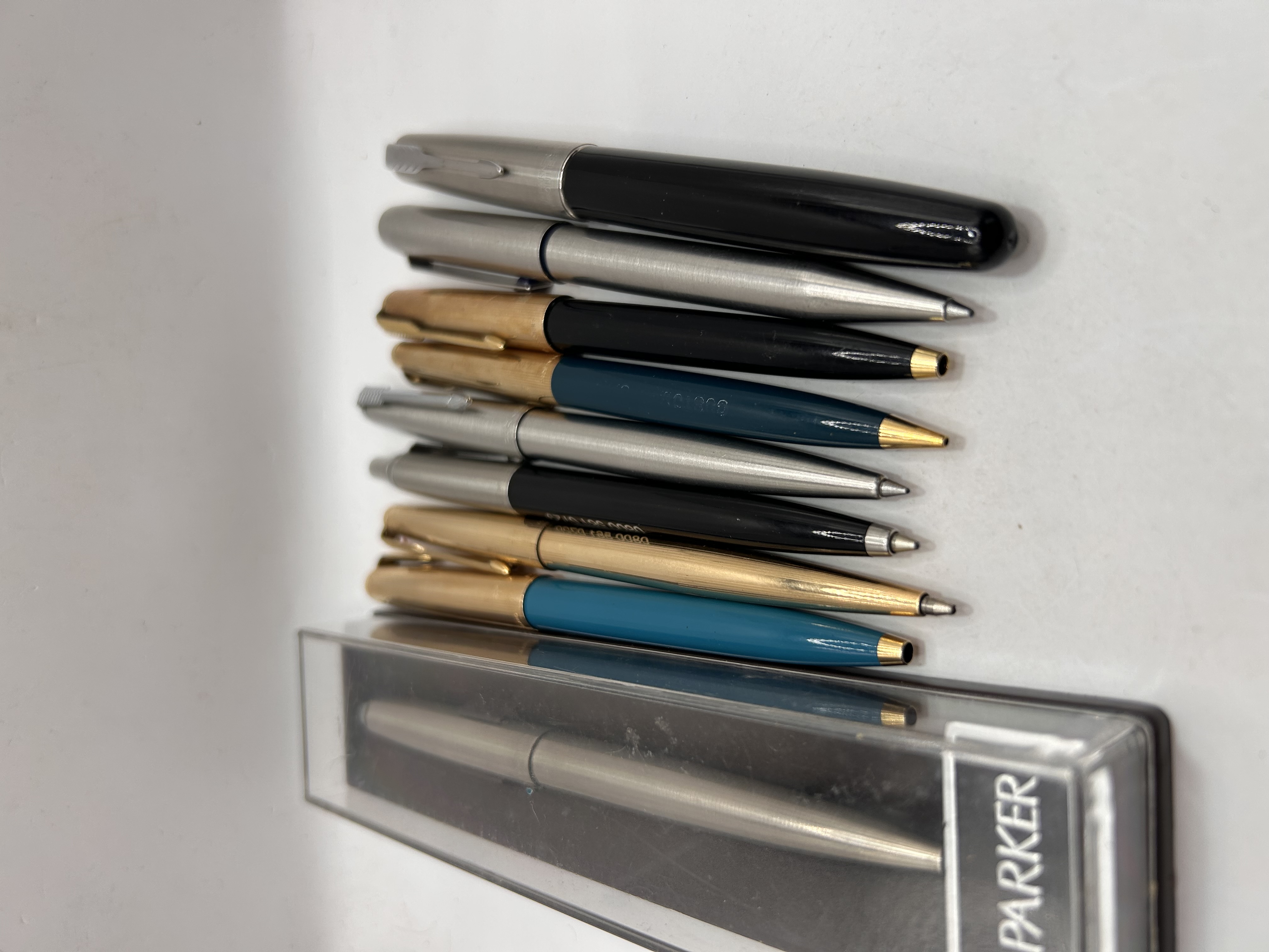 A collection of ten writing instruments, predominantly ballpoint pens, attributed to Parker based on design characteristics including the signature arrow clips and visible branding. The lot consists of one silver-toned pen housed within its original clear plastic and silver-toned presentation case marked PARKER, and nine additional loose pens. The loose instruments feature mixed materials including stainless steel or chrome caps, and barrels finished in black, teal lacquer, or gold plating. The design follows typical mid-century Parker writing instrument aesthetics. Visible markings on one gold-toned item include faint stamped numerical text, possibly “0800 232 0000” or similar, near the cap band.