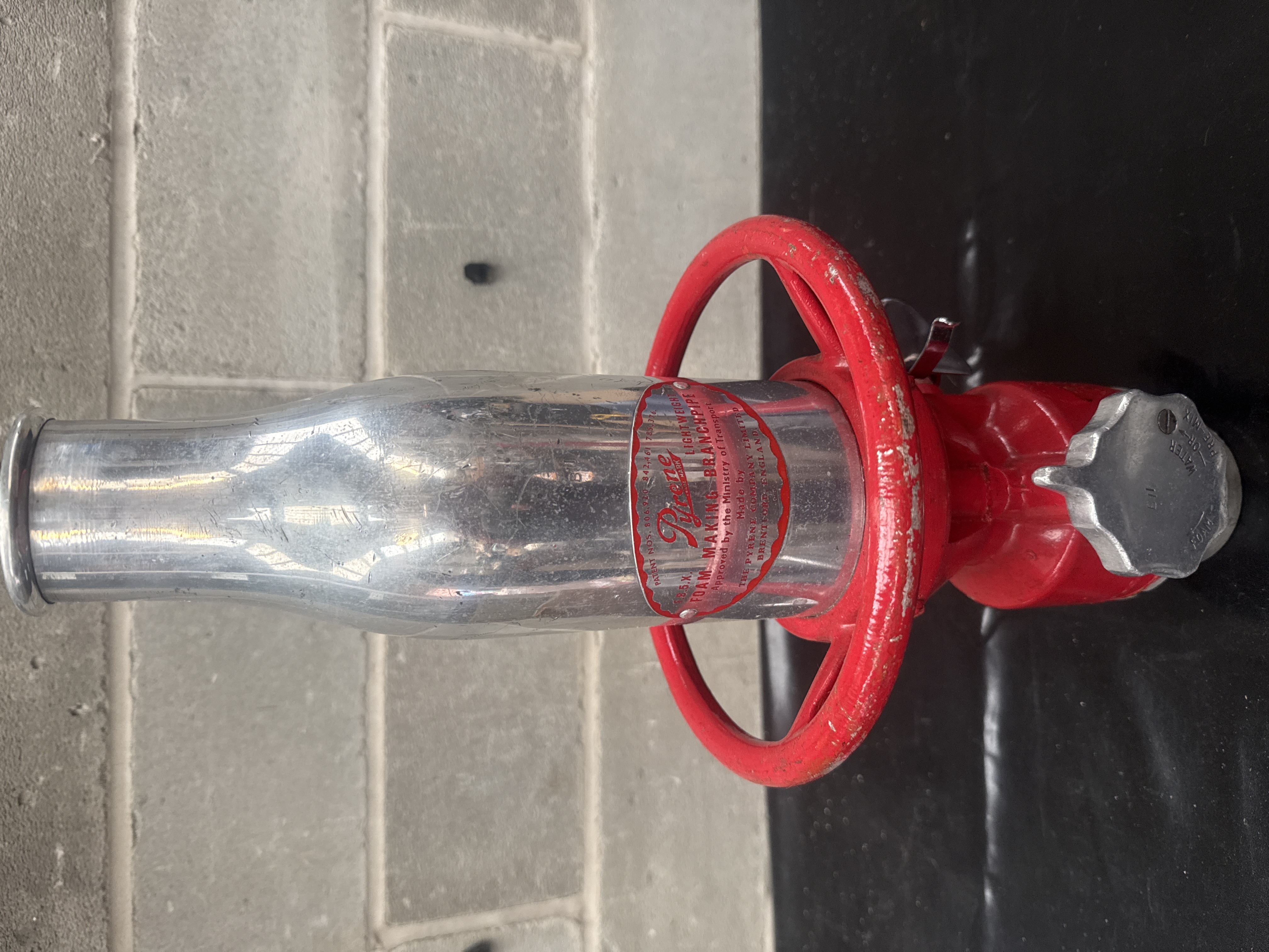 A vintage Pyrene B.S.K. Lightweight Foam Making Branchpipe, industrial firefighting equipment manufactured by The Pyrene Company Limited, Brentford, England. The apparatus features a tall, cylindrical reservoir constructed of polished aluminum or chromed metal, seated upon a cast metal base assembly painted bright red. The base includes a circular handle and a selector valve marked OFF and JET. A central red and silver oval label confirms the model and manufacturer, noting its approval status as Approved by the Ministry of Transport. Visible patent numbers include 806,920 and 842,461.