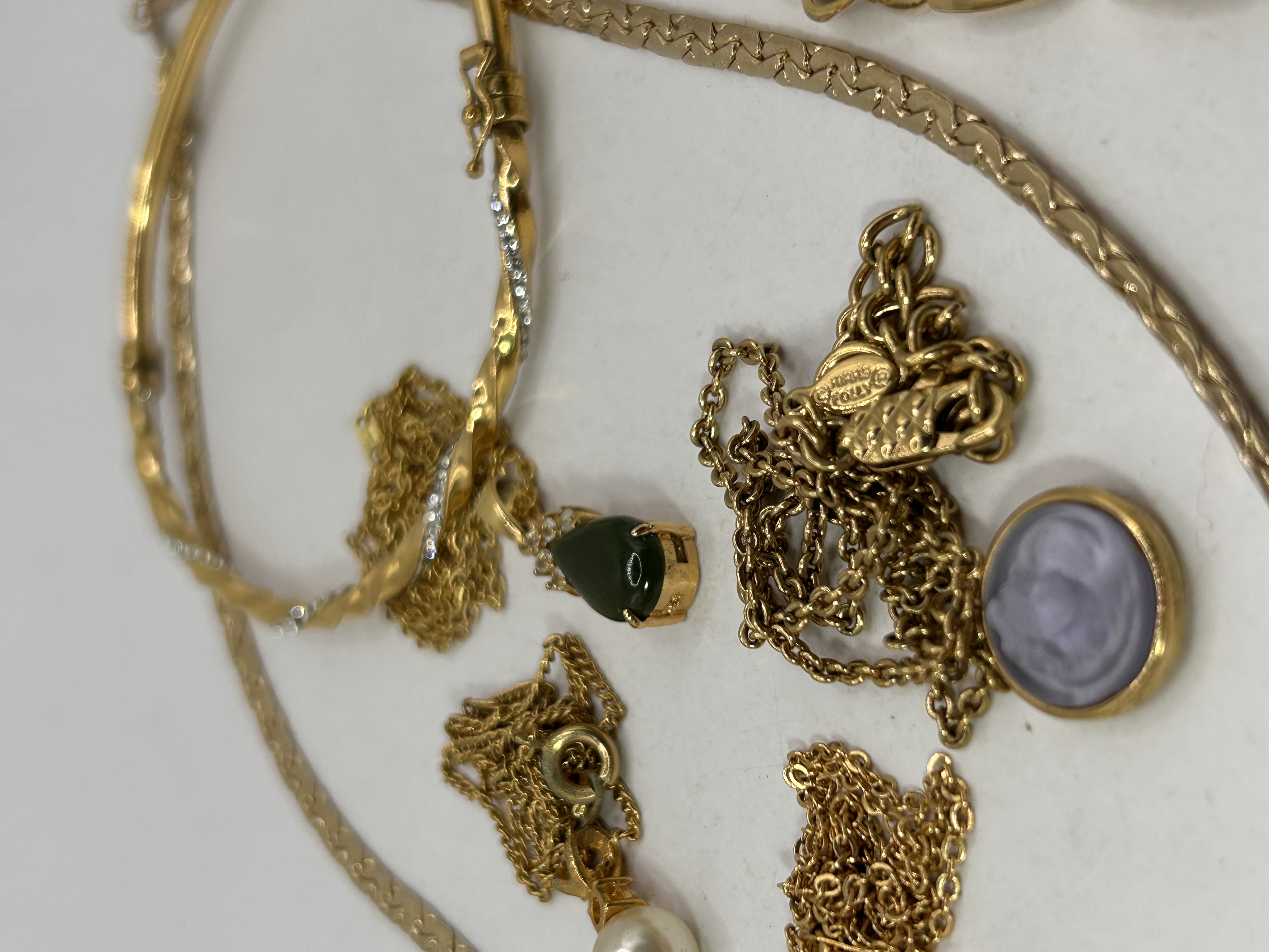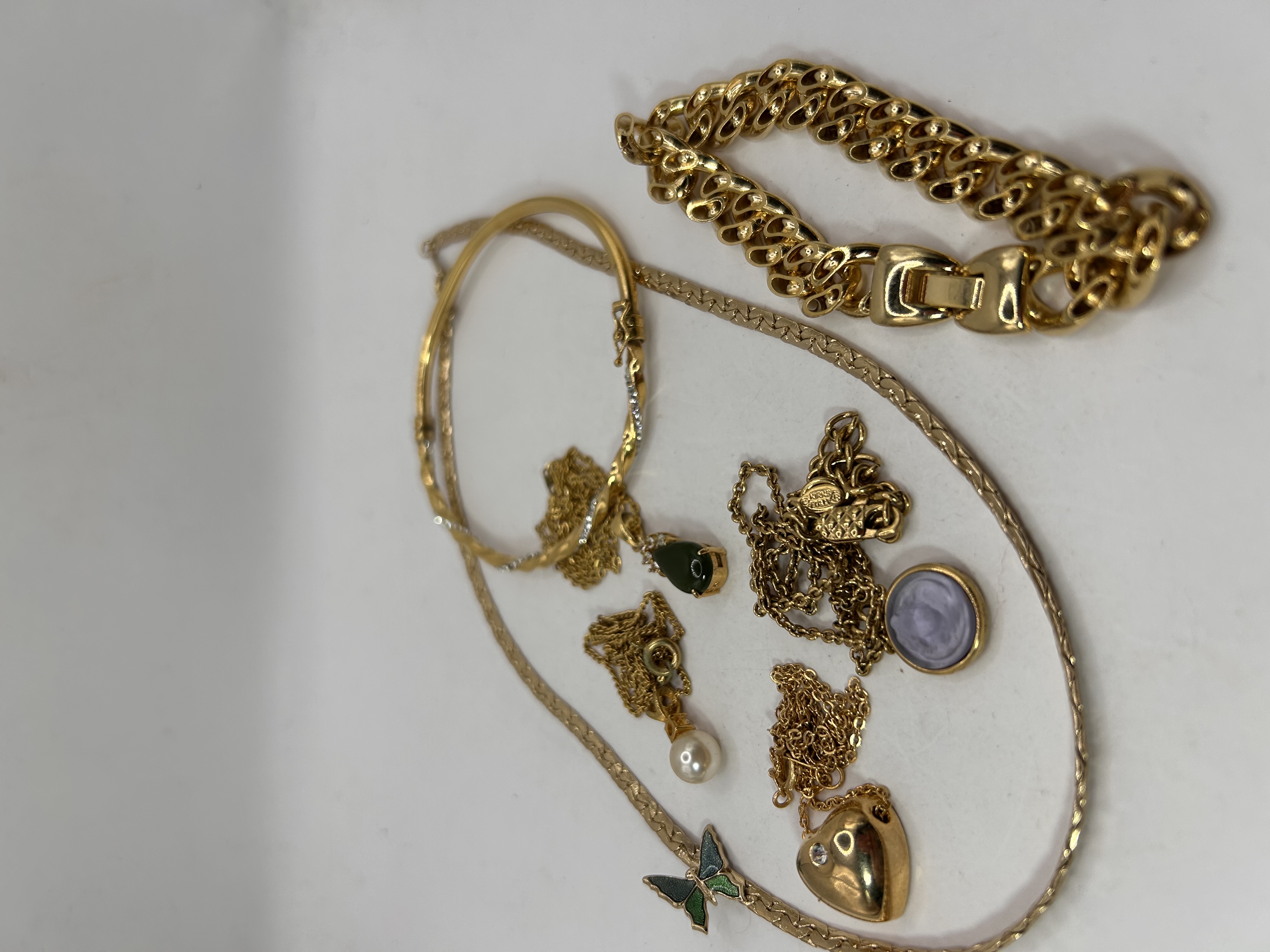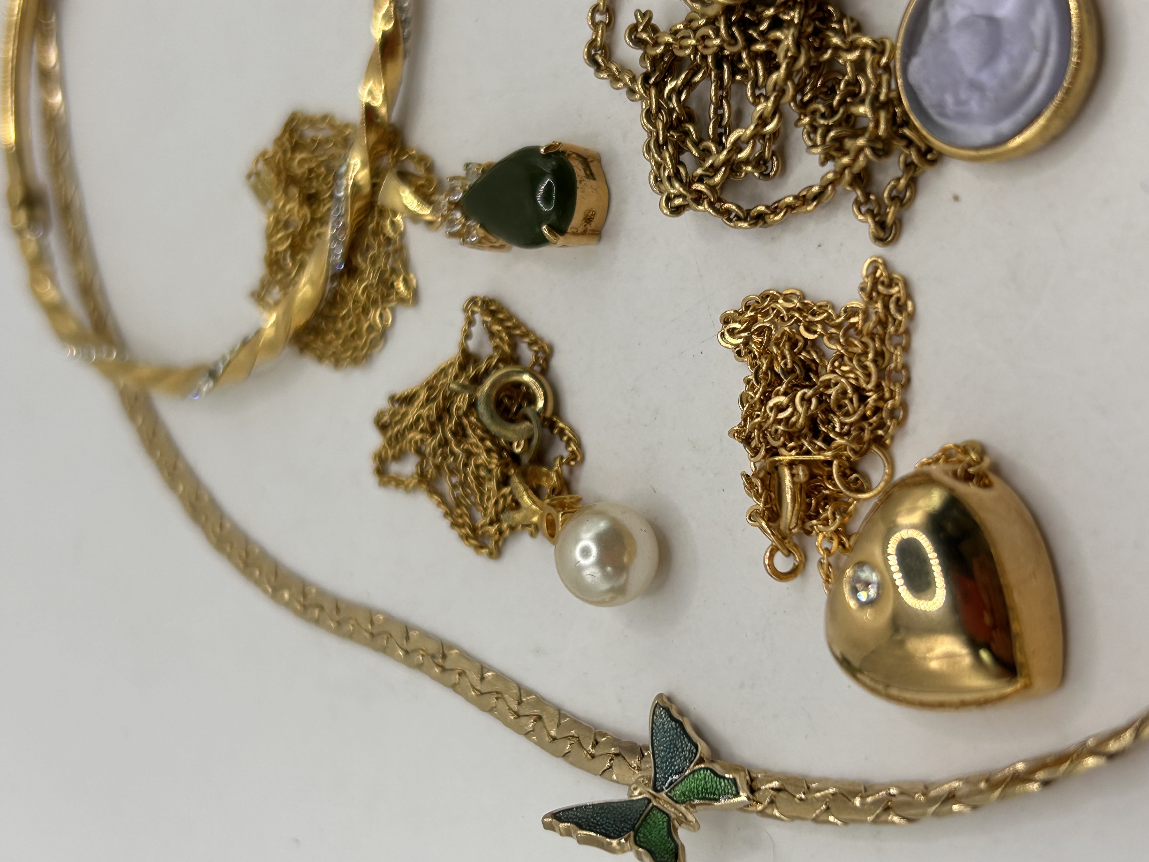The collection consists of yellow-toned costume jewelry, primarily constructed from base metal with gold-plated finishes. The lot includes five necklaces, three bracelets/bangles, and five associated pendants. The necklaces feature various link styles, including a flat snake chain and multiple fine curb-link chains. Pendants include a green enameled butterfly, a faux pearl drop, a polished heart-shaped locket set with a single clear rhinestone, a dark green teardrop cabochon, and a circular pendant set with a purple/grey polished cabochon or cameo. One fine-link chain features a small, indistinct designer hangtag near the clasp. The bracelets include a heavy curb-link bracelet secured with a box clasp, and a pair of rigid bangles, one smooth and one twisted, partially set with clear rhinestones.