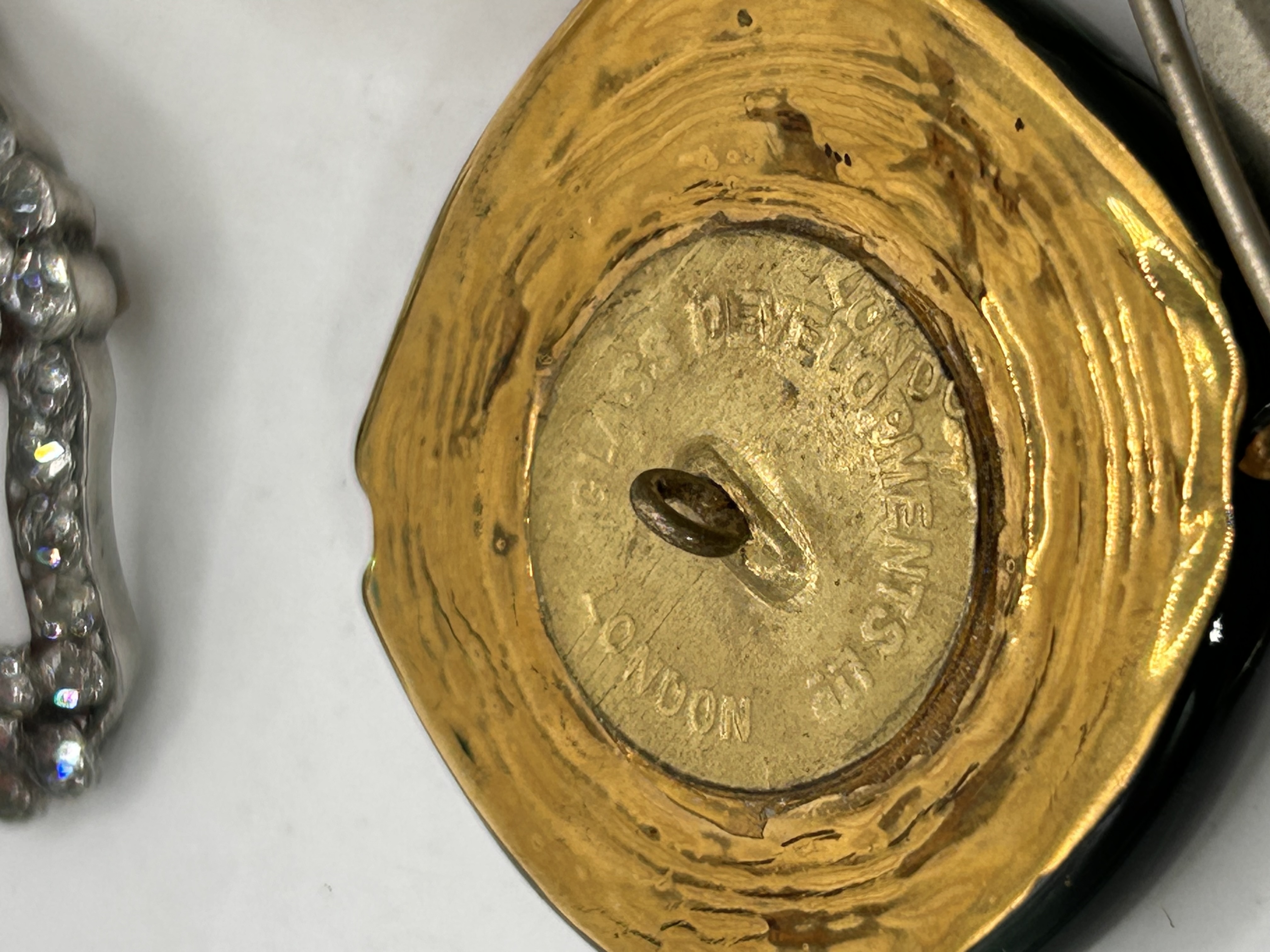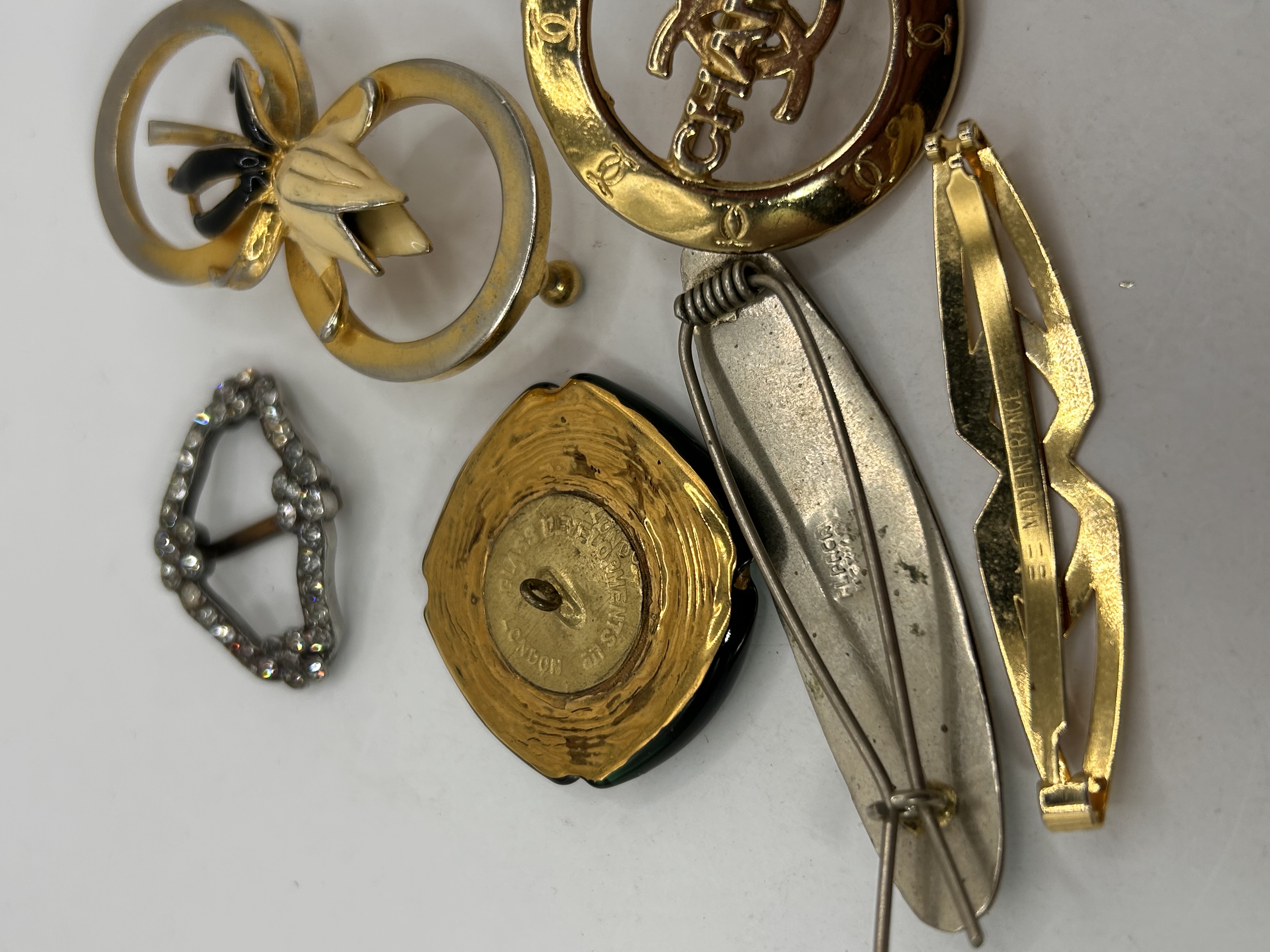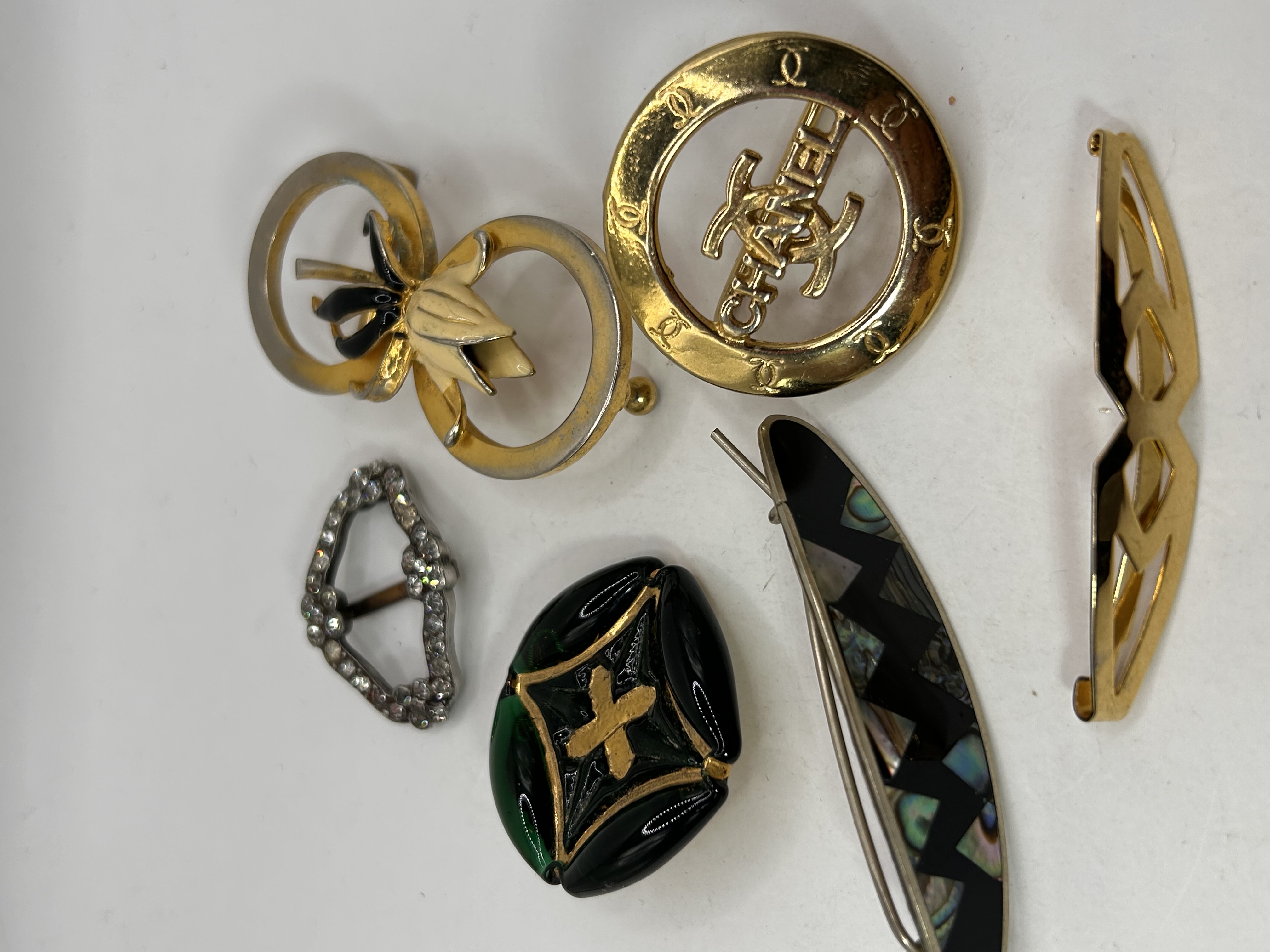 The collection consists of six pieces of vintage costume jewelry and accessories. The materials utilized include gold-tone and silver-tone base metals, colored enamel (black, green, white), colorless paste stones, and iridescent abalone shell inlay. The collection features a large circular gold-tone openwork brooch or slide prominently displaying the interlocking CC logo and the text “CHANEL.” Other items include a large decorative slide/buckle with a white and black enamel floral motif; a small silver-tone buckle set with colorless paste stones; and a silver-tone hair barrette inlaid with geometric segments of abalone shell. Also present is a small gold-tone lapel pin marked “MADE IN FRANCE” on the reverse, and a lozenge-shaped piece with black and green enamel decoration, marked on the reverse “VERITABLE BOUTON BLACK ENAMEL LONDON,” indicating its origin as a genuine button.