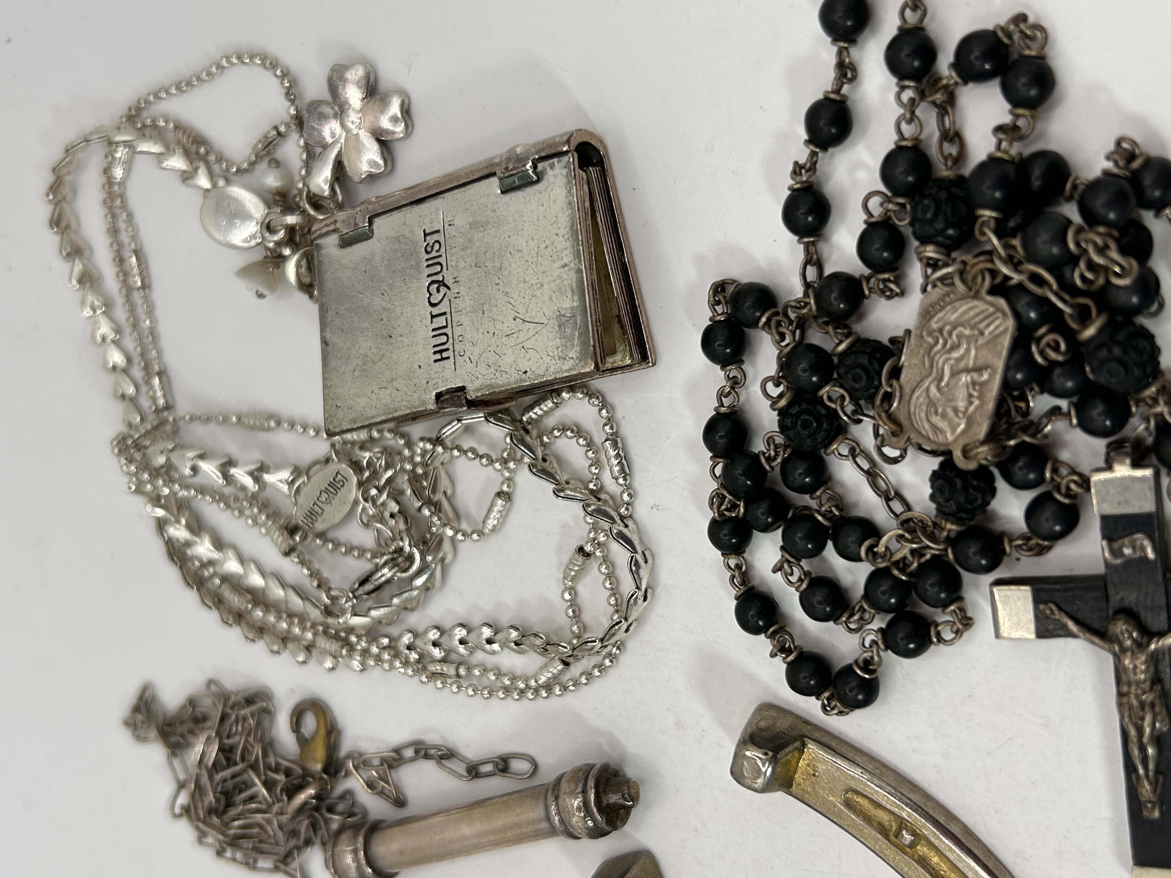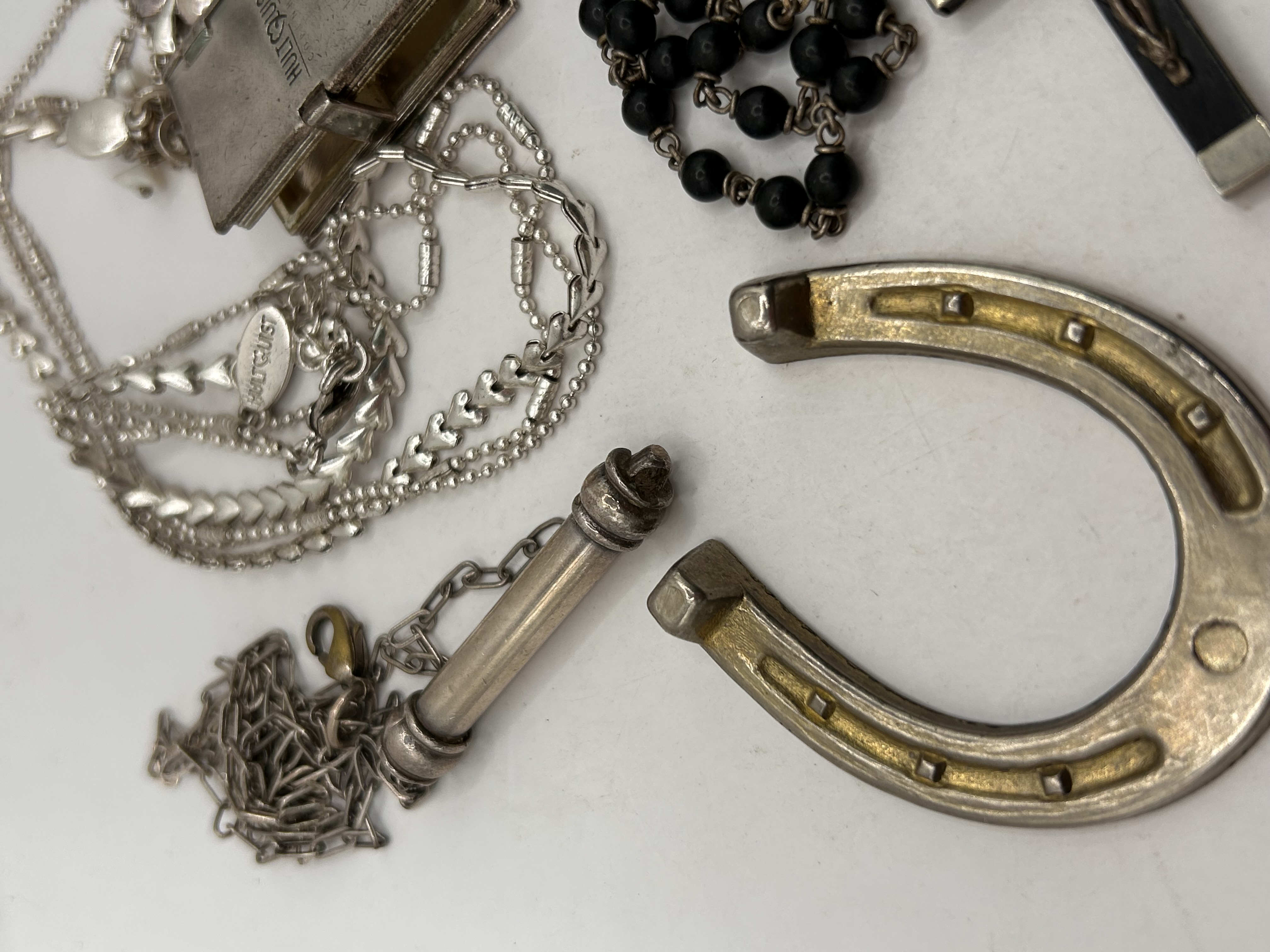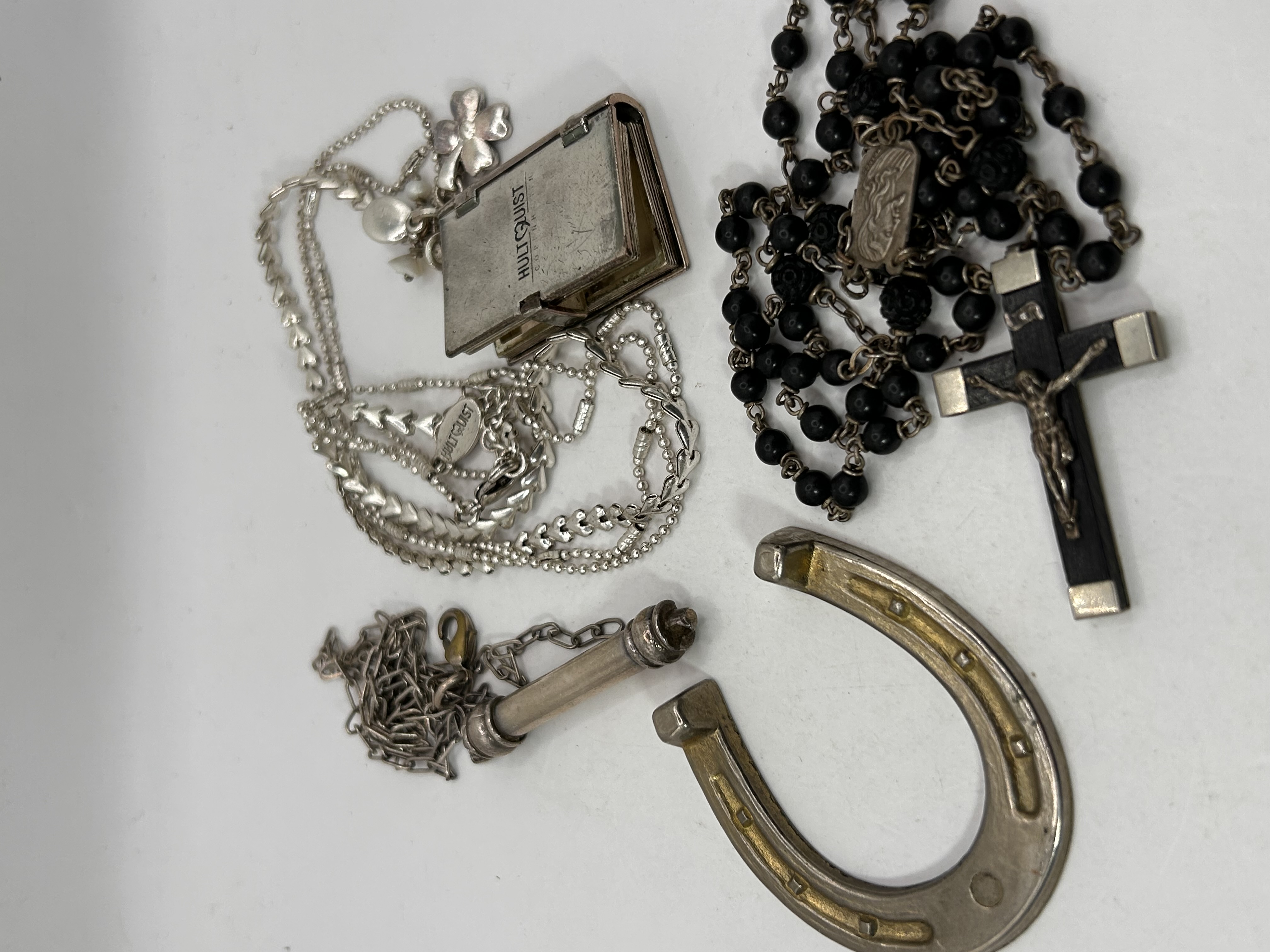This lot comprises four distinct groupings of vintage costume and religious jewelry and accessories. The collection includes a metal horseshoe accessory featuring silver-toned metal with gold-toned inlay accents. A second item is a cylindrical metal tube pendant attached to a fine chain, possibly intended as a scroll or prayer holder. The third grouping is a heavily tangled lot of multiple silver-toned necklaces of various styles, including ball chains and link chains. Attached to this necklace lot is a small, rectangular, hinged book locket engraved with the text HULTQUIST COPENHAGEN, along with several small charms including a heart and a four-leaf clover. The final major component is a black beaded rosary featuring a mix of smooth and carved beads, a silver-toned Miraculous Medal style centerpiece medallion, and a crucifix crafted from black material with a silver-toned corpus. Materials are primarily silver-toned metal and costume components.