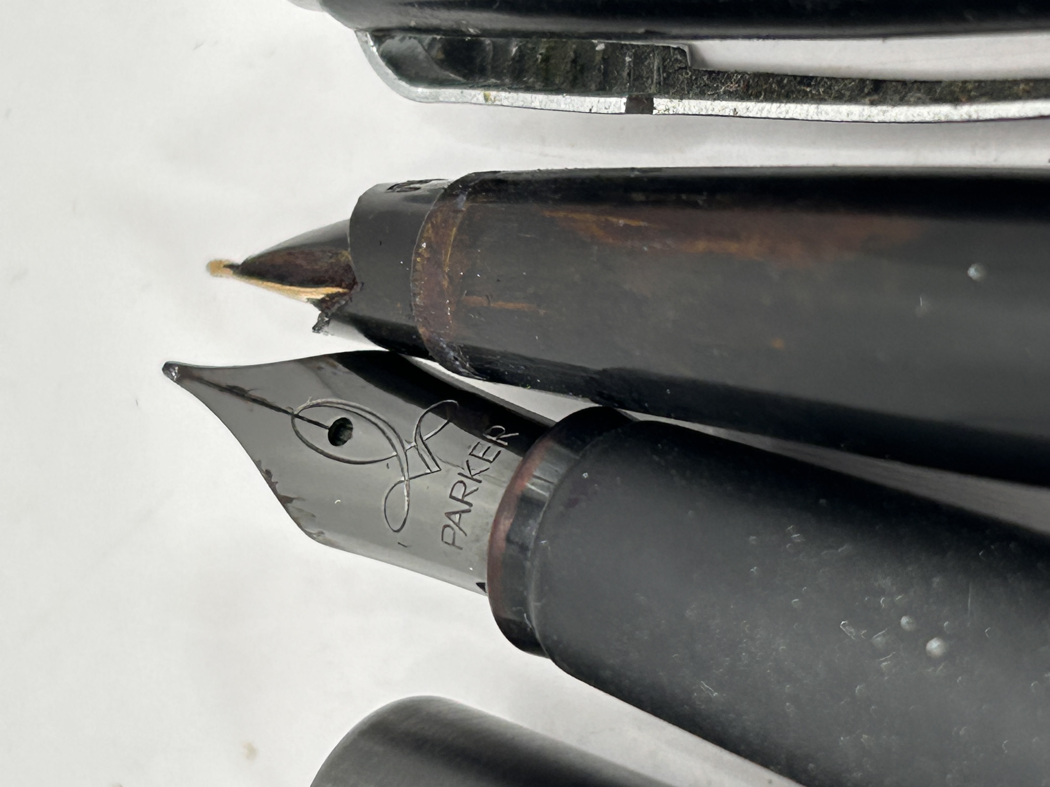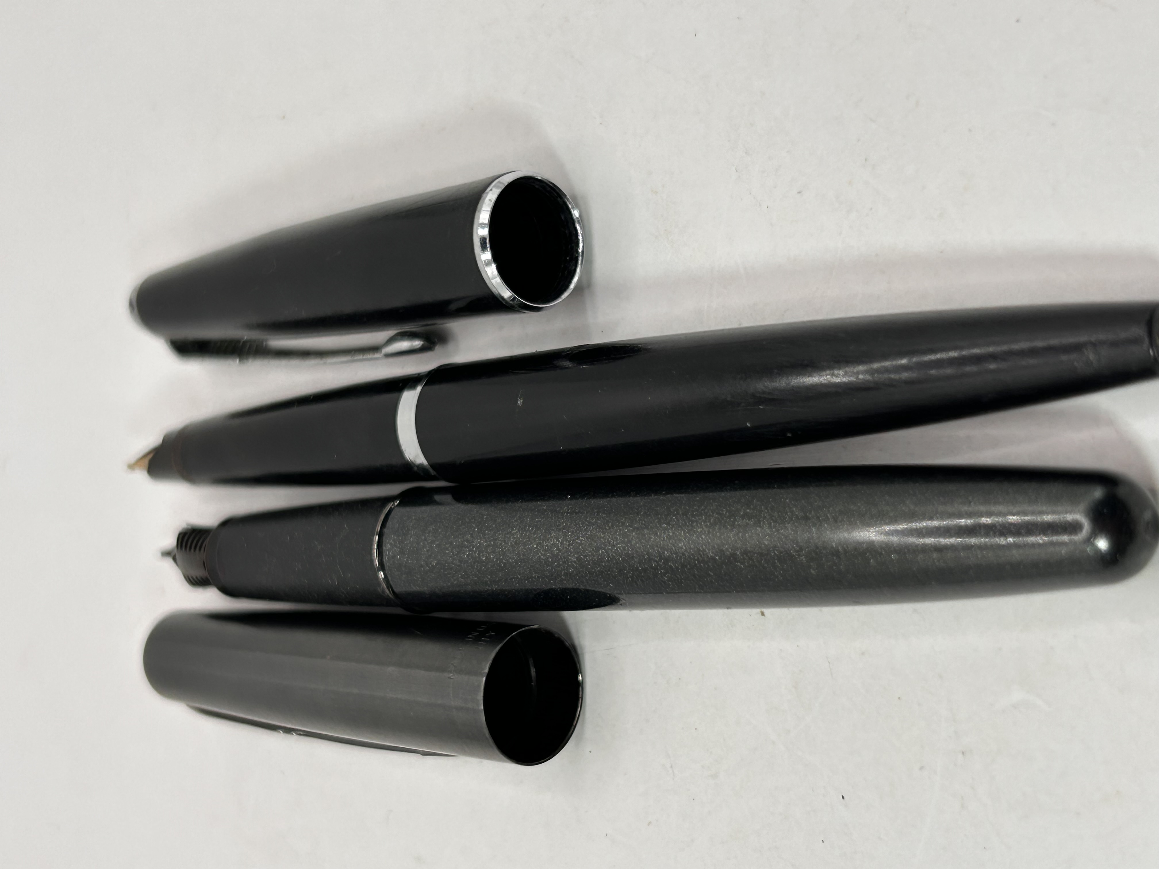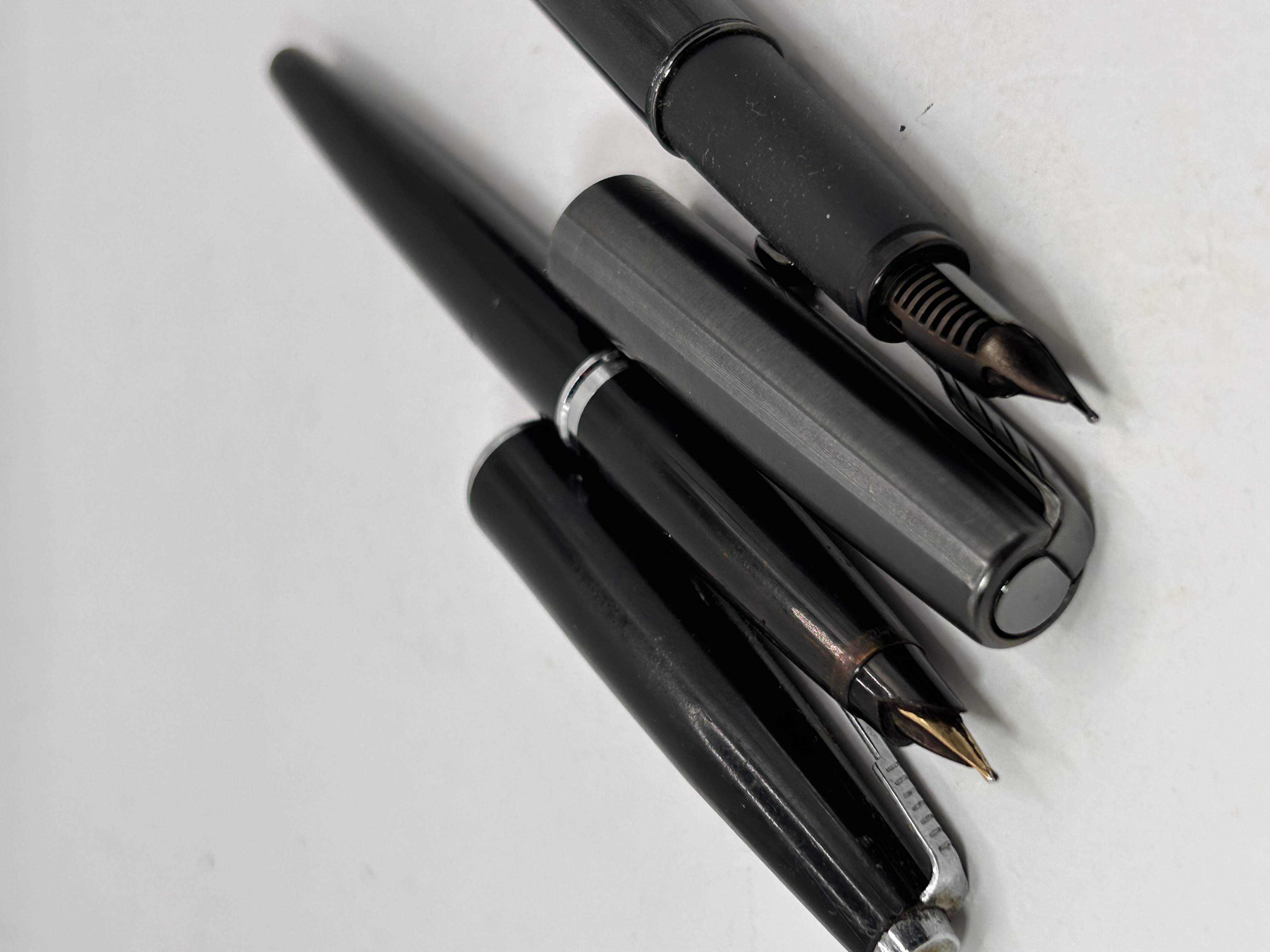 A pair of modern fountain pens, displayed partially disassembled with caps removed. The collection consists of two distinct instruments. The first pen features a smooth, glossy black plastic or resin body with chrome trim details. The nib is black, potentially hooded, and clearly inscribed “PARKER” beneath a stylized arrow or logo. The second pen features a darker, slightly textured or matte gray body. It utilizes a gold-toned exposed nib and feed. Both pens appear to be cartridge or converter fill models.
