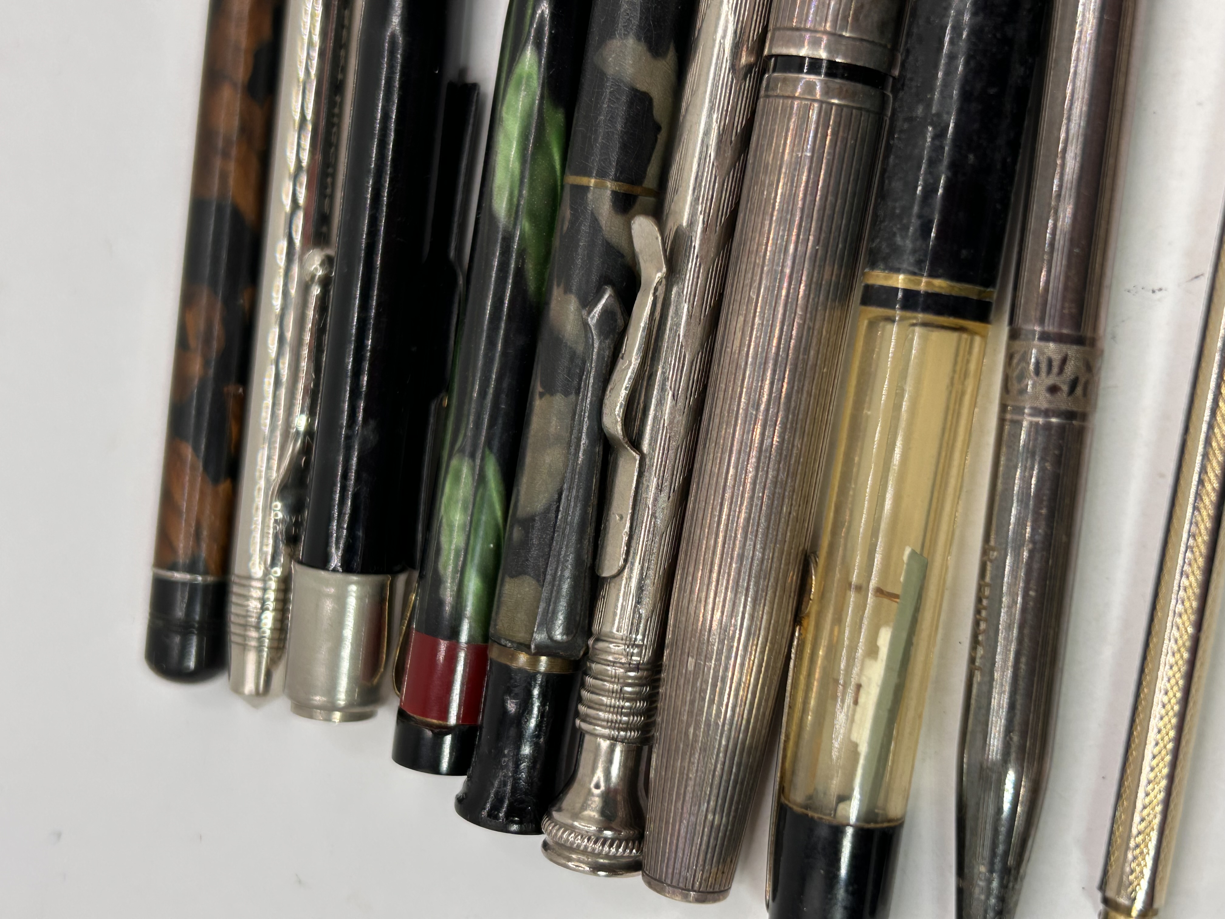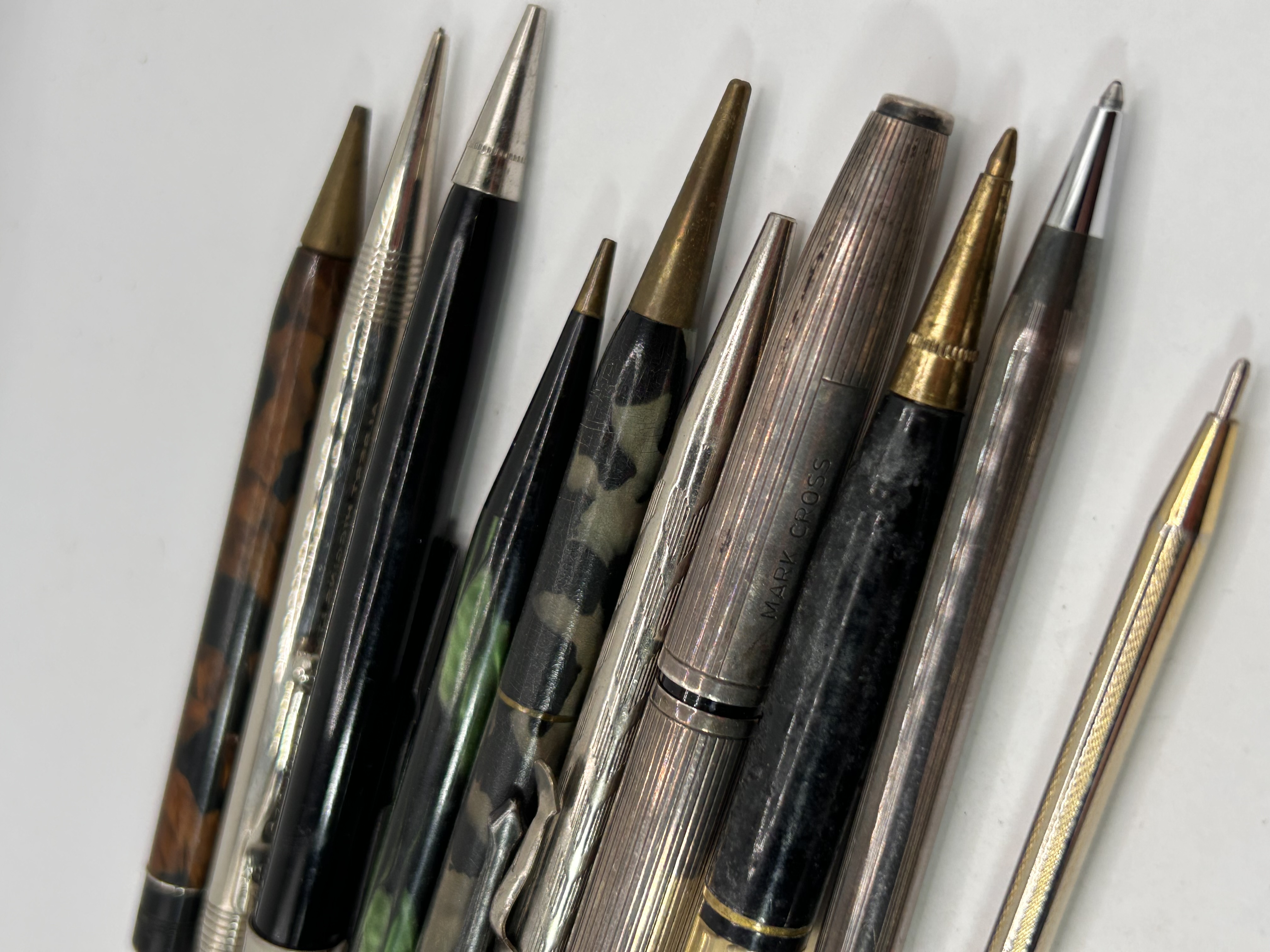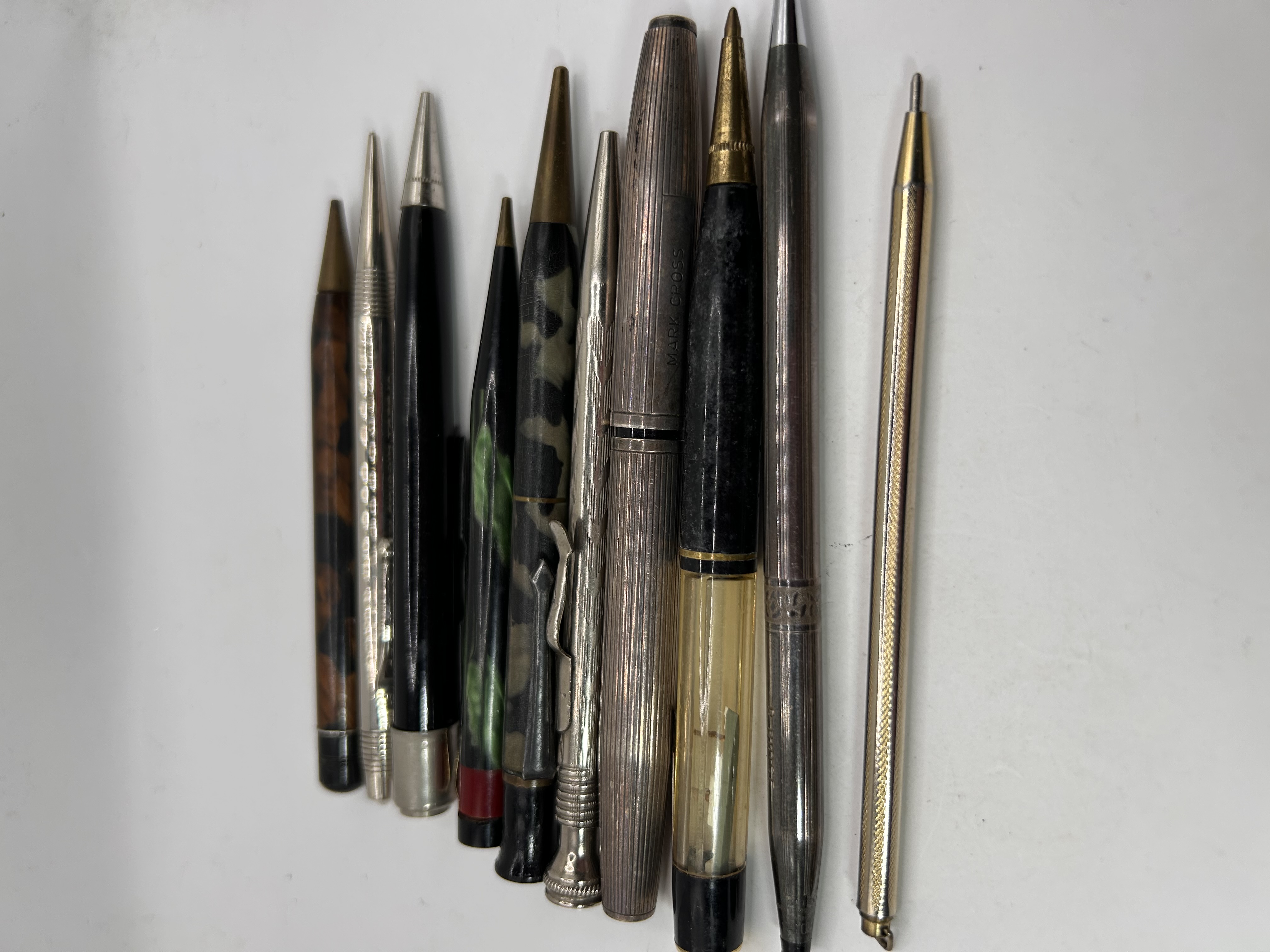 The collection comprises 10 vintage writing instruments, including mechanical pencils and pens, presented in a stacked arrangement. Materials observed include various plastics simulating tortoiseshell, mottled green/black, and solid black, alongside metallic components that are silver-toned and gold-toned. One instrument is identified as a fountain pen due to the presence of a translucent yellow ink window section. Several metallic items feature ribbed or engine-turned detailing, consistent with mid-20th-century design. One silver-toned, ribbed instrument is visibly inscribed with the manufacturer name “MARK CROSS” on the barrel. The collection likely includes examples constructed from sterling silver, based on comparable market examples for similar vintage writing instruments.