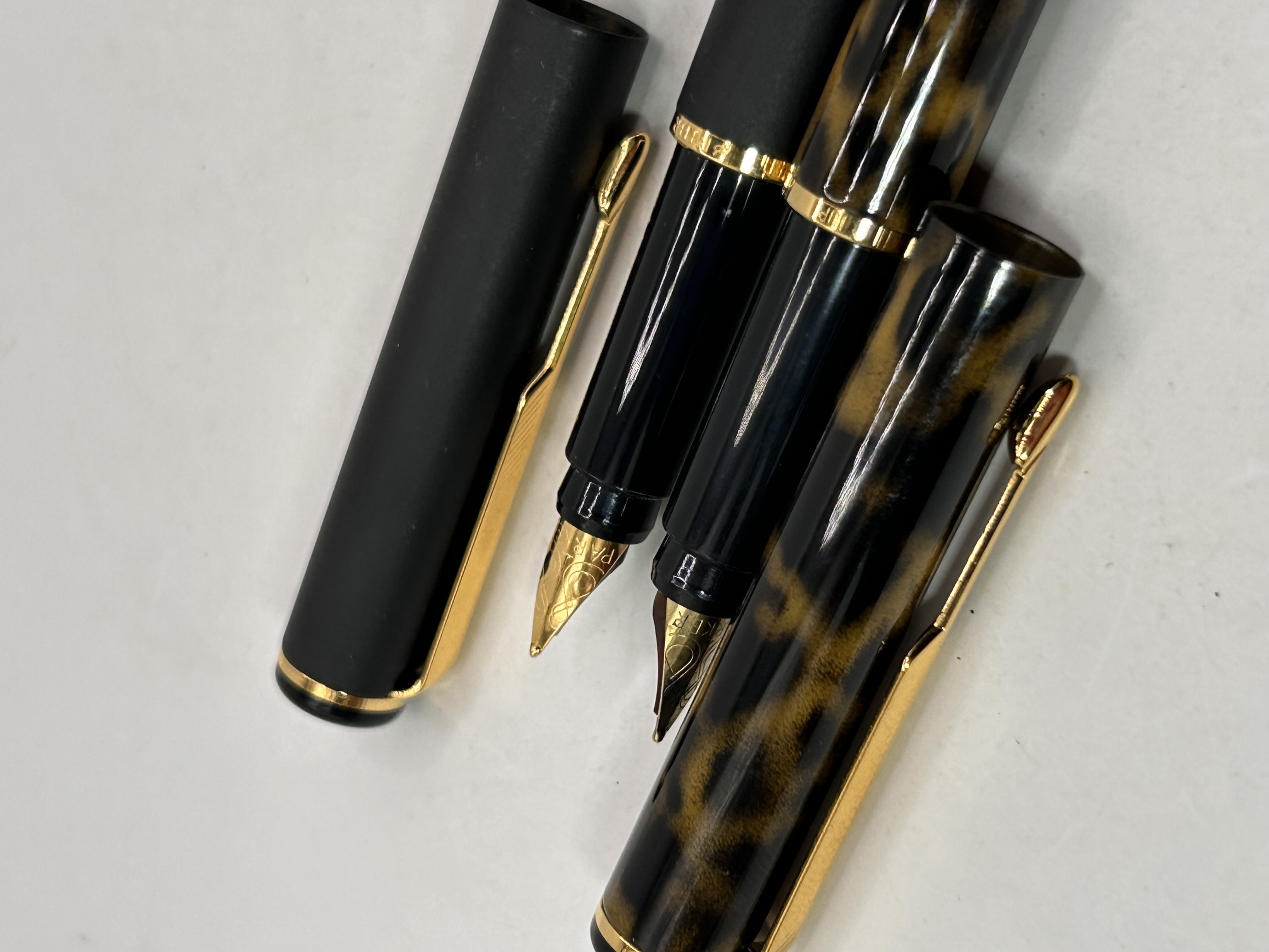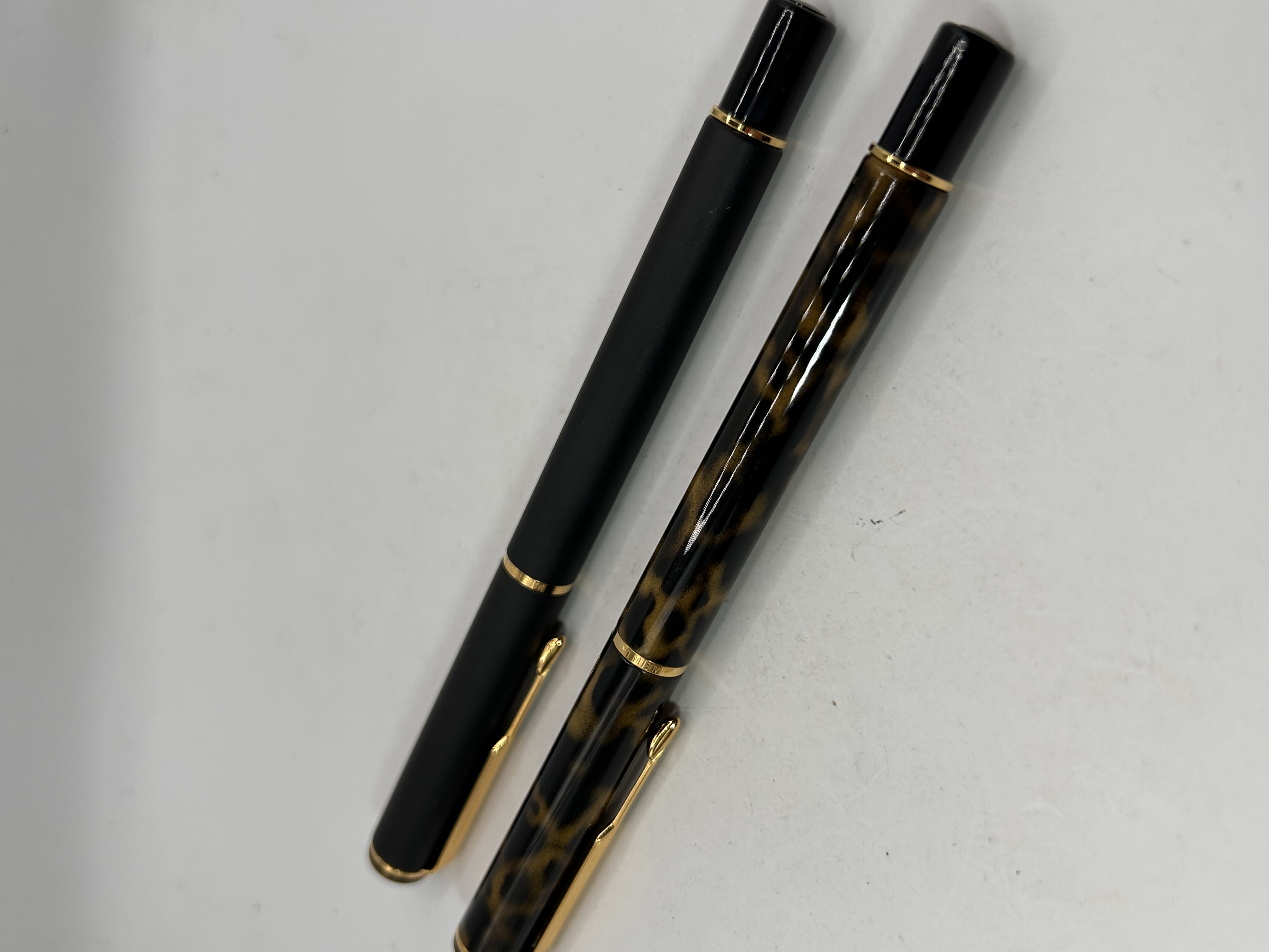 A pair of modern fountain pens attributed to Parker, model Rialto, featuring gold-toned accents including clips, cap bands, and nibs. The collection consists of two distinct finishes. The first pen features a matte black cylindrical body and cap. The second pen is constructed from polished resin, displaying a prominent tortoiseshell pattern in mottled amber and black, consistent with the Parker 88/Rialto ‘Marble’ or ‘Tortoiseshell’ variants. Both pens have black sections and are fitted with gold-toned nibs bearing faint decorative scrollwork.