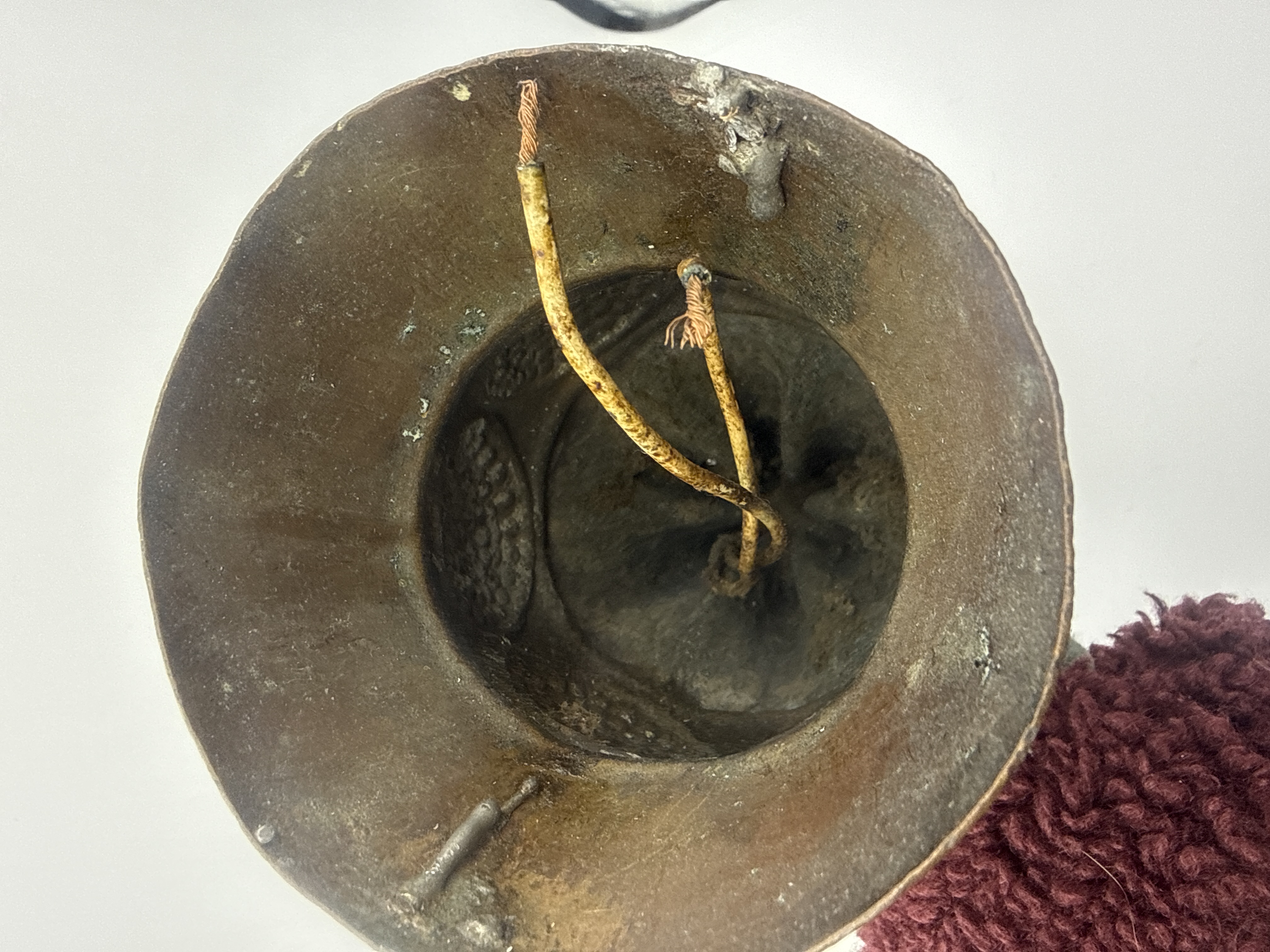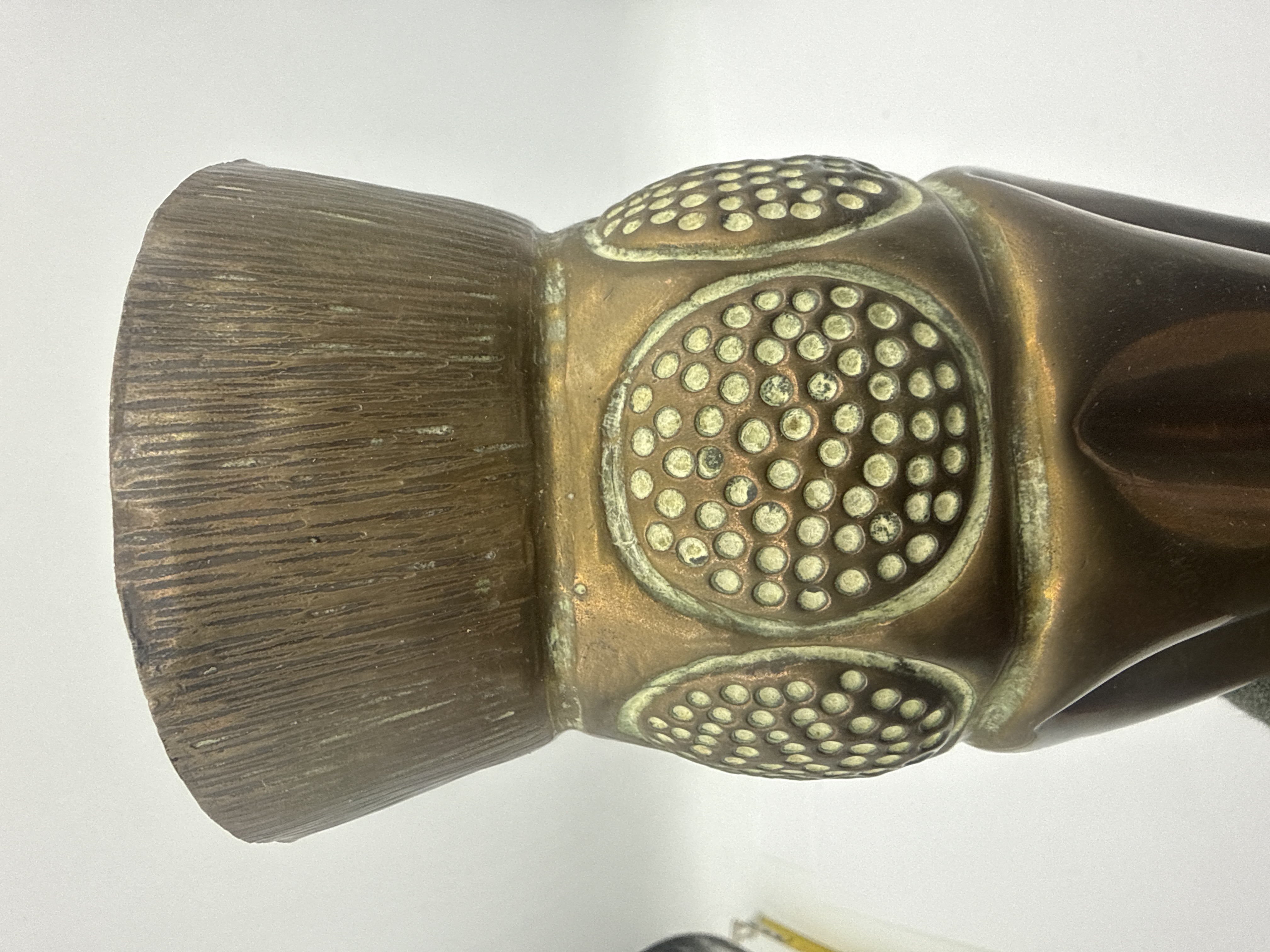 A single stylized metal vessel, constructed from brass or bronze, converted for use as a lamp base. The object exhibits an elongated body with strong vertical fluting supporting a central register. This register is decorated with three prominent circular bosses featuring a dense, stippled texture, reflecting design elements often found in traditional Himalayan or Bhutanese “Mandala Collections” vessels. The neck is vertically striated with a rough, bark-like finish. A length of vintage, cloth-wrapped electrical cord, terminating in an aged, off-white two-pin electrical plug, is wrapped around the lower body. No discernible maker’s marks or textual engravings are visible.