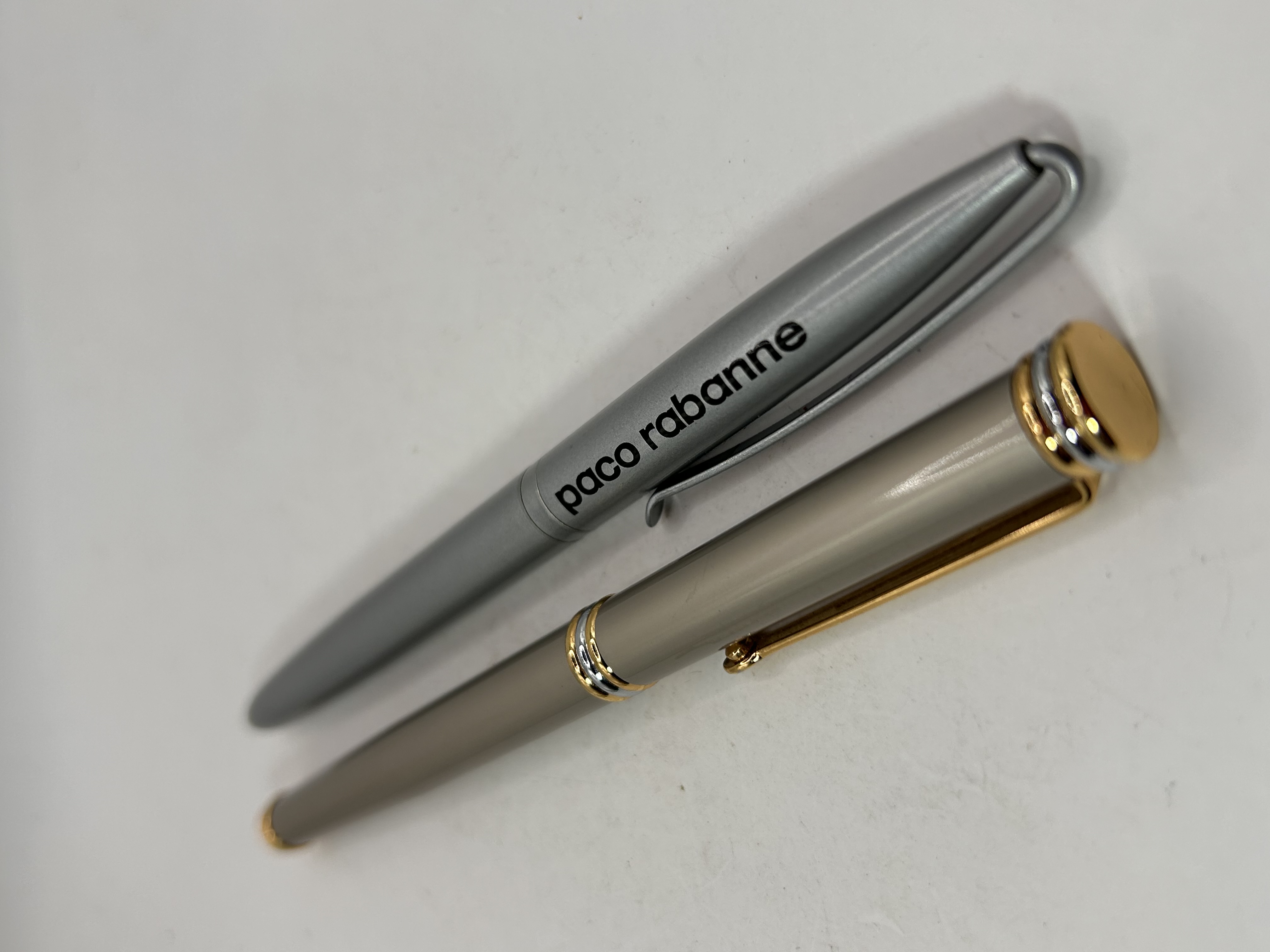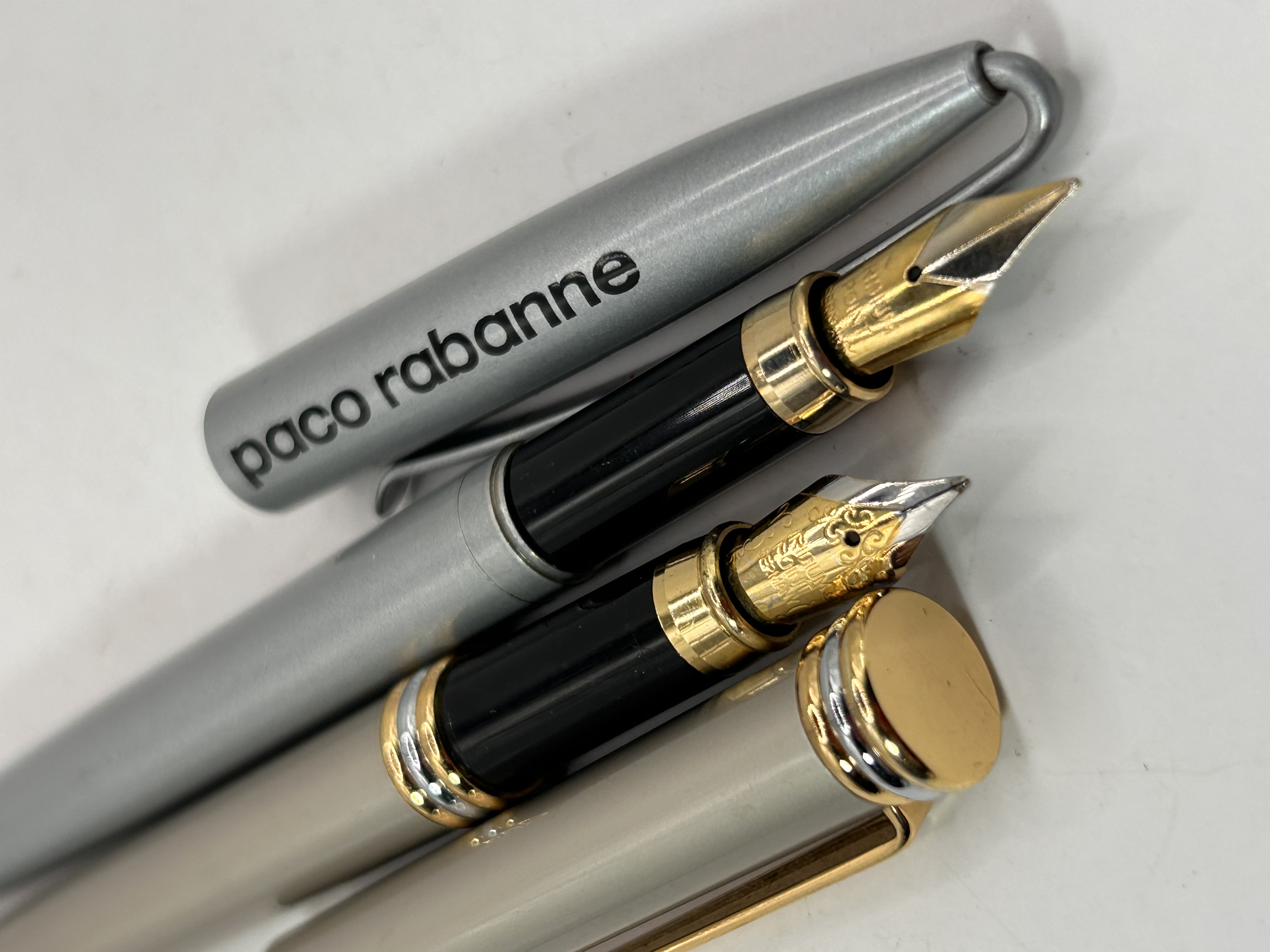 The lot consists of a pair of contemporary fountain pens. The first pen features a matte taupe-colored body and cap with extensive gold-tone trim, including the clip, multi-band cap ring, and finial. This pen is uncapped, revealing a two-tone metallic nib and black grip section. The second pen features a brushed silver-gray body and cap, with a silver-tone clip, and is prominently marked on the barrel with the black text paco rabanne. This pen is partially disassembled, showing a black grip section and a gold-tone nib. Both writing instruments appear to be constructed from metal and/or plastic components.