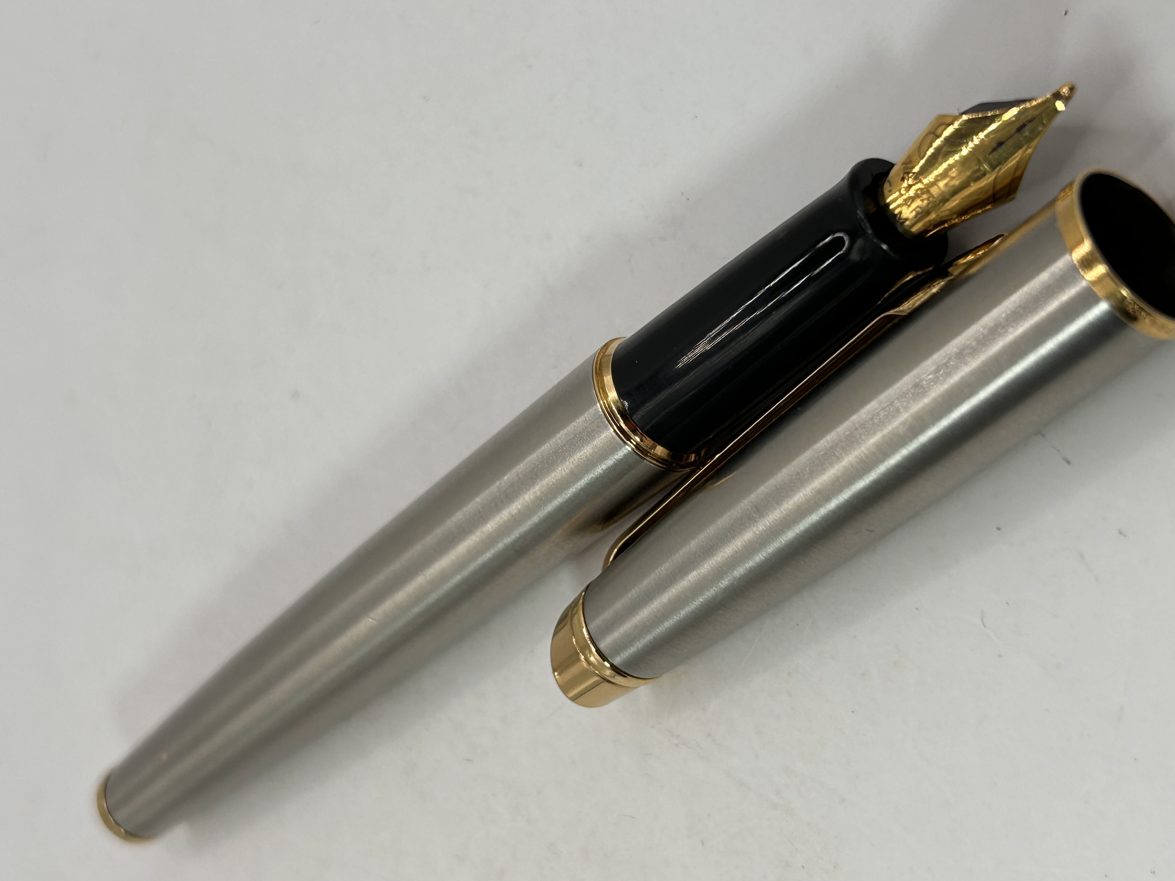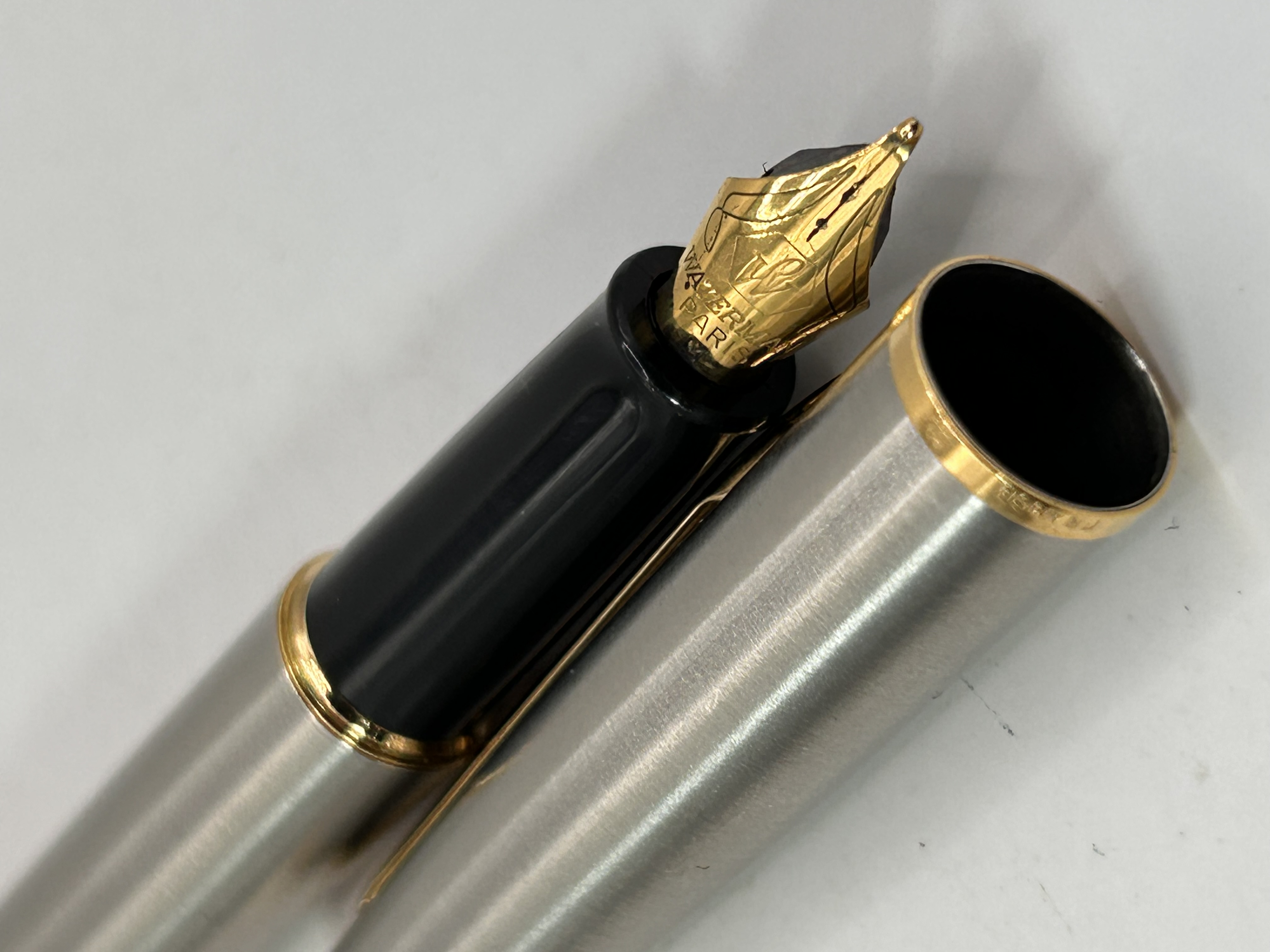 A single modern executive fountain pen manufactured by Waterman. The pen is identified as the Hemisphere model, featuring a brushed, silver-tone metal finish on the cap and barrel. It is accented with gold-tone plating used for the clip, cap bands, and terminal ends (GT trim). The pen utilizes a black resin or plastic section. The gold-tone nib is clearly inscribed with the text WATERMAN PARIS. The pen is displayed disassembled, showing the cap removed from the barrel and section.