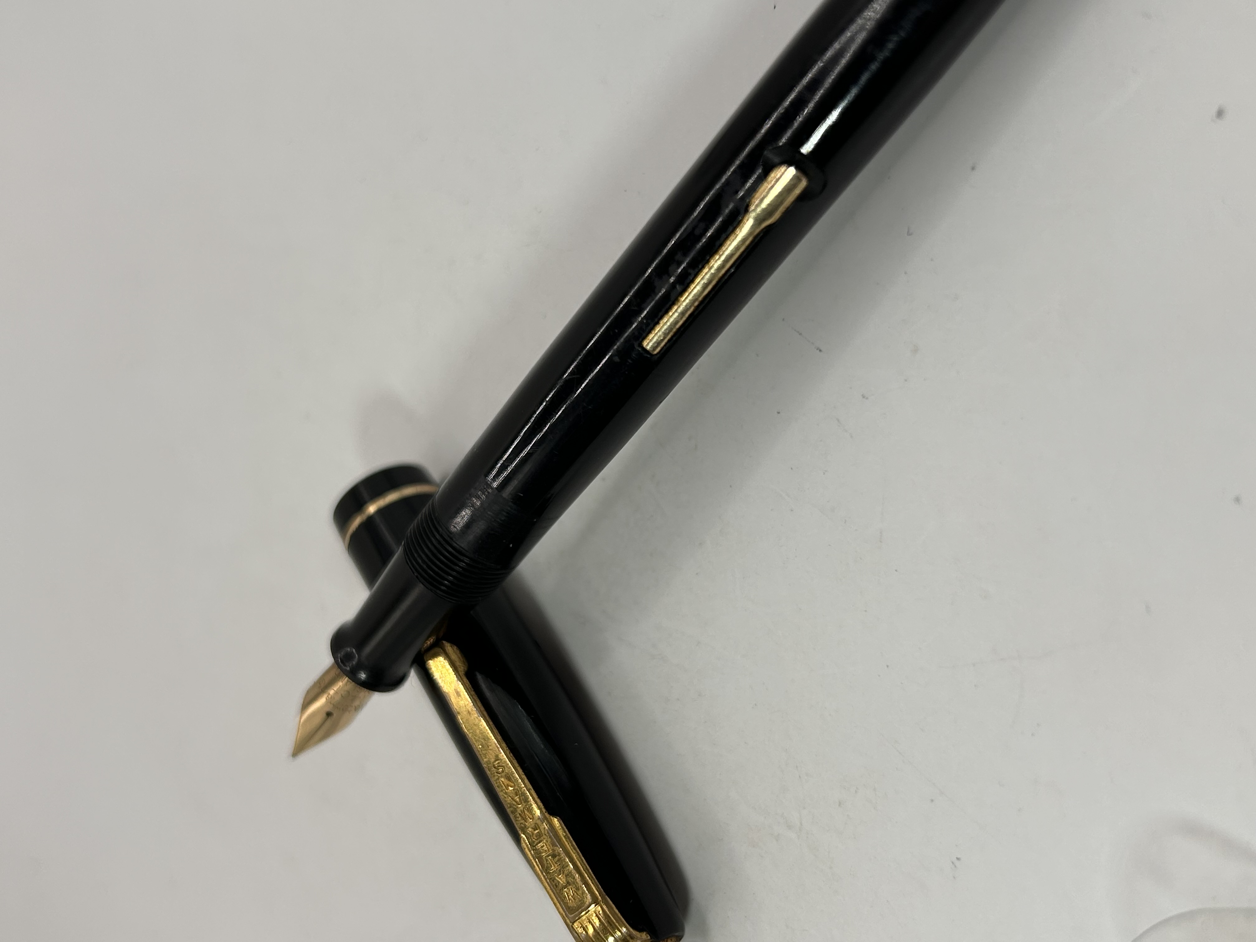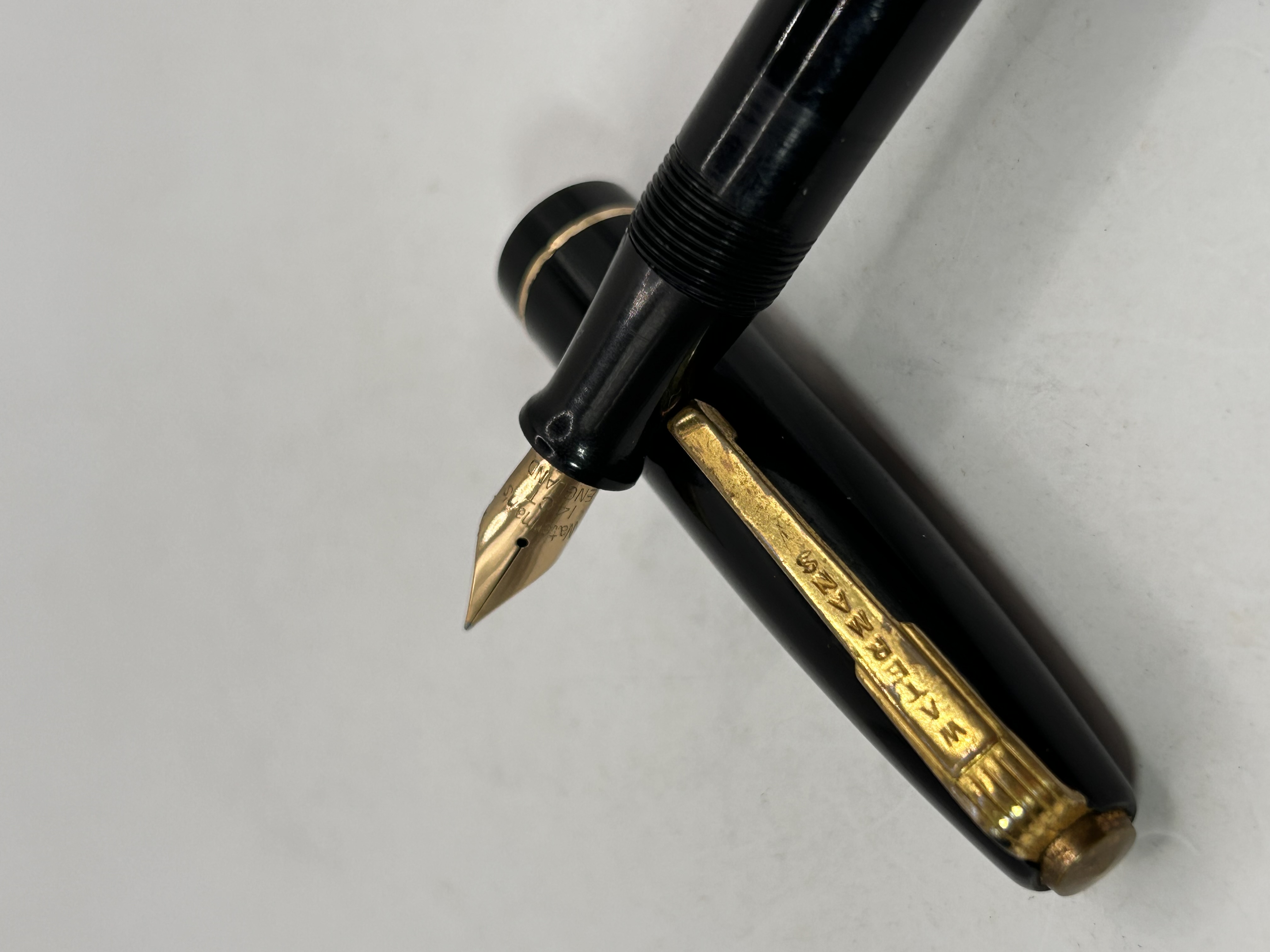 A single vintage Waterman fountain pen featuring a black polished resin or plastic barrel and cap. The pen is designed as a lever filler, consistent with 1940s English manufacture as suggested by comparable models found in market research. The cap features gold-toned metal trim and a clip clearly stamped with the inscription WATERMAN’S. The exposed gold nib is stamped with the text Waterman’s, 14 CT, and ENGLAND, confirming the 14-carat gold composition and English origin.