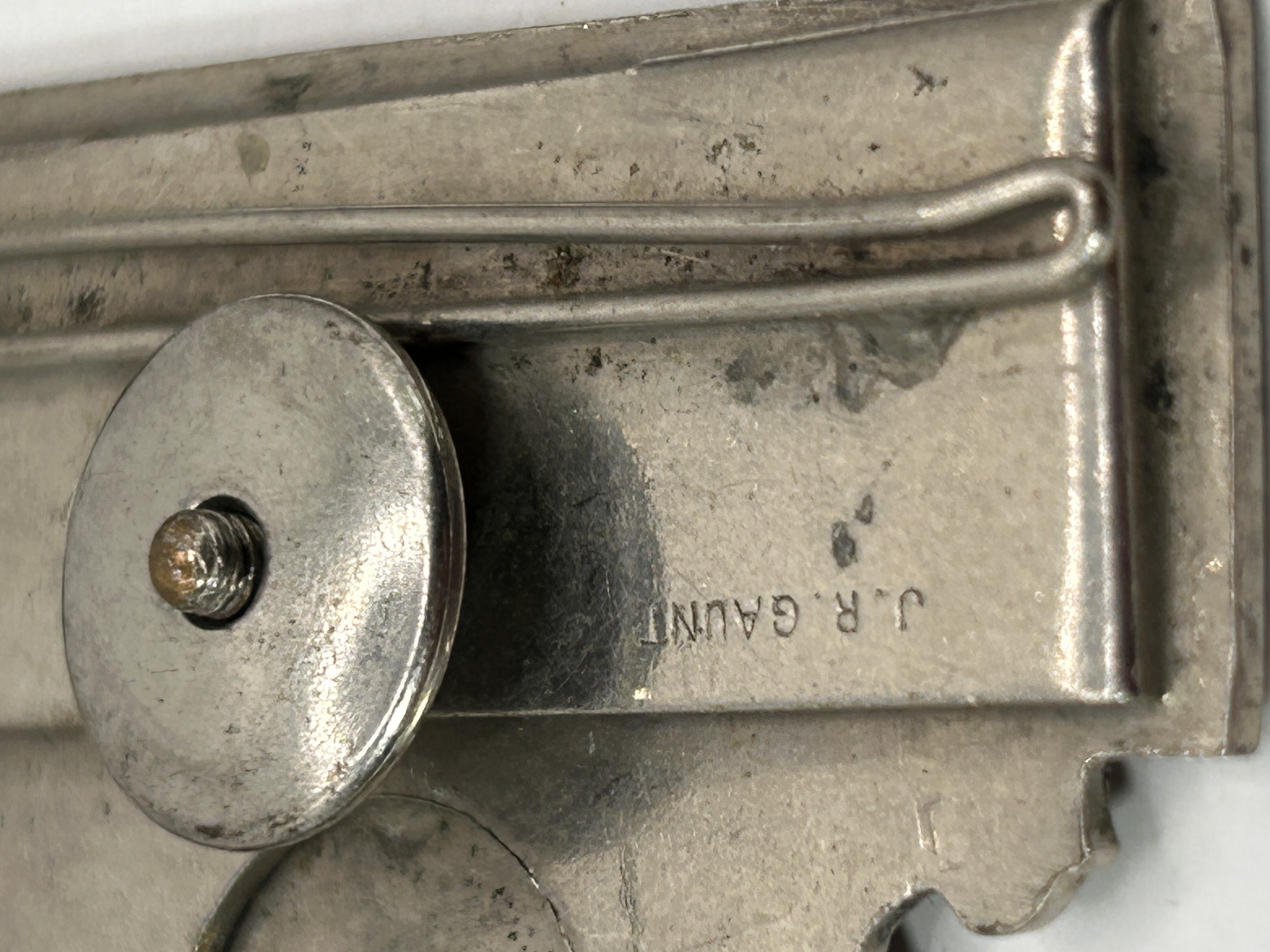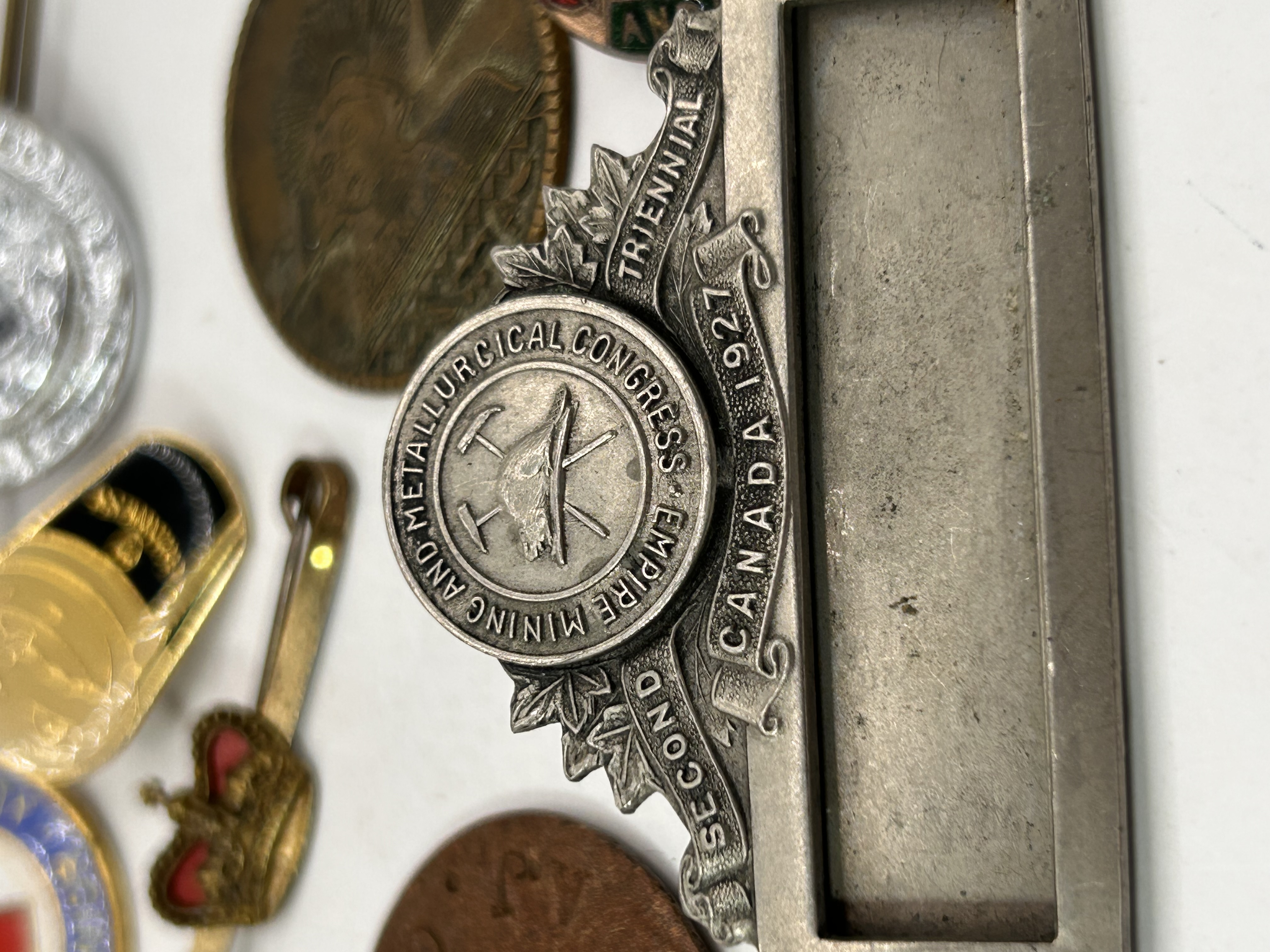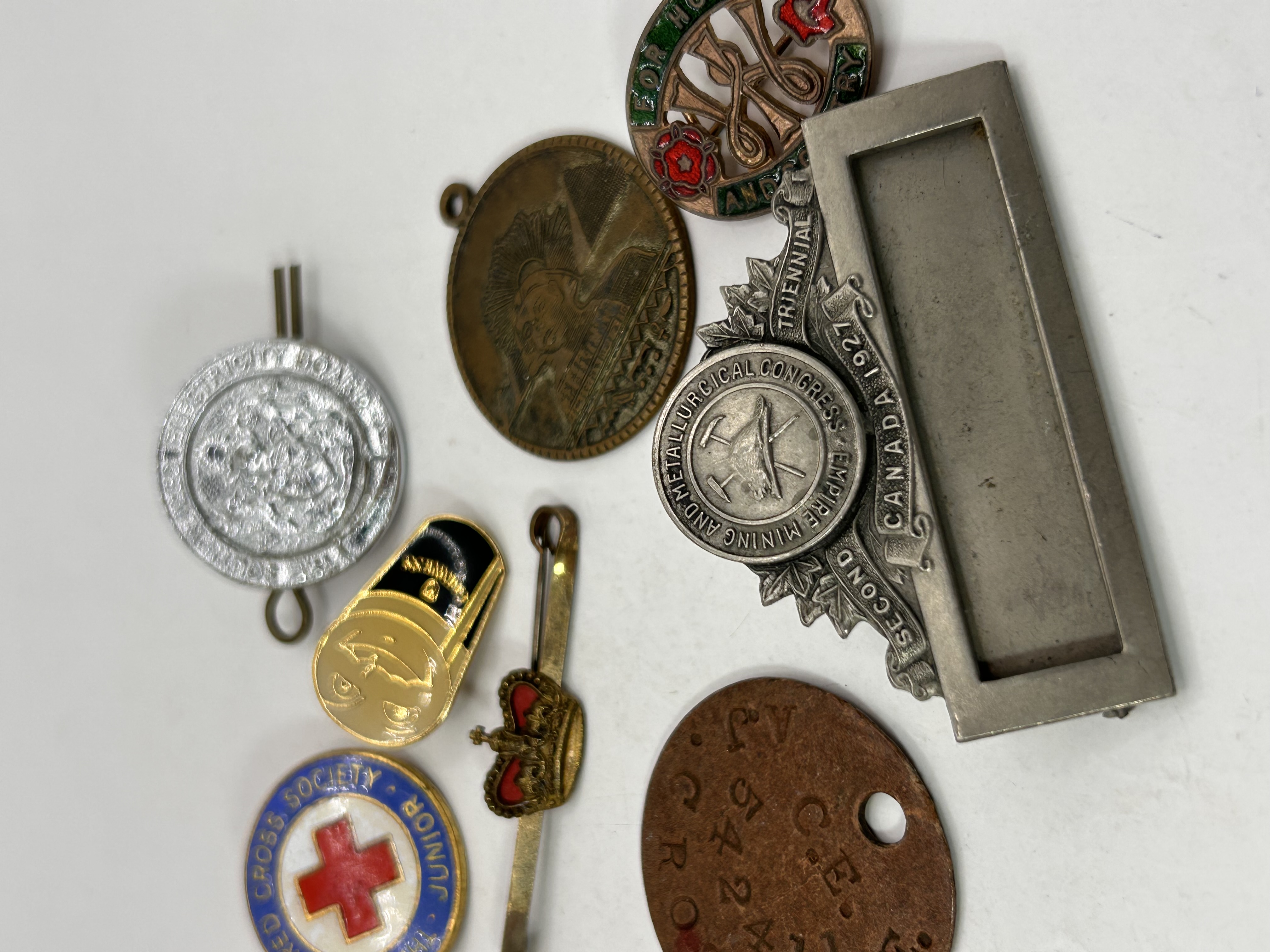 A collection of eight vintage badges, tokens, and medals crafted from mixed metals including copper, brass, bronze, and silver-toned base metal, featuring various enamel accents. The centerpiece is a silver-toned metal name badge or holder commemorating the SECOND EMPIRE MINING AND METALLURGICAL CONGRESS TRIENNIAL CANADA 1927. The reverse of this badge is stamped J. R. GAUNT. The collection also includes a heavily oxidized copper identification tag stamped with partial numbers 542 and CE, a round enamel RED CROSS SOCIETY JUNIOR pin, a small brass bar pin topped with a crown, a heavily patinated bronze circular medal depicting a male profile bust, a small enameled club pin featuring red and green accents, and two miscellaneous metal pins.