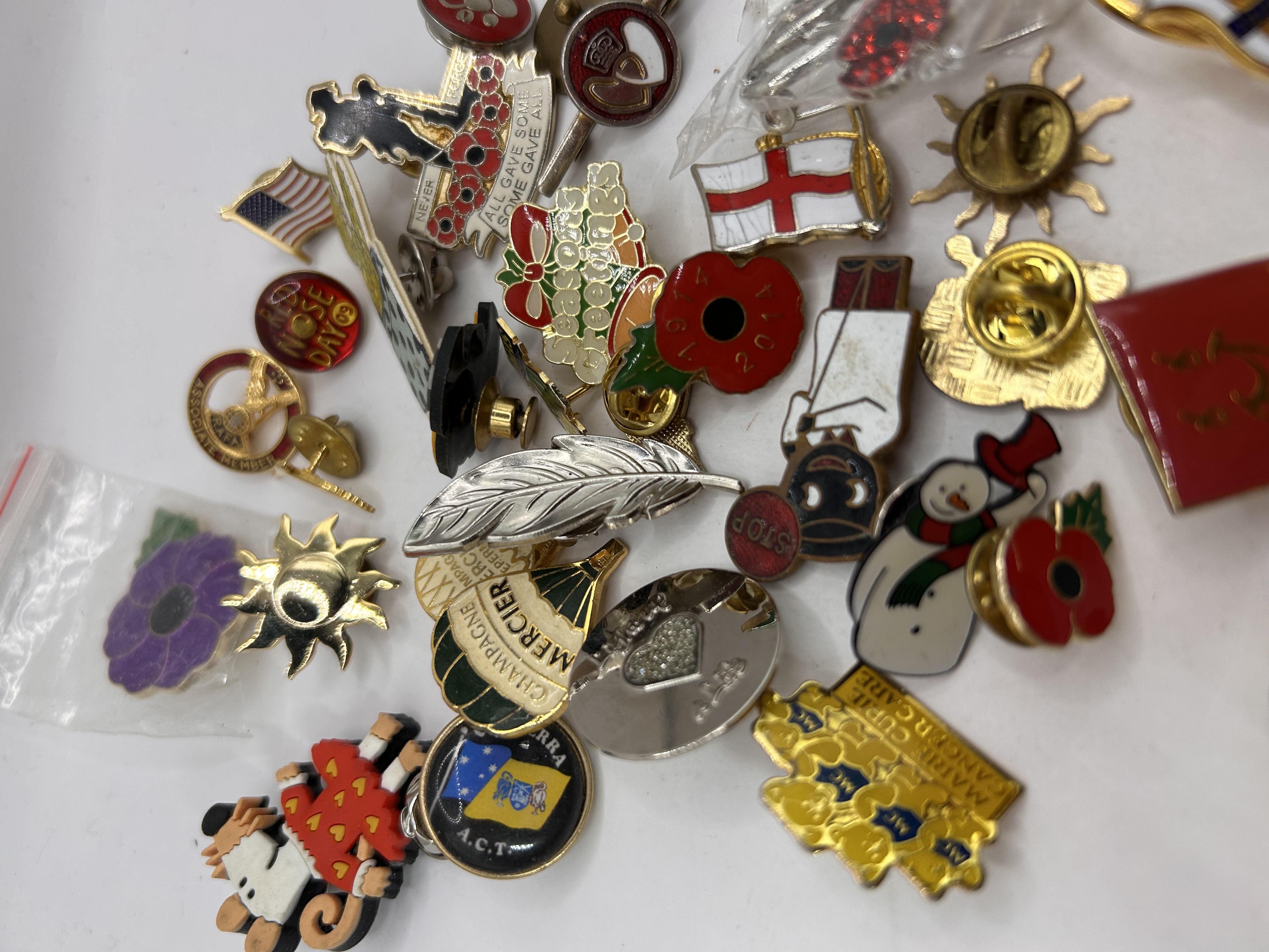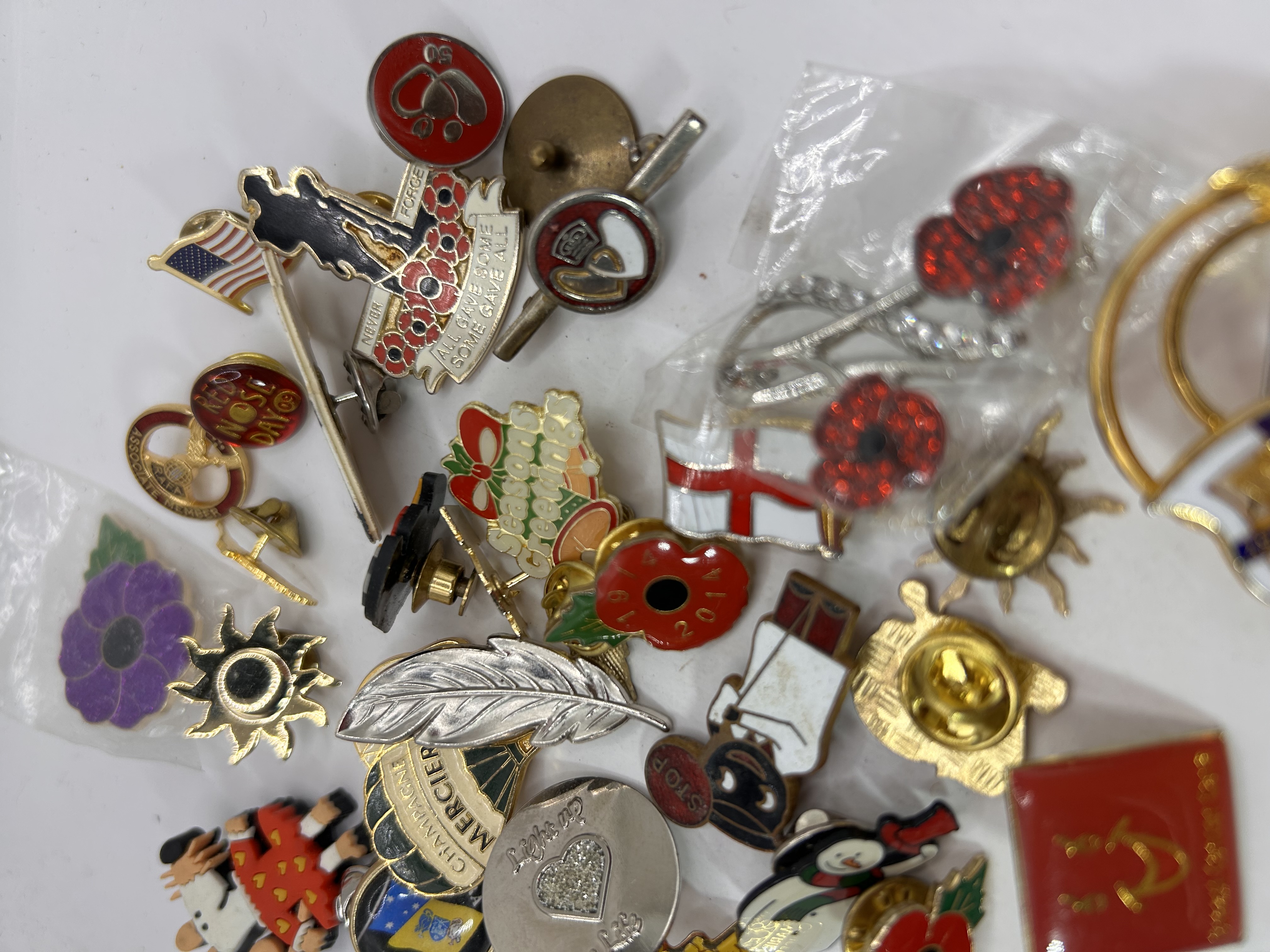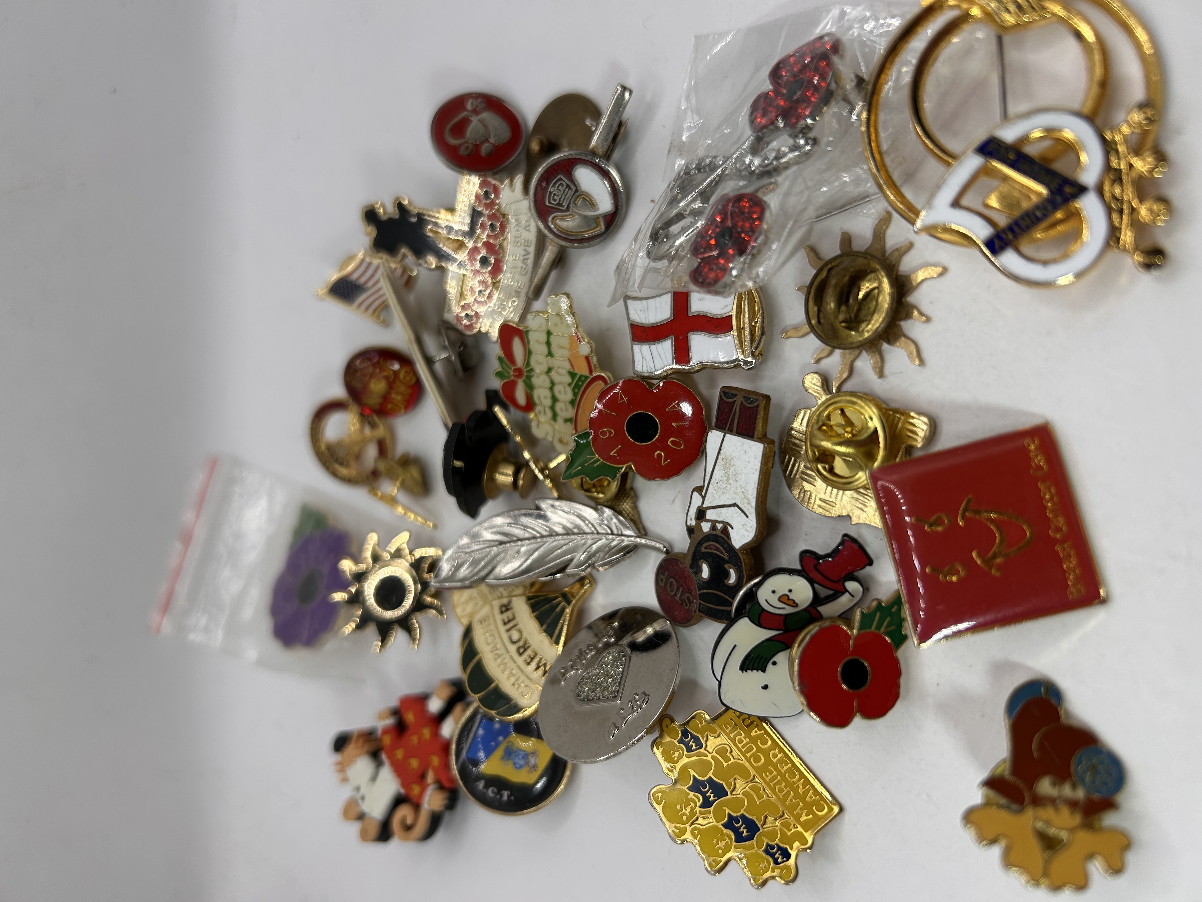 A collection of 27 modern and contemporary lapel pins, badges, and cufflinks, composed primarily of base metal with enamel, plastic, and rhinestone decoration. The collection features a variety of subjects including commemorative, promotional, and charity themes. Visible inscriptions include CHAMPAGNE MERCIER, NEVER FORGET… ALL GAVE SOME SOME GAVE ALL, MARIE CURIE CANCER CARE, NO MAY DAY, and Breast Cancer Care. One red poppy pin is marked 2004. Motifs include flags (US and England), holiday imagery (wreaths, snowmen), organizational insignias, and military silhouettes. The items are rendered in gold and silver tones. Two items, a pair of rhinestone cherry-style dangling pins and a purple enamel flower pin, are sealed in small plastic bags. The lot includes two pairs of cufflinks.