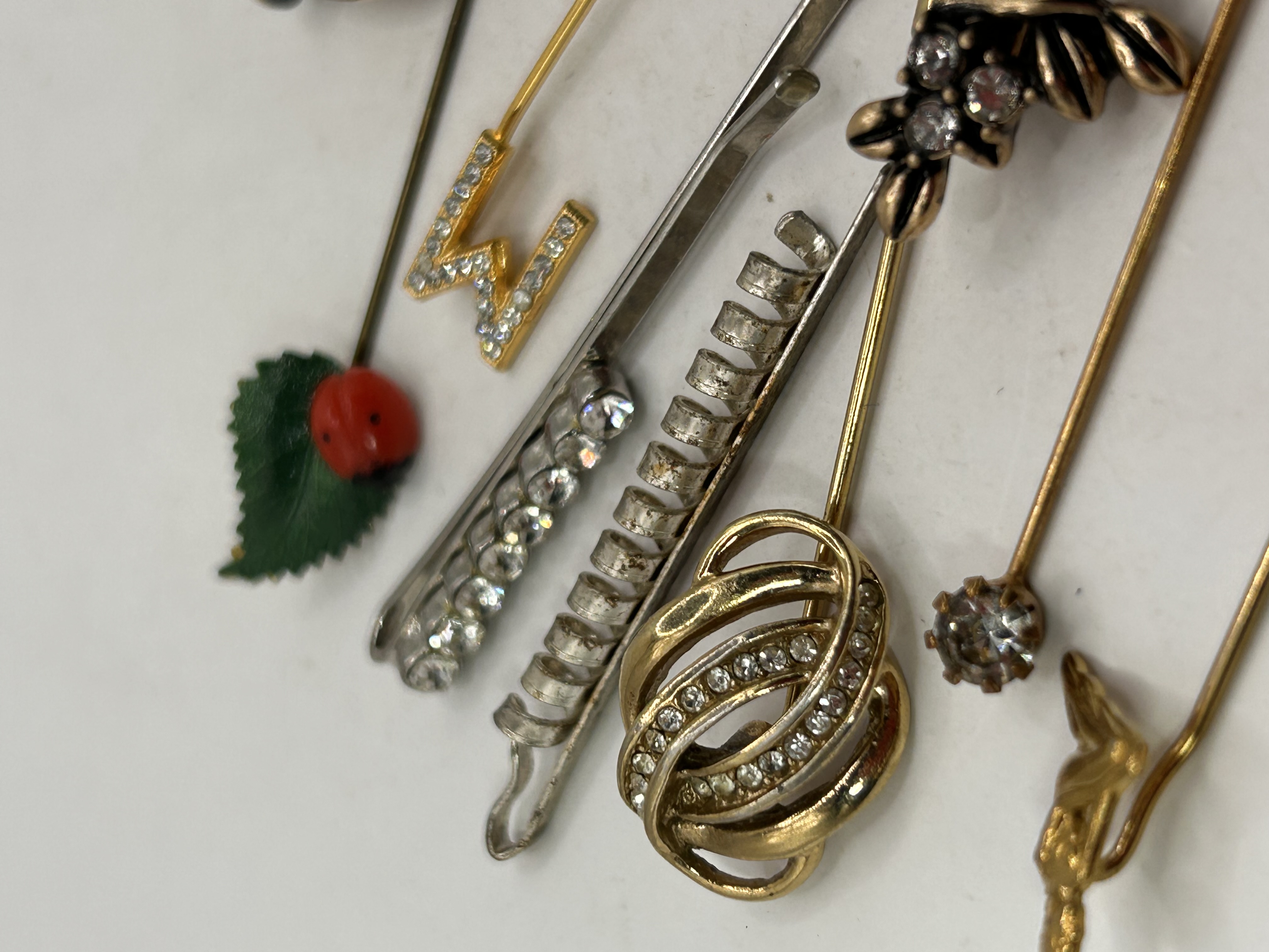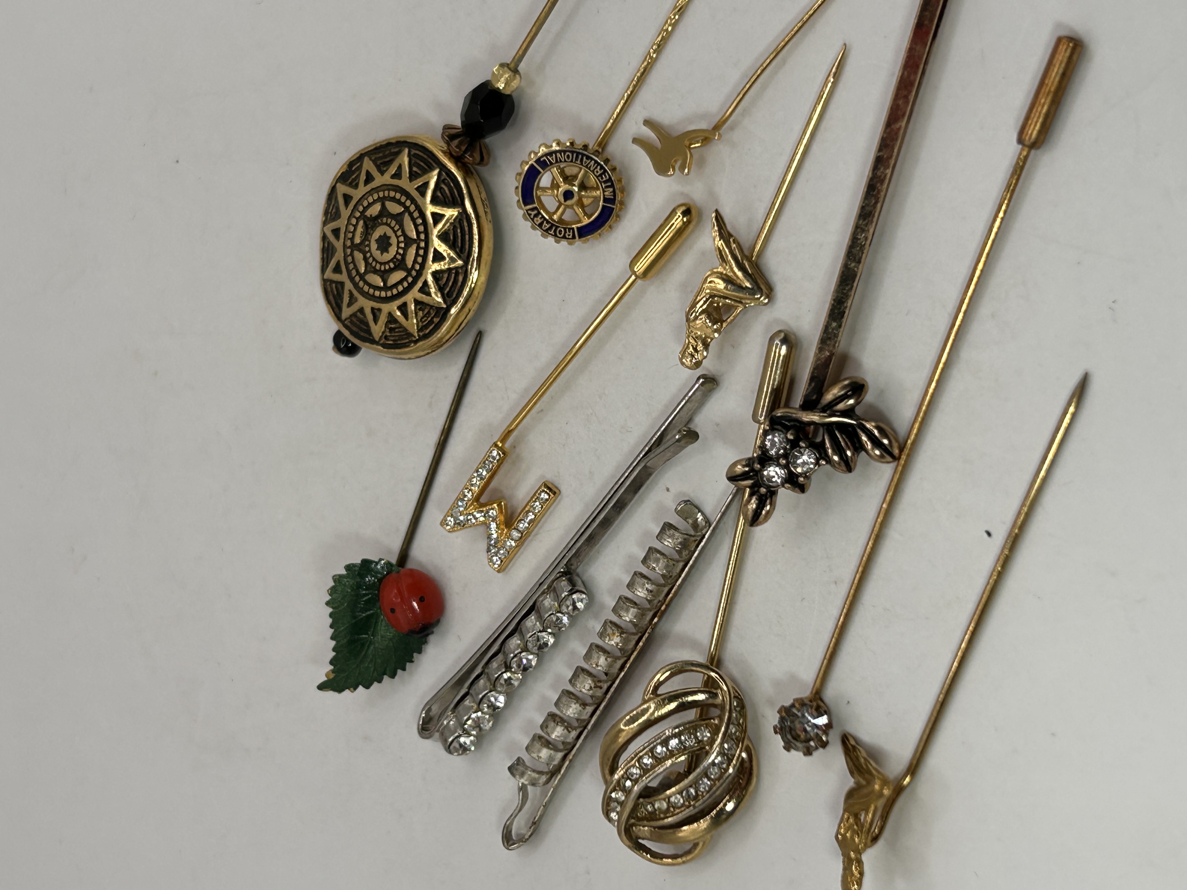 A collection of 13 pieces of vintage costume jewelry accessories, primarily comprising stick pins and lapel pins, along with two hair clips or bobby pins. The pieces are constructed from mixed base metals, predominantly gold-tone and silver-tone, set with clear paste rhinestones. The collection features a variety of designs, including a large black and gold sunburst medallion pin, a gold-tone knot pin set with rhinestones, and a stylized gold-tone ‘M’ initial pin. The lot also includes novelty items such as an enamel ladybug pin with a green leaf, and thematic pieces, notably a circular pin bearing the inscription “ROTARY INTERNATIONAL.” The two included hair clips are silver-tone, one featuring a row of clear rhinestones and the other a spiral-ribbed design.