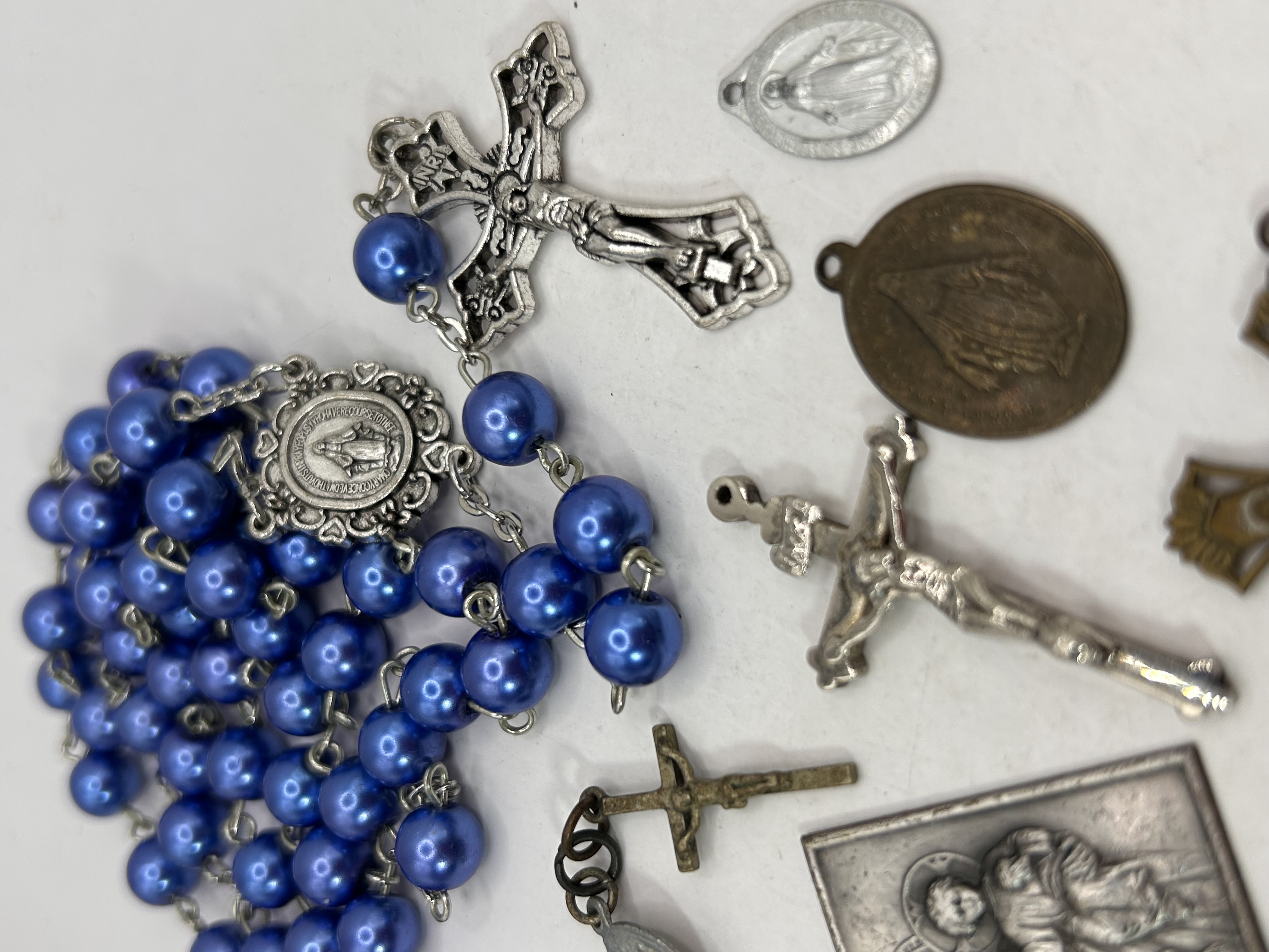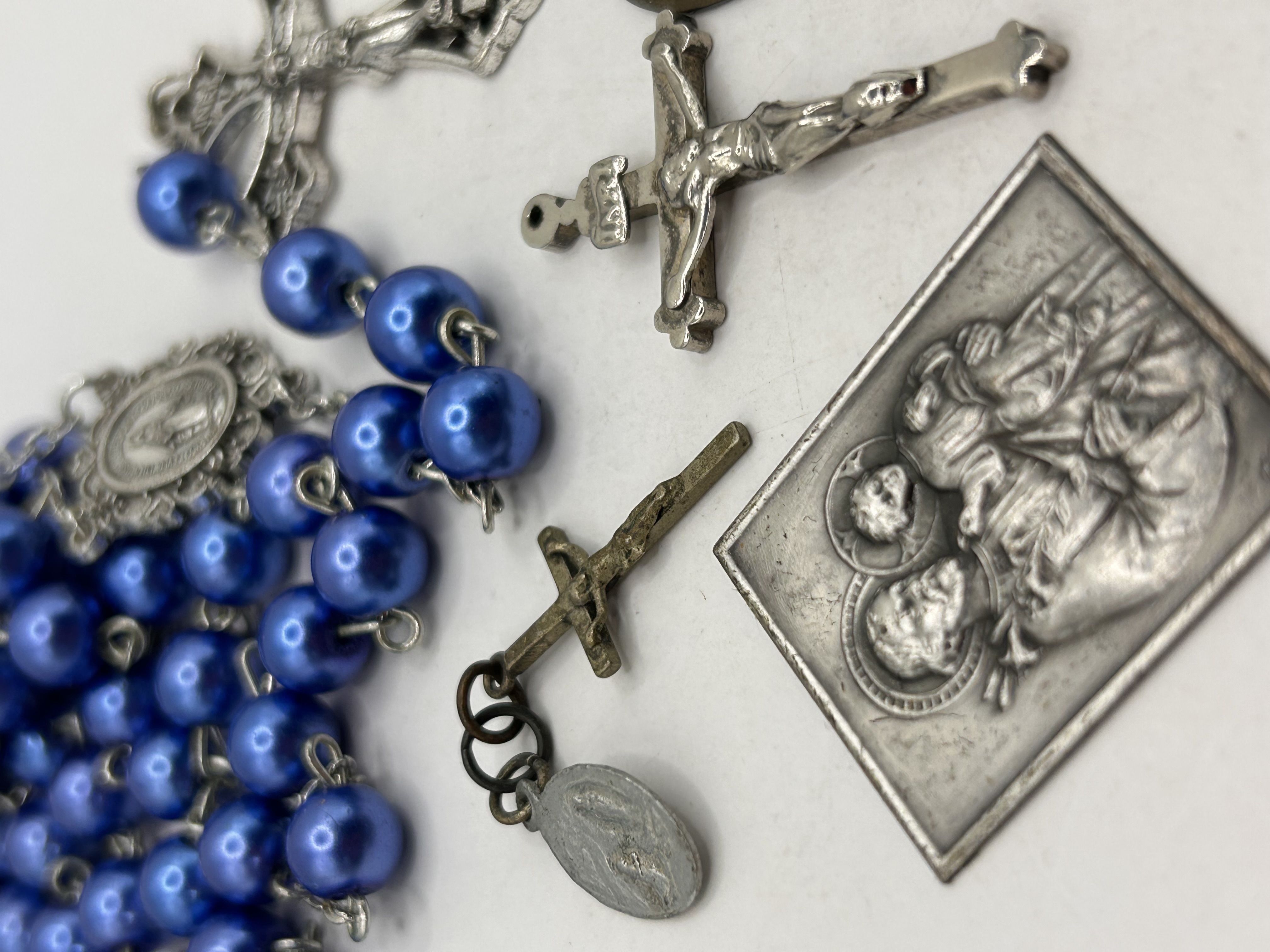 The lot comprises a collection of eight religious devotional items, predominantly Catholic. The central piece is a contemporary rosary constructed of medium-to-large royal blue faux pearl beads linked by silver-toned metal chains. The rosary features an oval Miraculous Medal centerpiece and terminates in a large, detailed silver-toned metal corpus Christi crucifix. The accompanying seven loose items include a small, aged brass crucifix attached to a small oval silver-toned medal; a separate, larger, modern shiny silver-toned corpus Christi crucifix; a large rectangular silver-toned devotional plaque depicting two figures, likely a saint and child; a substantial round patinated brass or bronze medal; a smaller bright silver-toned oval Miraculous Medal; and two very small, partially obscured metal findings/medals.
