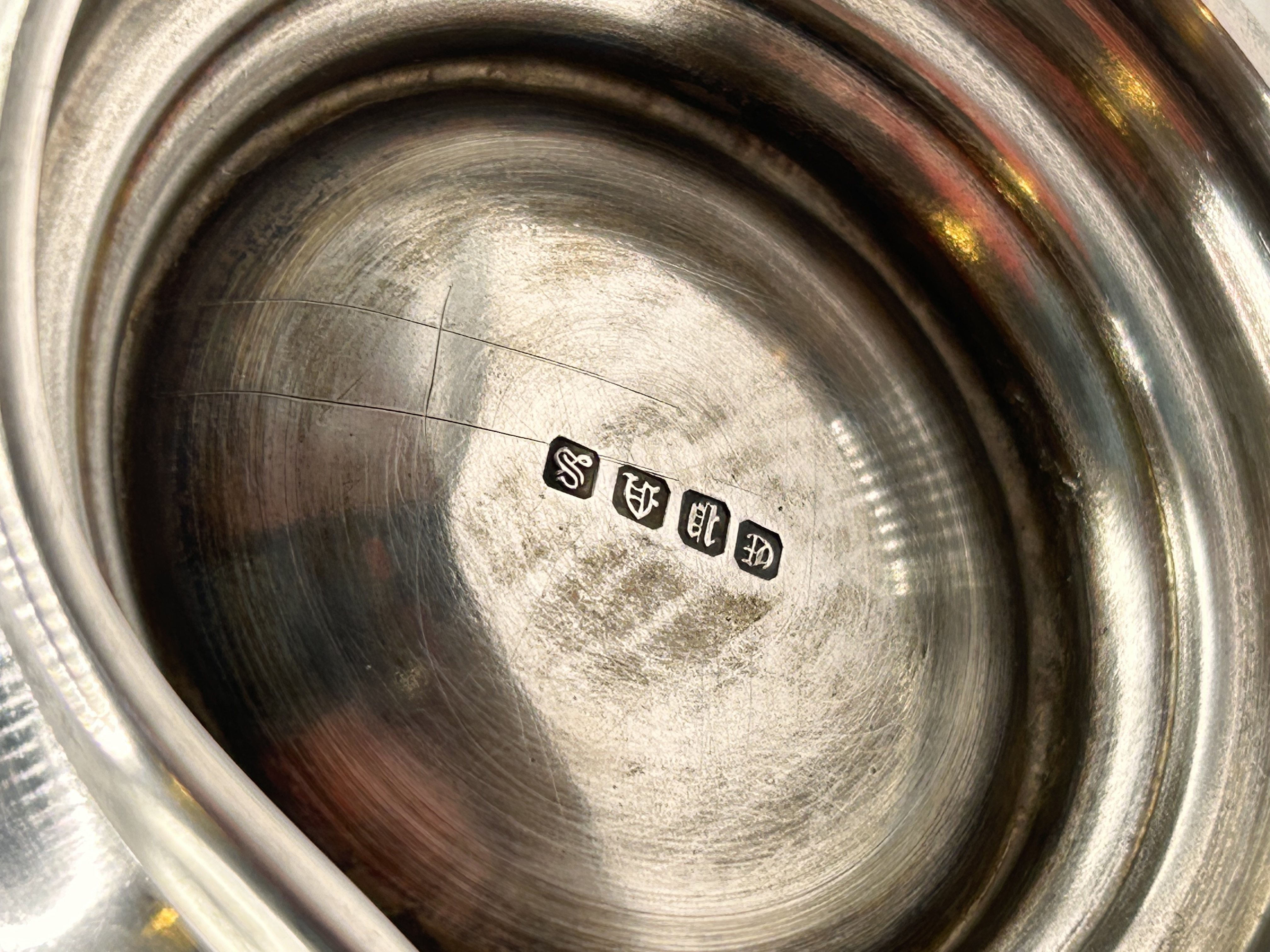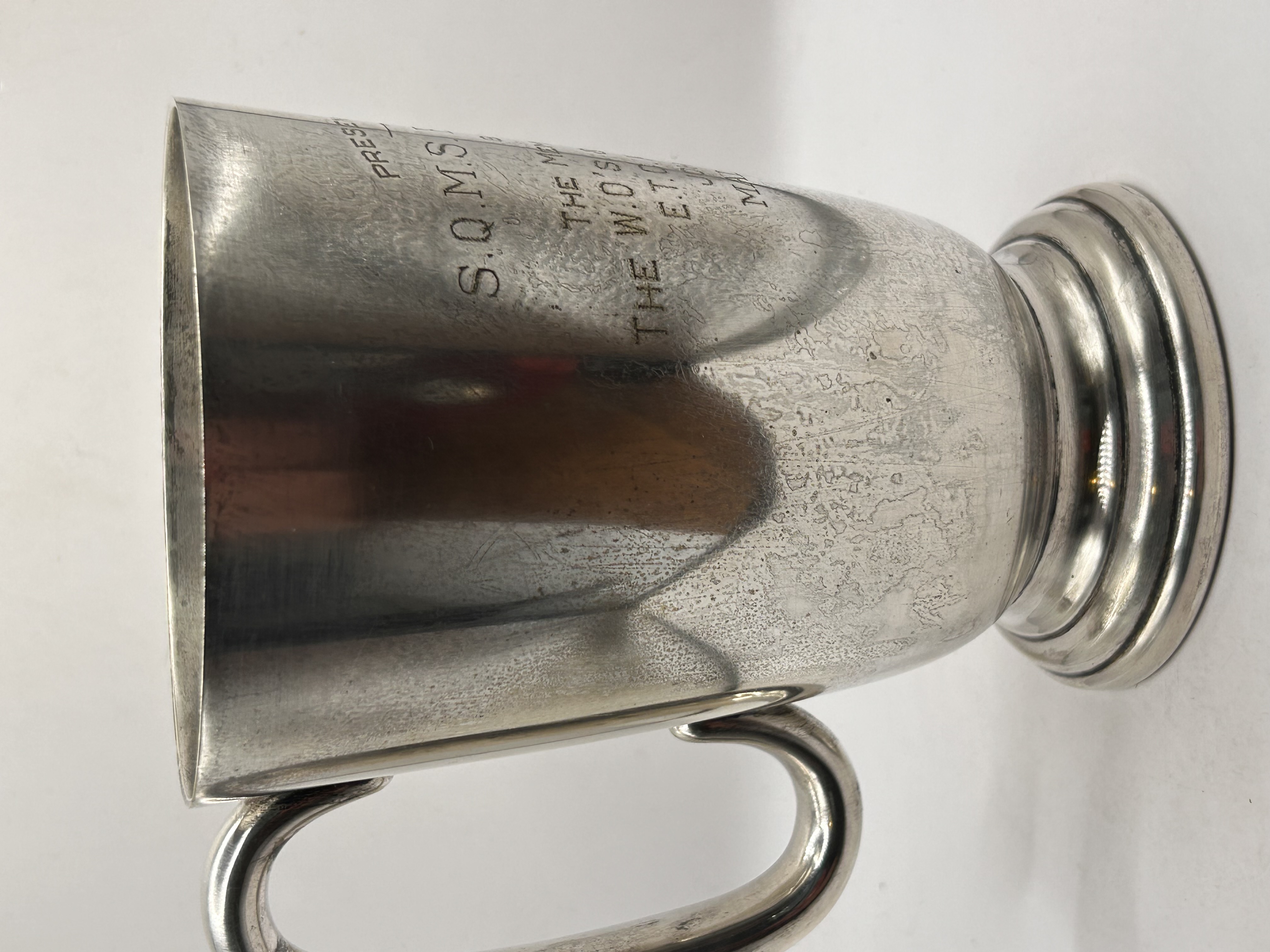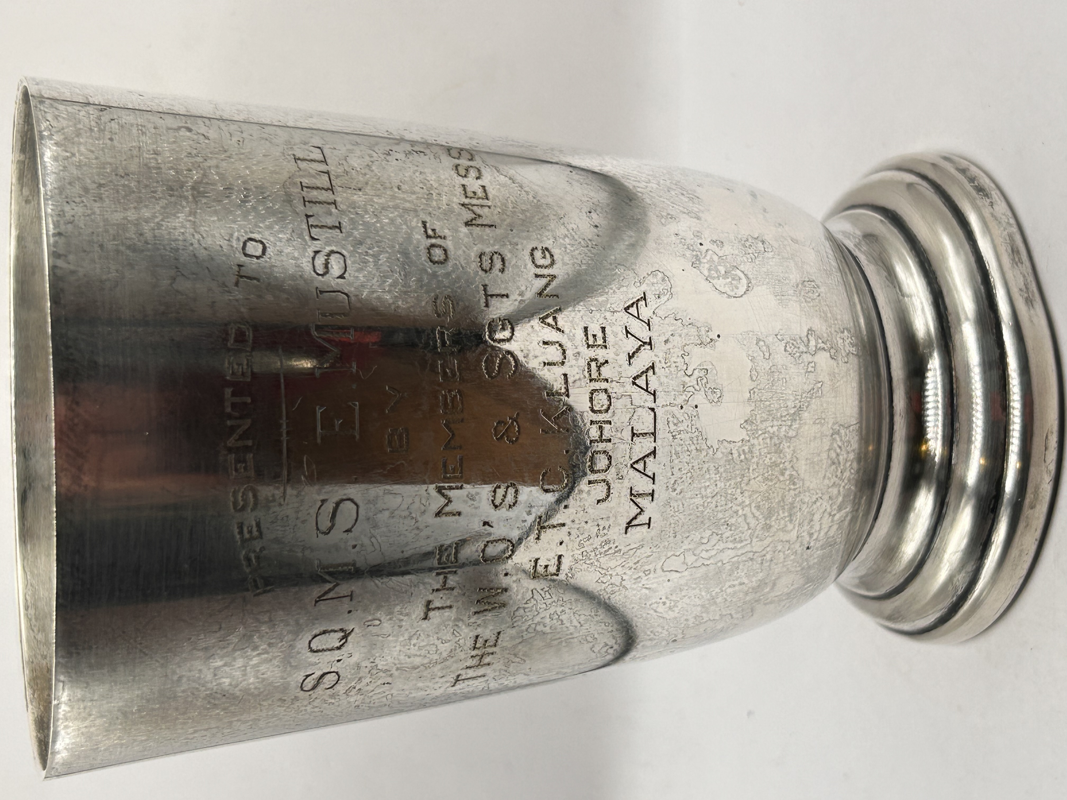 A single presentation tankard dating to the WW1 period. The tankard features a tapered cylindrical body, a robust C-scroll handle, and rests on a stepped circular foot. The exterior is deeply engraved with presentation text reading PRESENTED TO S.Q.M.S E. MUSTILL BY THE MEMBERS OF THE W.O’S & SGTS MESS E.T.C KLUANG JOHORE MALAYA.