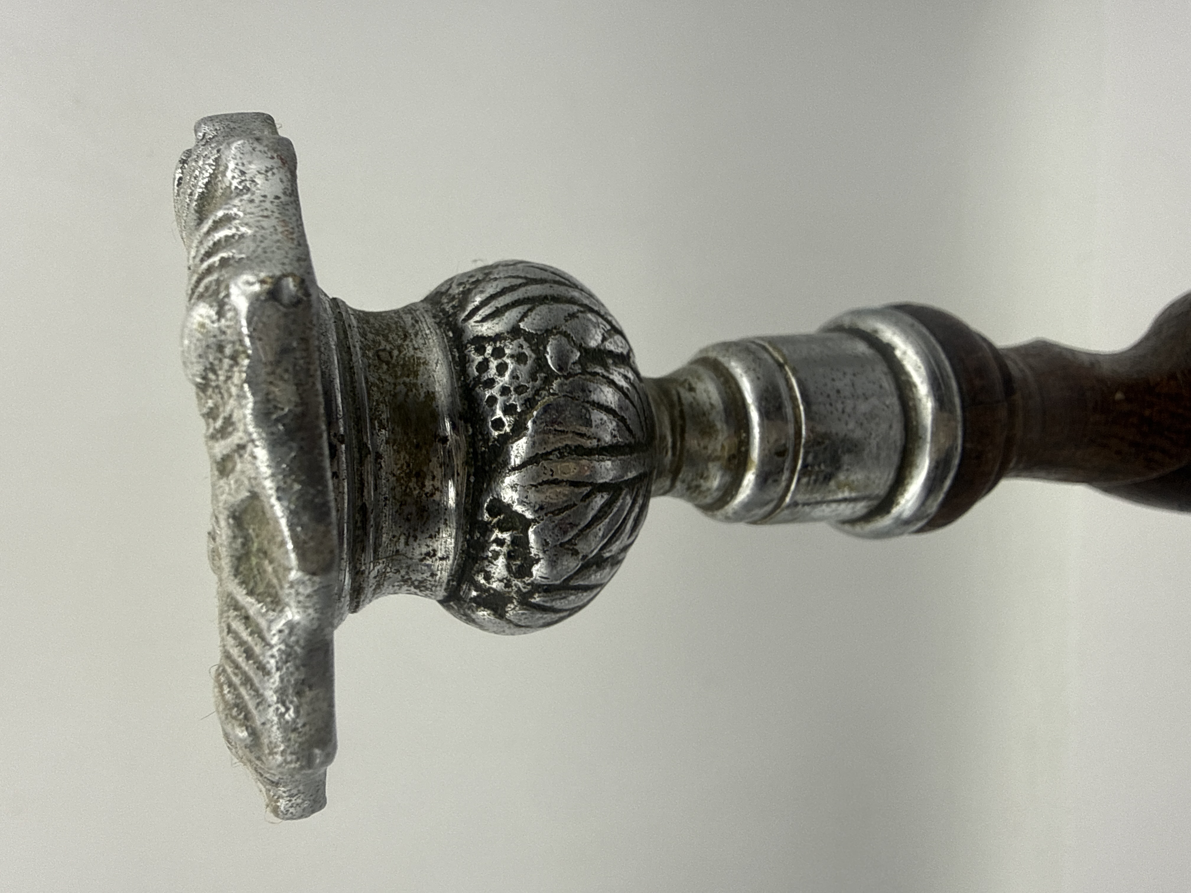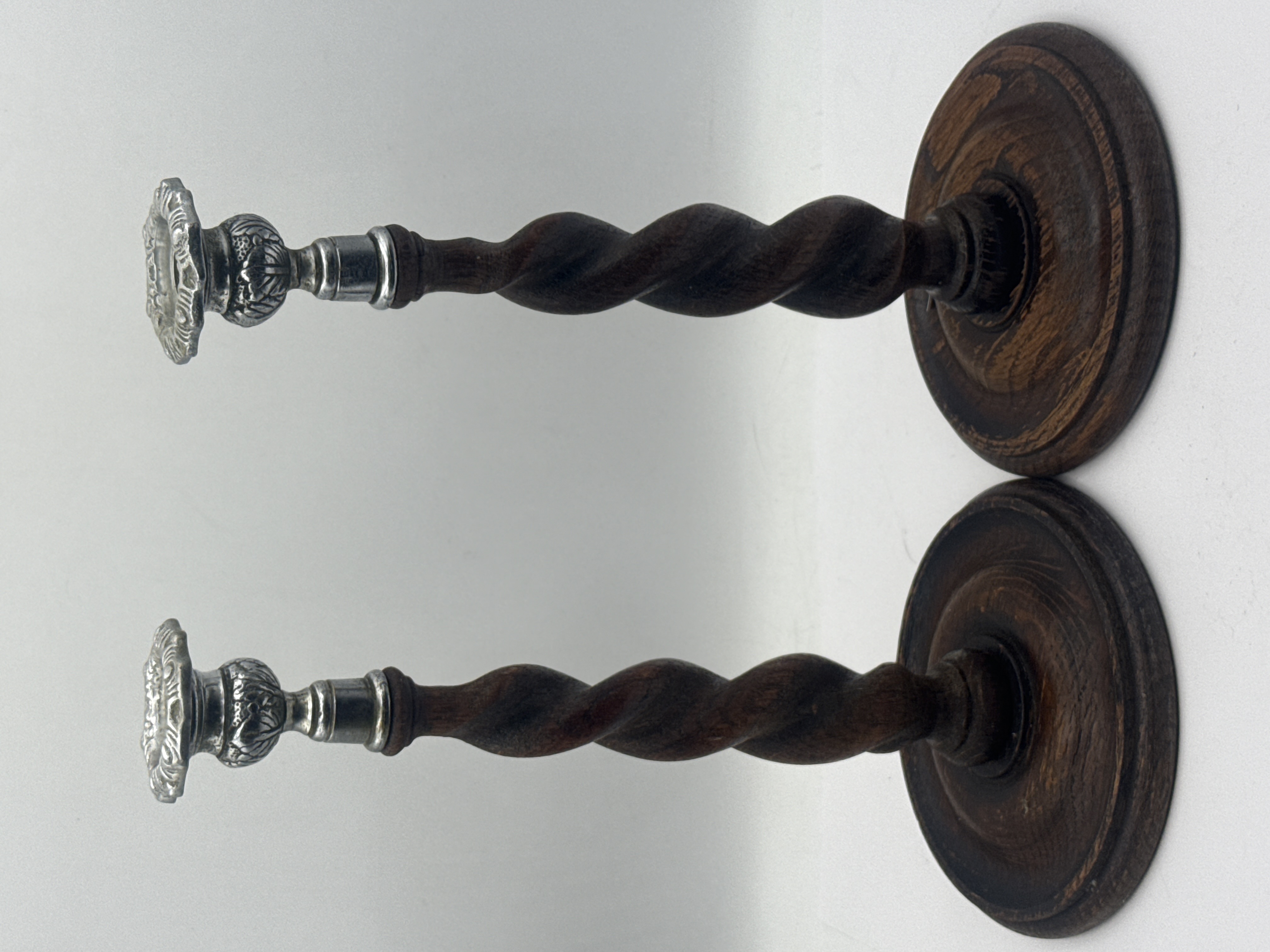 A pair of antique English candlesticks featuring stems constructed from dark-stained oak executed in the characteristic barley-twist (spiral-turned) design. The stems terminate in circular, stepped bases. Each wooden stem is surmounted by a metal assembly, identified by market consensus as brass, which includes a polished collar and an ornate candle nozzle component. The nozzle displays relief work with foliate or floral motifs.