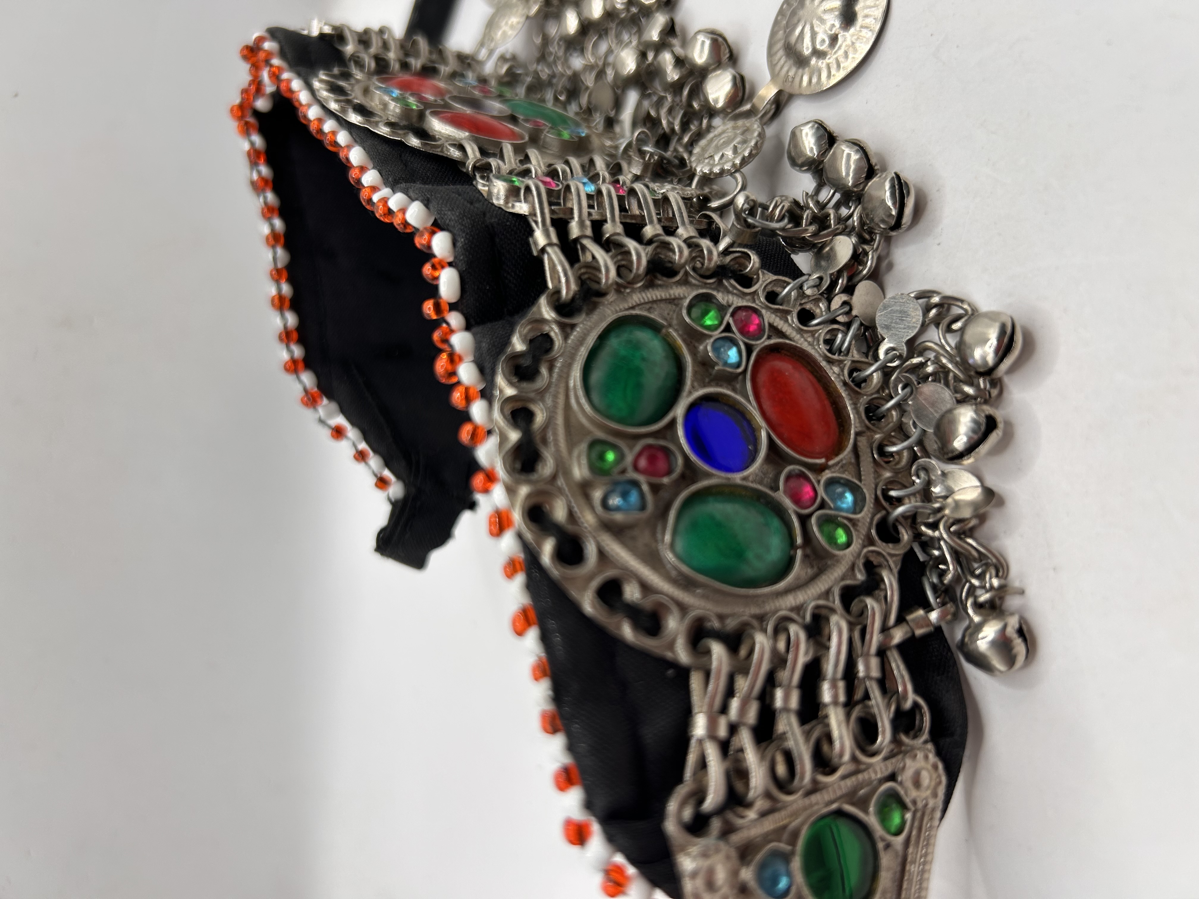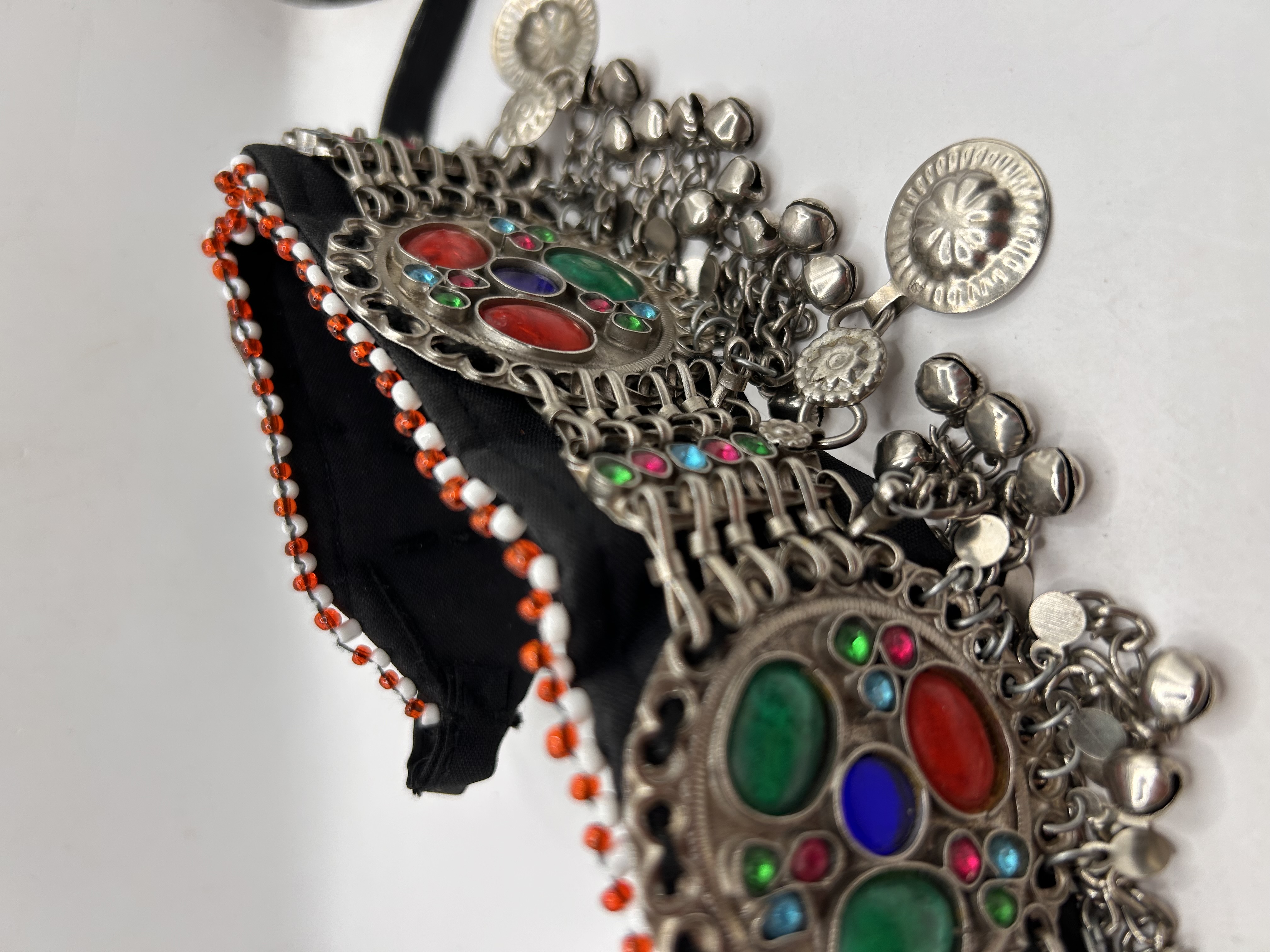 A single Afghan Kuchi tribal headpiece or collar, constructed from mixed media materials typical of the Kuchi nomadic style. The foundation is a wide black textile band, edged along the upper border with small white and orange/red seed beads. Applied centrally is a heavy band of interconnected silver-toned base metal plaques. These plaques are set with large, polished faux stones or cabochons in primary colors including red, green, and blue, accented by smaller multi-colored rhinestones. The metalwork features intricate scroll borders and chain-link construction. The lower edge is heavily ornamented with numerous dangling elements, including small bell-shaped charms and circular stamped metal pendants attached by short chain lengths. No visible maker’s marks or hallmarks are present.