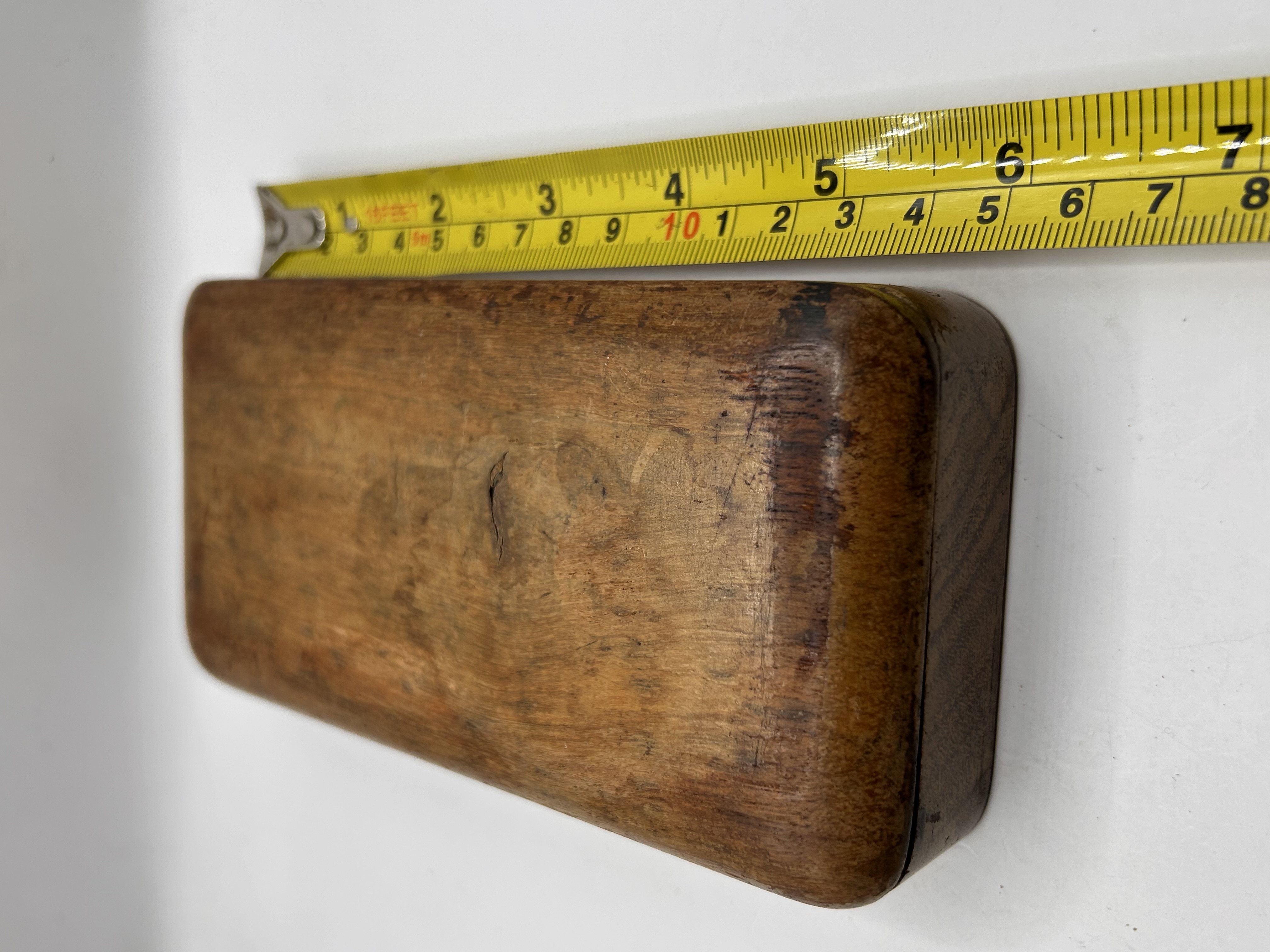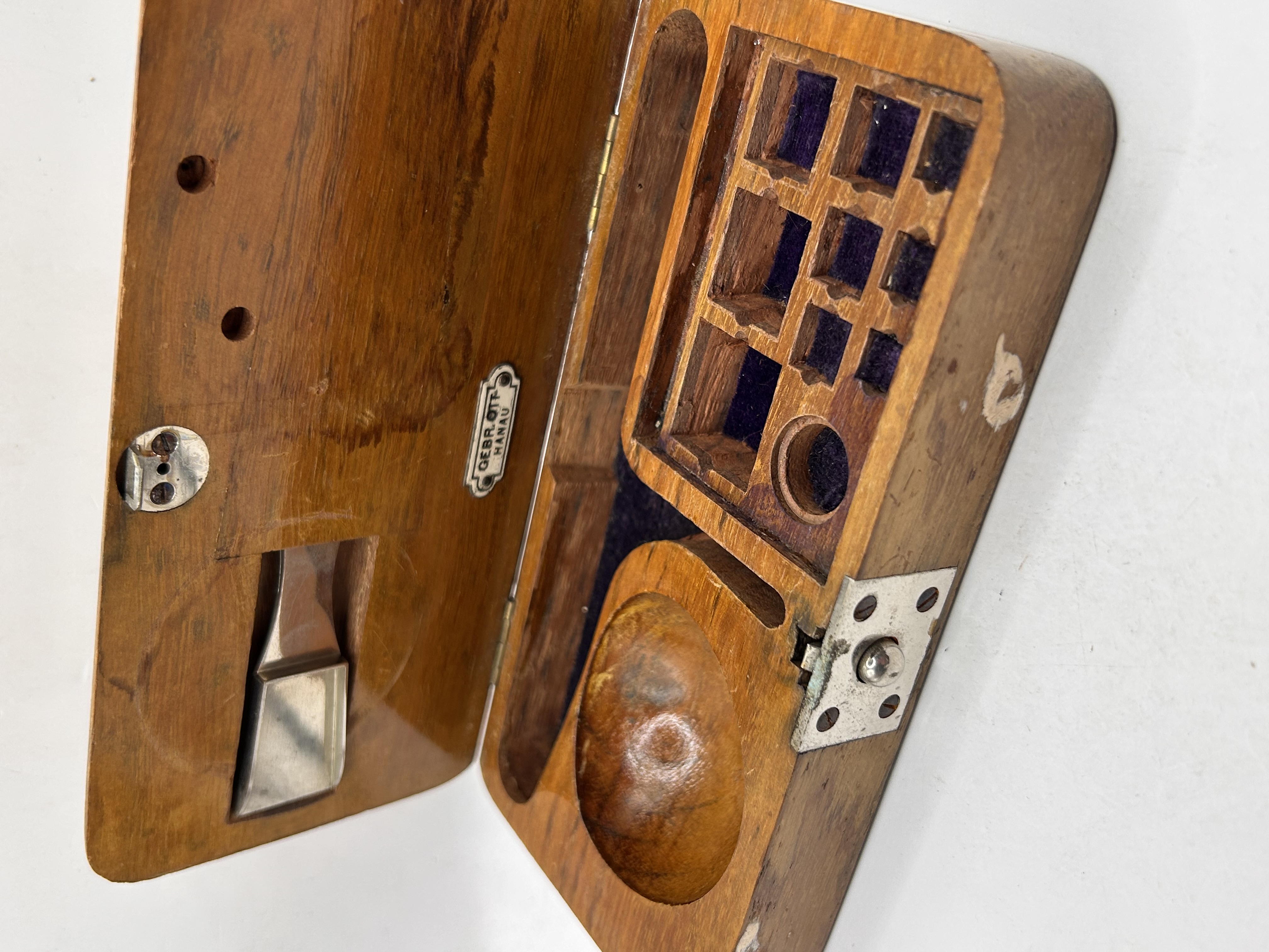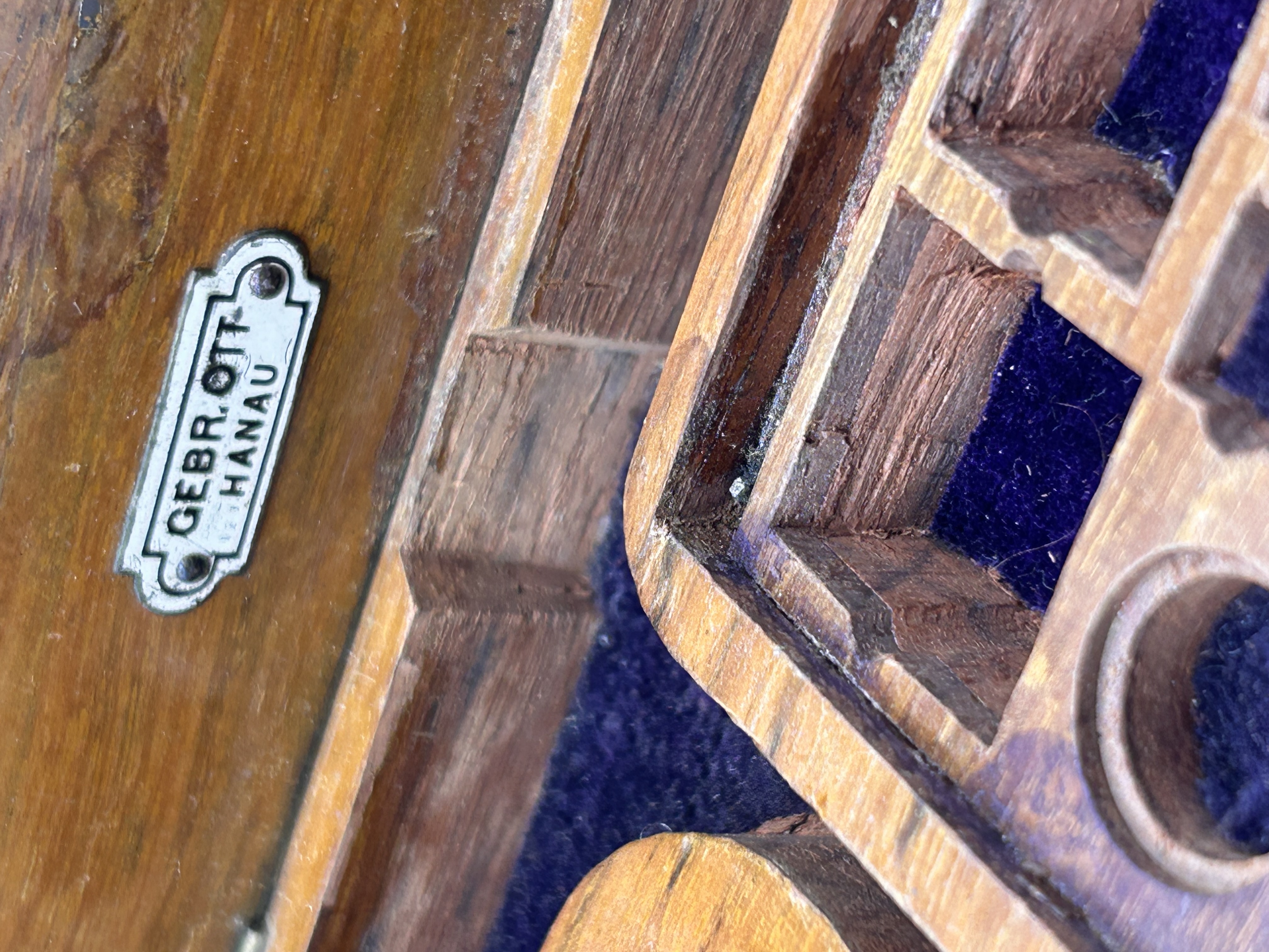 An antique or vintage cased pocket jeweler’s balance scale, manufactured or retailed by Gebr. Ott of Hanau. The set is housed in a rectangular, polished dark hardwood box featuring hinged construction and a front metal clasp closure. The interior contains a carved, deep wooden recess, multiple felt-lined storage compartments, and a narrow storage channel, indicating it was designed for precision diamond or carat weighing. The interior lid retains an affixed metal plaque marked GEBR. OTT HANAU. The collection consists of two visible components: the wooden case and one partial metallic implement secured within the lid. The majority of the weighing components, including the balance beam, pans, and weights, are absent.