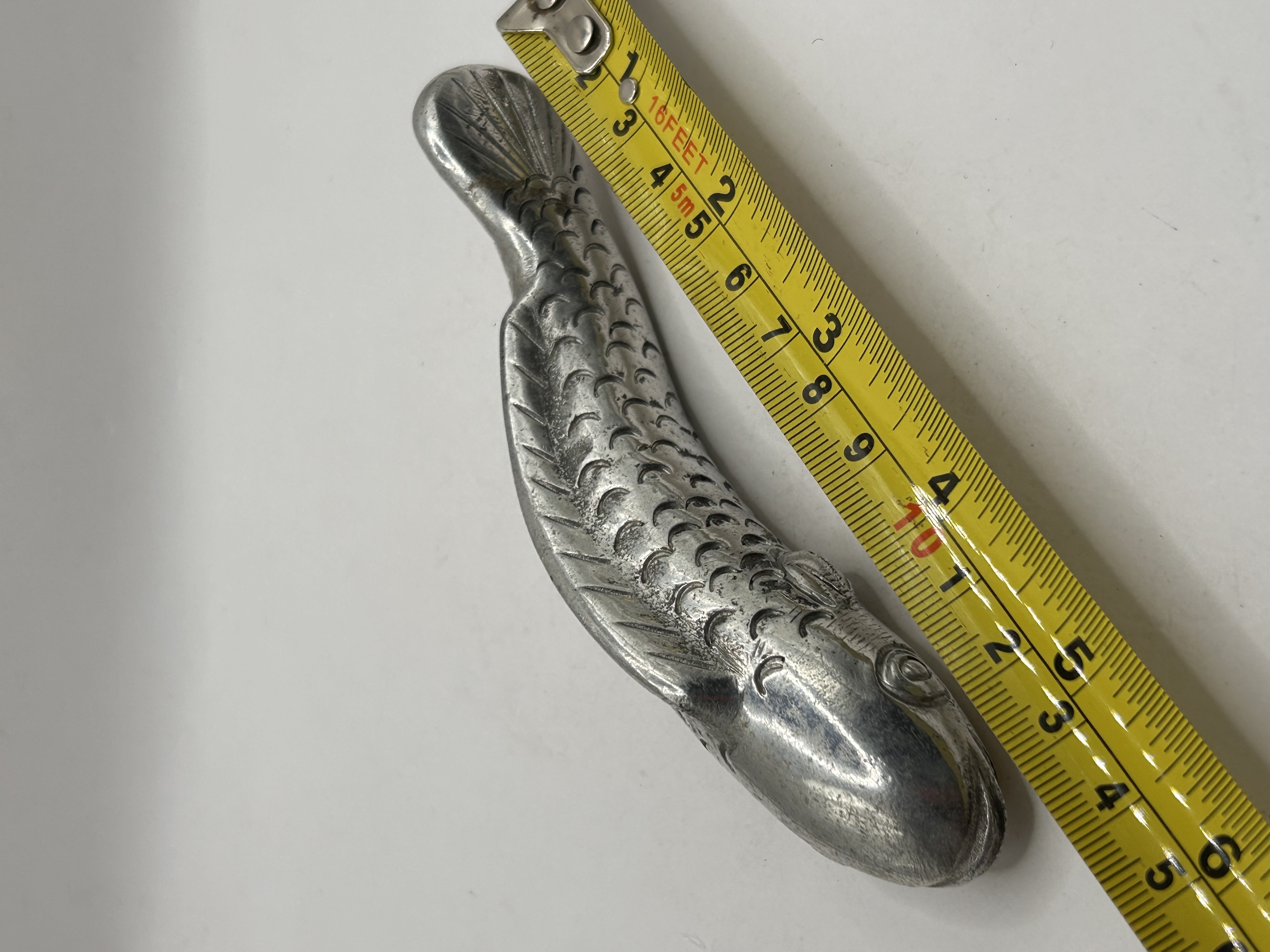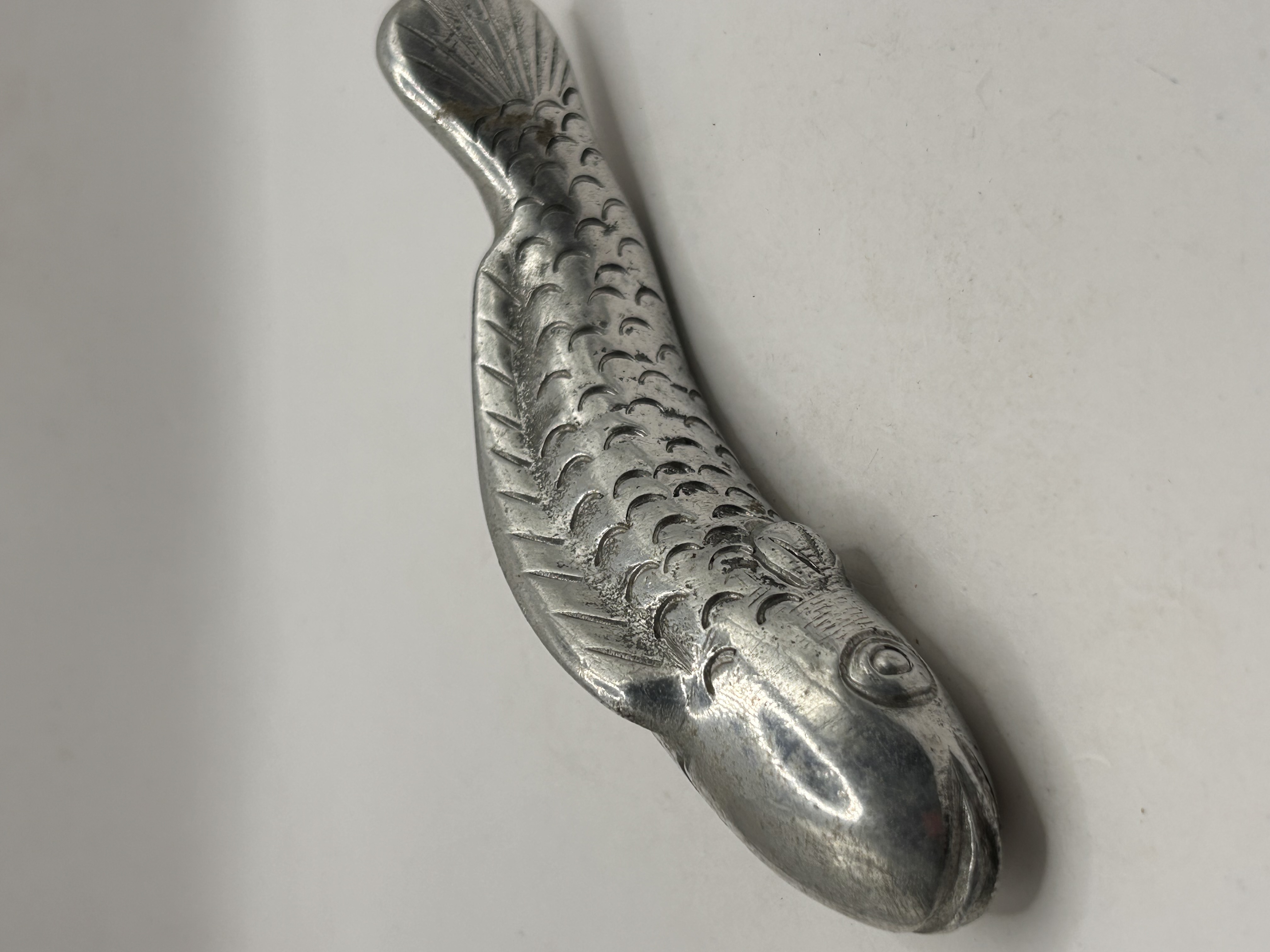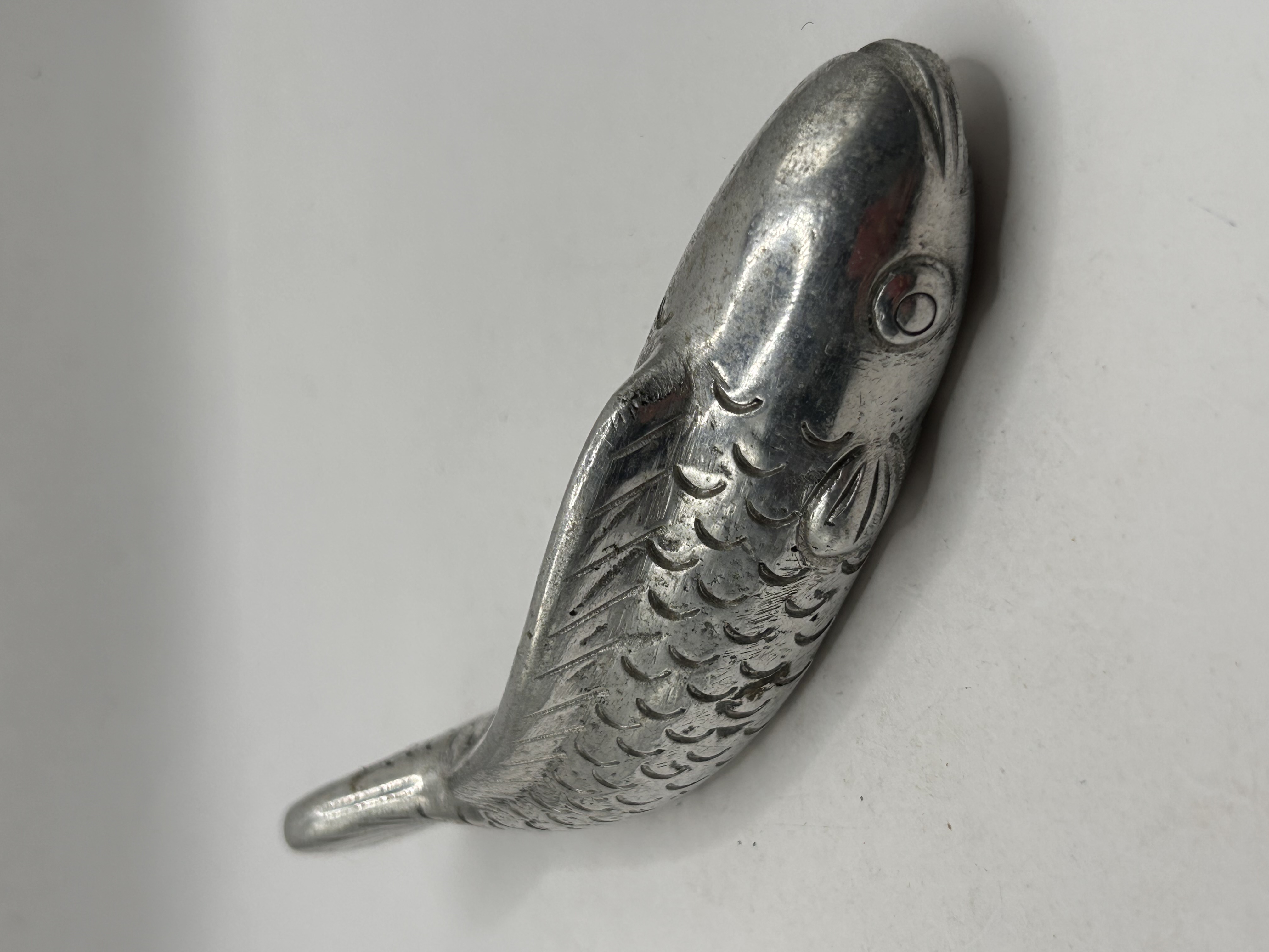 A single figural novelty implement, likely functioning as a paperweight, cigar rest, or match safe. The object is sculpted entirely in the form of a fish, executed in a silver-toned metal, possibly pewter or a plated alloy. The casting features detailed naturalistic elements including distinct scales, molded eyes, and defined dorsal, pectoral, and caudal fins. The style is nautical, consistent with early to mid-20th century novelty items found in the market alongside sterling silver examples. No identifying hallmarks or manufacturer’s inscriptions are visible.