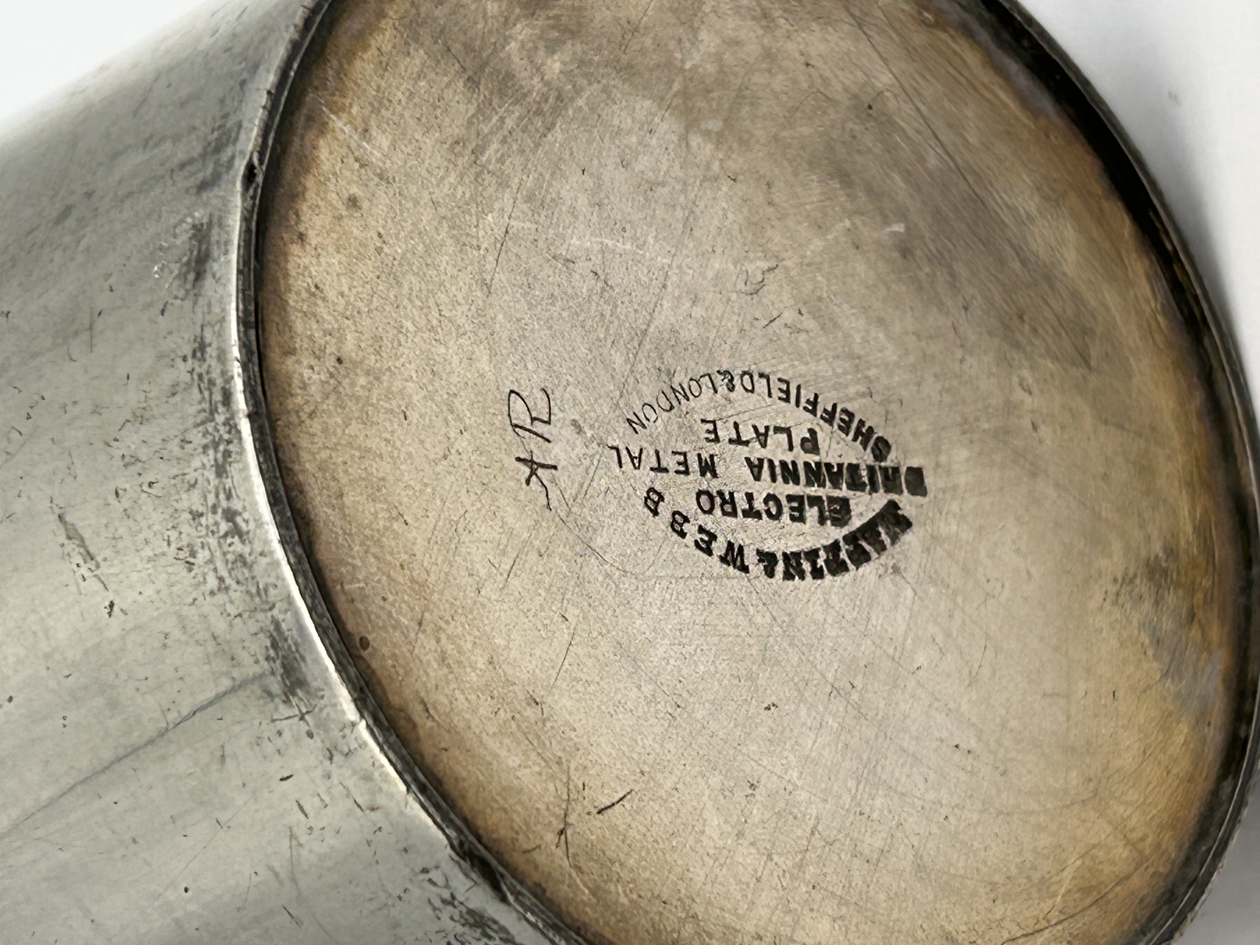 A single electroplated Britannia Metal (EPBM) presentation cup or tumbler, manufactured by Bristol & Webb of Sheffield and London. The cup features a slightly tapered cylindrical form typical of early 20th-century sporting trophies. The underside is marked with a circular stamp reading BRISTOL & WEBB ELECTRO BRITANNIA METAL PLATE SHEFFIELD & LONDON, along with the scratched initials AR. The front is engraved with presentation text detailing the award: THE BLACKHORSE SHOOTING CLUB. 21ST ANNUAL MEETING REVOLVER TEAM MATCH WON BY Sergt H. PHILLIPS.