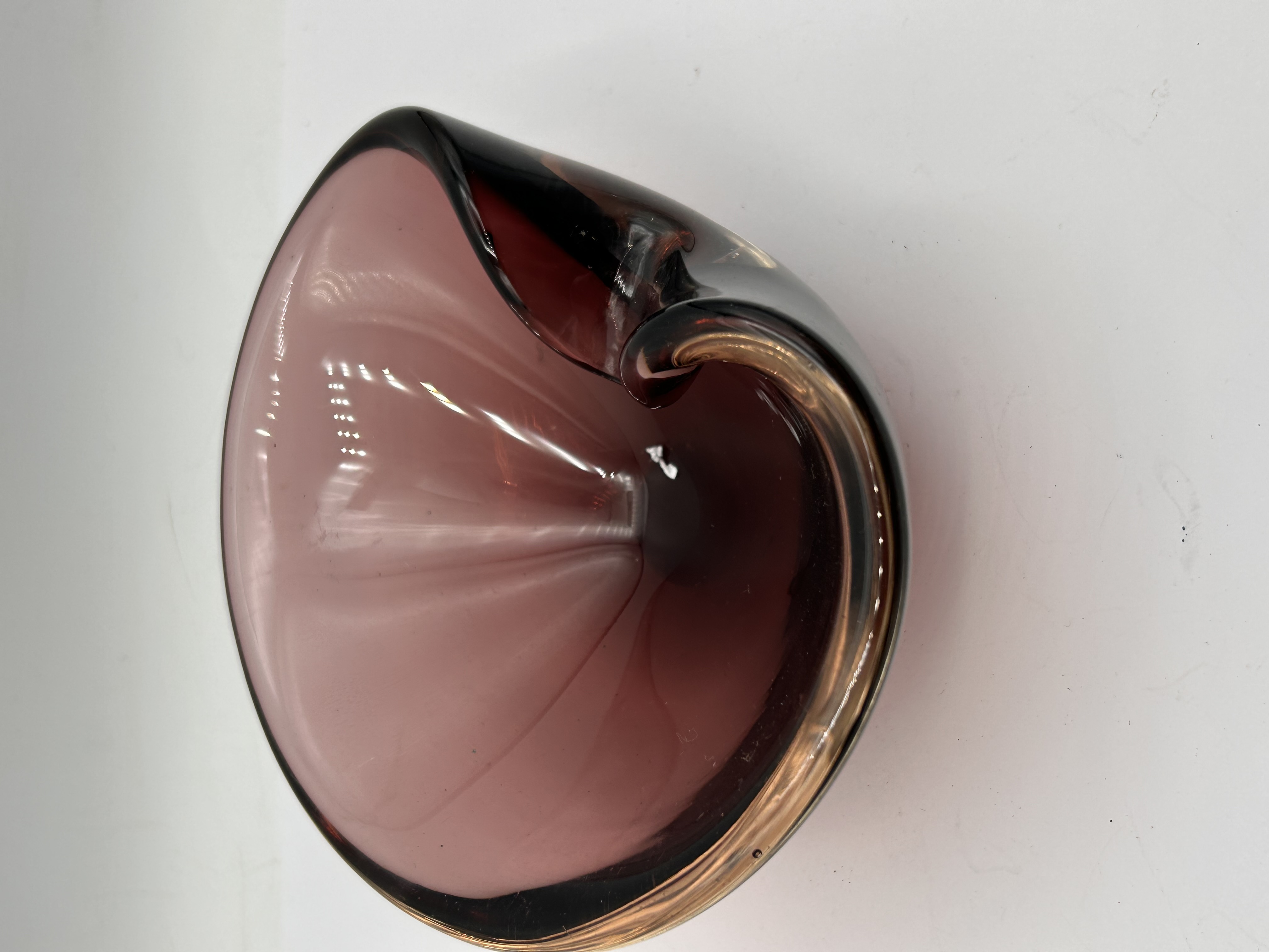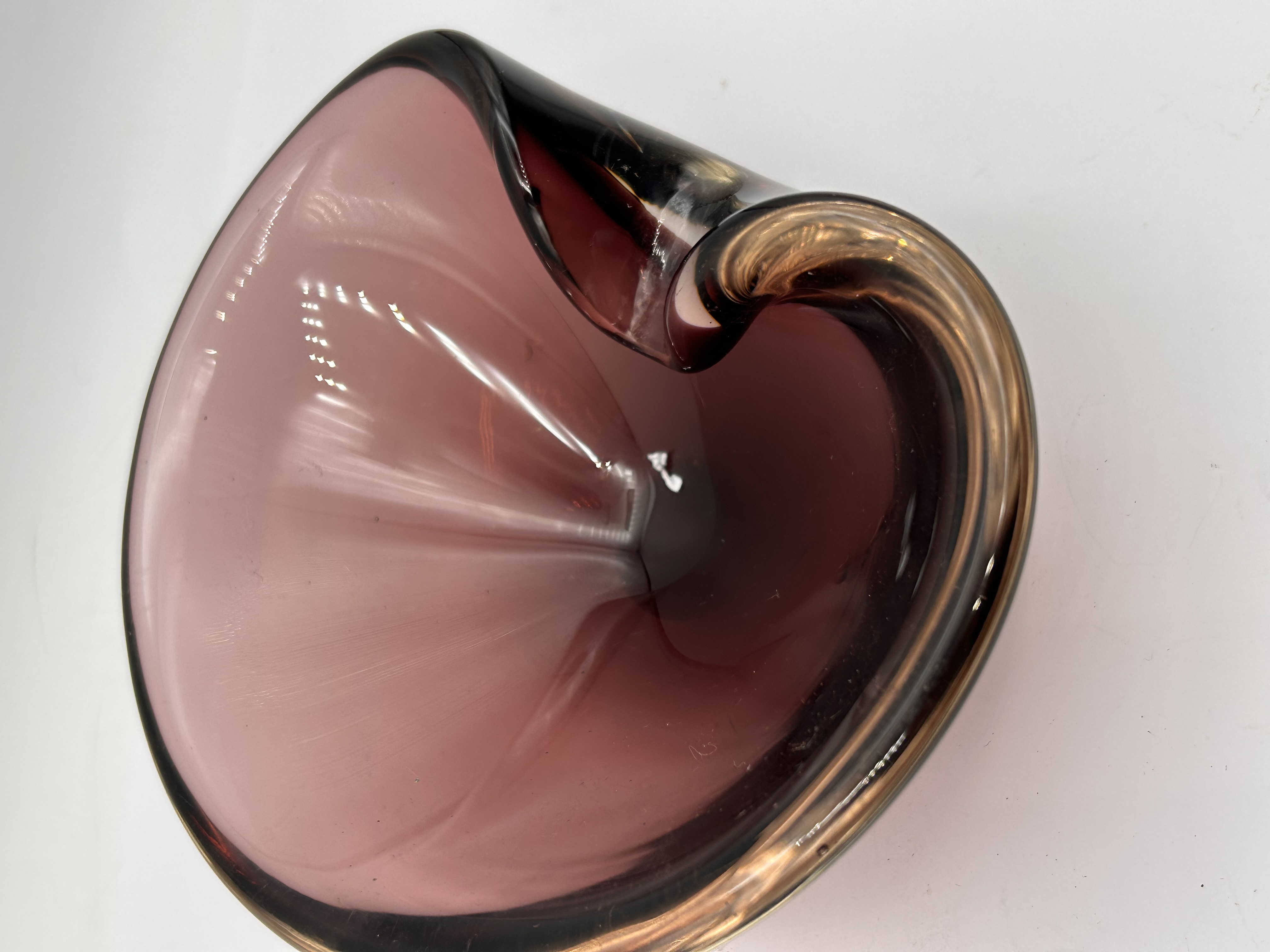 A single sculptural art glass vessel attributed to Mid-Century Italian or Murano production, circa 1960s-1970s. The bowl is executed in a swirling, asymmetrical form consistent with the period. It is crafted from thick, hand-blown glass, featuring a deep amethyst or reddish-purple body. The dramatically folded rim incorporates an integrated overlay of contrasting amber-to-gold tone glass, creating a two-tone appearance. The interior surface displays subtle vertical texture or ribbing. No manufacturer markings, signatures, or labels are visible.