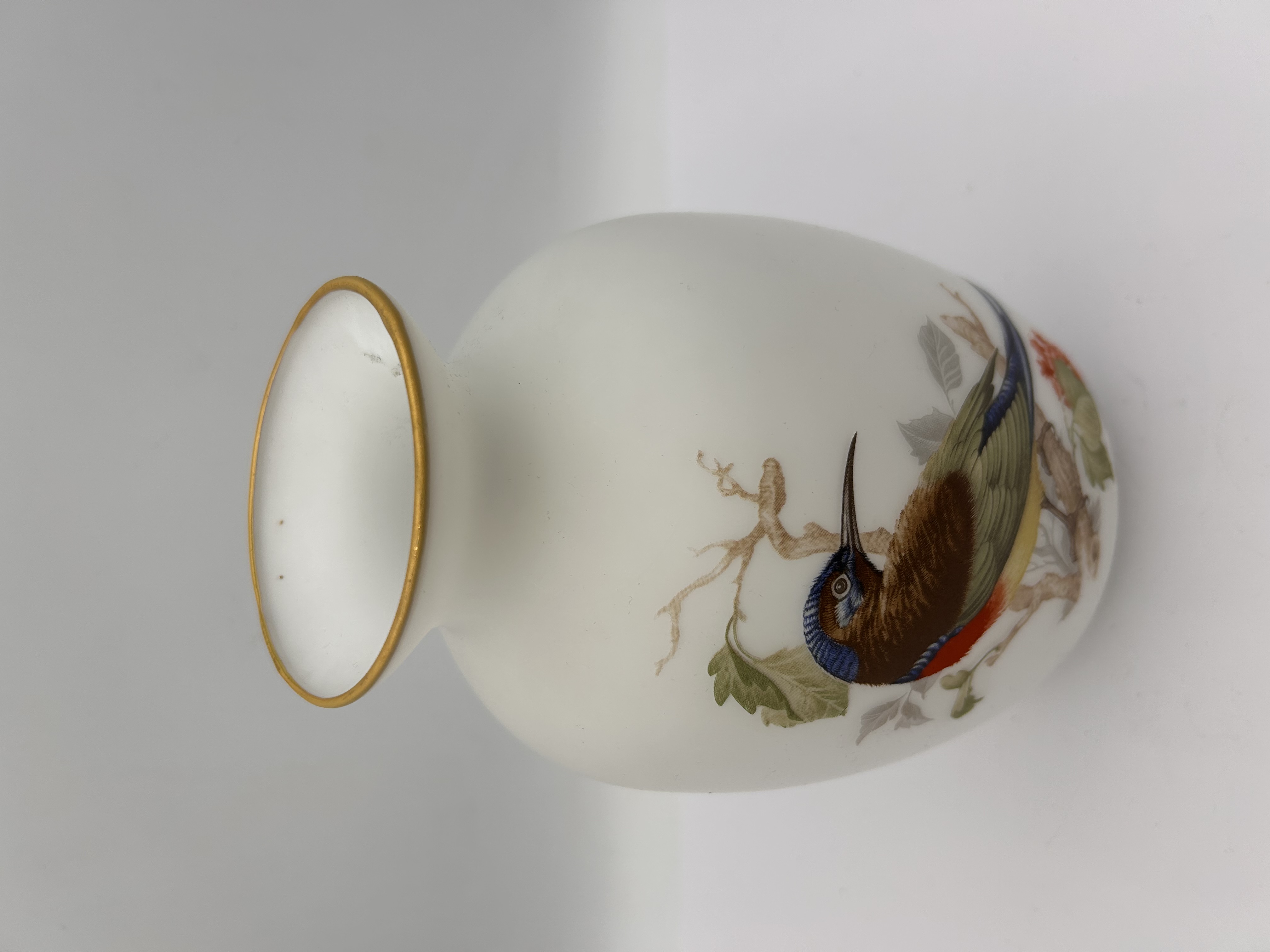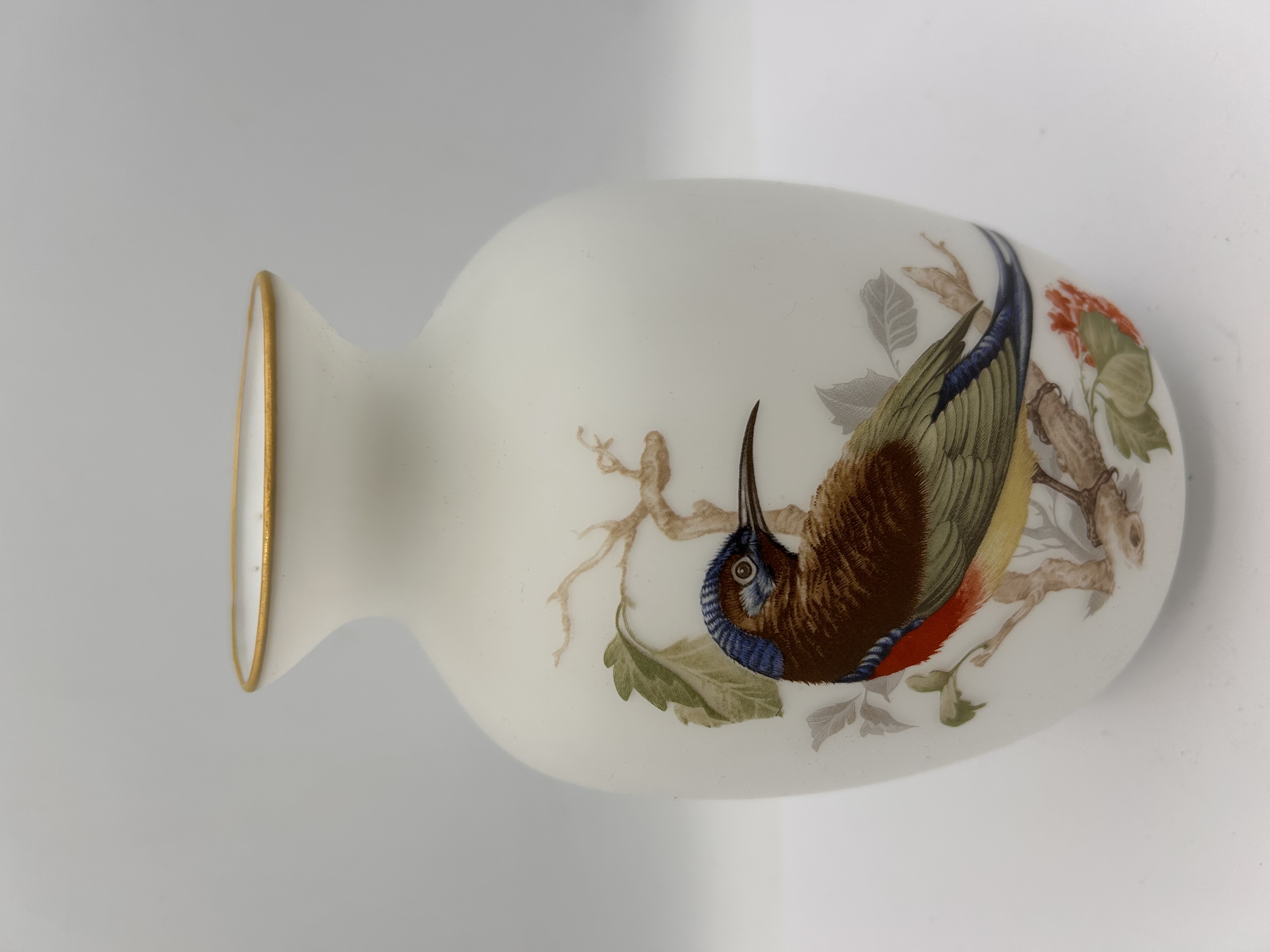 The vase has an ovoid body tapering to a short, narrow neck and a slightly flared rim. The primary decoration is a polychrome image of a long-billed, multicolored bird perched on a branch amidst stylized foliage and red floral elements. The rim is finished with a thin band of gilt decoration.