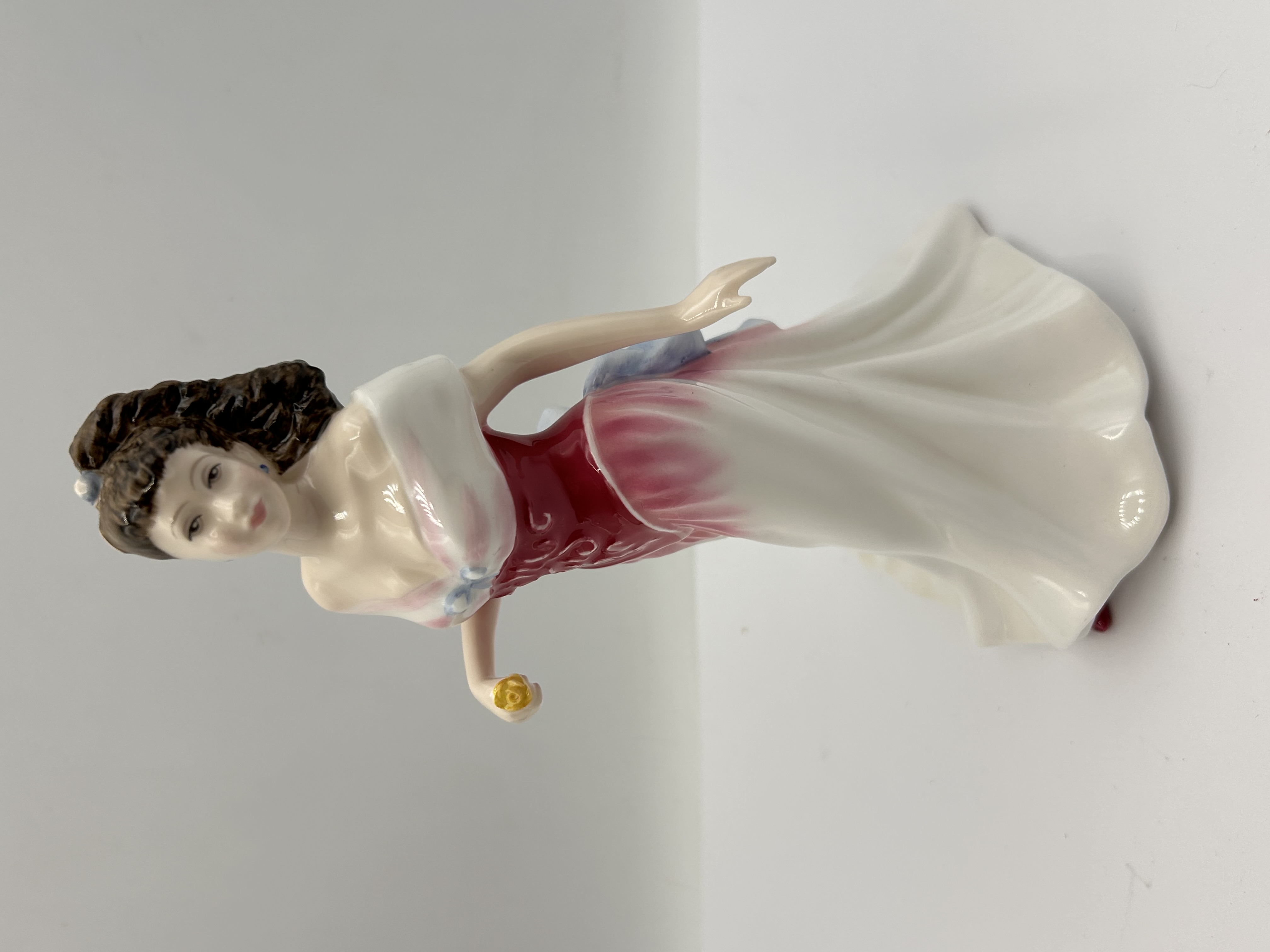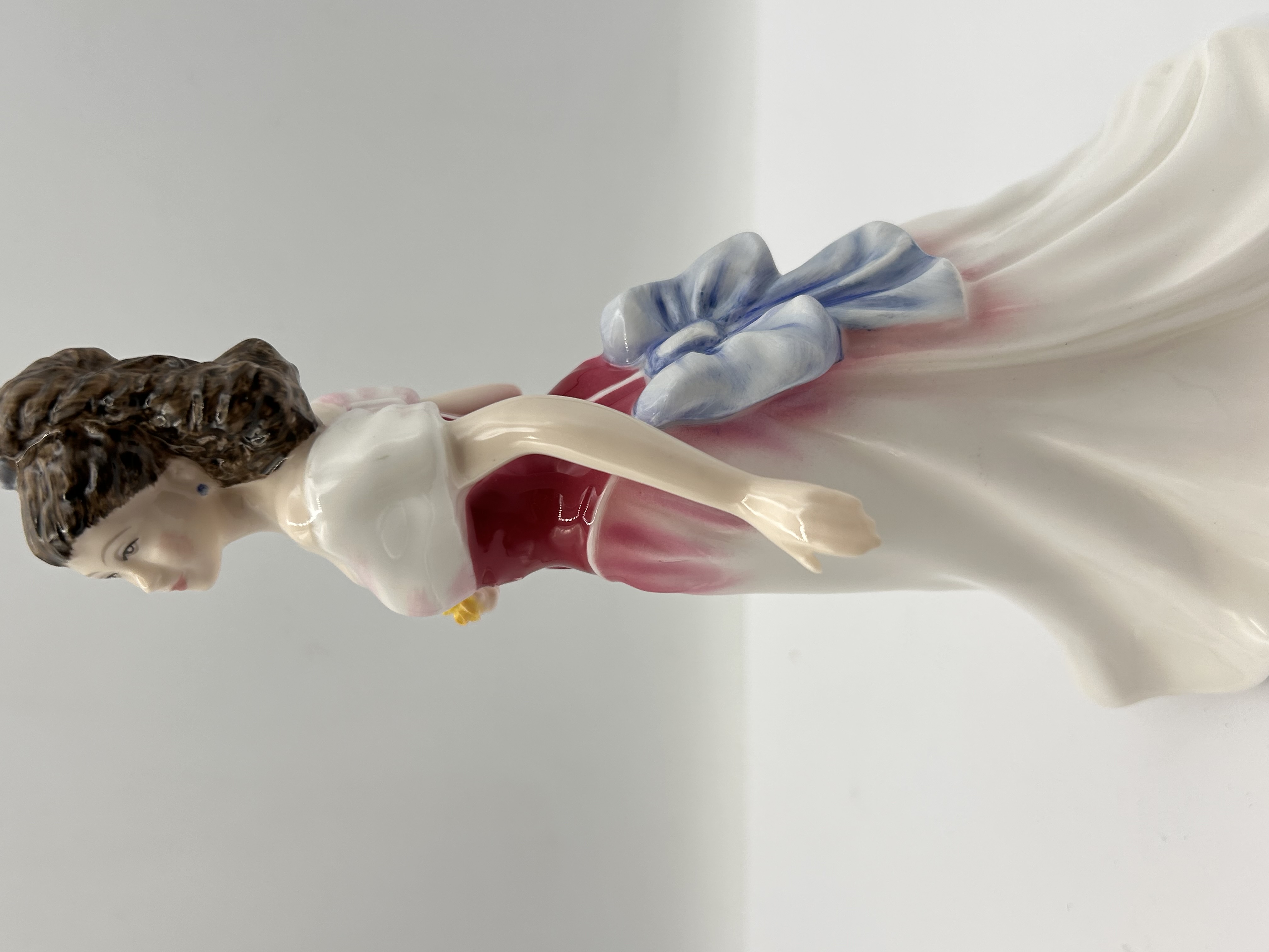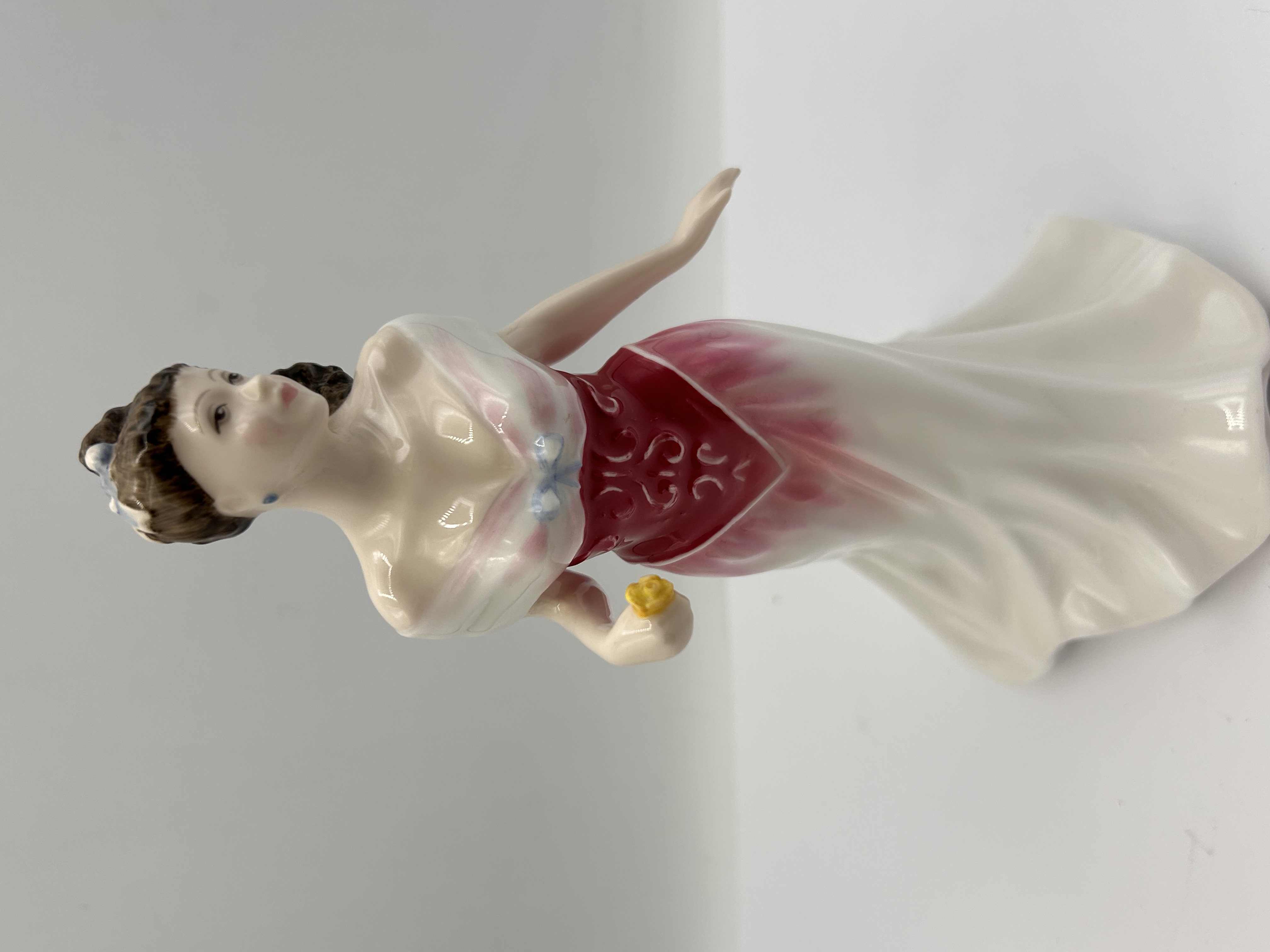 A single glazed bone china figurine by Royal Doulton, titled Amy’s Sister, model number HN3445. The figure depicts a standing woman in an elaborate formal gown, consistent with 20th-century decorative ceramic styles, likely dating to 1993 based on market research consensus. The figure has dark brown hair and wears an off-the-shoulder white dress featuring a deep crimson bodice with scrollwork details, a white skirt with crimson highlights, and a large light blue bow adorning the back. She holds a small yellow flower in her right hand and wears a blue earring. The figurine is crafted from fine glazed ceramic, consistent with bone china production.