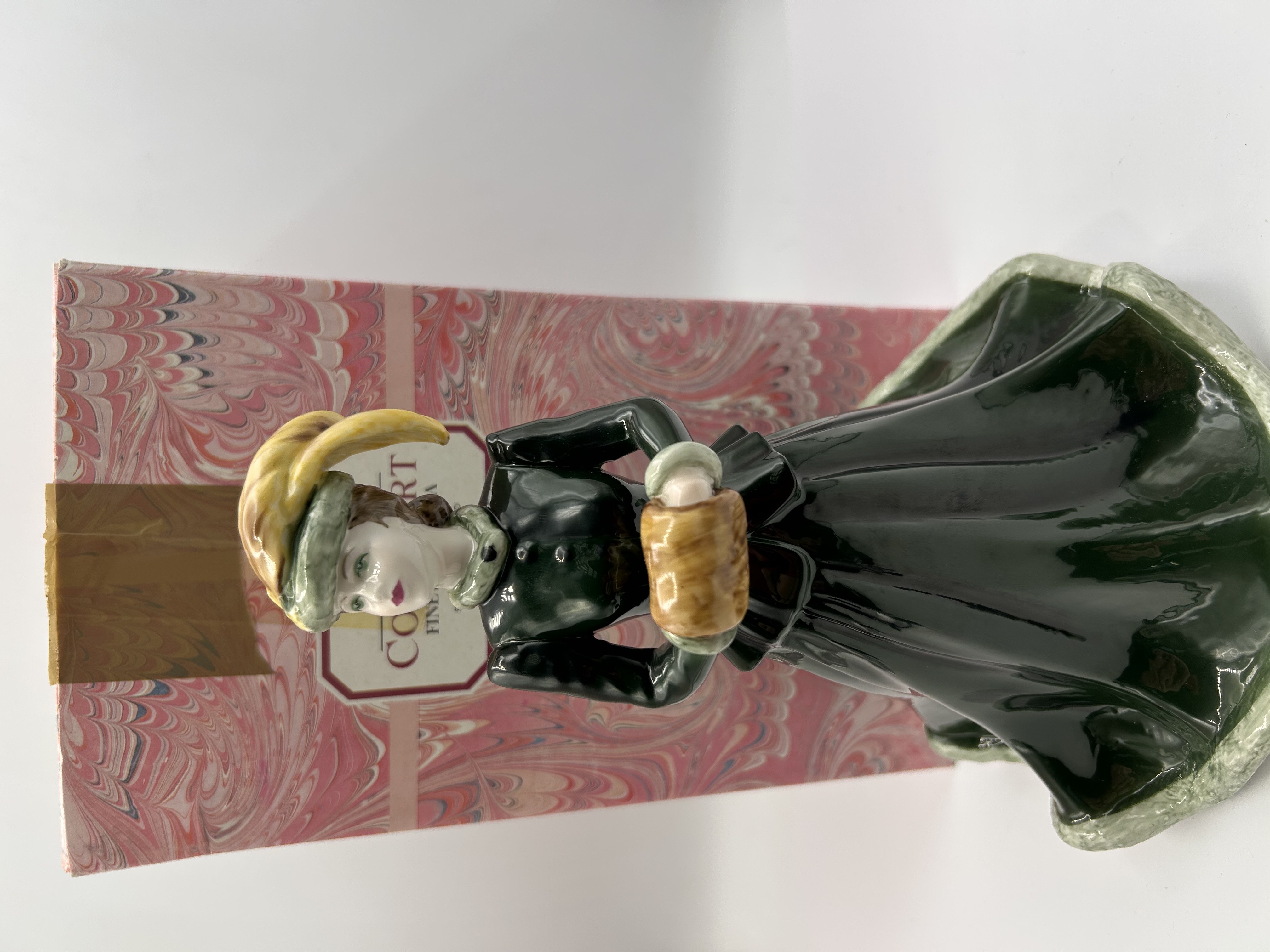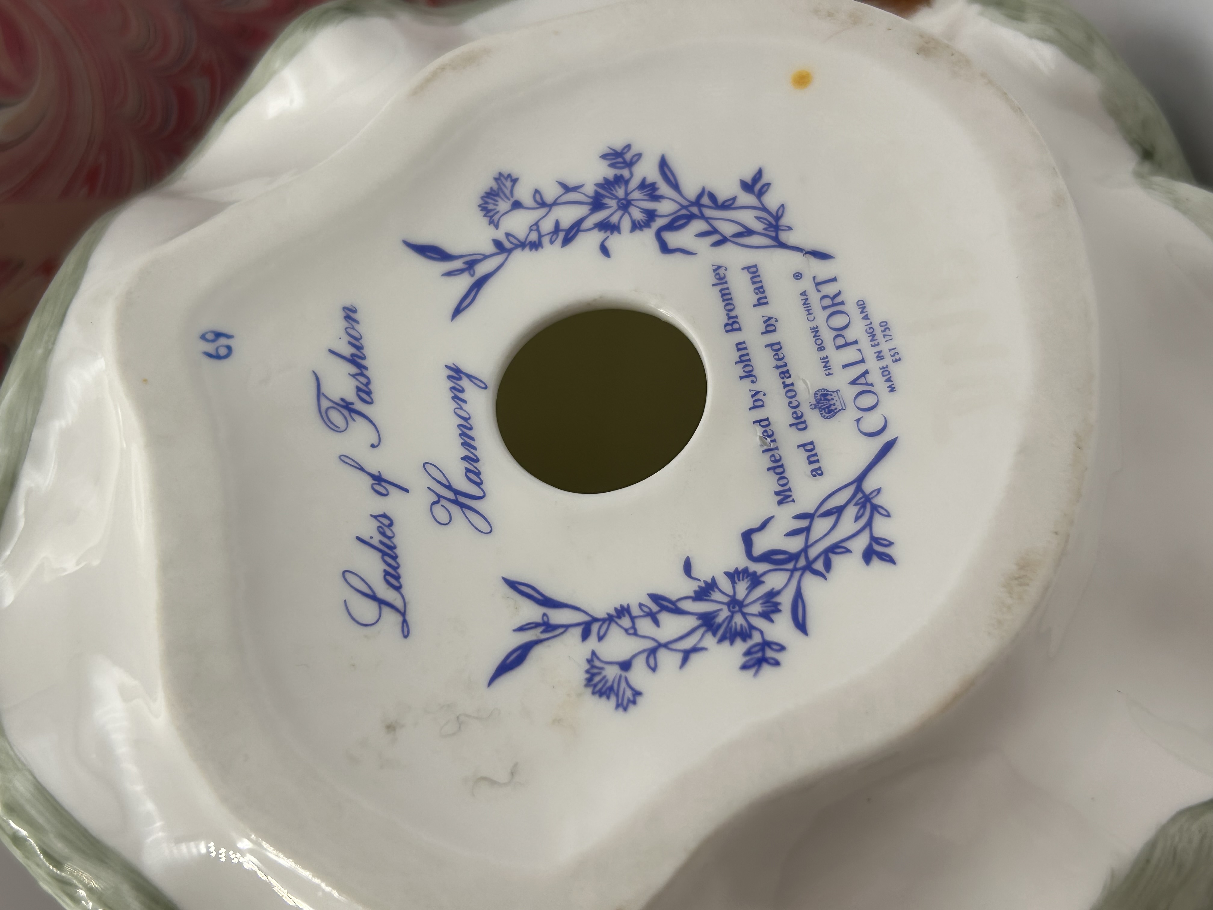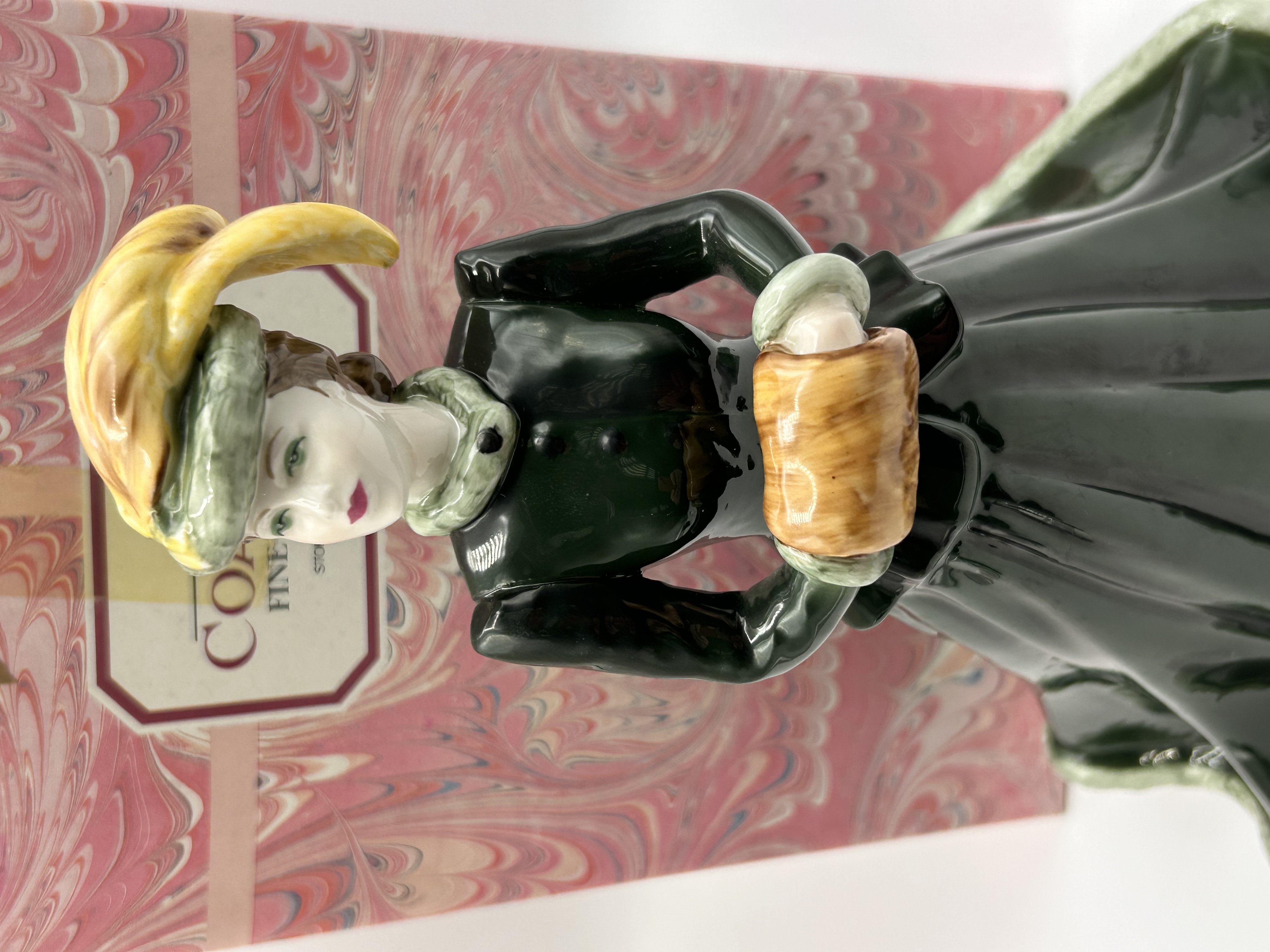 A single bone china figurine from the Coalport Ladies of Fashion series, titled ‘Harmony,’ modeled by John Bromley and decorated by hand. The figure depicts a woman in period costume, characterized by a long, dark green coat and skirt, accented by a pale green brimmed hat featuring a prominent yellow plume. She holds a yellowish-brown fur muff. The base is marked with blue underglaze transfer print reading “Ladies of Fashion Harmony,” “Modeled by John Bromley and decorated by hand,” the official Coalport mark (“FINE BONE CHINA COALPORT MADE IN ENGLAND EST. 1750”), and the number “69.” The item is presented with its original pink and white marbled cardboard packaging box.