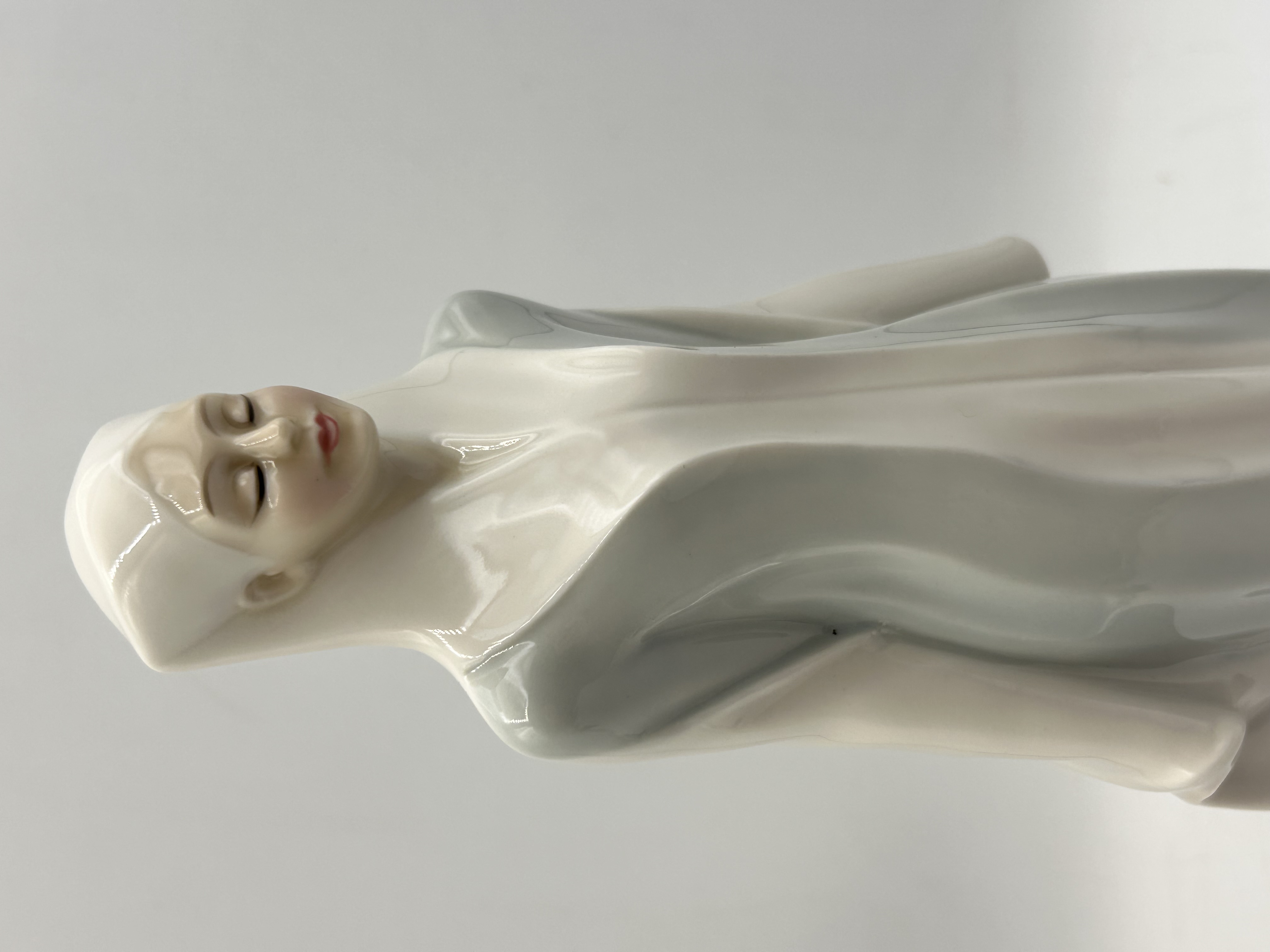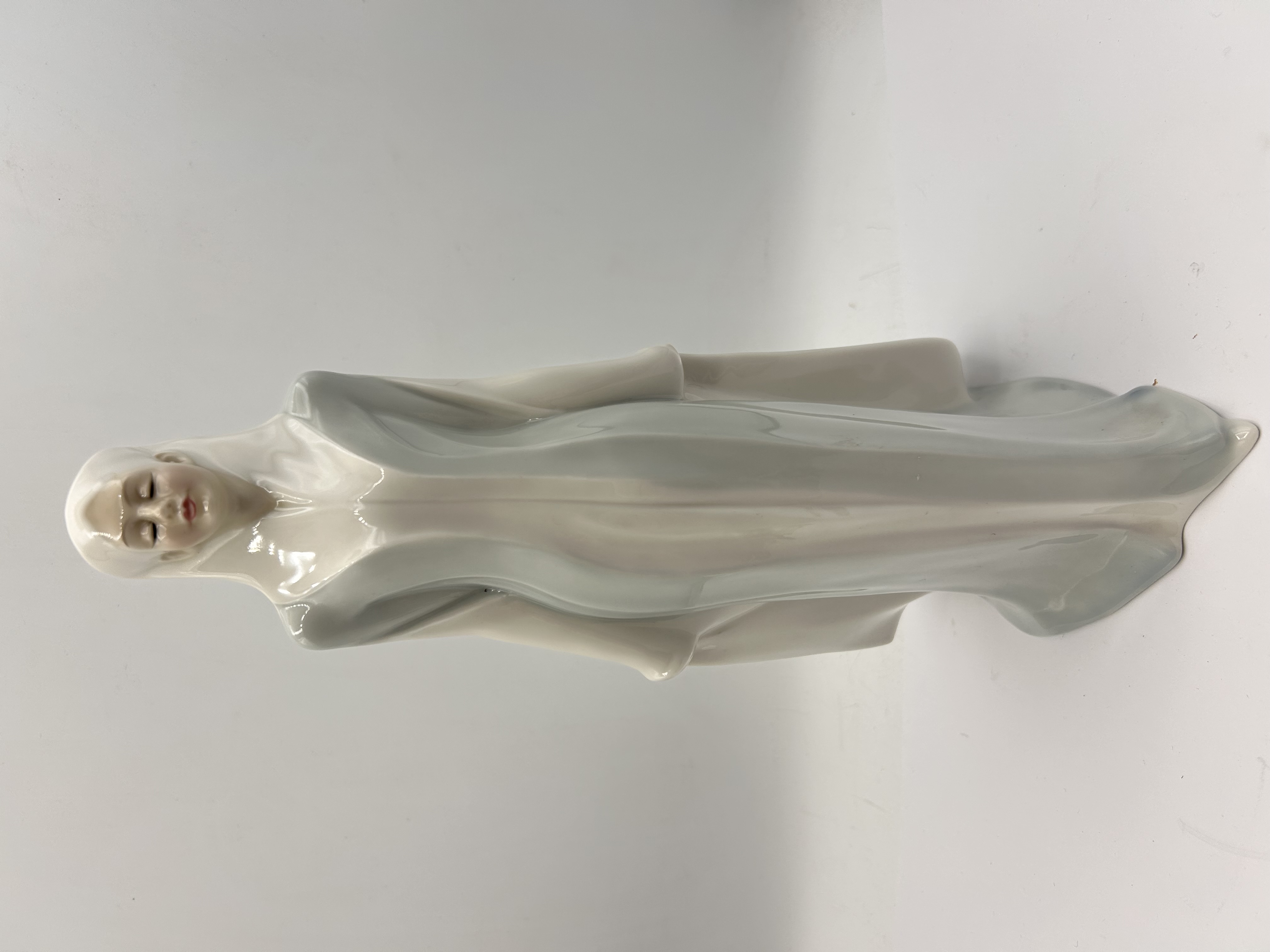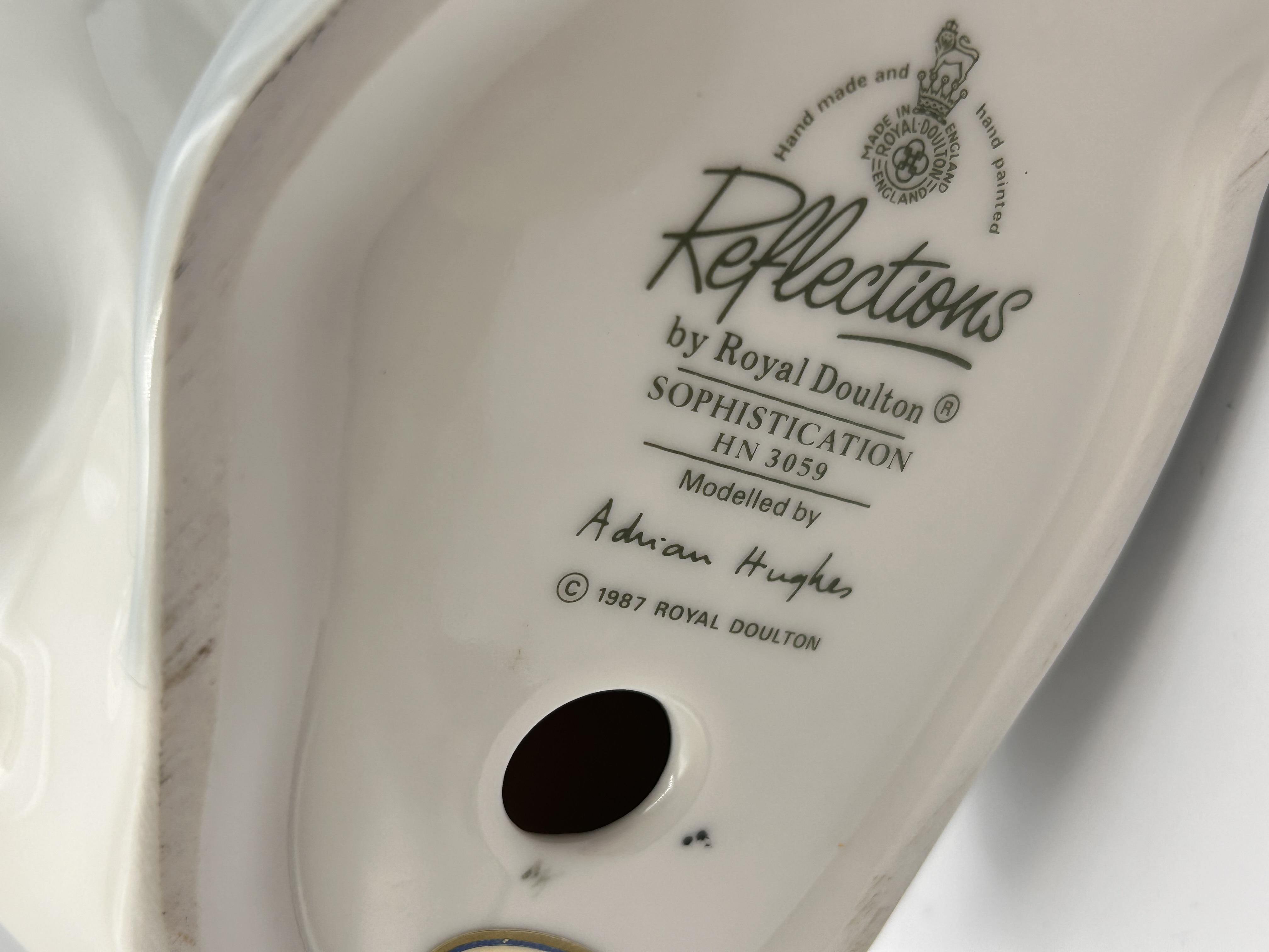 A single glazed porcelain figurine titled Sophistication, model number HN 3059, from the Reflections by Royal Doulton collection. The figurine depicts a standing female figure modeled in an elegant, modernist style, draped in long, flowing robes finished predominantly in high-gloss white and subtle blue-gray coloration. The piece was modeled by Adrian Hughes. Markings on the underside of the base confirm the attribution and include the copyright date 1987 Royal Doulton, Sophistication HN 3059, Reflections by Royal Doulton, Adrian Hughes, MADE IN ENGLAND, Hand made and Hand painted, and the circular Royal Doulton hallmark.