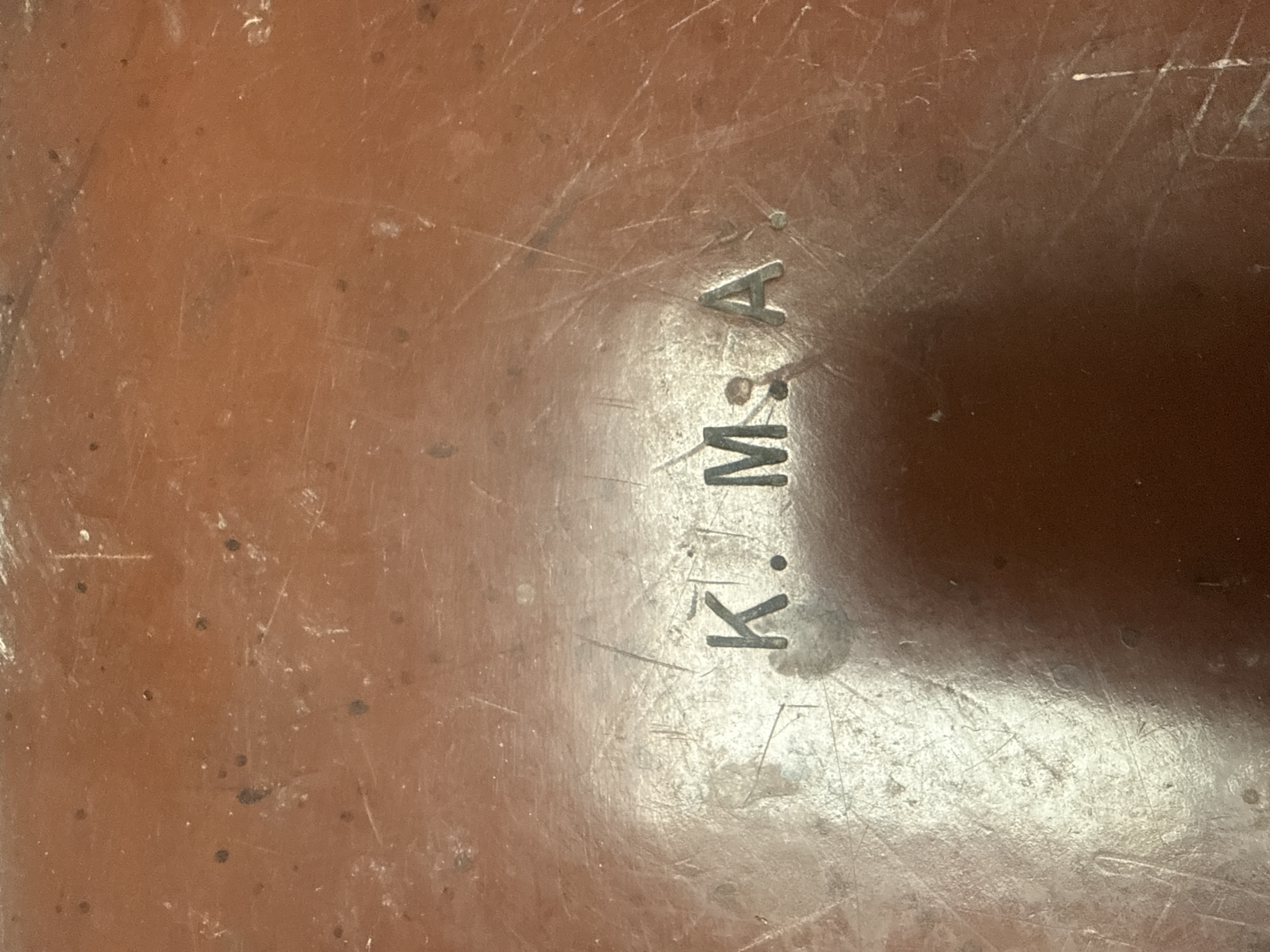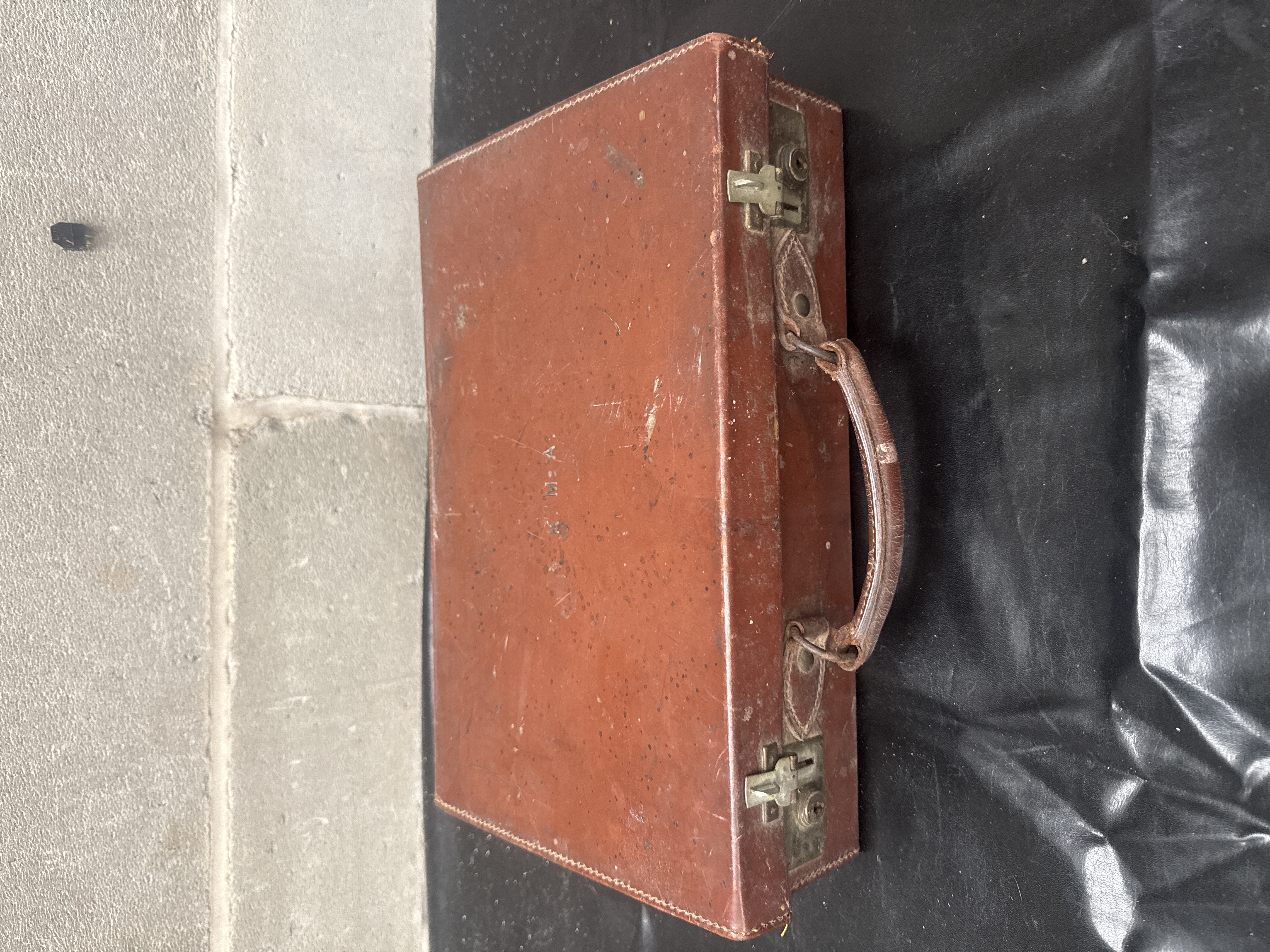 A vintage attaché case or briefcase constructed entirely of Leather, featuring a reddish-brown (russet) exterior and a black interior lining. The case is secured by two tarnished metal latch closures and includes a central leather carrying handle. The interior lid is structured with multiple organizational pockets and dividers, also in black Leather. The exterior surface is personalized with the stamped initials K. M: A.